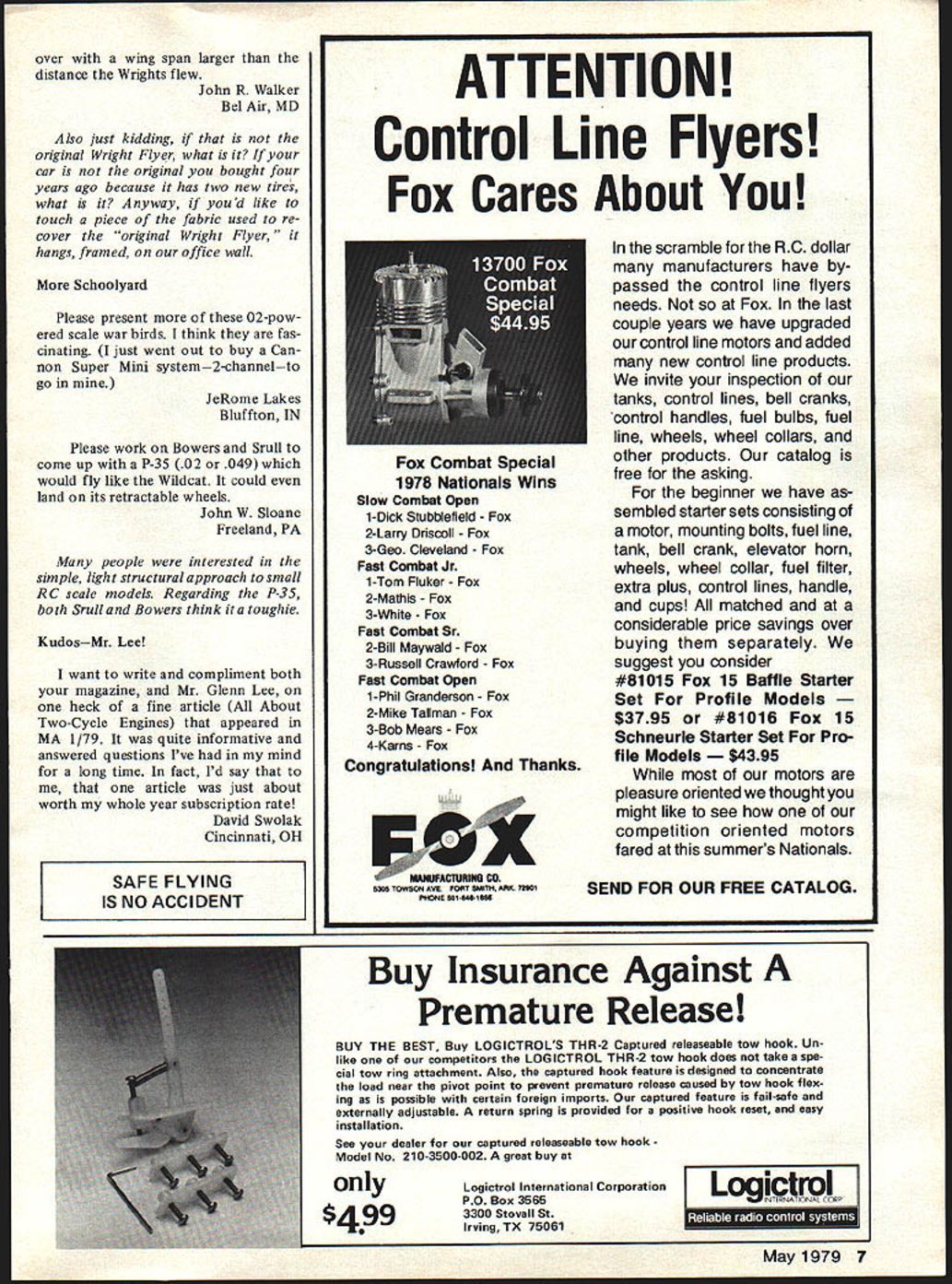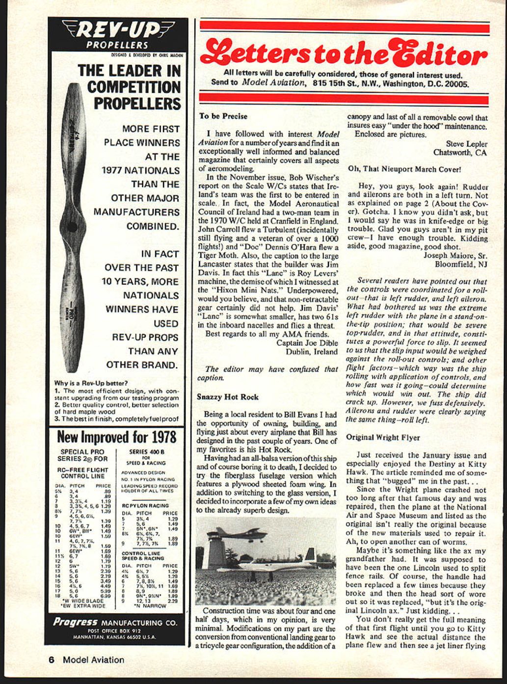 MORE FIRST PLACE WINNERS AT THE 1977 NATIONALS THAN THE OTHER MAJOR MANUFACTURERS COMBINED IN FACT OVER THE PAST 10 YEARS MORE NATIONALS WINNERS HAVE USED REV-UP PROPS THAN ANY OTHER BRAND Rev-Up better 1 The efficient design con stant upgrading testing program 2 Better quality control better selection hard maple wood 3 The best finish completelyfuelproof New Improved 1978 SPECIAL PRO SERIES 2 FOR ACFREE FLIGHT CONTROL LINE DIAPITCHPRICE 5%3489 e3489 733/4119 833%458 129 8/77%139 a4588% 77%139 104587149 106W 8W149 106EW159 114877% 7%7%8159 11SEW159 11%57189 128179 125W179 1388239 1458279 1558349 184% 6449 1758599 1888699 W WIDE BLADE EW EXTRA WIDE SERIES 400 B FOR SPEED & RACING ADVANCED DESIGN NO 1 IN PYLON SACING LEADING SPEED RECORD HOLDER OF ALL TIMES Rc PY LaN RAcING DIAPITCHPRICE 53%4129 758149 7SN 8%149 8%6% 8% 7 7%7%189 97 7% 7%189 cONTROL LINE SPEED & RACING DIA PITCHPRICE 4%8%7129 4%58%129 6788%149 77%1G%11189 889189 8aN 9%N189 91213229 N NARROW Xetters te thediter letters will carefully considered general interest used Send Model Aviation 815 15th St NW Washington DC 20005 Precise have followed interest Model Aviation number years find exceptionally well informed balanced magazine certainly covers aspects aeromodeling November issue Bob Wischers report Scale W/Cs states Ire lands team first entered scale fact Model Aeronautical Council Ireland two-man team 1970 WIG held Cranfleld England John Carroll flew Turbulent incidentally still flying veteran over 1000 flights Doc Dennis OHara flew Tiger Moth Also caption large Lancaster states builder Jim Davis fact Lanc Roy Levers machine demise witnessed Hixon Mini Nats Underpowered would believe non-retractable gear certainly did help Jim Davis Lanc somewhat smaller has two 61s inboard nacelles flies threat Best regards AMA friends Captain Joe Dible Dublin Ireland editor may have confused caption Snazzy Hot Rock Being local resident Bill Evans opportunity owning building flying just about airplane Bill has designed past couple years favorites Hot Rock Having all-balsa version ship course boring death decided try fiberglass fuselage version features plywood sheeted foam wing addition switching glass version decided incorporate few own ideas already superb design Construction time about four half days opinion very minimal Modifications part conversion conventional landing gear tricycle gear confignration addition canopy last removable cowl insures easy under hood maintenance Enclosed pictures Steve Lepler Chatsworth CA Oh Nieuport March Cover Hey guys look again Rudder ailerons both left turn explained page 2 About Cov er Gotcha know didnt ask would say knife-edge big trouble Glad guys arent pit crewI have enough trouble Kidding aside good magazine good shot Joseph Maiore Sr Bloomfield NJ Several readers have pointed out controls coordinated rollout left rudder left aileron What bothered us extreme left rudder plane stand-onthe-tip position would severe top-rudder attitude consti tutes powerful force slip seemed us slip input would weighed against roll-out controls other flight factorswhich way ship rolling application controls fast goingcould determine would win out ship did crack up However fuss defensively Ailerons rudder clearly saying same thingroll left Original Wright Flyer Just received January issue especially enjoyed Destiny Kitty Hawk article reminded some thing bugged past. Since Wright plane crashed too long after famous day repaired plane National Air Space Museum listed original isnt really original because new materials used repair Ah open another can worms Maybe its something like ax grandfather supposed have Lincoln used split fence rails course handle replaced few times because broke head sort wore out replaced its orig inal Lincoln ax Just kidding. dont really get full meaning first flight until go Kitty Hawk see actual distance plane flew see jet liner flying 6 Model Aviation THE LEADER IN COMPETITION PROPELLERS over wing span larger distance Wrights flew John R Walker Bel Air MD Also just kidding original Wright Flyer what car original bought four years ago because has two new tires what Anyway youd like touch piece fabric used re cover original Wright Flyer hangs framed office wall Schoolyard Please present 02-pow ered scale war birds think fas cinating just went out buy Can non Super Mini system2-channelto go JeRome Lakes Bluffton IN Please work Bowers Srull come up P-35 02 049 would fly like Wildcat could land its retractable wheels John W Sloane Freeland PA people interested simple light structural approach small RC scale models Regarding P-35 both Srull Bowers think ita toughie KudosMr Lee want write compliment both magazine Mr Glenn Lee heck fine article About Two-Cycle Engines appeared MA 1/79 quite informative answered questions Ive mind long time fact Id say article just about worth whole year subscription rate David Swolak Cincinnati OH SAFE FLYING IS NO ACCIDENT Fox Combat Special 1978 Nationals Wins Slow Combat Open 1-Dick Stubblefleld Fox 2-Larry Driscoll Fox 3-Geo Cleveland Fox Fast Combat Jr 1-Tom Fluker Fox 2-Mathis Fox 3-White Fox Fast Combat Sr 2-Bill Maywald Fox 3-Russell Crawford Fox Fast Combat Open 1-Phil Granderson Fox 2-Mike Tallman Fox 3-Bob Mears Fox 4-Karns Fox Congratulations Thanks 5306 T0WS0C4 AVE FOAl SMITh ARK 71101 PNGJE 1014*1101 scramble RC dollar manufacturers have passed control line flyers needs Fox last couple years have upgraded control line motors added new control line products invite inspection tanks control lines bell cranks control handles fuel bulbs fuel line wheels wheel collars other products catalog free asking beginner have sembled starter sets consisting motor mounting bolts fuel line tank bell crank elevator horn wheels wheel collar fuel filter extra plus control lines handle cups matched considerable price savings over buying separately suggest consider #81015 Fox 15 Baffle Starter Set Profile Models $3795 #81016 Fox 15 Schneurle Starter Set Pro file Models 5 mo