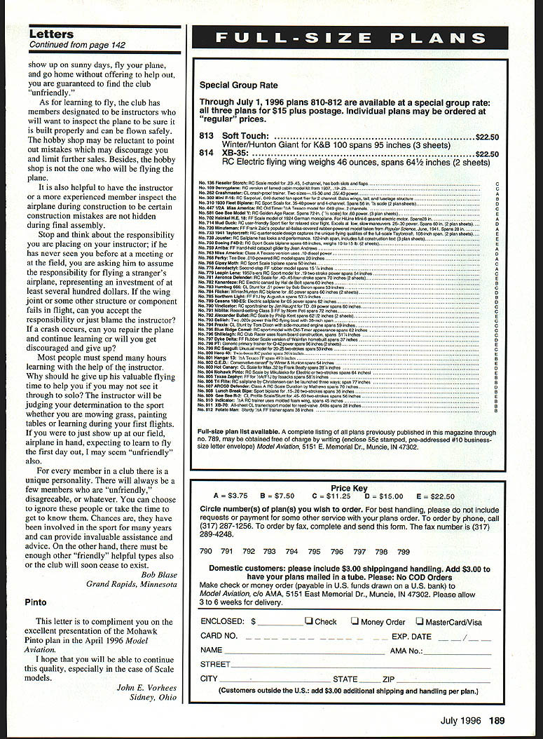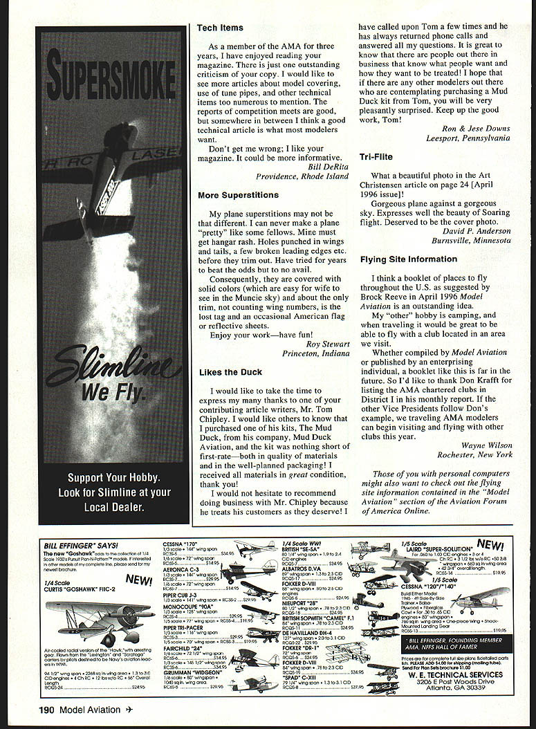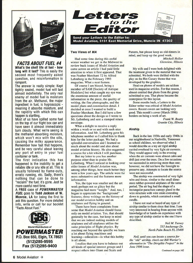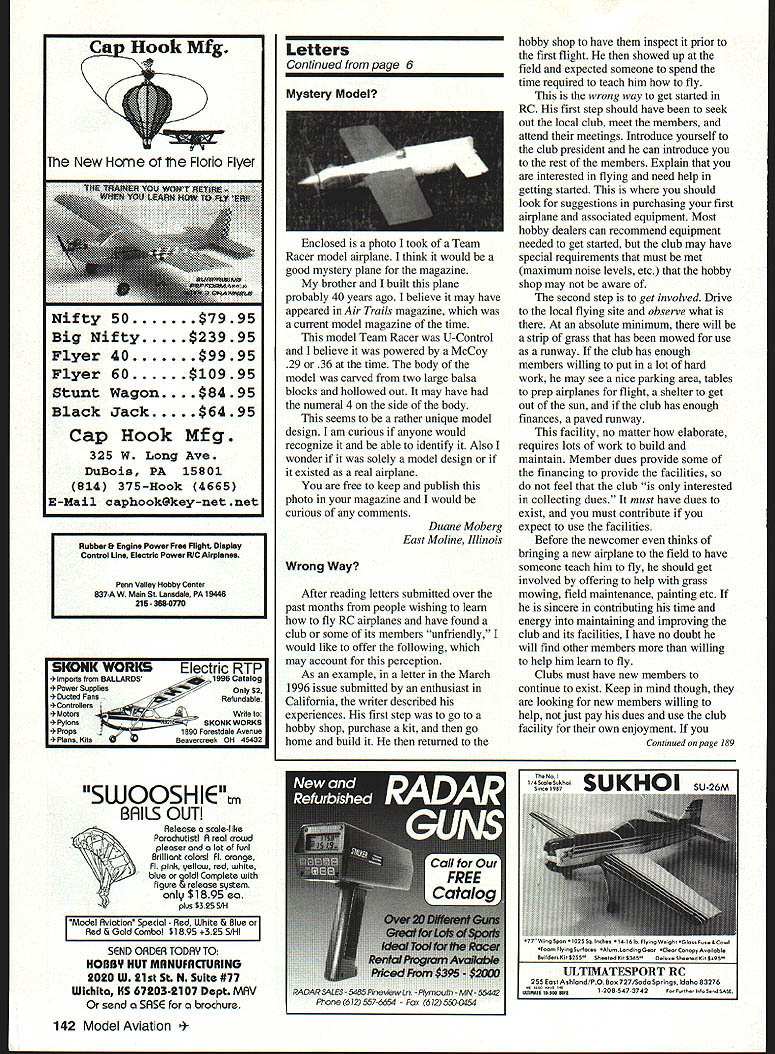 FACTS ABOUT FUEL #4 Whats shelf life fuel long will last easily second frequently asked question misinformation rampant answer really simple Kept tightly sealed model fuel will last almost indefinitely real enemy model fuel moisture air Methanol major ingredient fuel hygroscopic meaning absorbs moisture rapidity can happen startling Most us have spilled some fuel top flight box can have seen almost immediately turn cloudy What seeing methanol absorbing moisture wont mix oils causing milky appearance Remember fast happens very careful about leaving port entry fuel container tank first indication has happened inability get reliable idle idle usually followed flame-outs erratic running etc Sadly theres nothing can done reclaim fuel its gone Just careful next time FREE case POWERMASTER FUEL goes Todd Jackson W Monroe LA being first ask question detailed info write call booklet Facts About Fuel rieIii World Distributors P0 WERMASTER PO Box 650 Elgin TX 78621 512285-9595 Fax 512285-9400 Letters tc Editor some time during awful winter weather get Midwest review back issues Model Aviation came across article paid little attention first appeared Feather Merchant 72 Alfred Lehmberg February 1993 magazine What neat feature course am biased being member SAM [Society Antique Modelers] what caught eye enormous amount useful information piece quality writing fine photographs model plans construction detail decided once wanted build Feather Merchant did have few questions about design wrote Mr Lehmberg sent stamped return envelope What delight receive reply within week such nice information Mr Lehmberg gave telephone number called him thank him letter package splendid conversation learned much about model also about model aviation history also suggested source kit will purchase letter has another purpose other praise Mr Lehmberg What noticed looking over older issues Model Aviation among other things much better few years ago article far substantive features informative Yes type smaller art work perhaps glitzy magazine weight too began appreciate background features writings history model aviation hobby airplanes flying general have complaints some Model Aviation should focus model aviation Yes should generally case keep mind indeed making models airplanes airplanes utilize same principles flight physics reaching out beyond specific learn lot about flying machines learningeducation-is what hobby about realize have balance out kinds special interest groups respect others Giant Scale wife both delighted treatment given material submitted both thrilled play Hot Canary theme developed graphics Head-on photos models seldom used magazine articles reason almost omitted photo group submitted photo became centerpiece layout Some months back Letters Editor writer critical Model Aviation covers Recent covers looking very good months cover March 1996 borders being work art Frank W Beatty Granite City Illinois Airship Back late 1930s early 1940s neighborhood Nashville Tennessee school children observed what would describe toy air rigid airship carried overhead very light air currents would appear evening alr currents almost calm drift just over trees few occasions succeeded retrieving however did have foresight preserve Attempts locate source successful airship constructed very light wire tissue similar small dimestore rubber-powered airplanes same period air bag shape rectangular parachute canopy glued wire structure wire struts extending down gondola contained small candle have read heard type airship similar since time am very interested hearing anyone knowledge hands-on experience type airship similar have described Neil M Turney 533 Anchorage Dr North Palm Beach FL 33408 Neil until can locate source old airship check out Bill Warners alternative Dirigible Project June 1996 issue Continued page 142 6 Model Aviation Views MAPattern please keep us old-timers mind keep up good work Mitchell Heller Glenview Illinois Ca Hook Mfg New Home ot Florlo Flyer Nifty50$7995 BigNifty$23995 Flyer40$9995 Flyer60$10995 Stunt Wagon. $8495 Black Jack$6495 Cap Hook Mfg 325 W Long Ave DuBois PA 15801 814 375-Hook 4665 E-Mail caphookkey-net net SWOOSHIEtm BAILS OUT Release scale-like Parachutist real crowd pleaser lot fun Brilliant colorsi Fl orange Fl pink yellow red white blue gold Complete figure & release system $1895 eo plus $325 S/H Model fivlation Special fted White So Blue Red & Gold Combol $1895 325 S/Hl SEND ORDER TODAY TO HOBBY HUT MANUFACTURING 2020 W fist St N Suits #77 Wichita KS 67203-2107 Dept MAV send SASE brochure 142 Model Aviation 4Letters Continued page 6 Mystery Model Enclosed photo took Team Racer model airplane think would good mystery plane magazine brother built plane probably 40 years ago believe may have appeared Air Trails magazine current model magazine time model Team Racer U-Control believe powered McCoy 29 36 time body model carved two large balsa blocks hollowed out may have numeral 4 side body seems rather unique model design am curious anyone would recognize able identify Also wonder solely model design existed real airplane free keep publish photo magazine would curious comments Duane Moberg East Moline Illinois Wrong Way After reading letters submitted over past months people wishing learn fly RC airplanes have found club some its members unfriendly would like offer following may account perception As example letter March 1996 issue submitted enthusiast California writer described experiences first step go hobby shop purchase kit go home build returned hobby shop have inspect prior first flight showed up field expected someone spend time required teach him fly wrong way get started RC first step should have seek out local club meet members attend meetings Introduce yourself club president can introduce rest members Explain interested flying need help getting started should look suggestions purchasing first airplane associated equipment Most hobby dealers can recommend equipment needed get started