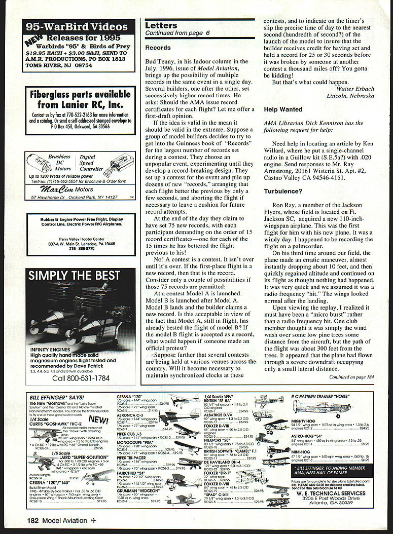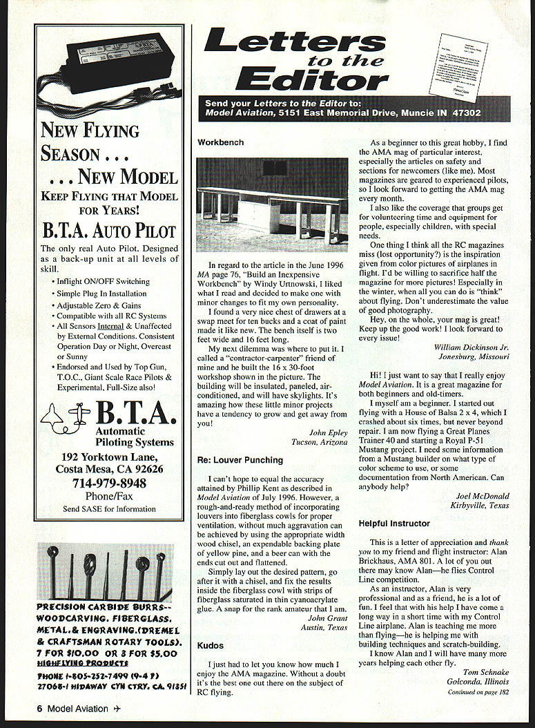 SEASON. . NEW MODEL KEEP FLYING THAT MODEL FOR YEARS BTA AUTO PILOT real Auto Pilot Designed back-up unit levels skill Inflight ON/OFF Switching Simple Plug Installation Adjustable Zero & Gains Compatible RC Systems Sensors Internal & Unaffected External Conditions Consistent Operation Day Night Overcast Sunny Endorsed Used Top Gun TOC Giant Scale Race Pilots & Experimental Full-Size also BTA Automatic Piloting Systems 192 Yorktown Lane Costa Mesa CA 92626 714-979-8948 Phone/Fax Send SASE Information 0WE 1-605-252-74999-4 27063-I JiAWAY cm CTXY CA 91351 Letters tc Editor regard article June 1996 MA page 76 Build Inexpensive Workbench Windy Urtnowski liked what read decided make minor changes fit own personality found very nice chest drawers swap meet ten bucks coat paint made like new bench itself two feet wide 16 feet long next dilemma put called contractor-carpenter friend built 16 x 30-foot workshop shown picture building will insulated paneled airconditioned will have skylights Its amazing little minor projects have tendency grow get away John Epley Tucson Arizona Re Louver Punching cant hope equal accuracy attained Phillip Kent described Model Aviation July 1996 However rough-and-ready method incorporating louvers fiberglass cowls proper ventilation much aggravation can achieved using appropriate width wood chisel expendable backing plate yellow pine beer can ends cut out flattened Simply lay out desired pattern go after chisel fix results inside fiberglass cowl strips fiberglass saturated thin cyanoacrylate glue snap rank amateur am John Grant Austin Texas Kudos just let know much enjoy AMA magazine Without doubt its best out subject RC flying As beginner great hobby find AMA mag particular interest especially articles safety sections newcomers like Most magazines geared experienced pilots look forward getting AMA mag month also like coverage groups get volunteering time equipment people especially children special needs thing think RC magazines miss lost opportunity inspiration given color pictures airplanes flight Id willing sacrifice half magazine pictures Especially winter can think about flying Dont underestimate value good photography Hey whole mag great Keep up good work look forward issue William Dickinson Jr Jonesburg Missouri Hi Ijust want say really enjoy Model Aviation great magazine both beginners old-timers myself am beginner started Out flying House Balsa 2 x 4 crashed about six times never beyond repair am now flying Great Planes Trainer 40 starting Royal P-5 1 Mustang project need some information Mustang builder what type color scheme use some documentation North American Can anybody help Joel McDonald Kirbyville Texas Helpful Instructor letter appreciation thank friend flight instructor Alan Brickhaus AMA 801 lot out may know Alanhe flies Control Line competition As instructor Alan very professional friend lot fun feel help have come long way short time Control Line airplane Alan teaching flyinghe helping building techniques scratch-building know Alan will have years helping other fly Tom Schnake Golconda Illinois Continued page 182 6 Model Aviation FLYING Workbench IJCI5IUN CARl WOODCARVING FIBERGLASS METAL& ENGRAYINGWREMEL & CRAFTSMAN ROTARY TOOLS 7 FOR $1000 OR 3 FOR $100 HIGHF IVIES PEOU eia Letters Continued page 6 Records Bud Tenny Indoor column July 1996 issue Model Aviation brings up possibility multiple records same event single day Several builders after other set successively higher record times asks Should AMA issue record certificates flight Let offer first-draft opinion idea valid mean should valid extreme Suppose group model builders decides try get Guinness book Records largest number records set during contest choose unpopular event experimenting until develop record-breaking design set up contest event pile up dozens new records arranging flight better previous few seconds aborting flight necessary leave cushion future record attempts end day claim have set 75 new records participant demanding order 15 record certificatesone 15 times has bettered flight previous No contest contest isnt over until its over first-place flight new record record Consider couple possibilities 75 records permitted contest Model launched Model B launched after Model Model B lands builder claims new record acceptable view fact Model still flight has already bested flight model B model B flight accepted record what would happen someone made official protest Suppose further several contests arebeing held various venues across country Will become necessary maintain synchronized clocks contests indicate timers slip precise time day nearest second hundredth second launch model insure builder receives credit having set held record 25 30 seconds before broken someone another contest thousand miles off gotta kidding thats what could happen Walter Erbach Lincoln Nebraska Help Wanted AMA Librarian Dick Kennison has following request help Need help locating article Ken Willard put single-channel radio Guillow kit SE5a 020 engine Send responses Mr Ray Armstrong 20161 Wisteria St Apt #2 Castno Valley CA 94546-4161 Turbulence Ron Ray member Jackson Flyers field located Ft Jackson SC acquired new 110-inchwingspan airplane first flight him new plane windy day happened recording flight palmcorder third time around field plane made erratic maneuver almost instantly dropping about 10 feet quickly regained altitude continued its flight thought nothing happened very quick assumed radio frequency hit wings looked normal after landing Upon viewing replay realized must have micro burst rather radio frequency hit club member thought simply wind wash over some low pine trees some distance aircraft path flight about 300 feet trees appeared plane flown through severe downdraft occupying small lateral distance Continued page 184 BILL EFFINGERC SAYSI New GOShaWkOed tOe [nod Super Solution nod Cesson 120 ned 105 ore roy bled PIonNyn0ernr modern con Ore firer 0 0100 ro fly great scole models 1/4 Scale