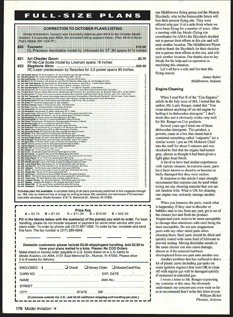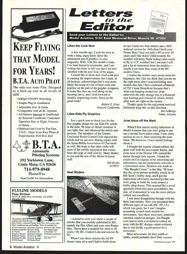 THAT MODEL FOR YEARS BTA AUTO PILOT real Auto Pilot Designed back-up unit levels skill Inflight ON/OFF Switching Simple Plug Installation Adjustable Zero & Gains Compatible RC Systems Sensors Internal & Unaffected External Conditions Consistent Operation Day Night Overcast Sunny Endorsed Used lop Gun TOC Giant Scale Race Pilots & Experimental Full-Size also BTA Automatic Piloting Systems 192 Yorktown Lane Costa Mesa CA 92626 714-979-8948 Phone/Fax Send SASE Information greatest seletl0l1 airplane plans late Herb Clukeys renouned Flylina. Order yoars today Prices include postage handling Write complete list $5 Velie Monoconpe$8 Bellanca Skyrocket$10 Great Lakes Trainer 55 Rearwin Speedster $8 Carliss Robin$10 Megowcoape $5 Flyette$8 Stearman C3B$10 Fairchild 22 $5 Curtiss Seagull$8 General Aristocrat$10 Backer Janginneister $5 Stinson Voyager$8 Travel Air 6000 5 Heinkel lOOd$8 Kinner Spoostersos 75% $5 C02 Fonster$8 Qnnker Flash Letters tc th Editor few months ago took time write long angry letter about amateurish use graphics magazine Well months issue Ive forced reconsider am writing letter tell am now satisfied new look pages would like think some part causing improvement must honesty acknowledge likely result lot hard work practice part graphic designers looks like well along learning curve look forward steadily improving results Keep up good work Robert E Gray Oxnard California Likes Kids Fly Graphics Just quick note thank fine graphic design Kids Fly article June 96 issue Model Aviation light fun enhanced article pictures members Greater Cincinnati Radio Control Club enjoyed article now sharing copies Spina Bifida Association Cincinnati well hope other clubs will learn terrific enjoyment comes type club activity thanks rest Model Aviation staff wanted write about couple articles recently published MA namely Flat Albert own Potato Man have modeler close 30 years fly RC Control Line used fly FF saw articles old FF chaser came alive build fact built two Flat Alberts 50% reduced version 010 built Potato Man built FF over 20 years like Unfortunately weather will delay flight testing wants fly 1150 weather am sure will get lot enjoyment models maybe some RC models have realize models meant beginners think right track dont stop publishing neat models like have enclosed Polaroid PM used MonoKote because thats what hanging around shop otherwise change Ramrodtype landing gear instead wheels Initial glide tests right money Thanks again enjoyment received Definitely keep MA direction Jim LaBarge Yuma Arizona June Issue off Mark first started seeing statements Model Aviation going put out second Newcomers issue really anxious see After receiving issue June 96 however have mixed feelings about thought regular column editors did quite well newcomers theme District VPs carried theme through reports found article Cox engines interesting Bill Bryaninformative particularly relevant GCRCCa newcomers issue Mention made Haught Corner May 96 issue cover picture probably would Bill Scotts hobby shop got impression obviously incorrectly going build issue around hobby shop theme seemed like novel approach great possibilities alas amounted cover picture excellent disappointed though three lead articles presented three different types aircraft RC FF CL great cant imagine promoting scratch-built models newcomers Also new relatively untested unproven designs Jim Haught write revision correct error RC designmore evidence hardly good project newcomer Most newcomers youth adults would probably have little success Continued page 174 6 Model Aviation 4KEEP FLYING Likes Look Now Neat Models FLYLINE MODELS Division 1 100th way Scottsdale AZ 85260 TI 3W motors will provide years smooth dependable high performance power backed full 1-Year warranty Send $5 complete Information Pack Giant Scale 3W motors 35 cc 3W-35 monster 4-cylinder 240 cc 3W-240B4 plus information Giant Scale Kits Accessories Dave Johnsons Bsssrt Aircraft P0 Box 18038 Tucson AZ 85731 Phone/Fax 520-722-0607 CUSTOM LETTER TODAY THE VINYLWRITE WAY ~EZZ e 1987 mail order company providing modeler EZ apply custom lettering logos stars etc choices type styles & colors decal custom cut pre-aligned & vinyl planes toys etc Heights 1/4 12 Priced right eg AMA er 1 high $250. color style* Find out what can am le infopack free Please include #10 SASE inquiries p 16043 TULSA STREET GRANADA HILLS CA 91344 818-363-7131 - Mon Thur 10-4 pm PST EMAIL vinylrt@datadepotcom Plus $2 P/H Ca res odd tax Letters Continued page 6 scratch-building first model think newcomers would have much better served in-depth articles selecting engines models ARF vs built-up models radio selection flying techniques etc three scratchbuilt models RC model hand-launched seems inappropriate newcomer dont know anything about FF /2A RC CL models just too small fly effectively newcomer too hard see handle wind case RC About virtues cheap may survive crash better larger model course consideration well-written article comparing advantages disadvantages /2A vs larger models could have useful keep hearing bigger better case newcomer would quarter scale mode surely 40 size model would better /2A model Bill Scott showed way go noted Jim Haughts column May After visiting Bills shop Jim wrote Bill also gave thorough handson explanation what recommends radios airplanes four-channel radios 40-sized model stop store werent questions finished think Bills advice right-on Jim obviously listening Bill apparently ignored advice completely preparing RC design Quite frankly three lead articles seemed like ego trip Jim Haught serious attempt provide newcomers useful information newcomers issue year great idea missed mark next issue thought should given what newcomer needs can actually use Thomas M Mitchell Houston Texas June Issue Another View issues Model Aviation wonderful Junes especially couldnt resist writing about itperhaps because directed specifically newcomer like As am 72 years old particularly interested Bil
