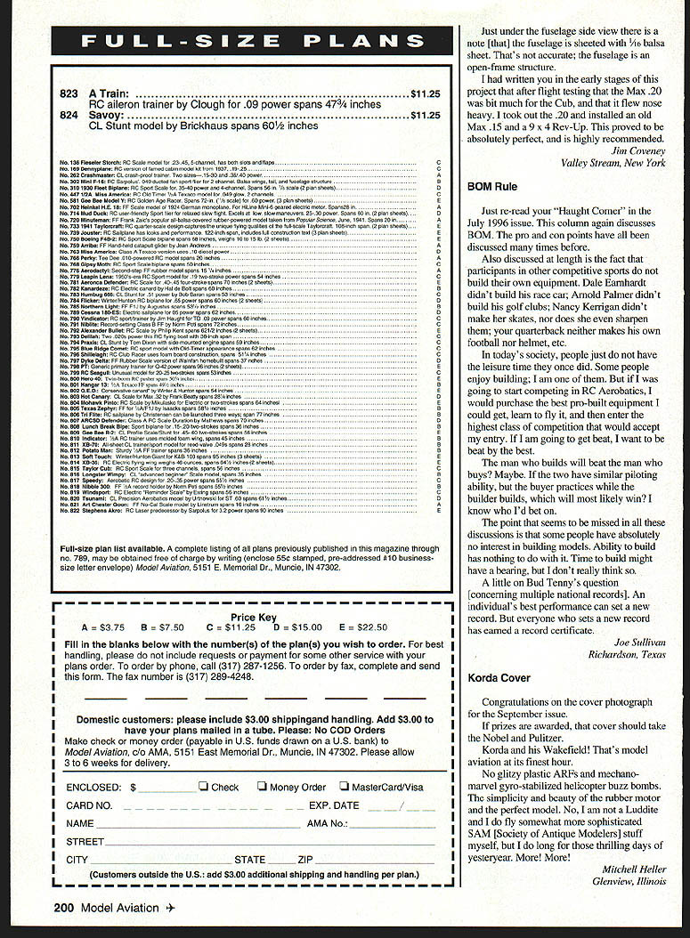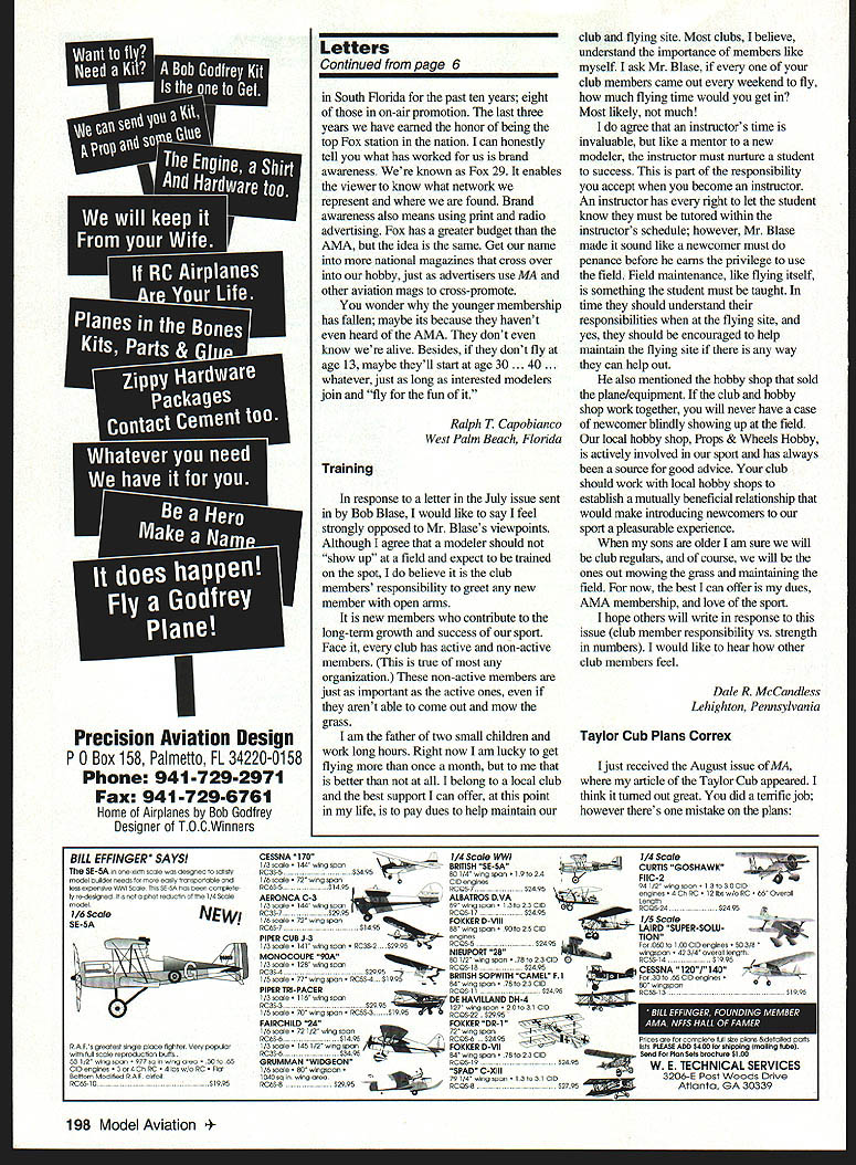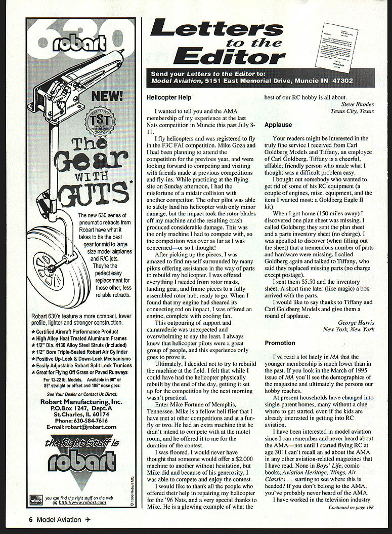 The new 630 series pneumatic retracts Robart have what K takes best gear mid large size model airplanes RIO jets 7Theyre perfect easy replacement other less reliable retracts Robart 630s feature compact lower profile lighter stronger construction * Certified Aircraft Performance Product * High Alloy Heat Treated Aluminum Frames * 112 Dia 4130 Alloy Steel Struts Included * 112 Bore Triple-Sealed Robart Air Cylinder * Positive Up-Lock & Down-Lock Mechanisms * Easily Adjustable Robart Split Lock Trunions * Great Flying Off Grass Paved Runways 12-22 lb Models Available 900 850 straight offset 1050 nose gear See Dealer Contact Us Direct Robart Manufacturing Inc ROBox 1247 DeptA StCharles IL 60174 Phone 630-584-7616 E-mail robart@robart corn n Letters tt~ Ecgitc2r wanted tell AMA membership experience last Nats competition Muncie past July 811 fly helicopters registered fly F3C FAI competition Mike Goza planning attend competition previous year looking forward competing visiting friends made previous competitions fly-ins practicing flying site Sunday afternoon misfortune midair collision another competitor other pilot able safely land helicopter minor damage impact took rotor blades off machine resulting crash produced considerable damage machine compete competition over far concernedor thought After picking up pieces amazed find myself surrounded pilots offering assistance way parts rebuild helicopter offered everything needed rotor masts landing gear frame pieces fully assembled rotor hub ready go found engine sheared its connecting rod impact offered engine complete cooling fan outpouring support camaraderie unexpected overwhelming say least always knew helicopter pilots great group people experience goes prove Ultimately decided try rebuild machine field felt could have helicopter physically rebuilt end day getting set up competition next morning wasnt practical Enter Mike Fortune Memphis Tennessee Mike fellow heli flier have met other competitions funfly two extra machine didnt intend compete motel room offered duration contest floored would never have thought someone would offer $2000 machine another hesitation Mike did because generosity able compete enjoy contest would like thank people offered help repairing helicopter 96 Nats very special thanks Mike glowing example what -0 best of RC hobby about Steve Rhodes Texas City Texas Applause readers might interested truly fine service received Carl Goldberg Models Tiffany employee Carl Goldberg Tiffany cheerful affable friendly person made what thought difficult problem easy bought out somebody wanted get rid some RC equipment couple engines misc equipment item wanted Goldberg Eagle II kit got home 150 miles away discovered plan sheet missing called Goldberg sent plan sheet parts inventory sheet no charge appalled discover filling out sheet tremendous number parts hardware missing called Goldberg again talked Tiffany said replaced missing parts no charge except postage sent $550 inventory sheet short time later like magic box arrived parts would like say thanks Tiffany Carl Goldberg Models give round applause George Harris New York New York Promotion Ive read lot lately MA younger membership much lower past look March 1995 issue MA youll see demographics magazine ultimately persons hobby reaches present households have changed single-parent homes clue get started kids already interested getting RC aviation have interested model aviation since can remember never heard about AMAnot until started flying RC age 30 cant recall ad about AIVIA other aviation-related magazines have read None Boys Life comic books Aviation Heritage Wings Air Classics . starting see headed dont belong AMA youve probably never heard AMA have worked television industry Continued page 198 6 Model Aviation * Helicopter Help E con find right stuff web @ http /Iwwwrobartcom Letters Continued page 6 South florida past ten years eight on-air promotion last three years have earned honor being top Fox station nation can honestly tell what has worked us brand awareness known Fox 29 enables viewer know what network represent found Brand awareness also means using print radio advertising Fox has greater budget AMA idea same Get name national magazines cross over hobby just advertisers use MA other aviation mags cross-promote wonder younger membership has fallen maybe its because havent heard AMA dont know alive Besides dont fly age 13 maybe theyll start age 30 . 40 whatever just long interested modelers join fly fun Ralph 7 Capobianco West Palm Beach Florida Training response letter July issue sent Bob Blase would like say feel strongly opposed Mr Blases viewpoints Although agree modeler should show up field expect trained spot believe club members responsibility greet new member open arms new members contribute long-term growth success sport Face club has active non-active members true organization non-active members just important active ones arent able come out mow grass am father two small children work long hours Right now am lucky get flying once month better belong local club best support can offer point life pay dues help maintain club flying site Most clubs believe understand importance members like myself ask Mr Blase club members came out weekend fly much flying time would get Most likely much agree instructors time invaluable like mentor new modeler instructor must nurture student success part responsibility accept become instructor An instructor has right let student know must tutored within instructors schedule however Mr Blase made sound like newcomer must penance before earns privilege use field Field maintenance like flying itself something student must taught time should understand responsibilities flying site yes should encouraged help maintain flying site way can help out also mentioned hobby shop sold planelequipment club hobby shop work together will never have case newcomer blindly showing up field local hobby shop Props & Wheels Hobby actively involved spo