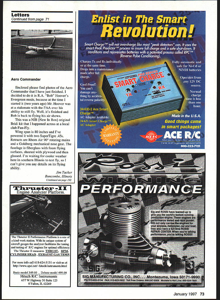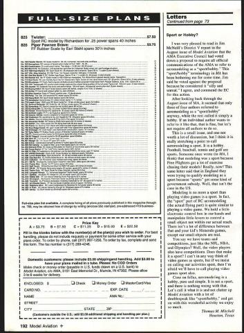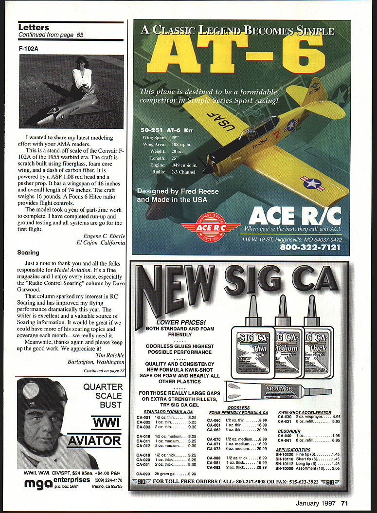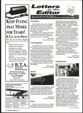 KEEP FLYING THAT MODEL FOR YEARS BTA AUTO PILOT real Auto Pilot Designed back-up unit levels skill Inflight ON/OFF Switching Simple Plug Installation Adjustable Zero & Gains Compatible RC Systems Sensors Internal & Unaffected External Conditions Consistent Operation Day Night Overcast Sunny Endorsed Used lop Gun TOC Giant Scale Race Pilots & Experimental Full-Size also Automatic Piloting Systems 192 Yorktown Lane Costa Mesa CA 92626 714-979-8948 Phone/Fax Send SASE Information FLYLINE MODELS Plans Division 15t27 N 100th way Scottsdale AZ 85260 greatest airplane plan Herb Clakeys renowned 1-tyirne Model KOS tirdee yours today Prices include postage handling Write complete list 55 coupe$8 Bellanca Skyrocket$10 Great Lakes Trainer $5 Rearwis Speedster $8 Cuniss Robin$10 Megorecoape 55 Flyette$8 Steannan C3B$10 Fairchild 22 55 Curtiss Seagull$8 General Aristocrat$10 Backer Juagmeisrer 55 Sharon voyager$8 Travel Air 6800NOTE eiakel lOOd$8 Kinner Sponsterscar $5 C02 Punster58 Quaker Flash Letters ti Editor have recently come across computer program should help professional model builder well Sunday flyer Program Prop Optomizer Written Don Bates 2742 Swanshoro Road Placerville CA 95667 Program works equally well fullscale aircraft small aircraft interested trial run Super Stik Fox 50 very satisfying Henry Ham Green Valley Arizona Throttle Suggestion suggestion interest safety relieve problem have field moving airplane area another engine running hold transmitter left hand thumb front throttle holds stick back prevents accidentally hitting bumping throttle open also allows concentrate fully what trying course keeps safer hurting yourself equipment others would believe mental relief simple act produces flightline WalterE Bass Santa Rosa Calfonsia Field Fix photo shows what happened Buddy Campbell airplane blowout Instead packing up going home made own wheel out liner cap fuel jug amazing idea might come handy someday rest pilots Charlie Ellis Tuscaloosa Alabama Wasp Maybe can find place Model Aviation item purely nostalgia last May local model store came across kit vintage-1940 model alrplane highly resembles Carl Goldbergs Zipper noted name designer Robert F Milligan 1938 1939 Canadian Sr Champion Bob built flew FF back 30s Toronto communicated late 40s early SOs until moved away lost track him have tried several times locate him through Toronto-area phone books no avail converted RC installed Electric Turbo IQ instead Brown Jr power plant coil & condenser etc shown drawings Like days old Wasp stood its tail went straight up leveled off 400 feet did routine maneuvers during its first ride terrific flier kit marketed Easy Built Models Hoping Bob might see item anyone knowing whereabouts would appreciative anyone passing address Leslie Racey Kirkland Washington Something Extra son Daniel great experience developed once-in-a-lifetime opportunities None following events planned out just fell place Once ball started rolling enjoyed too much stop Toledo show purchased Midwest Extra 300S its favorite companion Moki 18 Being pastor Troy Ohio home BF Goodrich Aerospace having engineers Regan Oswalt church member happened mention might finish model BF Goodrich/Patty Wagstaff color scheme Regan told boss about idea boss told Valerie Francis company coordinator Dayton Air Trade Show committee submitted portfolio previous models before week over BF Continued page 65 6 Model Aviation * Prop Software Letters Continued page 6 Goodrich wanted sponsor airplane display flightline chalet 96 Dayton Air Show would give Daniel flightline chalet privileges opportunity meet Patty began work model spare time sparse because day-to-day responsibilities some outof-town engagements However able see completed model just five days before Air Show pedestal built using Plexiglas gave model realistic flying appearance Patty Wagstaff performed twice Saturday morning cutting up sky usual BF Goodrich Extra 300S Being chalet provided best seats see perform aerobatics great After performance came BF Goodrich chalet lunch Valerie introduced Daniel After making several comments about model able get sign programs autograph left wing panel model BF Goodrich photographer Bob Judson took pictures great day father son . time will never forget hospitality BF Goodrich went beyond expectations next week called over BF Goodrich headquarters given photos Bob took day Daniel picked out favorite shot BF Goodrich made 8 x 10 us next week Dave Pulfer good flying friend experienced Extra 300S pilot flew model astounded straight flew off board no trim needed As matter fact Dave nearly gave heart failure put knife right off deck maiden flight Moki 18 coupled Bolly 19 x 10 provided enough power fly 15pound airplane Maneuvers very crisp no computer mix needed JR XP783 knife-edge performance Rick Arrowood Troy Ohio Help Wanted have need anyone has Dave Brown Products Inc RCFS II RIC Flight Simulator Apple 11 lIe lIgs getting touch telephone number 801 782-8023 use address below Harold G Strand 3815 N900 W Ogden UT 84414 Continued page 71 Letters Continued page 65 F-i 02A wanted share latest modeling effort AMA readers stand-off scale Convair F 102A 1955 warbird era craft scratch built using fiberglass foam core wing dash carbon fiber powered ASP 108 red head pusher prop has wingspan 46 inches overall length 74 inches craft weighs 16 pounds Focus 6 Hitec radio provides flight controls model took year part-time work complete have completed mn-up ground testing systems go first flight Eugene C Eherle El Cajon California Soaring Just note thank folks responsible Model Aviation Its fine magazine enjoy issue especially Radio Control Soaring column Dave Garwood column sparked interest RC Soaring has improved flying performance dramatically year writer excellent valuable source Soaring information would great could have soaring topics coverage monthwe really need Meanwhile thanks again please keep up good work appreciate Tim Raichie Burlington Washington Continued