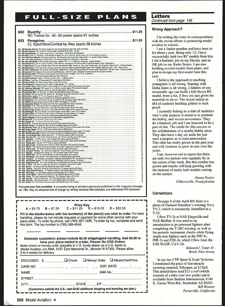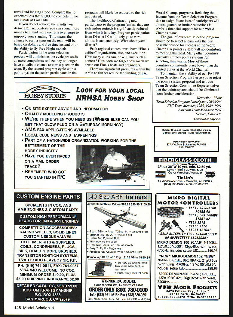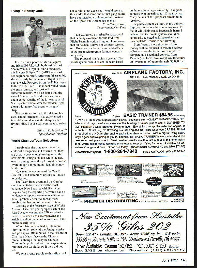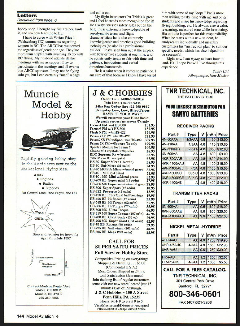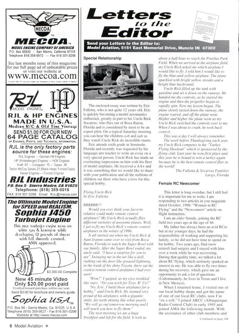 MECQA MECCA TM MODEL ENBINECOMPANYDFANEIICA RO Box 80830 San Marino California 91118 Telephone 818-359-6972 --- Fax 818301-0298 See last months issue magazine full page ad unbeatable prices visit website wwwmecoa corn WERE w OA MW OEE SOROL pai TEEOREWES MOEEO EOEW COSEAWO OP AMERO LENNESI Ru & HP ENGINES MADE IN USA MOdERN R/C & Old TIME ViNTAqE SEND $100 FOR OUR NEW 64 PAGE CATALOG OF ENGINES PARTS AND TECHNICAL INFORMATION RJL factory parts source engines RJL Engines --- German HB Engines HP Hirtenberger Engines --- HGK Engines Kraft 61 --- Conquest 15 --- Taipan 40 Testor McCoy Series 21 Black Head Finned Case Kavan Engines Forster Engines NIL 11111 us flies RU BaxU SIara Mad, CA 91025 Telephone 818 359-0016 FAX 818 301 0298 Email RJL@mecoa corn Ultimate Model Englile SPEED IIFALISM Sophia 1450 Turbojet Engine TItis TRUE TURbOjET ENqiNE RUNS ON WhITE qAS & kEROSENE WhILE dEvElopiNt 12 pOUNdS TI-IRUST WiTh full ThROTTLE CONTROL AMA AppRovEd $330000 Complete New 45 minute Video Only $2000 post paid CredIted toward purchase within year Send $3 00 brochure owners guide Sophia U$4M PO Box 98- Sierra Madre Ca 91025 USA Telephone 818 359-9527 Fax 818-301-0298 Website httpllwwwmecoacom Letters tc EcIitcar enclosed essay written Eric Falletta quite 12 years old Eric quickly becoming model aeronautics enthusiast greatly part Uncle Rick Socarras flies out Boca Raton Florida considered expert pilot typical Saturday morning can hear children ooh aah watch Uncle Rick incredible stunts Eric attends sixth grade Seminole Florida recently requested language arts teacher write essay very special person Uncle Rick has made everlasting impression him fleet model airplanes received AA something would like share publication millions children out have love special hobby Flying Uncle Rick Eric Falletta RRRRRR! Would ever think favorite relative could make remote control airplanes Uncle Rick actually flies different varieties awesome planes Well got fly Uncle Ricks remote control airplanes winter 1996 started out Uncle Rick & Aunt Jeanne came over visit Boca Raton Florida watch Super Bowl family After Super Bowl ended uncle said have surprise see Swinging air like doll rushing out door like greased lightning trunk shiny Toyota sat coolest remote control airplanes ever seen EWow~ gasped eyes twinkled like stars work Toys R Us No Eric build airplanes hobby said Uncle Rick seemed very proud airplanes gigantic smile teeth shining like white pearls will go out tomorrow morning will teach fly next morning ate huge breakfast left field took us --0 VEO/OSOA about half hour reach Pinellas Park Field arrived airplane field Uncle Rick asked airplane would like fly told him would like fly blue-and-yellow airplane plane sparkled bright yellow streaks bright blue backround Uncle Rick filled up tank gasoline set down runway handed controls started engine propeller began rapidly spin Now lesson began plane slowly taxied down runway engine roared off plane went Higher higher plane went Uncle Rick switched controls over about crash took back control day will always remember week before Thanksgiving year Uncle Rick competes Turkey Flying Shootout sponsored flying club Last year won first place year bound win turkey again because best remote control flier world Falletta & Socarras Families Largo Florida Female RC Newcomer letter long overdue still feel important write am responding two articles magazine dated October 1996 Women RC Flying Newcomers article flight instructors am older female joining RC field two years ago age 46 father has always avid RCer younger days responsibility working supporting family did have time spend hobby Two years ago Dad now retired surgery stayed him over week wasrovering During quality time talked lot about RC flying seriously sparked interest able fly two times during recovery gave opportunity ask lot questions Unfortunately lives Texas live New Mexico returned home visited local hobby shops got name local RC clubs now Im roll joined ARCC Albuquerque Radio Control Club early 1995 joined AMA following month assistance other club members Continued page 144 6 Model Aviation ial Relationship Letters Continued page 6 hobby shop bought first trainer built am now learning fly have agree Vivian Prices Walsenburg CO comments regarding women RC ARCC has welcomed regardless gender age helpful anything RC flying husband attends meetings support try participate meetings events ARCC sponsors may flying solo yet can certainly man cage call cut flight instructor Pat Tritle great feel needs recognition always stresses safety rules out field extremely knowledgeable aerodynamic terms flight characteristics also extremely knowledgeable practices good building techniques also professional builder have seen him out airpark four five students time consistently treats us fair time patience instructions verbal directions/commands saint comes patience am sure because know have tested him some oops Pat willing take time other students share knowledge regarding flying building etc always uses calm reassuring measured tone instructing attitude perfect responsibility starts new student analyzes us individually mentally customizes instruction plan suit specific needs has also helped him successful Right now am tiying learn land Ha hope Pat will live through experience Sandy Uhi Albuquerque New Mexico Muncie Model & Hobby Rapidly growing hobby shop Muncie area next AMA National Flying Site 0 Kits 0 Engines S Radios S Supplies Control Line Free Flight RC Free Gifts Stop register free gifts April tbru July 1997 11 /7AMA Nenonel Flying Site S Muncie Model Contact Mark Daniel Vest 2645 S CR 400 E Muncie tN 47302 765-289-5856 J & C HOBBIES Order Line 1-800-309-8314 Info Line 412-795-9344 24hr Fax Order line 412-798-9857 Everyday Low Low Hitec Prices HAVE IT YOUR WAY! will customize Hitec Radio Up grade servos no servos ITx Focus 4 FM w/4 HS30013195 Focus 6 FM w14 HS-30015795 Flash 5 FM w14 HS42217995 Prism 7XF FM w14 HS-42222195 Pri