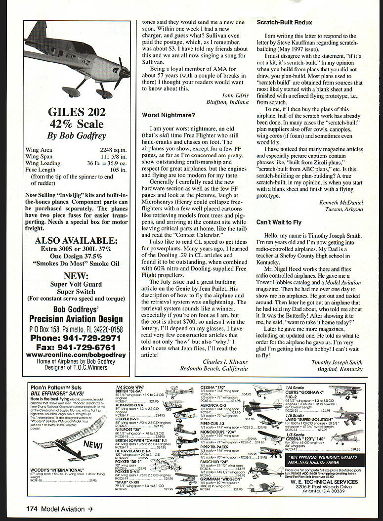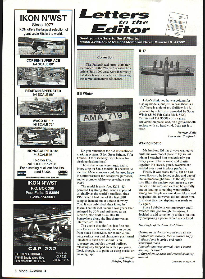 IKON NWST Since 1977 IKON offers largest selection giant scale kits world REAR WIN SPEEDSTER SCALE 96 order kits call 1-800-327-7198 catalog fine kits send $4 00 Idaho Resgdents Add 5% State Sales Tax Letters trz Editor remember old international marking system G Great Britain F France D Germany letters airplane designations characters large interesting Scale models occurred AMA numbers could used large similar fashion decorative purposes promote AMAeverywhere look model six-foot K&B 45powered Lightning Bug appeared originally worlds smallest circa 1960 first 010 samples handed out trade show Cox published kitted Jasco 28-inch version years later enlarged 50% published Electric also built 049 RC Somewhere along line intermediate 09 RC pic flies just fine uses flaperons Numerals etc can cut black MonoKote example wing surface wet characters positioned like decals heat-shrunk squeegee out bubbles toward outlines releasing trapped air pin prick Ideal though paint using masks masking tape Bill Winter Fairfax Virginia dont think have column display models just case fit pic Guillow B-17 powered solar cells provided Solar Winds 5150 Fair Oaks Blvd #120 Carmichael CA 95608 Its great conversation piece glass-smooth surface no headwind can get taxi Norman Kelly Temecula California Waxing Poetic husband Ed has always wanted build own model plane fly last winter watched him meticulously put piece balsa wood plastic together sawed glued tweezed sanded part place perfectly Finally ready fly never flown joined club veterans taught him day solo flight anxiety intense say least airplane went up beautifully landing something went terribly wrong plane came down like lead zeppelin however did deter him short time airplane ready fly again Since dabble writing poetry watched him go through agony decided add some levity situation composing poem enclosed Flight Little Red Plane Getting up air easy pie taxied runway started fly dipped curled made wonderful loops thought normal heard him say Qops flipped its back started spinning around Continued page 173 6 Model Aviation EN SUPER ACE 1/4 SCALE 80 B-i 7 Correction tIHazel pr tht Genie MA six mci liameter 6 Bill Winter MONOCOUPE D-145 1/4 SCALE 96 Letters Continued pane 6 Little Red Plane headed straight ground over results drastic mangled-up mess balsa plastic wont long Hell fix Little Red Plane will crashing again Donna Vickodi Aliquippa Pennsylvania Two Satisfied Customers would like take time thank very informative magazine look forward issue reason writing inform readers very satisfying experience few days ago Futaba Corp recently purchased two PCM eight-channel radios local dealer setting up aircraft go Joe Nail Fly-In snap switches hroke off retract switch surprise did trainer switch have owned Futaba radios have never switches brake off flying 18 years Fly-In three days away opened other transmitter box find aileron dual-rate switch also broken planned use other transmitter having first repaired called Futaba California told dilemma told capable installing switches Futaba said no problem would overnight no cost very next morning FedEx truck arrived switches Around noon time Ohio received call Jerry Smith Futaba confirm received parts switches installed great time Joe-Nall Fly-In believe faith loyalty Futaha products validated have always come through Futaba has another satisfied customer Gary Webb Troy Ohio want put good word Sullivan Products using Sullivan starter battery pack large engines several years good results no apparent reason charger pack ceased function Being close time Toledo Expo knowing Sullivan always booth show decided seize opportunity present problem representative listened took old charger apologetic 1 Price KeyI $375B C 5D 0E 0 Fill blanks below numbers plans wish order best handling please include requests payment some other service plans order order phone call 765 287-1256 order fax complete send form fax number 765 289-4248 I II ___ ___ ___ ___ ____ ____ Domestic customers please include $300 shipping handling Add $300 Ihave plans mailed tube Please No COD Orders Make check money order payable US funds drawn US bank to I Model Aviation AMA 5151 East Memorial Dr Muncie IN 47302 Please allowI three weeks deliveryI II ENCLOSED $ ___________l Check J Money Order MasterCardNisa CARD NO EXP DATEI NAME ______ _____________________AMA No ____________I STREETI II CITYSTATE ____ZIPI ICustomers outside US add $300 additional shipping handling per planI L September 1997 173 838NBP-60$2250 Electric RC Never Breaks Props spans 65 inches 839 Swift$1500 Old Ruler FE Old-Timer Oslan spans 58 inches No136pleeelorotoroh hC Scale nodolto23-45 5ohaOOOl hoo both 01010 ondliapoC No169Dennyplene 60 oesion taood cabin 00401 ktto, 1937 19-25C No262Creohoteoter CL oash-poof tojno Too oiano1525 00435/40 P000 2MInI 016 RO Sopoloo 046 dootod tan 0001 file 2 chanOol Balsa ologO foil andfooelogo otilctorn8 No447lf2A Mioc Attlenloel RC Old Ti0o bA Totaoo nodol 049 gloo 2 chantleloC No581000 Boo Model Y OC Golden Ago 6000 Spano 72in br 0001010160 ttooor 3 plan ohootoE No 702Helnkel NE 16 FF0001000401011924 Gennon nonaplane FoI HiLine Mini4 goaed 0100100 Inoto Spano2g 0A No714Mod Dook 60 oontnnndiy SpoO file eiooed 0100 flight 000010 low 010w naneooe0 25-3d p000 Spono 60 2 plan oheoto. No720MInatenran FF Flank Zaio0 popola 011-b0100-coneed robborpaoeed 00401 token fo0 POpcSc So/once Jone 1941 Spano 20 Ne 7321941 TeytOrOrett 00 goadnocate deolon capfoe0 anigoa flying gcalitieo iOll00010 Tayiocatt 106-inch span 2 plan Oheof 0. No 729Joacter go Soilylaflo hao looko peto,nancO 1 22inoh 0000 inolodeo toll conotOction fOot 3 plan 050010 No759ArrIba FF Handheid cotopoit glide Joan Andleoc [v32][b14139091147810]] No766Perky Tee Doo 010-yooeed RC 00401 00000 20 incheo [v32][b14479300147990]] No 776Oerodeotyt Socond-otep FF10550 00401 0P000 15/100000 No 769Cesona 166-ES 81001000011010001005 P00010000000i00h00 No605Teeco Zephyr FF hOSFfJ 10000k opano 58 00000 No 606TrI FlOe 60