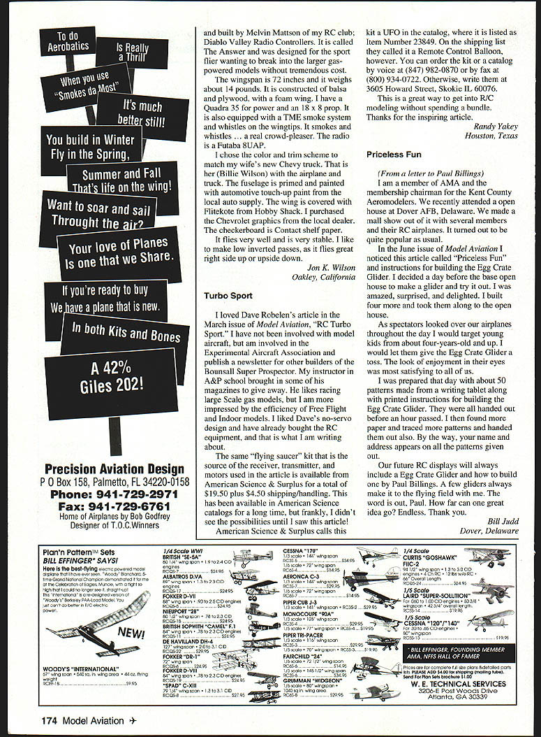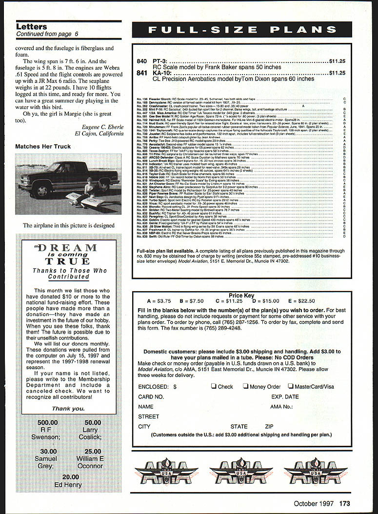 The Smallest 3W Yet Rear induction Carbon fiber reed valve awesome power 0 0 0 0 Auto advance electronic ignition 24cc 145 ci 26 hp 18 x 10 prop Light weight 27 pounds ignition system Easy starting year warranty Economical gas operation 3W Modellmotoren world leader Giant Scale Motors current I0C champion Call information complete line motors 24cc 240cc single four cylinders Exclusive US Representative 3W Modellmotoren Desert Aircraft PO Box 18038 Tucson Arizona 85731 Phone/FAX 520722-0607 Letters tci Editor Proud Member As result having cancer present condition does allow partake hobby loved dearly Sadly have renewed membership past four years Having received letter other day June 19 1997 amazed reassigned license number another RC pilot Due present disabilities cannot walk after hold control radio pain however still manage good days drive over tocal air field watch pilots fly proud member AMA organization will always fondly remembered great friends fellowship AMA promoted would like say hello good friends West Jersey Radio Control Club New Jersey Thomas V Haines Pont Richey Florida Having Fun have discovered wonderful new way have fun hobby Recently started instructing fiveyear-old son Jeffrey fly RC took ten-year-old high-wing trainer added releasable paratrooper keep things interesting hooked up trainer cord transmitter went out field blast Boy prepared much fun would show him joys flying model airplanes picture doesnt justice sheer look fascination comes over little face makes model loop turn through sky its nice have trainer switch . After ten years hobby would never have believed much fun would having right now sharing son recommend anyonetry teaching youngster Youll amazed will change perspective hobby dropping paratrooper gets bored frustrated aint bad either Im sure enjoys morefather son Scott Burt Panama City Florida Kids Day enclosed photo taken Romeo Area R/C Club field May 31 1997 annual Kids Day event kids given foam gliders assemble decorate fly Prizes given duration flight turn flying RC model buddy-cabled transmitter Judging kids parents enthusiasm event great success went long way toward establishing good relations neighborhood residents also let several dads fly buddy transmitters loved will probably sign new members Pete Gayner Rochester Michigan Didnt Listen Mom Mom said dont go near water didnt fly RC seaplane twin-engine water bird scratchbuilt Stand-off Scale Grumman Mallard wing built-up fabricContinued page 173 6 Model Aviation alternative flying temperamental glow-fuel engines Letters Continued page 6 covered fuselage fiberglass foam wing span 7 ft 6 fuselage 5 ft 8 engines Webra 61 Speed flight controls powered up JR Max 6 radio seaplane weighs 22 pounds have 10 flights logged time ready can have great summer day playing water bird Oh ya girl Margie great too Eugene C Eberle El Cajon California Matches Truck airplane picture designed October 1997 173 840PT-3$1125 RC Scale model Frank Baker spans 50 inches 841KA-lO$1125 CL Precision Aerobatics model byTom Dixon spans 60 inches NO 126FIeoeIer Storob 9020010 erodel 2345 5chaooei has both slots 000 fiopo No169Desnyplone 90 version faroed cobjo toodel kit frOor 1937 1925C No262Croohneeter CL crash-proof froiner Tooo sizesf 5-30 000 35/40 powerA No302MInI F-16t 90 Sorpoioo 541 000100 ton sport flier 2 chonnel 80150 wings foil Otto foseloge ofrooforeB No 447 112A Miss Anronloer 90 Old Onter IsA Tenoco 00001 049 glow 2 chonOols C No 501 Gee Boo Model Yt 90 Golden Age Rocot Spono 72-in 00010 64 powor 39100 nfents 6 No702 Nelnket NE 141 FF Soote rnodei 1924 Gennon nonopione HiLine Mini-6 900100 efeclrio wofor SponoSO in A No714 Mod Dank RC soettriendiy Spod fiier toiooed ciow tirght Foceis ow 5mw ororeovers 25-30 power Spons 60 2 pien sheefo . 0 No720 Mlnateesen FE Fronk Zaics pOpoiar olibolsecooerod robborpoworod 000001 token front Popcior Science done 1941 Spone 20 in A No733 1941 Taytonoreft 90 qoe9erscate design cayforos oniqoe fiying qoeiifleo 01 fho foliscaio TayinIcroft 106-inch opon 2 pion 590015. E No736 Joooter PC Soilpione Sos looks pedororance 122-inch open inciodee foft conetroction toot 3 pien 090010 E No759 Arrtbe PP 9000-heid cotapsit giidel Jeon Andrews A 90766 PedOp Toe Dee 01 Opowered 90000001 5P0t 20 inches A No 776 AenodeeOStl SecondOlep FE robber 000401 09000 15 /s irche No769 Cesone 166-ES EIoct9c sailplane 05 power opane 62 inch No 605 Teoo Zephyr FF 56-FIJ Isoacks spans 56 inches No 606 Tn FINe AC sailplane Ohrtsfensen con loonched three ways 090077 inches No 607 ARCSD Dofeoder Class NC Soale Doratioc Mathews spans 70 inches No 606 Lacob Break Bipe Spoc biplane 15-20 Iwo-strokes spans 36 inches No610 Indlseter 90 IrOinor 0000 0001404 foont wing 0900045 inches No611 5575 All-sheet CL froinerlsport 000001 reed-celce 0490 opens 20 inches No614 XB39 NC Eleotric flying wing weighs 46000000 spons 64 inches 2 ehoets No615 Taylor Cob PC Spo9 20010 three channels spans 56 inches No 616 NIbble 350 PP SA record holder Snort Poti spans 55 inchos No 619 Wledeport 90 6100140 Reotinder Scale Ewing spans 96 inchos No 621 Art CheeSe GooO FF No001 Scale 000001 LirsItoot opens 16 robes No 622 Stephese ASro AC Lasor predecessor Sorpolas br 32 power spans 64 inches No 625 Twister Sport 90000401 Richardson 29 power spans 40 inches No 626 PIper Pews. Breoe FF Robber Scale 59 Earl Slahi spans 30 inches No 627 Noes Stept CL Aerobasos design Pyolt opens Sf es No 626 Tarbo Sport Spon twin Electdc PC Robeloo spons 2993 inchOs No 629 VItae 90 spon aerobatic 000401 501 f 9-30 power spans 46 irches No 630 Bloedfe Recordsetting CL Pinto Spoed spoos 32 lonhos No 631 Strider 90 TwoMeter Soeong wodel BirOweil opens 767 loches No632 BashOp 90 TraIner 4046 power spars 6f irches No633 Persadnet CL SportiSlooCornbet Amy opars 39 inches No634 GobIls Electric sport model georod Speed 400 wotoro 5pens 46 inches 5 Gesle Fioedgecnretr3 FfJ FF Pallet spans 54 inches No636 50 Slow MotIoo Third hying-wing sedes bill Econs spans 40 inches No