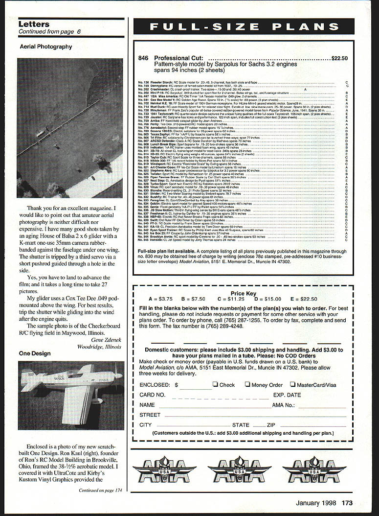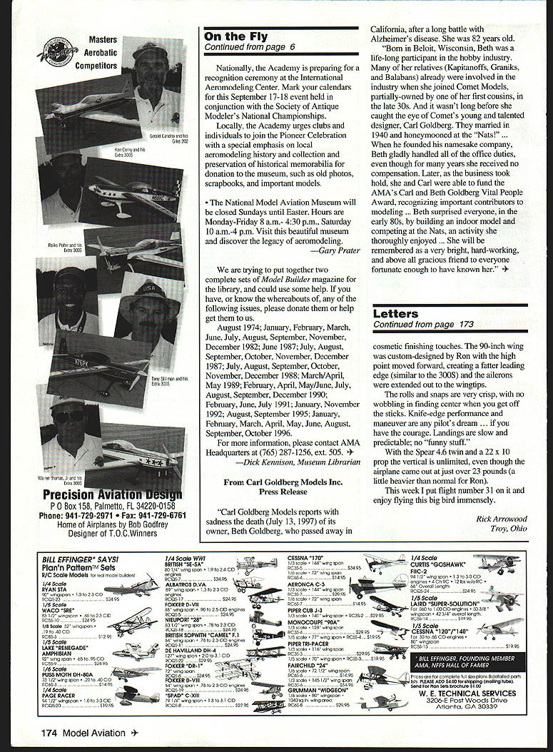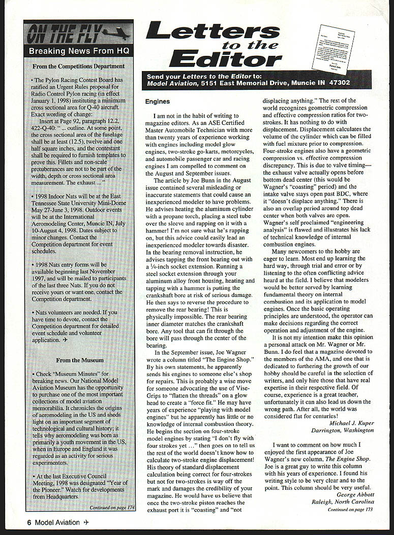 Letters 4w11p n Racing 1I~ Ri ontrol Pylon 11998iil ctioiial ares tnsert Page s sect1Onii least 12 jare inches quiredtO Fillets 12 fl crO t Nats State I11 31 Inten g Cen 1998 es Coflta dep8rtI1~ jutS on depar EtC ci rid VO theM1 ieum neWS- N MuseWflhte mode chin ind Engines am habit writing magazine editors As ASE Certified Master Automobile Technician twenty years experience working engines jcluding model glow engineS twostroke gokarts motorcycles automobile passenger car racing engines am compelled tO comment August September issues article Joe Bufln August issue contained several mjsleadiflg inaccurate statements could cause inexperienced modeler have problems lie advises heating aluminum cylinder propane torch placing steel tube over sleeve rapping hammer Im sure what hes rapping advice could easily lead inexperienced modeler towards disaster bearing removal instruction advises tapping front tearing out i/4.inch socket extension sunning steel socket extension through aluminum alloy front ousing heating tapping hammer putting crankshaft bore risk serious damage lie says reverse procedure remove rear tearing physicallY impossible rear bearing inner diameter matches crankshaft bore Any tool can fit through bore will pass throUgh center tearingber issue Joe Wagner Septem wrote column titled Engine Shop own statements apparentlY sends engines someone elses shop repairs probably wise move someone ~vocating use ViseGrips flatten threads glow head create force fit lie may have years experience playing model engines apparently has little no flowledge internal combustion theory lie begins section fourstroke model engines stating dont fly four strokes yet es tell us rest world doesnt know calculate twostroke engine displacement liis theory standard displacement calculation being correct fourstrokes twostrokes way off mark damages credibilitY magazine lie would have us believe once twostroke piston reaches exhaust port toasting displacing anything rest world ~cogniZes geometric compression effective compression ratios two strokes has othingto Displacement cal lt~ displacementcua volume cylinder can filled fuel mixture prior compression Fourstroke engines also have geometric compression vs effective compression jscrepancY due tO valve timing exhaust valve actually opens before bottom dead center would Wagners 0asting period intake valve stays open past BDC doesnt displace anything also overlap period around top dead center both valves open Wagners self proclaimed ~ngineering analysis flawed illustrates lack technical floWledge internal combustion engines hobby newcomers eager learn Most end up ~arning hard way ~rough trial error j5teningto often 0nflicting advice heard field 1 believe modelers would better served ~arning fundamental theory inteflal combustion its application model engines Once basic operating principles understood operator can make decisions regarding correct operation adjustment engine intention make opinion personal attack Mr Wagner Mr Bunn feel magazine devoted members AMA dedicated furthering growth hobby should careful selection writers hire have real expertise respective field course experience great teacher ~fortunately can also lead us down wrong path After world considered flat centuries Michael J Kupe want comment much enjoyed first appearance Joe Wagners new column Engine Shop Joe great guy write column years experience found writing style very clear point column should very useful george AbbO aleigh North CarOli Continued page 1 ArrIcd AviatiQO ers Continued page 6 Aerial Photography Thank excellent magazine would like point out amateur aerial photography neither difficult nor expensive have good shots taken aging House Balsa 2 x 6 glider K-mart one-use 35mm camera rubberbanded against fuselage under wing shutter tripped third servo via short pushrod guided through hole side Yes have land advance film takes long time take 27 pictures glider uses Cox Tee Dee 049 podmounted above wing best results trip shutter gliding wind after engine quits sample photo Checkerboard R/C flying field Maywood Illinois Gene Zdenek Woodridge Illinois Design Enclosed photo new scratchbuilt Design Ron Kaul right founder Rons RC Model Building Brookville Ohio framed 38-% aerobatic model covered UltraCote Kirbys Kustom Vinyl Graphics provided Continued page 174 1 APrice Key Fill $750C 5D 0 E 0 blanks below numbers plans wish order best handling please include requests payment some other service plans order order phone call 765 287-1256 order fax complete send form fax number 765 289-4248 I II ____ ____ ____ ____ ____ ____ Domestic customers please include $300 shipping handling Add $300 Ihave plans mailed tube Please No COD Orders Make check money order payable US funds drawn US bank to I ModelAviation AMA 5151 East Memorial Dr Muncie IN 47302 Please allowI three weeks delivery I II ENCLOSED $J Check y Order erCardNisa CARD NOEXP DATE I NAME________________________________AMA No ____________I I STREET ICITY _____________--______ STATE ____ ZIP I stomers outside us add $300 additional shipping handling per plan L SA January 1998 173 846 Professional Cut$2250 Pattern-style model Sarpolus Sachs 32 engines spans 94 inches 2 sheets NO 136FIcoelor StotnO BC Scole ttbcdol tot 2345 5-channel has both slotc tiapsC No 169Denepplone BC cotaton tannod cabin cadol kit front 1537 10-25C No 262Croshesoster CL ctash-ptsat ttaise Two sivea1535 35140 pawot No 302Mtnt F16 RC Satpclvn 549 dactod tan spas tite 2 channol Balsa wings tail tasetage attactane8 No ad112A MIss AssertS BC Old Tinnan /A Tococo Inadol 049 glow 2 channolsC No 981Gee Bee Model Vt BC Goldon Age RobOt Spans 72-in scale tot 60 psant 3 plan shoots No 702Helokol 6618 FF Scala acdot ct 1924 Gannan tnoncplano Fct HiLino Mini-h geatod olacttic octo Spans2g inA No714Mod 300kl BC aoot-ttiocdty Spas tilon tat tolocod stow flight Eccols Ico sico nanoasots 25-35 pawn Spans 60 2 plan shoots.D No720Mtnatennon FF Fnank ZeiSs papalat all-balsa-occotod ncbben