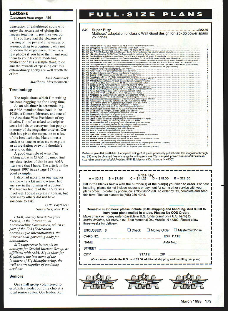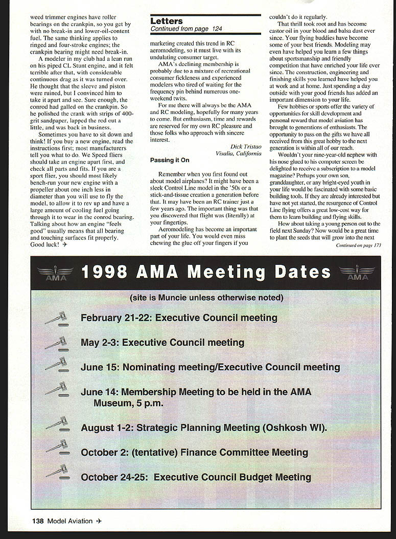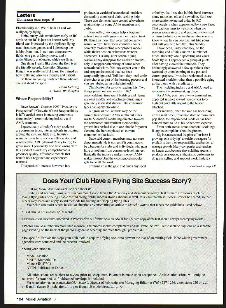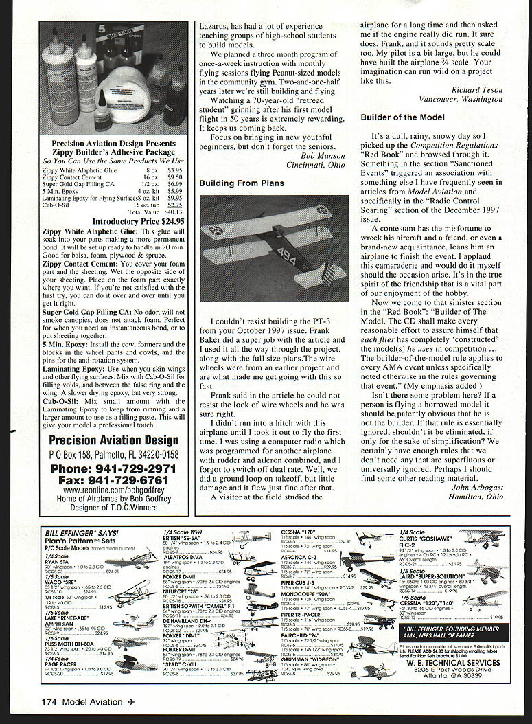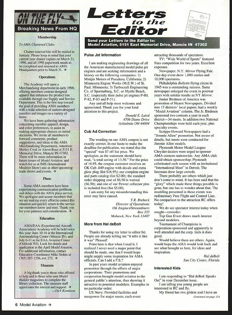 I am making engineering drawings American manufactured model pulse jet engines am seeking information history following companies 1 Minijet Motors Pasadena California 2 Minnesota Engine Works MEW St Paul Minnesota 3 Turbocraft Engineering Co Spartanburg SC Myrtle Beach SC especially pulse jet engines P-80 P-82 P-83 P-5 1 Any help welcome appreciated Thank kind attention project Donald E Laird 4706 Diane Drive Ashtahula OH 44004 Cub Ad Correction wording AMA coupon exactly correct haste make deadline publication stated special $7 off list price apologize statement should have read total saving 1350 price 1695 coupon customer receives OK Cub 049 engine decals extra glow plug list $1695 complete engine parts catalog list $200 standard order shipping cost $650 waived $650 Pewter collector pins included free list $500 am sorry misunderstanding error may have caused TR Brebeck Director Operations OK Engines/St reamliners Box 355 Mohawk New York 13407 Thanks using letter editor bit People already telling tells like Pleased Point read realized never used major point should made would hope might supply some inspiration AMA officials Can add PS past years model aviation enjoyed promotion through efforts major orporations promotions cooperation brought model aviation general publics attention thus showing attractive potential modelers Examples no particular order US Navy Provided facilities manpower major meets event attracting thousands spectators TV Wide World Sports featured Nats competition two years Excellent exposure Newspaper NY Mirror Flying Fair One-day event drew 1000 entries 10000 spectators Philadelphia Bulletin flying circus 1945 outstanding success Same newspaper enlarged event postwar years similar results NY Mirror Junior Birdmen America promotion Hearst Newspapers Divided 17 districts local papers weekly Model Aviation column Jr Birdmen sponsored two contests year district34 meets addition two National Championships held year plus specialty events Scripps-Howard Newspapers Jimmie Allen promotion aware details meets conducted Jimmie Allen models Plymouth Motor Model League Chrysler dealers urged sponsor AMA contests nationwide Any AMA club could obtain sponsorship Plymouth culminated season invitational International Meet Detroit Intemats drew large crowds probably others just dont come mind has said glory made things possible gone has wonder about modeling presented events rudimentary Free Flight Control Line No comparison attraction RC offers today see spectator interest today soughtconsider Top Gun Event draws much interest beyond modelers Tournament Champions corporation-sponsored apparently well attended corp feels does good Would believe others Again would hope AMA would look back see what brought us ideas inspiration Hal deBolt Sun City Center Florida Interested Kids am responding Hal deBolt Speaks Out December issue am telling young people interested RC fly friend has two gliders have Continued page 124 6 Model Aviation e Jet Information Letters tc th Editor Hal deBolt Letters Continued page 6 Electric sailplane both 11 really enjoy flying think kids would love fly RC airplane RC just known well friend interested airplanes flying near soccer games picked up hobby him area two fields gas Menymoore glider/Electric 60 acres fly thing really like about field friendly people pilot Sherman Knight really helpful us trained us fly also friendly patient So young pilots out excited about sport Brian Gehring Kirkland Washington Responsibility Dave Browns October 1997 Presidents Perspective Growth Responsibility carried some interesting comments about todays aeromodeling industry AMA members agree todays entry modelers consumer types interested buzzing around sky little else Industry manufacturers have successfully created marketed ARF Almost Ready Fly grow sales personally find little wrong product industry competitiveness produces quality affordable models benefit both beginner experienced markets products success however has produced wealth recreational modelers descending upon local clubs seeking help two elements have created love/hate relationship some AMA members clubs Personally no longer help beginner unless see willingness part treat RC flying current consumer whim have spent countless hours correctly reassembling neophytes model attention interests wander elsewhere Usually after several flying sessions disappear weeks months reappear after tiring some other recreational whim Yet expect fix prepare model has temporarily ignored Tell need chores part learning process labeled unhelpful jerk Clarification anyone reading Two things please immensely RC aeromodeling time spent building flying own models coaching/counseling genuinely interested student consumer types can apply elsewhere grow die attitude may current business AMA motto has warts Successful marketing directed toward newcomer resultant membership growth has peaked due simple forgotten element burden placed current members enthusiasm Dave said current members may care about growth correct continues burden clubs individuals gain little nothing consumer-level interest Basically industry makes money AMA makes money experienced modeler gets work Enthusiasm glue binds sport hobby still see bubbly bond between modelers old new alike see caution exercised today RC aeromodelers approached new face caution turns welcome person seems sincere genuinely interested turns distance newbie wants know can buy just like yours will help him fly Sunday have understandably receiving end caution number times Recently spectating Giant Scale fly-in approached group pilots after having viewed models hesitatingly answered few questions warmed up upon learning past current projects welcomed interested modeler rather possible aging go-kart jock credit card modeling industry AMA need recognize erosion taking place AMA have always assumed expected support toward newcomers high paid little regard burden attached industry once sale has rung up via mail