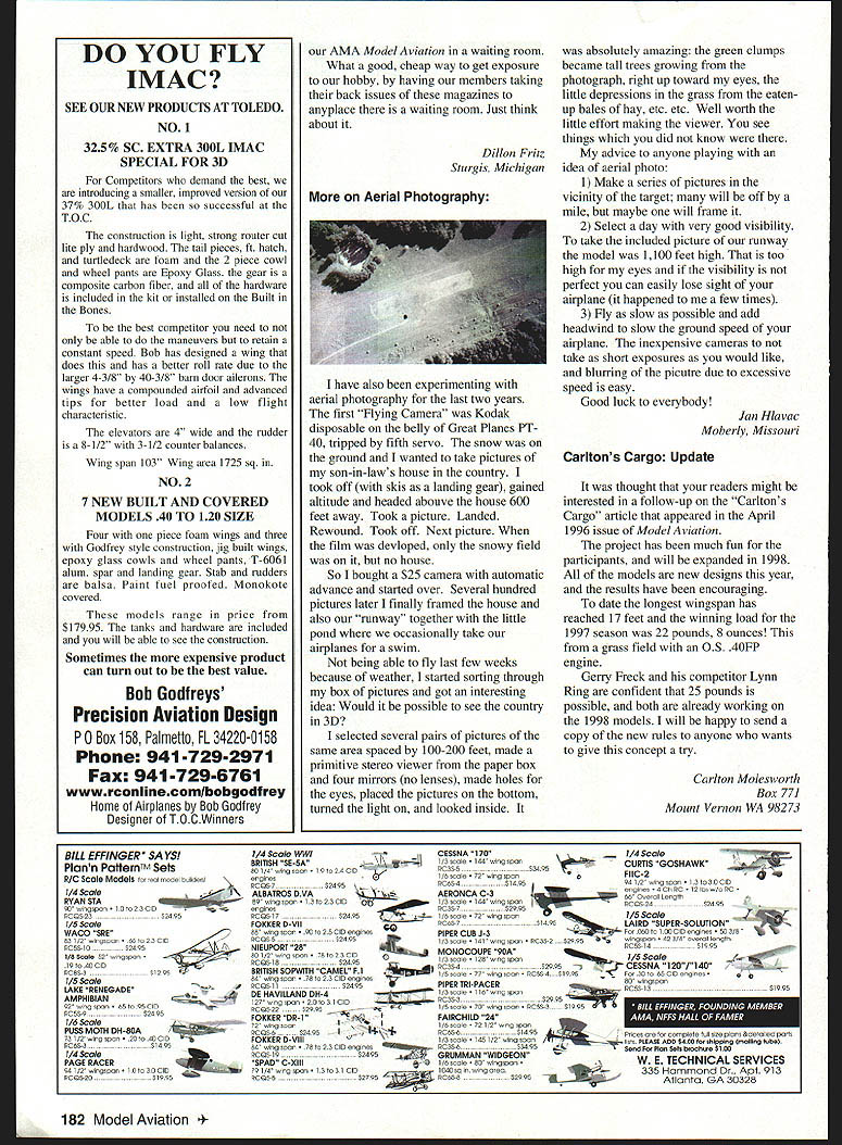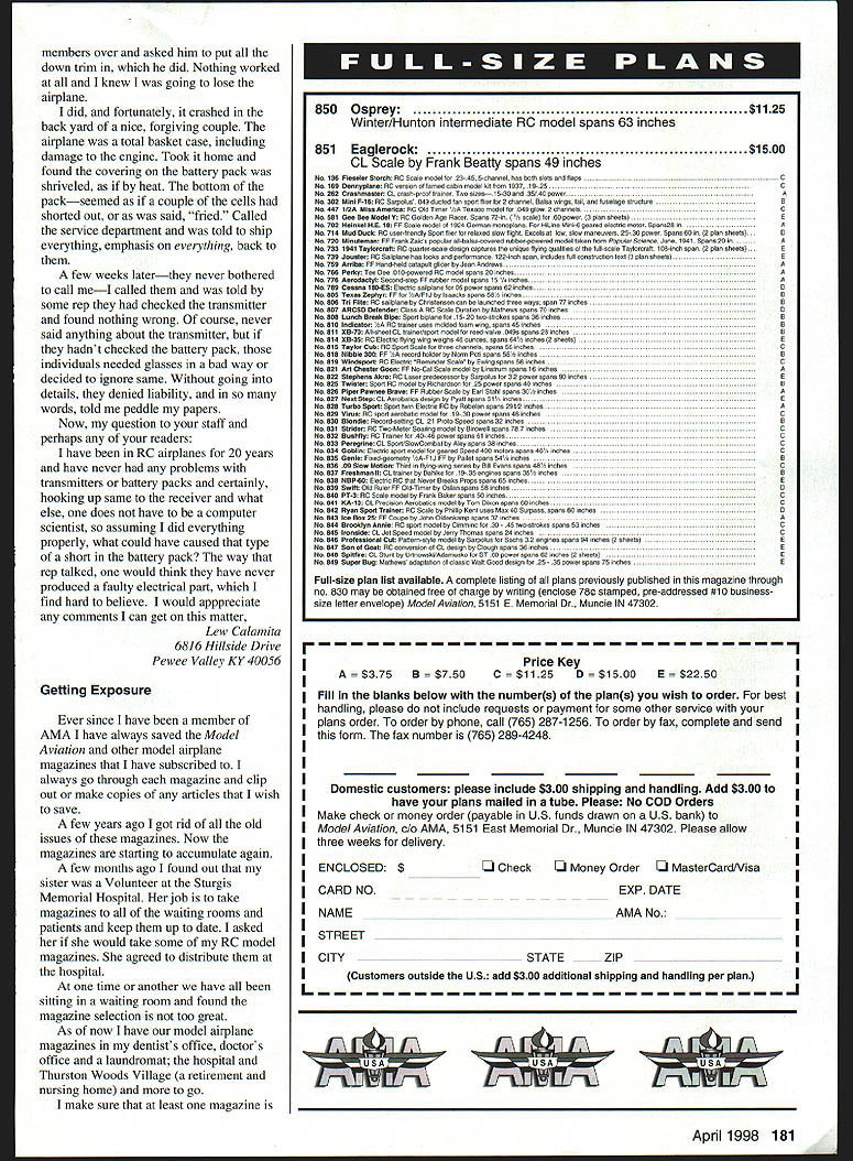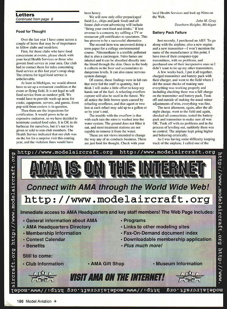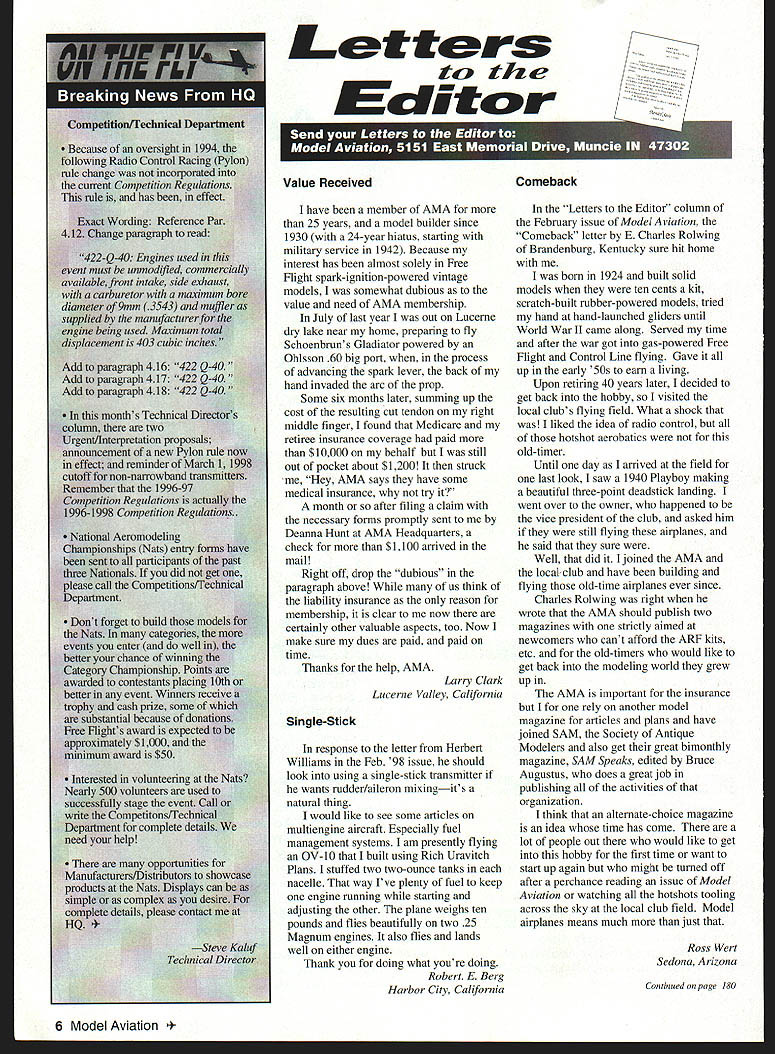 I have member AMA 25 years model builder since 1930 24-year hiatus starting military service 1942 Because interest has almost solely Free Flight spark-ignition-powered vintage models somewhat dubious value need AMA membership July last year out Lucerne dry lake near home preparing fly Schoenbrun s Gladiator powered Ohlsson 60 big port process advancing spark lever back hand invaded arc prop Some six months later summing up cost resulting cut tendon right middle finger found Medicare retiree insurance coverage paid $10000 behalf still Out pocket about $1200 struck Hey AMA says have some medical insurance try month after filing claim necessary forms promptly sent Deanna Hunt AMA Headquarters check $1100 arrived mail Right off drop dubious paragraph above us think liability insurance reason membership clear now certainly other valuable aspects too Now make sure dues paid paid time Thanks help AMA Larry Clark Lucerne Valley California response letter Herbert Williams Feb 98 issue should look using single-stick transmitter wants rudder/aileron mixingits natural thing would like see some articles multiengine aircraft Especially fuel management systems am presently flying OV-l0 built using Rich Uravitch Plans stuffed two two-ounce tanks nacelle way Ive plenty fuel keep engine running starting adjusting other plane weighs ten pounds flies beautifully two 25 Magnum engines also flies lands well either engine Thank doing what youre doing Robert E Berg Harbor City California Letters Editor column February issue Model Aviation Comeback letter E Charles Rolwing Brandenburg Kentucky sure hit home born 1924 built solid models ten cents kit scratch-built rubber-powered models tried hand hand-launched gliders until World War II came along Served time after war got gas-powered Free Flight Control Line flying Gave up early SOs earn living Upon retiring 40 years later decided get back hobby visited local clubs flying field What shock liked idea radio control hotshot aerobatics old-timer Until day arrived field last look saw 1940 Playboy making beautiful three-point deadstick landing went over owner happened vice president club asked him still flying airplanes said sure Well did joined AMA locabclub have building flying old-time airplanes ever since Charles Rolwing right wrote AMA should publish two magazines strictly aimed newcomers cant afford ARF kits etc old-timers would like get back modeling world grew up AMA important insurance rely another model magazine articles plans have joined SAM Society Antique Modelers also get great bimonthly magazine SAM Speaks edited Bruce Augustus does great job publishing activities organization think alternate-choice magazine idea time has come lot people out would like get hobby first time want start up again might turned off after perchance reading issue Model Aviation watching hotshots tooling across sky local club field Model airplanes means much just Ross Wert Sedona Arizona Continued page 180 6 Model Aviation e ReceivedComeback Let ters tci Ecfitcw Single-Stick Letters Continued page 6 Food Thought Over last year have come across couple items may importance fellow clubs modelers First clubs have food concessions events please check local Health Services govern food service area club contact rules concerning food service last years swap shop criteria legal food service unbelievable least Michigan would almost have set up restaurant condition event flying field legal sell food service outdoor grill would have provide wash-up areas cooks equipment servers guests pop sold coolers question inspections certification would prove expensive endeavor have decided terminate cooked food sales OK barbecue ourselves its given sold non-club members Health Service indicated club list surprise visit coming year violation fines would have heavy will now offer prepackaged food ie chips junk food future club event advertising will include Bring own food drinks lost revenue concern try raffling TV restaurant gift certificates spectators has proven successful alternative second item uncovered doing term paper college environmental course Nitromethane terrible pollutant also carcinogen Nitro fumes inhaled can absorbed directly blood through skin Once body collects liver accumulates dangerous levels can also cause nervous system damage course findings lab rats fed stuff quantity think will make little effort keep hands out fuel refueling overflow capture will also used future notice little brown spots caused refueling overflows squirt two lost refuel may add up gallon years end trouble overflow rain nitro washed water system ground does filter out treatment stations capable remove water views intended change way us conducts business just food thought Check local Health Services look up Nitro Web John M Gray Dearborn Heights Michigan Battery Pack Failure Just recently purchased ARF go along airplane also new engine new transmitterI wont mention name manufacturer point have two computer-type transmitters no problems purchased inexpensive ones didnt want tie up other transmitters few weeks back put together charged transmitter battery pack charger went field did usual checks making sure everything working properly including checking full charge transmitter battery pack Took off outside making usual minor adjustments trim everything fine next afternoon again after allnight charge went field again checked connections tested battery pack transmitter make sure OK Took off no problems process leveling out suddenly no control airplane kept going higher behaving erratically As having some difficulty keeping track airplane called 180 Model Aviation ers over asked him put down trim did Nothing worked knew going lose airplane did fortunately crashed back yard nice forgiving couple airplane total basket case including damage engine Took home found covering battery pack shriveled heat bottom packseemed couple cells shorted out said fried Called service department told ship everything emphasis everything