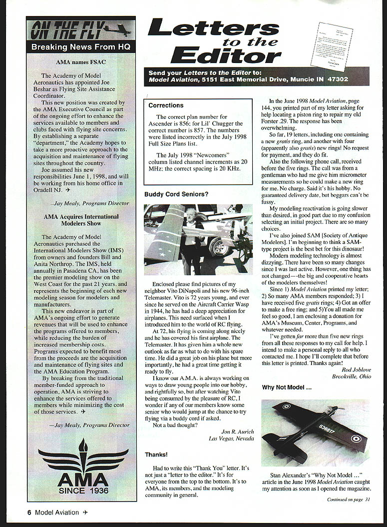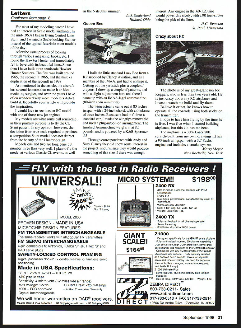 Buddy Cord Seniors Enclosed please find pictures neighbor Vito DiNapoli new 96-inch Telemaster Vito 72 years young ever since served Aircraft Carrier Wasp 1944 has deep appreciation airplanes need surfaced introduced him world RC flying 72 flying coming along nicely has covered first airplane Telemaster has given him whole new outlook far what spare time did great job plane importantly great time getting ready fly know AMA always working ways draw young people hobby rightfully after watching Vito being consumed pleasure RC wonder members know some senior would jump chance try flying via buddy cord asked bad thought Jon R Aurich Las Vegas Nevada write Thank letter Its just letter editor Its everyone top bottom Its AIVIA its members modeling community general 3 June 1998 Model Aviation page 144 printed part letter asking help locating piston ring repair old Forster 29 response has overwhelming So far 19 letters including containing new gratis ring another four apparently also gratis new rings No request payment fit Also following phone call received before five rings call gentleman give him micrometer measurements could make new ring No charge Said its hobby No guaranteed delivery date beggars cant fussy modeling reactivation going slower desired good part due confusion selecting initial project choices Ive also joined SAM [Society Antique Modelers] Im beginning think SAMtype project best bet dinosaur Modem modeling technology almost dizzying have changes since last active However thing has changed-the big cooperative hearts modelers themselves Since 1 Model Aviation printed letter 2 So AMA members responded 31 have received five gratis rings 4 Got offer make free ring 5You made feel good am enclosing donation AMAs Museum Center Programs whatever needed Ive gotten far five new rings responses call help intend make personal reply contacted hope Ill complete before letter printed Thanks again Rod Joblove Brookville Ohio Model Stan Alexanders Model article June 1998 ModelAviation caught attention soon opened magazine Continued page 31 6 Model Aviation ect plan number Ascender 856 Lil Chugger correct number 857 numbers listed incorrectly July 1998 Full Size Plans list July 1998 Newcomers column listed channel increments 20 MHz correct spacing 20 KHz Letters tc Editor Corrections Thanks Letters Continued page 6 modeling career have interest Scale model airplanes mid-i 960s began flying Control Line Stunt wanted Scale-looking Stunter instead typical futuristic stunt models day After usual process looking through various magazine books etc found Hawker Hunter immediately fell love its beautiful lines Since have built three semiscale Hawker Hunter Stunters first built around i965 second i966 third dupiication second 1998 As mentioned article aircraft has several features make ideal modeling subject over years have often wondered modelers didnt build Hopefully article wili provide inspiration would love see RC model new jet engines models what some call semiscale primary purpose fly CL Stunt pattern opinion however deviation true scale required produce competition Stunt model does detract beauty Hunter design Models two long gone number three flies very well plan fly model various Classic CL events well Nats summer Queen Bee Jack Sunderland Hilliard Ohio built little standard Lazy Bee Kit supplied Clancy Aviation member IMAA just enlarge Getting out yardstick plus couple crayons drew up couple patterns slight adjustment came up IMAA-legal aeromachine 80-inch span minimum wing actually came out 80 inches span 24-inch chord thickness three inches Because fit standard car made wingtips removable used plug-in/bolt-on arrangement finished Aeromachine weighs 85 pounds powered K&B Sportster 65 Through correspondence Andy Suzy Clancy did show some interest project Im sure would produce something size enough interest Any engine 60-120 size would power nicely 90 four-stroke being pick litter HG Evanson St Paul Minnesota Crazy about RC photo great-grandson Joe Ruggeri less two years old just crazy about RC airplanes loves watch build fly Believe knows operate controls using both sticks transmitter hope have him flying time five five started buiiding airplanes kid has beat airplane 30% Laser 200 scratch-built own drawings has 90-inch wingspan 37 Sachs engine includes smoke system Marty Meyer New Rochelle New York 33 U 9 9 UNIVERSAL!MICRO SYSTEM!$19800 Z400 RX IU amnaue4channe 5pe 0 mance 527Mhz FM Tue digital performance affec ed ussa GB s erference $995M croprocessor decoder 1 YsasSze 1 1/8 long 5/8 wide 1/2 P us Sh pp ngWeight Less 1 oz MODEL Z800Z400 TX PROVEN DESIGN MADE IN USA Fu y ayntheaized channe ope Servo Reveraing MICROCHIP DESIGN FEATURES Small size dry cell NiCd powe FM TRANSMIrrER INTERCHANGEABLEGIANTZIOOO same receiver works popular FM transmitters Designed specifically GIANT scale airplane FM SERVO INTERCHANGEABLESCALES Fully synthesized receiver 50-channel capability Dual conversion high 301P protection same great 4-pin connectors fit Airtronics Futaba J JR Hltec S 95performance reliability universal receiver DAD Servo plugs$1 E4compatible FM transmitter PPM format SAFETYLOCKED CONTROL FRAMINGM croprocessor decoder Fully optically isolated buffered servo ostputs allows separate Digital processor locks Tx control frames faultless servoservo receiver battery No need separate positioningfilters buffers integral isolated smoke pump ch 6V@1 amp ZIODO UltImate Pius Made USA Specifications Same fetttsres plus servo battery data logging 3Lx 1 25Wx 625H080z WI ABS plastic caseTM bility Size 3 long 1 3/4 wide 5/8 tall weight 4 oz Sensitivity 4 micro volts 2 miles free air rangei&a.iTM Max Voltage l2VdcCurrent Drain 25 milliampsZEBRA DIRECT 1999 approvedLimited Three-Year Warranty800-733-0211- Sales Crystal Interchangeablewwwzebradirectcom will honor warranties DAD receivers D R E c T 3177330513 317-733-0514 Master Card & Visa accepted $3 Shipping/credit card $5 Shipping/COD10706 De Andra Drive Zionsvill