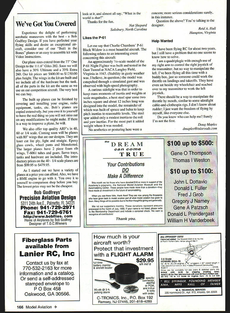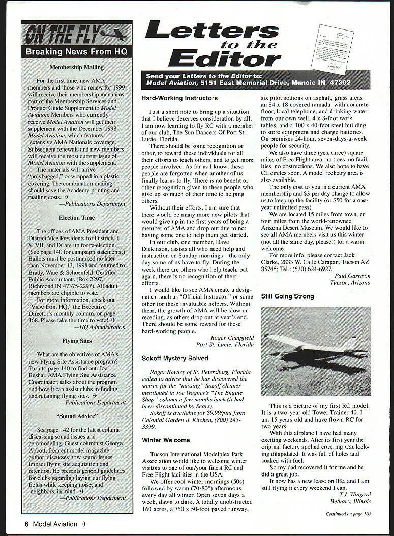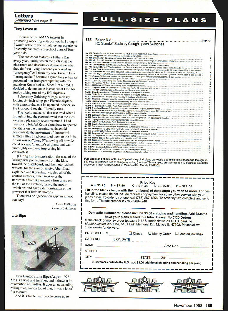 Just short note bring up situation believe deserves consideration am now learning fly RC member club Sun Dancers Port St Lucie Florida should some recognition other reward individuals efforts teach others get people involved As far know people forgotten another us finally learns fly no benefit other recognition given people give up much time helping others Without efforts am sure would new pilots would give up first years being member AMA drop out due having some help get started club member Dave Dickinson assists need help instruction Sunday morningsthe day some us have fly During week others help teach again no recognition efforts would like see AMA create desig nation such Official Instructor some other invaluable helpers Without growth AMA will slow receding others drop out years end should some reward hard-working people Roger Campfield Port St Lucie Florida Sokoff Mystery Solved Roger Rowley St Petersburg Florida called advise has discovered source missing Sokoff cleaner mentioned Joe Wagners Engine Shop column afew months back discontinued Sears Sokoff available $999/pint Colonial Garden & Kitchen 800 2453399 Tucson International Modelplex Park Association would like welcome winter visitors our/your finest RC Free Flight facilities USA offer cool winter mornings 50s followed warm 7080O afternoons day winter Open seven days week dawn dark totally unobstructed 160 acres 750 x 50-foot paved runway six pilot stations asphalt grass areas 84 x 18 covered ramada concrete floor local telephone drinking water own well 4 x 8-foot work tables 100 x 40-foot steel building store equipment charge batteries premises 24-hour seven-days-a-week people security also have three yes three square miles Free Flight area no trees no facil ities no obstructions also hope have CL circles soon model rocketry area also available cost current AMA membership $3 per day charge allow us keep up facility $50 oneyear unlimited pass located 15 miles town four miles world-renowned Arizona Desert Museum would like see AMA members visit us winter same day please warm welcome info please contact Jack Clarke 2833 W Calle Carapan Tucson AZ 85745 Tel 520 624-6927 Paul Garrison Tucson Arizona Still Going Strong picture first RC model two-year-old Tower Trainer 40 am 15 years old have flown RC two years airplane have exciting weekends After its first year original factory applied covering look ing dilapidated full holes soaked fuel So dad recovered did great job now has new lease life am still flying weekend can TJ Win gard Bethany Illinois Continued page 165 6 Model Aviation ship Ma Letters twz th Ecfitcar Hard-Working Instructors Winter Welcome Letters Continued page 6 Loved view AMAs interest promoting modeling youth thought would relate interesting experience recently preschool class four year-olds preschool features Fathers Day year during dads visit classroom describe demonstrate what living recently received emergency call son Bruce surrogate dad because symphony rehearsal prevented him participating grandson Kevins class Since Im retired decided demonstrate instead what did fun taking RC airplanes chose Goldberg Mirage classy looking 54-inch-wingspan Electric airplane motor can operated indoors kids could see really runs oohs aahs occurred brought room showed kids pleasantly receptive mood previously briefed Kevin about operate sticks transmitter could demonstrate movement control surfaces after described kids Kevin cloud 9 showing off could operate Grandpas airplane thoroughly enjoying impressing classmates During demonstration nose Mirage pointed away kids toward blackboard motor switch off sake safety After explained Kevin wiggled control surfaces took over transmitter Kevin got firm grasp tall airplane turned motor switch gave demonstration power little 05 motor no generation gap school day Gene Wilkison Prescott Arizona Lite Bipe IPrice Key A$375B$750C$1125D$15O0Ew$2250 Fill blanks below numbers plans wish order best handling please include requests payment some other service plans order order phone call 765 287-1256 order fax complete send I form fax number 765 289-4248I ___ ___ ___ ___ ____ ___ I Domestic customers please include $300 shipping handling Add $300 Make have plans mailed tube Please No COD Orders check money order payable US funds drawn US bank Mode/Aviation 0/0 AMA 5151 East Memorial Dr Muncie IN 47302 Please allowI three weeks delivery ENCLOSED $ ___ ___ k y Order J MasterCardNisa I CARD NO EXP DATE INAME _ __ __ __ ___ __ AMA No ___ ______ STREET __ __ ___ ___ ______I _I CITY __ _ _ __ __ -STATEZIP__ __ ___ I stomers outside US add $300 additional shipping andhandling per plan L John Huntons Lite Bipe August 1992 MA wild fun flier draws lot attention fun-flys does outstanding rolling turn top lot fun build fun hear people come up November1998 165 865 Faker D-8$2250 RC Standoff Scale Ciough spans 64 inches No136 Finoole Stoesh PC Scale roodal 2345 5-0500001 has both sloto aod flapsC No169Dennyplono RCoerojoo famed oabin rrlodel kit front 1937 1935C No262Crashmaste CL crash proof troioer Two oizos 1530 35/40 powerA No302Miof p16 PC Sarpoloo 549 dacrod too sport fiierforoooaoooi Balow wings toil aodfoselagostroctoreB No 447112A Mien Aereriso PC Old tistor leA Taooco stodel 049 glow 2 chaoneioC No901Ge Bee Modol 5 PC Golden Ago Racor Speos 72-in lr scale 60 pose Spios oheets Ne 7020010601 lIE 10 PP Scale stodel sf1924 Gerstoo stonoploos HiLioe Miol-A geared electric stotor Spons2g inA No714Mad Desk PC oserfriendlp Spos fliertor celased slow flight Foceisat low slow staneocers 2530 power Spans 600 2 piwO Shoots0 No 720MiOutotose PP Prank Zoics popolor aiibaieocccered robberpoweroo stodel taboo frost Popotar Sc/coca Jo00 1941 Spans 200A No 7331941 Taperereft PC qoaeerscaie desigo captains ooigoe flylog goalities fhe foiiscoio Taylororag tOAioch spao 12 pieo sheetsS No739Joeste PC Saiipiooe has looks pedorstance t22inch span inciodos foil coostrootico toot 3 pbs sheets No 799A,jbe Pp Handheid catapoi