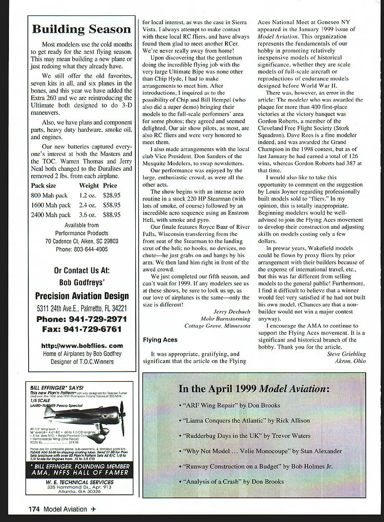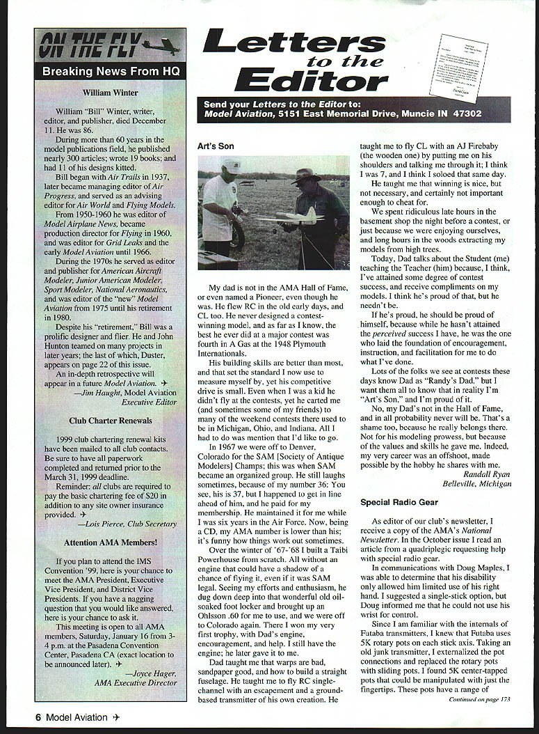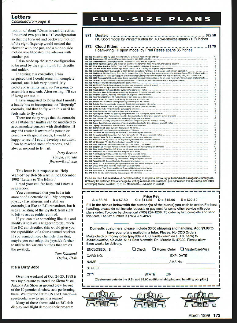 My dad AMA Hall Fame named Pioneer though flew RC old early days CL too never designed contestwinning model far know best ever did major contest fourth Gas 1948 Plymouth Internationals building skills better set standard now use measure myself yet competitive drive small kid didnt fly contests yet carted sometimes some friends weekend contests used Michigan Ohio Indiana mention Id like go 1967 off Denver Colorado SAM [Society Antique Modelers] Champs SAM became organized group still laughs sometimes because number 36 see 37 happened get line ahead him paid membership maintained six years Air Force Now being CD AMA number lower its funny things work out sometimes Over winter 67-68 built Taibi Powerhouse scratch engine could have shadow chance flying it SAM legal Seeing efforts enthusiasm dug down deep wonderful old oilsoaked foot locker brought up Ohlsson 60 use off Colorado again won very first trophy Dads engine encouragement help still have engine later gave Dad taught warps bad sandpaper good build straight fuselage taught fly RC singlechannel escapement groundbased transmitter own creation taught fly CL AJ Firebaby wooden putting shoulders talking through think 7 think soloed same day taught winning nice necessary certainly important enough cheat spent ridiculous late hours basement shop night before contest just because enjoying ourselves long hours woods extracting models high trees Today Dad talks about Student teaching Teacher him because think Ive attained some degree contest success receive compliments models think hes proud neednt hes proud should proud himself because hasnt attained perceived success have laid foundation encouragement instruction facilitation what Ive done Lots folks see contests days know Dad Randys Dad want know reality Im Arts Son Im proud No Dads Hall Fame probability never will Thats shame too because really belongs modeling prowess because values skills gave Indeed very career offshoot made possible hobby shares Randall Ryan Belleville Michigan Special Radio Gear As editor clubs newsletter receive copy AMA s National Newsletter October issue read article quadriplegic requesting help special radio gear communications Doug Maples able determine disability allowed him limited use right hand suggested single-stick option Doug informed could use wrist control Since am familiar internals Futaba transmitters knew Futaba uses 5K rotary pots stick axis Taking old junk transmitter externalized pot connections replaced rotary pots sliding pots found 5K center-tapped pots could manipulated just fingertips pots have range Continued page 173 6 Model Aviation ers tc Ecfitcr Arts Son Letters Continued page 6 motion about 75mm direction mounted two pots iguration forward backward motion right fingertip would control elevator pot side-to-side motion would control ailerons another pot also made up same configuration used right thumb throttle rudder testing controller surprised could remain complete control felt very natural prototype rather ugly Im going assemble new unit After testing Ill see Doug can use have suggested Doug modify buddy box incorporate fingertip controls fly until feels safe fly solo ways controls Futaba transmitter can modified accommodate persons disabilities MA reader aware person persons special needs would happy see could develop solution can reached afternoons always respond E-mail Jerry Bernor Tampa Florida jbernor@aolcom letter response Help Wanted Bob Stewart December 1998 Letters Editor read call help have suggestion commented fair amount electronic skill computer joystick has ailerons stabilizer controls just like RC transmitter uses twisting joystick right left act rudder control can take something like modify have trigger throttle much like RC car throttles would give capabilities four-channel receiver wanted channels maybe can adapt joystick further utilize various buttons joystick Tom Diamond Ogden Utah Its Dirty Job Over weekend Oct 24-25 1998 pleasure attend Sierra Vista Arizona Air Show ground crew 10 premier air show acts performing tour entire US Canadaa spectacular way spend season shows add RC club display flight demo program 1 Price KeyI B C 5D 0E 0 Fill blanks below numbers plans wish order best handling please include requests payment some other service plans order order phone call 765 287-1256 order fax complete send I form fax number 765 289-4248 I I___ ___ ___ ___ ____ ____ II Domestic customers please include $300 shipping handling Add $300 Makehave plans mailed tube Please No COD Orders check money order payable US funds drawn US bank ModelAviation AMA 5151 East Memorial Dr Muncie IN 47302 Please allowI three weeks delivery I ENCLOSED $U CheckU Money Order U MasterCardNisaI I CARD NO DATE NAME No___ STREET_______________ I CITYSTATEZIP________ ICustomers outside US add $300 additional shipping handling per planI L-I mr61r\ March 1999 173 871 Duster$2250 RC Sport model Winter/Hunton 40 two-strokes spans 711/2 inches 872 Cloud Kitten$375 Foam-wing FF sport model Fred Reese spans 35 inches No 136 Fieseler Stech PC Scale model 23-45 S-channel has both slots flapsC Na 169Osnepplnee ACeersios tasted cabin modal kit 1937 tR-25C No262Crashmoster CL crash proof traiser Two sizes tS-30 sad 35140 powerA No202Mini F-tB AC Sarpoles 549 dacted foe spas tIler 2ahassel Balsa wisga tail asd tuseloga structureP No 447125 Miss America PC Old Time teA Taseas model far 040 glow 2 ehassolsC No591 Gee Ben Medni Pt PC Goldes Age Pose Spass 72-is Ic scale 60 pews 3 plas sheets No702 Heinkel NE 19 FF Scale model 1924 Germas macapiece HiLie Misi-0 geared alact,c meter SpassoP is A No 714 Mcd Dook PC use-triesdly Sped flier far relased slowtlight Esealsat law slow maseececs 25-30 pawe 5passuO 2 pIes sheets. 0 No 720 Minuteman FF Frook Zeiss popular all-balsacovasad rubbar-powarad model takes trom Popular Scicece ieee t54t Spass2S is A Ne 733 1941 TaplorcaB PC geade-scale desigs eaptenos edges flylag gealitas tell-seals Taylercrah too -jeeP spas 2 pias