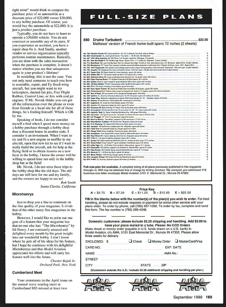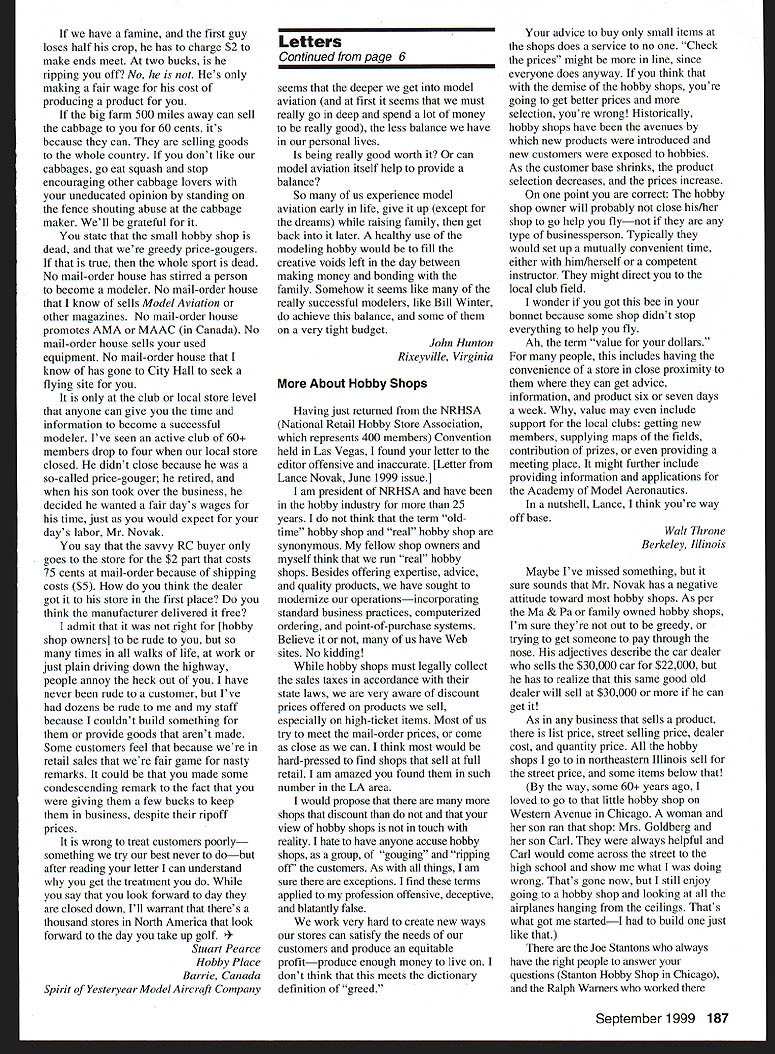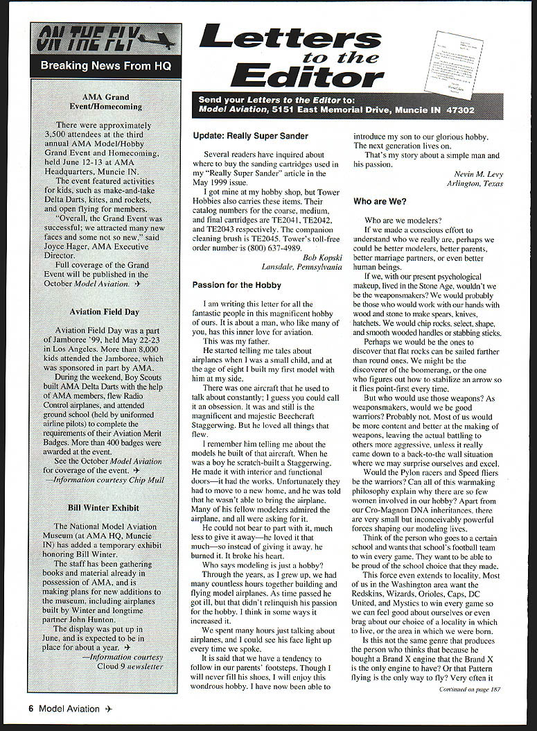 Several readers have inquired about buy sanding cartridges used Really Super Sander article May 1999 issue got hobby shop Tower Hobbies also carries items catalog numbers coarse medium final cartridges TE2041 TE2042 TE2043 respectively companion cleaning brush TE2045 Towers toll-free order number 800 637-4989 Bob Kopski Lansdale Pennsylvania Passion Hobby am writing letter fantastic people magnificent hobby about man like has inner love aviation father started telling tales about airplanes small child age eight built first model him side aircraft used talk about constantly guess could call obsession still magnificent majestic Beechcraft Staggerwing loved things flew remember him telling about models built aircraft boy scratch-built Staggerwing made interior functional doorsit works Unfortunately move new home told wasnt able bring airplane fellow modelers admired airplane asking could bear part much less give awayhe loved muchso instead giving away burned broke heart says modeling just hobby Through years grew up countless hours together building flying model airplanes As time passed got ill didnt relinquish passion hobby think some ways increased spent hours just talking about airplanes could see face light up time spoke said have tendency follow parents footsteps Though will never fill shoes will enjoy wondrous hobby have now able introduce son glorious hobby next generation lives Thats story about simple man passion Nevin M Levy Arlington Texas Who modelers made conscious effort understand really perhaps could better modelers better parents better marriage partners better human beings present psychological makeup lived Stone Age wouldnt weaponsmakers would probably would work hands wood stone make spears knives hatchets would chip rocks select shape smooth wooded handles stabbing sticks Perhaps would ones discover flat rocks can sailed farther round ones might discoverer boomerang figures out stabilize arrow flies point-first time would use weapons As weaponsmakers would good warriors Probably Most us would content better making weapons leaving actual battling others aggressive unless really came down back-to-the wall situation may surprise ourselves excel Would Pylon racers Speed fliers warriors Can warmaking philosophy explain few women involved hobby Apart Cro-Magnon DNA inheritances very small inconceivably powerful forces shaping modeling lives Think person goes certain school wants schools football team win game want able proud school choice made force extends locality Most us Washington area want Redskins Wizards Orioles Caps DC United Mystics win game can feel good about ourselves brag about choice locality live area born same genre produces person thinks because bought Brand X engine Brand X engine have Pattern flying way fly Very often Continued poge 187 6 Model Aviation ers tc Ecfitcur Update Really Super Sander have famine first guy loses half crop has charge $2 make ends meet two bucks ripping off No nor Hes making fair wage cost producing product big farm 500 miles away can sell cabbage 60 cents its because can selling goods whole country dont like cabbages go eat squash stop encouraging other cabbage lovers uneducated opinion standing fence shouting abuse cabbage maker Well grateful state small hobby shop dead greedy price-gougers true whole sport dead No mail-order house has stirred person become modeler No mail-order house know sells Model Aviation other magazines No mail-order house promotes AMA MAAC Canada No mail-order house sells used equipment No mail-order house know has gone City Hall seek flying site club local store level anyone can give time information become successful modeler Ive seen active club 60 members drop four local store closed didnt close because so-called price-gouger retired son took over business decided wanted fair days wages time just would expect days labor Mr Novak say savvy RC buyer goes store $2 part costs 75 cents mail-order because shipping costs $5 think dealer got store first place think manufacturer delivered free admit right [hobby shop owners] rude times walks life work just plain driving down highway people annoy heck out have never rude customer Ive dozens rude staff because couldnt build something provide goods arent made Some customers feel because retail sales fair game nasty remarks could made some condescending remark fact giving few bucks keep business despite ripoff prices wrong treat customers poorly something try best never dobut after reading letter can understand get treatment you say look forward day closed down Ill warrant theres thousand stores North America look forward day take up golf rt Pearce Hobby Place Barrie Canada Spirit Yesteryear Model Aircraft Company Letters Continued page 6 seems deeper get model aviation first seems must really go deep spend lot money really good less balance have personal lives being really good worth can model aviation itself help provide balance So us experience model aviation early life give up except dreams raising family get back later healthy use modeling hobby would fill creative voids left day between making money bonding family Somehow seems like really successful modelers like Bill Winter achieve balance some very tight budget John Hunton Rixeyville Virginia About Hobby Shops Having just returned NRHSA National Retail Hobby Store Association represents 400 members Convention held Las Vegas found letter editor offensive inaccurate [Letter Lance Novak June 1999 issue] am president NRHSA have hobby industry 25 years think term old time hobby shop real hobby shop synonymous fellow shop owners myself think run real hobby shops Besides offering expertise advice quality products have sought modernize operationsincorporating standard business practices computerized ordering point-of-purchase systems Believe us have Web sites No kidding hobby shops must legally collect sales taxes accordance state laws very aware discount prices offered products sell especially high-ticket items Mo