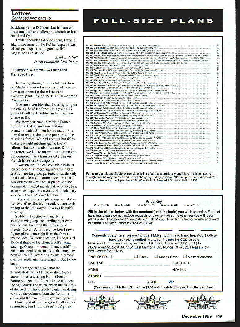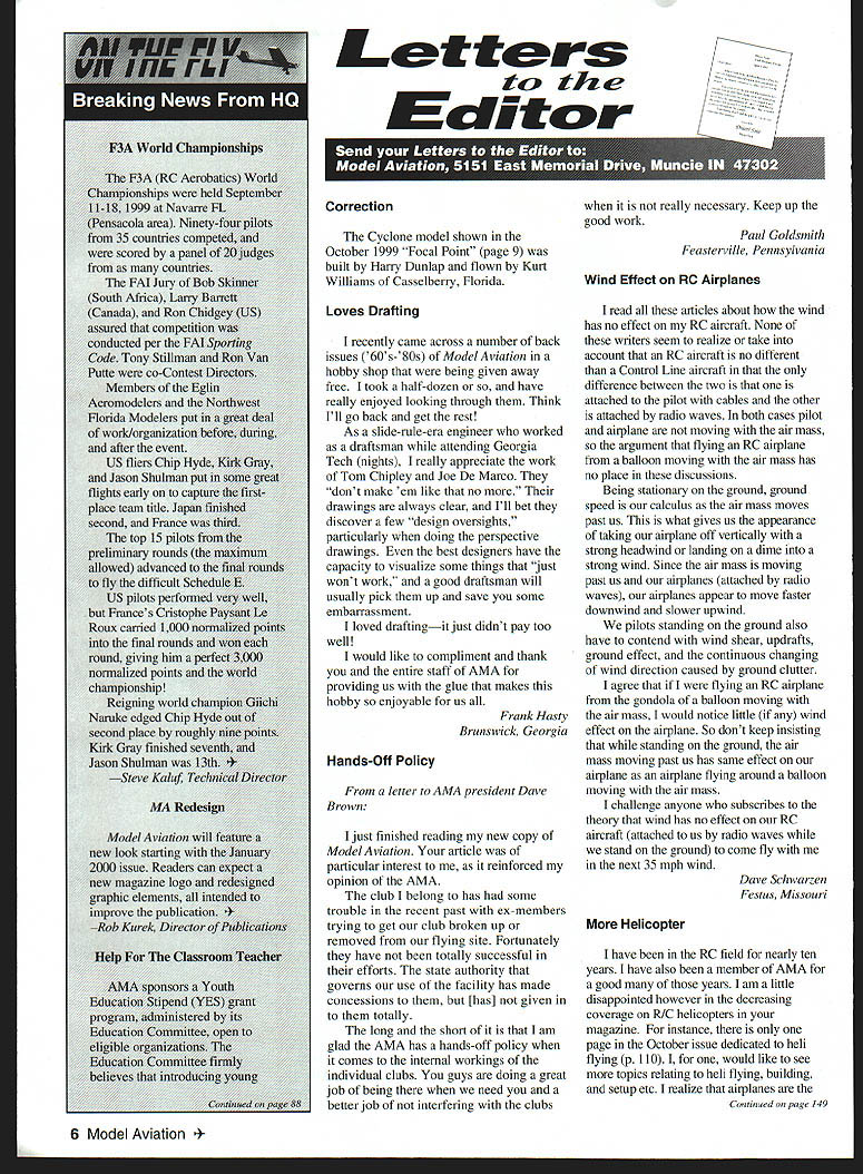 The Cyclone model shown October 1999 Focal Point page 9 built Harry Dunlap flown Kurt Williams Casselberry Florida recently came across number back issues 60s- SOs Model Aviation hobby shop being given away free took half-dozen have really enjoyed looking through Think Ill go back get rest As slide-rule-era engineer worked draftsman attending Georgia Tech nights really appreciate work Tom Chipley Joe De Marco dont make em like no drawings always clear Ill bet discover few design oversights particularly doing perspective drawings best designers have capacity visualize some things just wont work good draftsman will usually pick up save some embarrassment loved draftingit just didnt pay too well would like compliment thank entire staff AMA providing us glue makes hobby enjoyable us Frank Hasty Brunswick Georgia Hands-Off Policy letter AMA president Dave Brown just finished reading new copy Model Aviation article particular interest reinforced opinion AMA club belong has some trouble recent past ex-members trying get club broken up removed flying site Fortunately have totally successful efforts state authority governs use facility has made concessions [has] given totally long short am glad AMA has hands-off policy comes internal workings individual clubs guys doing great job being need better job interfering clubs really necessary Keep up good work Paul Goldsmith Feasterville Pennsylvania Wind Effect RC Airplanes read articles about wind has no effect RC aircraft None writers seem realize take account RC aircraft no different Control Line aircraft difference between two attached pilot cables other attached radio waves both cases pilot airplane moving air mass argument flying RC airplane balloon moving air mass has no place discussions Being stationary ground ground speed calculus air mass moves past us what gives us appearance taking airplane off vertically strong headwind landing dime strong wind Since air mass moving past us airplanes attached radio waves airplanes appear move faster downwind slower upwind pilots standing ground also have contend wind shear updrafts ground effect continuous changing wind direction caused ground clutter agree flying RC airplane gondola balloon moving air mass would notice little wind effect airplane So dont keep insisting standing ground air mass moving past us has same effect airplane airplane flying around balloon moving air mass challenge anyone subscribes theory wind has no effect RC aircraft attached us radio waves stand ground come fly next 35 mph wind Dave Schwarzen Festus Missouri Helicopter have RC field nearly ten years have also member AMA good years am little disappointed however decreasing coverage RIC helicopters magazine instance page October issue dedicated heli flying p 110 would like see topics relating heli flying building setup etc realize airplanes Continued pose 149 6 Model Aviation ters tc th Eclitcir Loves Drafting Correction Letters Continued page 6 backbone RC sport helicopters much challenging aircraft both build fly will conclude once again would like see RC helicopter areas great sport greatest RC magazine existence Stephen J Bell North Plainfield New Jersey Tuskegee AirmenA Different Perspective Just going through October edition Model Aviation very glad see new monument brave excellent pilots flying P-47 Thunderbolt Razorbacks must consider fighting other side fence young 17 year old Luftwaffe soldier France Too young fly stationed Middle France during D-Day invasion company 500 men march new destination due pressure attacking forces nothing rifles few light machine-guns rifleman 28 rounds ammo During retreat march column equipment transported along French horse-drawn wagons 10th September 1944 ten oclock morning cross mile-long cow pasture road available around woods ordered watch airplanes commander handed pair binoculars knew spent six months unvoluntary service FLAK Mannheim knew airplane types due [to] flat feet ordered sit top last wagon beautiful morning Suddenly spotted silent flying shoulder-wing airplane circling right over column realized Fieseler Storch minute later saw fighter plane come right front treetop level Without question recognized oval shape Thunderbolts radial cowling shouted Thunderbolt commander called said may have Fw 190 after airplane raced over heads horse-wagons knew better strange thing Thunderbolt did fire shot Now know warning French Farmers get out saw men racing towards fields first few twelve Thunderbolts came thundering sides rearall below treetop level towards column front the,ner got off wagon still notUSA remember saw fighters December 1999 149 No 136Piccolo Stench RC Soale orodni 2345 S-chanoe has hoto hors flapC No262Cashmaster CL crash proof trainer Two noes 15-3000035 40 powerS No4471P2A Mine Aeroicel PC Old Toter uA Teoaoo node 049 glow ScharroelsC No 581Gee Bee Medel 0 PC t3oloeo 550 0000 Spans 72-In r r scalel 00 power 3 plan sheets No714Mod Deckl PC oner-trendly Sport 110 relased slow tght Peonloar low 010w nnaneuners 25-30 power Spoon OS 2 pan sheetsB No720Mieelemael FF PrankZoos popularall-halsa-couereorohher-poweredmsde tahentrom Popolardoenoe June 1041 SpansOdinA Ne 7331941 Tapleerell PC SoOOersoalh design ooptorns tOn qua IlpInS grolitOs toe 011-50010 Toolororaft tOP-non span 2 pan sheets Ne 739Jeseler PC So plane sos looks padOrmOnOe t22- 000 span inoludes toll constrootlon tnot 3 pon sheets Ne 819Teple Cub PC Sp0O Shale tOme ohannels spans 56 00000C Ne 818Nibble 305l PP tenorS holder ho Norm Pot spans 55 00000 0 Ne 022Stephens Aka PC Loser prednoessor op Sorpolos tsr 32 p ower spans 50 nones Ne 826Pipe Pewnee 0oso PP PuSher Scale hy Pad Stool spans 35 00000A Ne 034Gebtie Eleotrospsn mode tot Seared Speed 400 motors spans 40 InchesC Ne 83609 Slew Melfee Thrd n tloinp-w 09 snres ho 011 Ovens spans 40 o InchesB Ne 840PT-3l PC 5000 mode Op Prank Poker spans SO InchesC No 842opec Spool Toeleer PC Scale Op Phllip Kent ones MOo 40 Surpass spans 60 Inches Ne 046PelesNienal Cut Pa