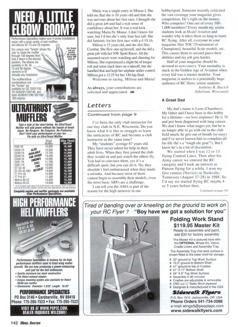Confidence Restored This letter is to thank you for the excellent ["Flying Site Assistance" column] in the July 2002 issue by Joe Beshar. on the Alinco DJ-X2T. Here is my story. Two of our members crashed in rapid succession (within five minutes of each other) while flying at our facility. They were on widely different frequencies and both were certain they were hit by interference from "an unknown source." There were other members at the field but all other transmitters were off. Panic struck! All sorts of wild ideas started taking root. "Sabotage! It must have been that guy we wouldn't let fly last week because he didn't have insurance." "It is those pagers up on the mountain overlooking the field!" "It is truck drivers operating their CBs out on the highway" (about 1/2 mile line of sight). What was really bad was that a consensus was forming that the field was contaminated and it was dangerous to fly there! Our field. The Pony Express Model Air Park, is officially a Carson City park. The city leases the land, at no charge from the BLM [Bureau of Land Management], paid for our 500 x 50-foot macadam runway and field house (total approximately $40.000). Our club has invested about $10.000 in sunshades, assembly tables, fencing, etc. It is a nice facility that seemed to be threatened by "unexplained radio interference." We borrowed a scanner (owned by the AMA) from George Steiner, our area Frequency Coordinator. We were unable to detect any radio interference on the days that we monitored. The scanner proved that the area was free from interference "most of the time." We still had some members who were not satisfied and wanted the club to buy a scanner, but 800 to 900 dollars was a pretty big lump to swallow, then your article came along! Everyone agreed it was worth the price. When the unit arrived. I was assigned the task of setting it up and programming it for channels 1 I through 60. The instruction manual is OK, but intended for general use. Thank Coil for Joe Beshar! His instructions were clear, precise, and did exactly what I wanted to do! Instead of hours (or maybe days) figuring out how from the manual. I had the unit performing its job in less than a half hour! Conclusion? The Alinco DJ-X2T is exactly what the members of the club wanted. It is small enough to fit in a (light box. so it is "on duty" without a big hassle. Any time there is an interference suspected, we have a precise tool with which we can investigate and it didn't break the treasury! The rumors have stopped and confidence has been restored! Thank you AMA and special thanks to Joe Beshar! Frank E. Chase Carson City, Nevada CAD Pluses Each time I receive a new issue of Model Aviation I turn to [Bob Hunt's] editor's column. [The July] issue touched me dearly. You see. I have spent many hours at a manual drawing table during the past 35 or so years and since about 1990 additional time at the CAD station. You are quite correct in asserting that "an artist's touch" is seldom seen anymore on drawings. When viewing current drawings, they all seem to "look alike" in that CAD presentations are often shown according to industry-wide standard regarding layers, line weights, hatching, on and on. What this does is take away the artistic effect which identified a designer's style and sometimes his or her personality. However, with the way things are changing so fast, the computer generated designs are needed in order to generate customer likes, dislikes, changes, revisions, etc. and be able to adjust to quick turn-arounds to meet project schedules and/or other constraints. For me personally, I have enjoyed my career in the design field spanning mechanical, civil, architectural, electrical, and other technical areas. In fact, my earliest memory of doing any kind of drafting was to enlarge a plan shown in, I believe, Air Trails magazine of an airplane shown as one-quarter size. My experience in enlarging that 8.5 x 11 inch page to four times gave me a beginning to understanding how to read blueprints, how to actually draw plans, and led me into modeling of aircraft during 1945 and after. I suppose that early experience had some impact on my ability and interest to pursue a career in engineering. In fact, that background has generated my interest in helping others in the Stunt community present ideas and designs for models, some you may have seen. Anyway. I really do enjoy using CAD to do model designs. It is a pleasure to see an article in a model magazine knowing that in some small way I have helped advance design and model building. I sense that you also have experienced and enjoyed these activities. Your article on Ares 59 is superb. I believe every Stunt flier should have a copy of this article and be able to promote others to be another "Billy Werwage" particularly in the youth. They may not be exactly like Billy, but his life of dedication to building and flying Stunt models should be an inspiration to others whether young or old. Watt Moore via E-mail Classified Drawings One of the many features I enjoy in Model Aviation each month seems almost hidden away toward the back of the magazine on the "Classified Ads" page (page 189 in the August 2002 issue). Well-done pencil drawings are truly unique pieces of art and I look forward to a new one each month, such as the spin sequence of the S.E.5 in the current issue. No credit is given to the excellent artist who does these drawings. There is no name or signature. Who is this person? He (or she) certainly deserves credit for such realistic, and yet artistic, work. George W. Alexander Corpus Christi, Texas Aircraft Notes I enjoyed reading the letters cited in Mr. Mathews feature "Flying for Fun." Our "black and white" concepts of the earlier years have certainly become more technical today; one hopes this is an improvement (August 2002 issue). It should be noted, however, that the Nakajima Ki-43 "Hayabusa" was given the Allied code name "Oscar" not "Zero." The "Zero-Sen" A6M airc