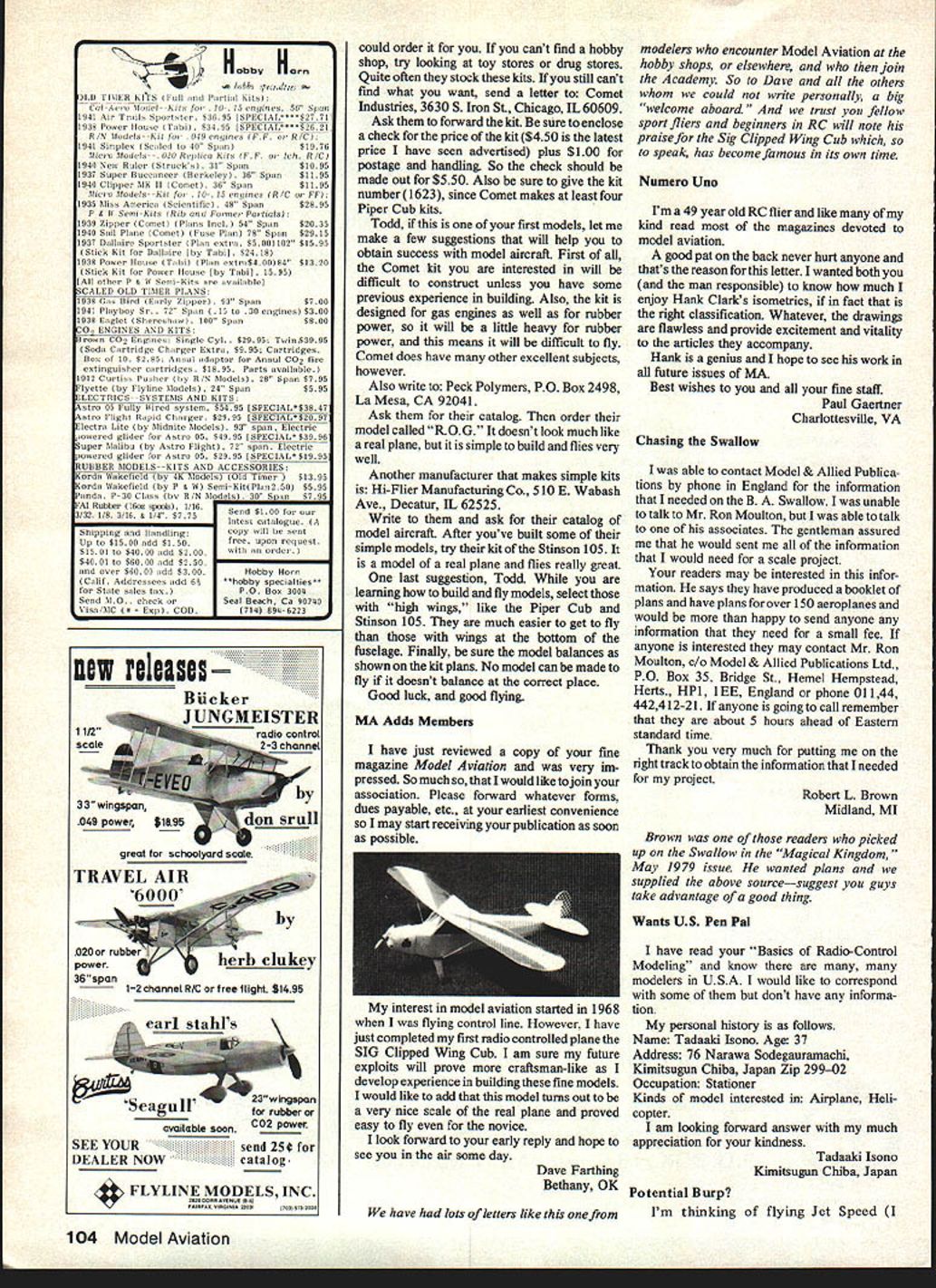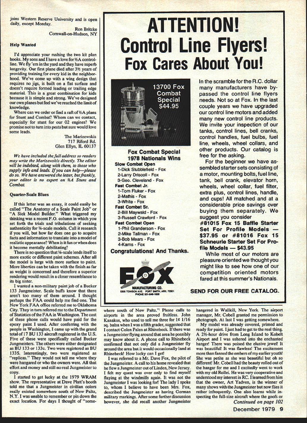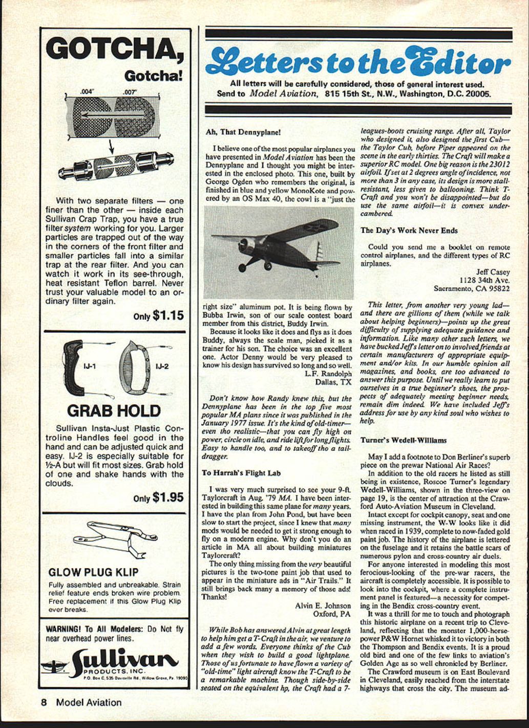 GOTCHA Gotcha two separate filters r other de Sullivan Crap Trap have true filtersystem working Larger particles trapped out way corners front filter smaller particles fall similar trap rear filter can watch work its see-through heat resistant Teflon barrel Never trust valuable model dinary filter again Only$ll5 GRAB HOLD Sullivan Insta-Just Plastic Con troline Handles feel good hand can adjusted quick easy IJ-2 especially suitable V2-A will fit sizes Grab hold shake hands clouds $195 GLOW PLUG KLIP Fully assembled unbreakable Strain relief feature ends broken wire problem Free replacement Glow Plug Klip ever breaks WARNING Modelers fly near overhead power lines NC POBoC5350Od W wGP 9090 Setters te t Cd letters will carefully considered general interest used Send Model Aviation 815 15th St NW Washington DC 20005 Ah Dennyplane believe popular airplanes have presented ModelAviation has Dennyplane thought might inter ested enclosed photo built George Ogden remembers original finished blue yellow MonoKote pow ered OS Max 40 cowl just right size aluminum pot being flown Bubba Irwin son ot scale contest board member district Buddy Irwin Because looks like does flys does Buddy always scale man picked trainer son choice excellent Actor Denny would very pleased know design has survived long well LF Randolph Dallas TX Dont know Randy knew Dennyplane has top five popular MA plans since published January 1977 issue Its kind old-timer tho realisticthat can fly high power circle idle ride lfiforlongflights Easy handle too takeoff tho taildragger Harrahs Flight Lab very much surprised see 9-ft Taylorcraft Aug 79 MA have inter ested building same plane years have plan John Pond have slow start project since knew mods would needed get strong enough fly modem engine dont article MA about building miniatures Taylorcraft thing missing very beautiful pictures two-tone paint job used appear miniature ads Air Trails still brings back memory ads Thanks Alvin E Johnson Oxford PA Bob has answered Alvin great length help him get aT-Craft air venture add afew words Everyone thinks Cub wish build good lightplane us fortunate have flown variety old-time light aircraft know T-Craft remarkable machine Though side-by-side seated equivalent hp Craft 7leagues-boots cruising range After alL Taylor designed also designed first Cub Taylor Cub before Piper appeared scene early thirties Craft will make superiorRC modeL big reason isthe23Ol2 airfoil set 2 degrees angle incidence 3 case its design stallresistant less given ballooning Think T Craft wont disappointedbut use same airfoilit convex undercambered Days Work Never Ends Could send booklet remote control airplanes different types RC airplanes Jeff Casey 1128 34th Ave Sacramento CA 95822 letter another very young lad gillions talk about helping beginnerspoints up great d07culty supplying adequate guidance information Like other such letters have bucked Jeffs letter involvedfriends certain manufacturers appropriate equip ment and/or kits humble opinion magazines books too advanced answer purpose Until really learn put ourselves true beginners shoes pins pects adequately meeting beginner needs remain dim indeed have included Jelis address use kind soul wishes help Turners Wedell-Williams May add footnote Don Berliners superb piece prewar National Air Races addition old racers listed still being existence Roscoe Turners legendary Wedell-Williams shown three-view page 19 center attraction Craw ford Auto-Aviation Museum Cleveland Intact except cockpit canopy seat missing instrument W-W looks like did raced 1939 complete now-faded gold paint job history airplane lettered fuselage retains battle scars numerous pylon cross-country air duels anyone interested modeling ferocious-looking pre-war racers aircraft completely accessible possible look cockpit complete instru ment panel featureda necessity compet ing Bendix cross-country event thrill touch photograph historic airplane recent trip Cleve land reflecting monster 1000-horse power P&W Hornet whisked victory both Thompson Bendix events proud old bird few links aviations Golden Age well chronicled Berliner Crawford museum East Boulevard Cleveland easily reached interstate highways cross city museum ad8 Model Aviation joins Western Reserve University open daily except Monday Ron Britzke Cornwall-on-Hudson NY Help Wanted Id appreciate rushing two kit plan books sons have love controlline fly em yard have superb longevity first plane died after 3 years providing training kid neighbor hood Weve come up wing design requires no jigs built flat surface doesnt require formed leading trailing edge materiaL great combination kids because simple strong Weve designed own planes feel weve reached limit knowledge can order find raft ofiA plans Stunt Combat Whom can contact especially stunt 02 engines promise turn pests sure would love some leads Marizewskis 717 Riford Rd Glen Ellyn IL 60137 have included full address readers may write Marizewskis directly editor will indebte4 along supply info leads can helpplease have answered letter butfrankly editor no expert JA Stunt Combat Quarter-Scale Blues letter essay could easily called Anatomy Scale Paint Job Sick Model Builder What triggered thinking recent FO column set forth trials tribulations seeking authenticity -scale models Call research will far does go acquire facts information translate model realistic appearance fun does become mentally debilitating no question -scale lends itself exotic different paint schemes After model large surface paint liberties can taken finish far weight concerned therefore superior rendering would result closer resemblance its big sister wanted non-military paint job Bucker 133 Jungmeister Scale buffs know arent too around thought perhaps FAA could help find New York FAA office referred Okialioma City turn referred Department Statistics FAA Washington cost phone calls would have paid epoxy paint used After conferring people Washington came up grand total 17 BU 