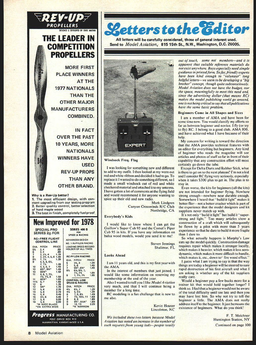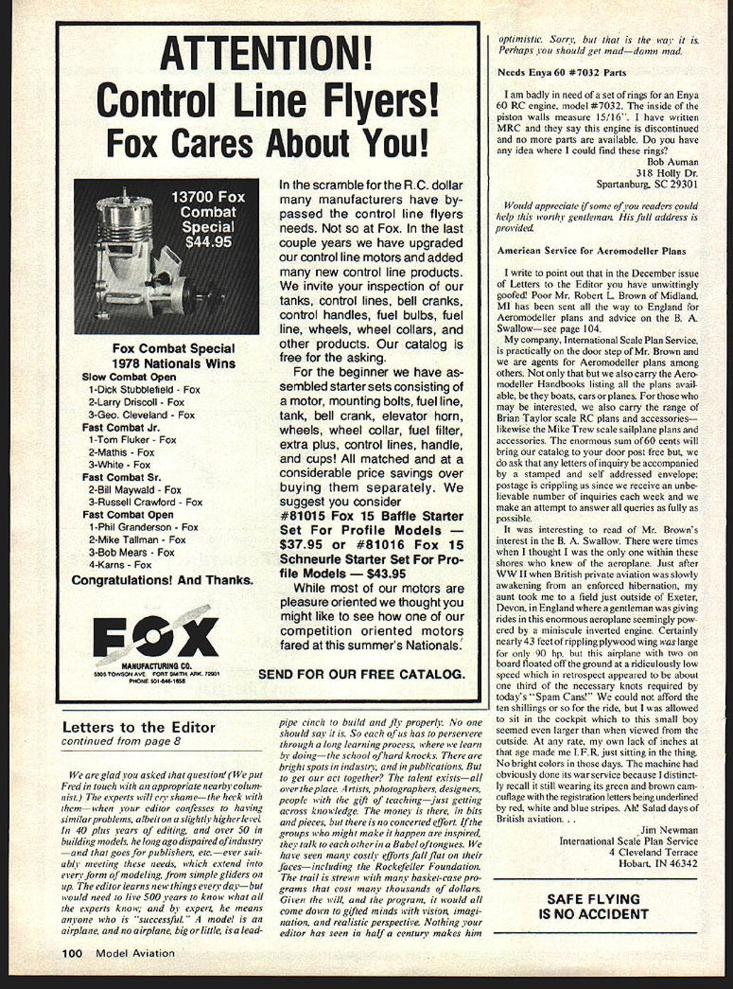 Why Rev-Up better 1 The efficient design con stant upgrading testing program 2 Better quality controt better selection hard maple wood 3 best finish completelyfuelproof New Improved 1978 SPECIAL PRO SERIES 2 FOR RCFREE FLIGHT CONTROL LINE DIA PITCHPRICE 5%34 63489_________ 733%4119 833% 456129 8A77%139 945eeA 77%139 1045e7149 108W 8W149 106EW159 114677% 7A7%8159__________ 1168W189 11%87159 12e179 125W179 135 6239 1458279 1558349 184%8449 1758599 1856699 VS WIDEBLADE ESS EXTRAWIDE SERIES 400 B FOI SPEED NG ADVANCED DESIGN NO 1 IN PYLON RACING LEADING SPEED RECORD HOLDER OP ALL TIMES RC PYLON RACING DIA PITCHPRICE S3554129 756149 7SN 6N149 8%6% 6% 757%189 97757%189 CONTROL LINE SPEED & RACING DIA PITCHPRICE 4%6A7129 4%55%129 6788%149 77%10Y,11169 889189 89N 9%N189 91213229 N NARROW Xetters thediter letters will carefully considered general interest used Send Model Aviation 815 15th St NW Washington DC 20005 looking something new different add outfit looked worn Out red white ribbon decided go replace wanted something different made small windsock out red white checkered material attached antenna have gotten lot comments flying field would recommend anyone wanting spice up old new radio Mark Lindgren Canyon Crosswinds R/G Club Northridge CA Everybodys Kids would like know can get Guillows Super Cub 95 Comets Piper Cub 95 kits have information balsa wood models would send Steven Jennings Shalimar FL Looks Ahead am II years old first year AMA interest members just joined would like some information renewing membership end year Also wanted tell like Model viation very much will continue being member long time RC modeling fun challenge new also Kevin Houser Lincolnton NC included two letters because Model viation has noted increase number such requests young ladspeople totally out touch some membersand apparent suitable reference materials exist anywhere Boys especially need simple guidance inprintedform So far friendly experts have kind enough volunteer long helpful letterswe seem developing big brother concept though quite subconsciously Model Aviation does have budget nor space meaningfully meet need since advertising dollar means RC makes model publishing world go around being critical say allpublications have same basic problem Beginners Come Shapes Sizes am member AMA have some time now would classify efforts far between beginner novice fly try fly RC belong good club AMA 800 have achieved what have because help concern writing toward direction AMA provides technical features editor everything beginners Any kind beginner reads magazine will see articles photos stuff far front capability construction effort will certainly go down tube Except Delta Darts Rubber Stick what get next plateau Im kid considerRC flying very seriously especially takes $300 plus get plus stay worse kits beginners kits intended beginner flying Nowhere strong enoughnowhere near durable enough Somewhere heard build light makes better fliernot better crasher part experience model designers kit suppliers never match up Its build light build superstrong light Too articles show construction craft will subsequently flown pilot 5 years experience dare build fragile dare So what actually happens Murphys Law eats up model quickly Construction damage requires repair makes stronger locally makes heavier makes less aero dynamic makes difficult handle makes etc down fire wood effect guess what am trying say way things today beginner will steered sure rapid destruction first aircraft what am asking whether kit suppliers really care Would beginner pay few bucks trainer kit would hold together longer think feel beginner would aware total difficulty until too late may have lost him So try tell beginner little AMA does really address itself beginner just bemoans existence beginners What think F T Meichner Huntington Station NY Continued page 100 8 Model Aviation THE LEADER IN Tfl MORE FIRST PLACE WINNERS AT THE 1977 NATIONALS THAN THE OTHER MAJOR MANUFACTURERS COMBINED IN FACT OVER THE PAST 10 YEARS MORE NATIONALS WINNERS HAVE USED REV-UP PROPS THAN ANY OTHER BRAND Windsock Freq Flag Fox Combat Special 1978 Nationals Wins Slow Combat Open 1-Dick Stubblefield Fox 2-Larry Driscoll Fox 3-Geo Cleveland Fox Fast Combat Jr 1-Tom Fluker Fox 2-Mathis Fox 3-White Fox Fast Combat Sr 2-Bill Maywald Fox 3-Russell Crawford Fox Fast Combat Open 1-Phil Granderson Fox 2-Mike Tailman Fox 3-Bob Mears Fox 4-Karns Fox Congratulations Thanks Fox MANUFACTURING CO 5SO5 TOWSON AVE FORT SMITH ARK 72101 PHONE S01641654 Letters Editor continued page 8 glad iou asked question put Fred touch apprapriate nearby colum nist experts will cri shamethe heck pour editor confesses having similar pro b/ems albeit slightly higher level 40 plus years editing over 50 building models long aga dispaired ofindustrs goes publishers etc ever suitoh/v meeting needs extend form modeling simple gliders up editor learns new things daybut would need live 500 pears know what experts know expert means anyone successful model airplane no airplane big little leadIn scramble RC dollar manufacturers have passed control line flyers needs Fox last couple years have upgraded control line motors added new control line products invite inspection tanks control lines bell cranks control handles fuel bulbs fuel line wheels wheel collars other products catalog free asking beginner have sembled starter sets consisting motor mounting bolts fuel line tank bell crank elevator horn wheels wheel collar fuel filter extra plus control lines handle cups matched considerable price savings over buying separately suggest consider #81015 Fox 15 Baffle Starter Set Profile Models $3795 #81016 Fox 15 Schneurle Starter Set Pro file Models 5 motors pleasure oriented thought might like see competition oriented motors fared summers Nationals SEND FOR OUR FREE CATALOG pipe cinch build ftp proper/p No should sap So us has perservere through long learning process learn doingthe school ofhard knocks bright spots industni p