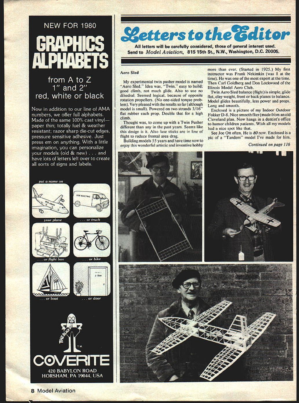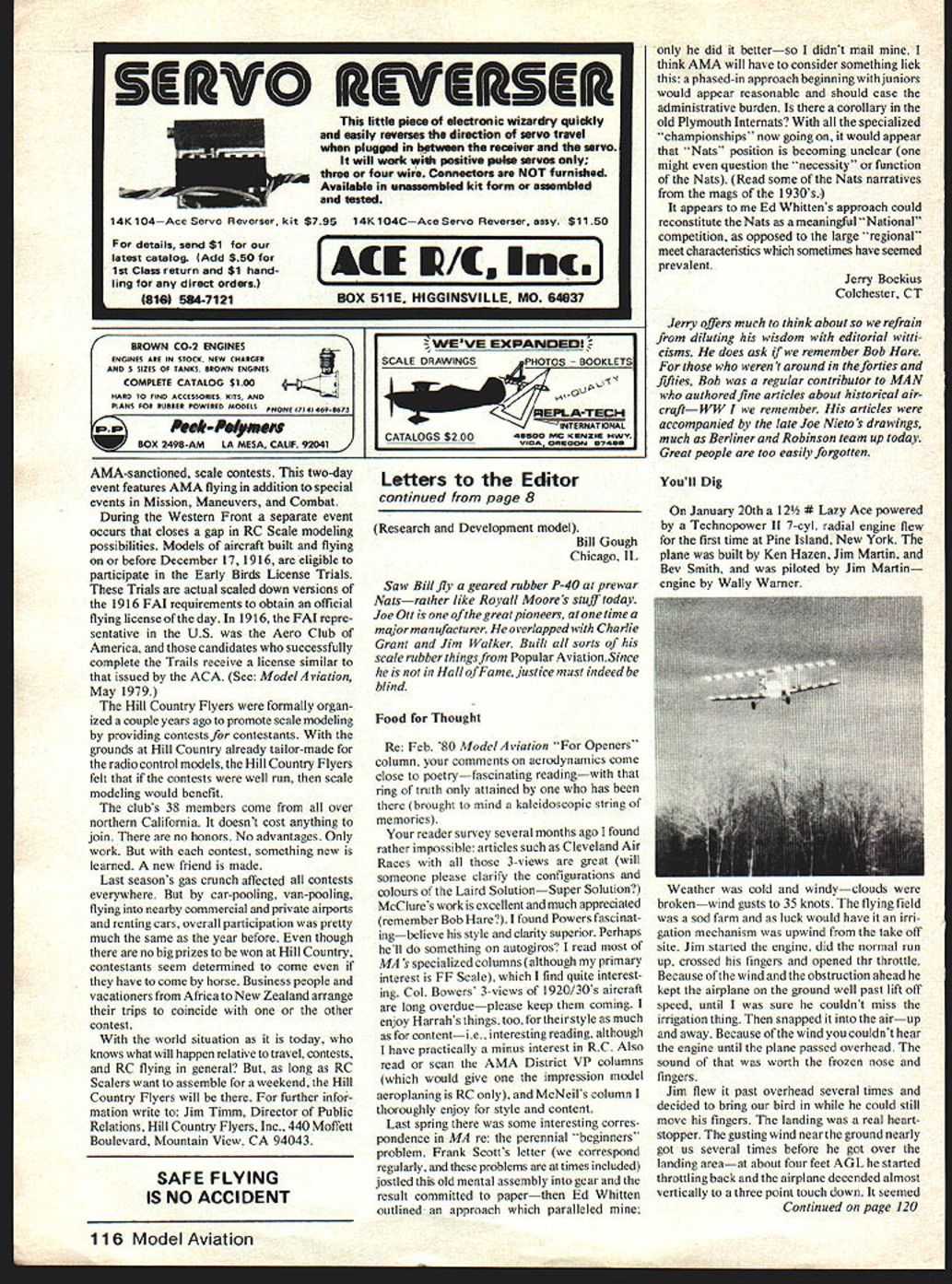 Aero Sled experimental twin pusher model named Aero Sled Idea Twin easy build good climb much glide Also use no dihedral Seemed logical because opposite rotation propellers No one-sided torque prob lem Very pleased results far although model small Powered two strands 3/16 flat rubber prop Double high climb Thought come up Twin Pusher different past years Seems like design Also fuse sticks line flight reduce frontal area drag Building models 55 years have time now enjoy wonderful artistic inventive hobby ever Started 1925 first instructor Frank Nekimkin 8 time expert time Carl Goldberg Don Lockwood Illinois Model Aero Club Twin Aero Sled balance flight simple glide flat clay weight front back planes balance Model glides beautifully less power props Long smooth Enclosed picture Indoor Outdoor Fokker D-8 Nice smooth flier made old Cleveland plan Now hangs dentists office humor children patients Wish models nice spot like See Joe Ott often 80 now Enclosed pic Tandem model Ive made him Continued page 116 8 Model Aviation $Setters te thediter letters will carefully considered general interest used Send Model Aviation 815 15th St NW Washington DC 20005 SERVO REVERSER little piece electronic wizardry quiekly easily reveises direction serve travel plugged between receiver servo will work i* peeitive pulse servos three tour wire Connectors NOT furnished Available unassembled kit form assembled tested 14K 104Ace Servo Reverser kit details send $1 latest catalog Add $50 1st Class return end $1 hand ling direct orders I8O 5N-7121 $795 14K104CAce Servo Reverser assy $1150 AE E/ Em BOX 511E HIGGINSVILLE MO 64337 1 Letters Editor continued page 8 Research Development model Bill Gough Chicago IL Saw Bill fly geared rubber P-40 prewar Natsrather like Royall Moores stuff today Joe Ott ofthegreatpioneers atone time major manufacturer overlapped Charlie Grant Jim Walker Built sorts scale rubber things Popular AviationSince Hall ofFame justice must indeed blind Food Thought Re Feb 80 Model viation Fur Openers column comments aerodynamics come close poetryfascinating readingwith ring truth attained has brought mind kaleidoscopic string memories reader survey several months ago found rather impossible articles such Cleveland Air Races 3-views great will someone please clarify configurations colours Laird SolutionSuper Solution McClures work excellent much appreciated remember Bob Hare found Powers fascinat ingbelieve style clarity superior Perhaps hell something autogiros read MA s specialized columns although primary interest FF Scale find quite interest ing Col Bowers 3-views 1920/30s aircraft long overdueplease keep coming enjoy Harrahs thingstoo fortheir style much contentie interesting reading although have practically minus interest RC Also read scan AMA District VP columns would give impression model aeroplaning RC McNeils column thoroughly enjoy style content Last spring some interesting corres pondence MA re perennial beginners problem Frank Scotts letter correspond regularly problems times included jostled old mental assembly gear result committed paperthen Ed Whitten outlined approach paralleled BROWN CO-2 ENGINES ENGINES ARE IN STOCK NEW CHARGER j AND 5 SIZES OF TANKS BROWN ENGINES COMPLETE CATALOG $100 HARD TO FIND ACCESSORIES KITS AND FLANS FOR RUBBER POWERED MODELS PHONE 7141 4698675 ek-eAv BOX 2498-AM LA MESA CALIF fl041 AMA-sanctioned scale contests two-day event features AMA flying addition special events Mission Maneuvers Combat During Western Front separate event occurs closes gap RC Scale modeling possibilities Models aircraft built flying before December 17 1916 eligible participate Early Birds License Trials Trials actual scaled down versions 1916 FAI requirements obtain official flying license day 1916 FAI repre sentative US Aero Club America candidates successfully complete Trails receive license similar issued ACA See ModelAviation May 1979 Hill Country Flyers formally organ ized couple years ago promote scale modeling providing contests contestants grounds Hill Country already tailor-made radio control models Hill Country Flyers felt contests well run scale modeling would benefit clubs 38 members come over northern California doesnt cost anything join no honors No advantages Only work contest something new learned new friend made Last seasons gas crunch affected contests everywhere car-pooling van-pooling flying nearby commercial private airports renting cars overall participation pretty much same year before though no big prizes won Hill Country contestants seem determined come have come horse Business people vacationers Africa New Zealand arrange trips coincide other contest world situation today knows what will happen relative travel contests RC flying general long RC Scalers want assemble weekend Hill Country Flyers will further infor mation write Jim Timm Director Public Relations Hill Country Flyers Inc 440 Moffett Boulevard Mountain View CA 94043 did betterso didnt mail think AMA will have consider something liek phased-in approach beginning juniors would appear reasonable should ease administrative burden corollary old Plymouth Internats specialized championships now going would appear Nats position becoming unclear might question necessity function Nats Read some Nats narratives mags 1930s. appears Ed Whittens approach could reconstitute Nats meaningful National competition opposed large regional meet characteristics sometimes have seemed prevalent Jerry Bockius Colchester CT Jerry offers much think about refrain diluting wisdom editorial witti cisms does ask remember Bob Hare werent around forties fifties Bob regular contributor MAN autho red fine articles about historical air craftWW remember articles accompanied late Joe Nietos drawings much BerlinerandRobinson team up today Great people too easily forgotten Youll Dig January 20th 12 # Lazy Ace powered Technopower II 7-cyl radial engine flew first time Pine Island New York plane built Ken Hazen Jim Martin Bev Smith piloted