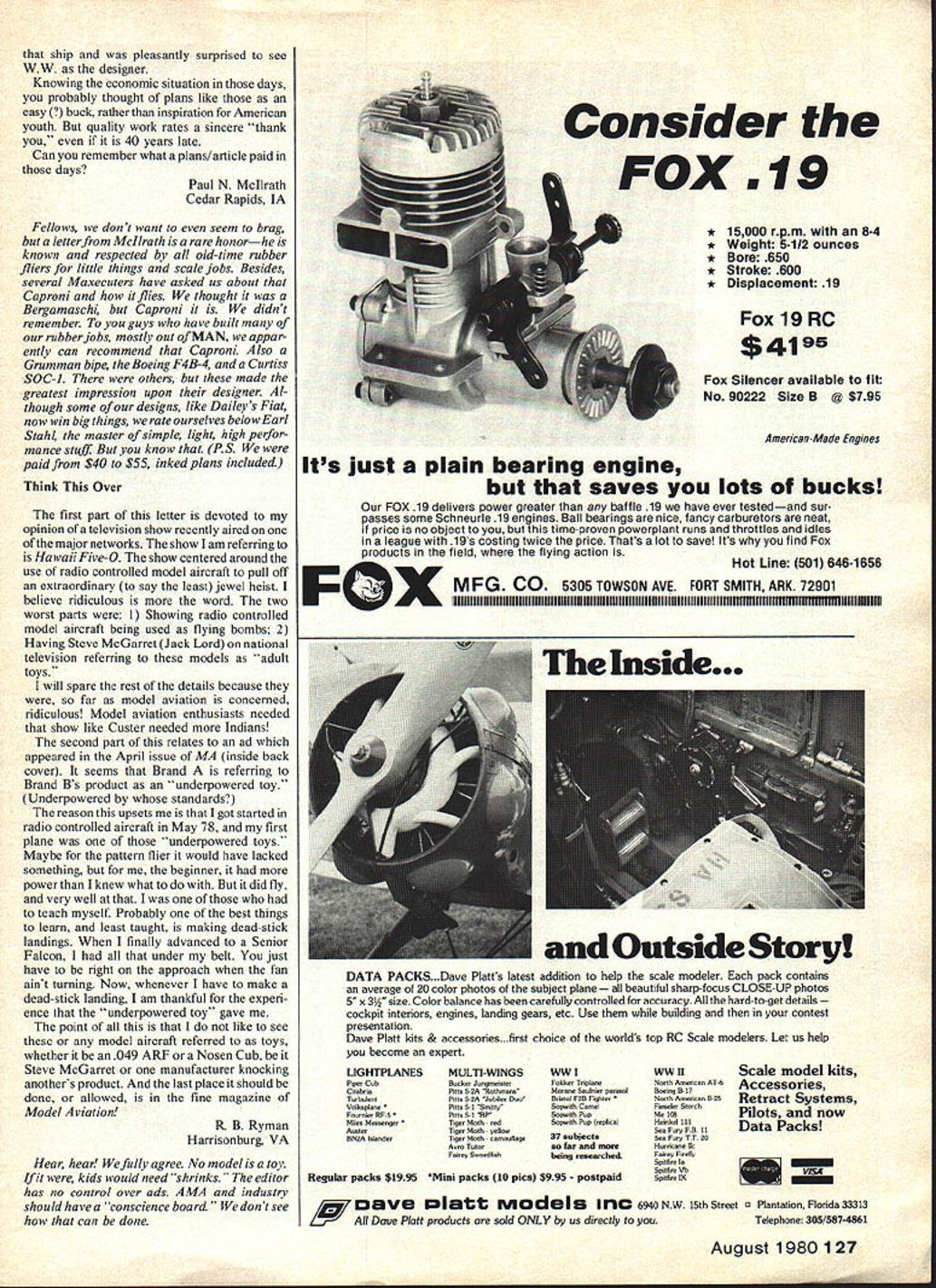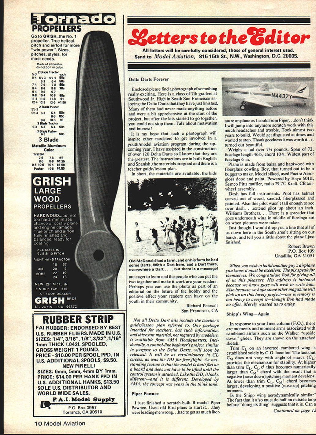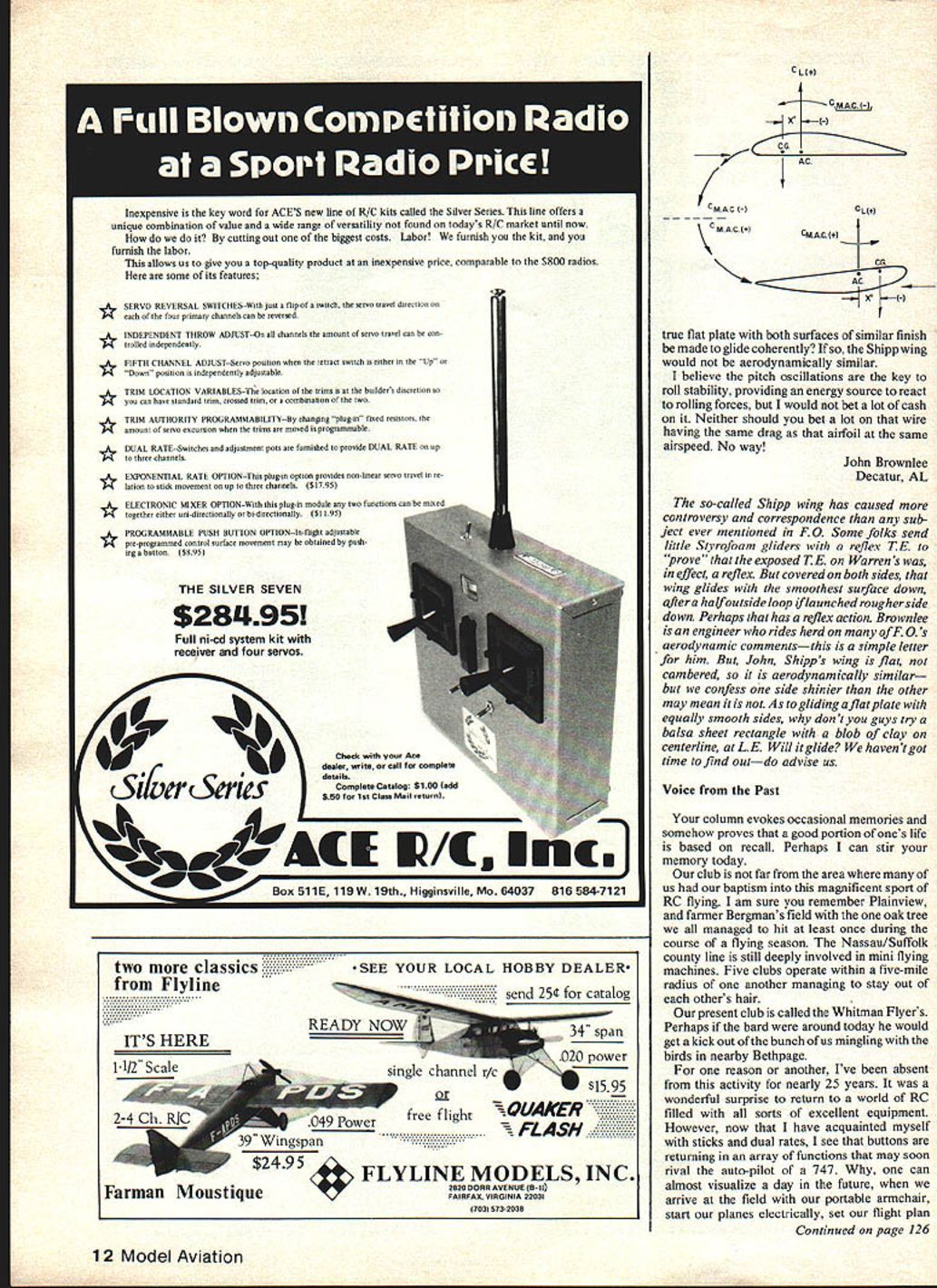Xetters te thediter letters will carefully considered general interest used Send Model Aviation 815 15th St NW Washington DC 20005 Delta Darts Forever Enclosed please find photograph something really exciting class 7th graders Southwood Jr High South San Francisco en joying Delta Darts have just finished never made anything before bit apprehensive start project after kits started go together could stop Talk about motivation interest hope such photograph will inspire other modelers get involved youth/model aviation program during up coming year have assisted construction over 20 Delta Darts know greatest instructions both English Spanishthe materials good teacher guide/lesson plan short materials available kids Old McDonald farm farm ha soma Darts Dart hara Dart thara avarywhara Da.. thara massaga eager learn people can put two together make work readers Perhaps can use photo part editorial future hobby positive effect readers can have youth community Richard Pearsall San Francisco CA Delta Dart kits include teachers guide/lesson plan referred package inten4d teachers has such information extra material required modelers available 4M4 Headquarters mci dentally control-line beginners project similar purpose Delta Darts will soon released will revolutionary CL circles DD free flight 4n out standingfeature model builtflat board does have lifted until controlsystem attached LiketheDD looks differentand different Developed 1M4 concept years think tank Piper Pawnee just finished scratch-built B model Piper Pawnee Used old Bird plans start it. leadingme wrong. get much literature plane 1 could Piper. dont think will jump anymore scratch work much headaches trouble Took almost two years build Would get disgusted times wanted stop Thank goodness worth it. turned out beautiful Weighs tad over 7 pounds Span 72 fuselage length 46 chord 10 Widest part fuselage 6 Plane made balsa hasdwood fiberglass cowling Boy turned out bugger make Model silked used Pactra Aero gloss dope paint Powered Enya 60111 Semco Pitts muffler radio 79 7C Kraft CB tailwheel assembly Dash has full instruments Pilot has helmet carved out wood sanded fiberglassed painted Also pilot wasnt tall enough see over dash end pilot up about inch Williams Brothers eader goes underneath wing middle fuselage pictures taken Just thought would drop line us down South arent sitting hands tell little about plane Ijust finished Robert Brown PO Box 109 Unadilla GA 31091 wish build another guys airplane know must excellent Thepixspeakfor themselves congratulate Bob giving us pleasure address included because know guys will wish write him Also because hope some other magazine will pick up lovely projectour inventory too heavy accept itthough Bob made no offer Merely wanted us enjoy Sbipps WingAgain response June column FO moments moment arms associated cambered airfoils such Walker upside down glider shown attached sketch Trim CL inverted cambered wing established solely CG location fact CM does vary angle attack CL provides mechanism stability higher trim CL CLx thus becomes numerically larger CM chord result negative nose down pitching moment develops lower trim CL CM chord becomes larger developing positive nose up pitching moment Shipp wing aerodynamically similar fact also must half outside loop before doing its thing suggests Can Continued page 12 10 Model Aviation h-K RUBBER STRIP FAI RUBBER ENDORSED BY BEST US RUBBER FLIERS MADE IN US SIZES 1/4 3/16 1/83/32 1/16 1mm THICK 042 SPOOLED GROSS WEIGHT 1 POUND PRICE -$1000 PER SPOOL PPD IN US ADDITIONAL SPOOLS $950 NEW PIRELLI SIZES 6mm 5mm 4mm BY 1mm PRICE $1400 PER HANK PPD IN US ADDITIONAL HAN KS $1350 SOLE US DISTRIBUTOR AND WORLD WIDE SALES FAl Model Supply U PO Box 3957 Torrance CA 90510 Inexpensive key word ACES new line R/C kits called Silver Series line offers unique combination value wide range versatility found todays R/C market until now cutting out biggest costs Labor furnish kit furnish labor allows us give top-quality product inexpensive price comparable $800 radios some its features SERVO REVERSAL SWITCI-IES--With jast flip switch tetco travel direction four primary chnonnls can reverted * INDEPENDENT THROW ADJUST-On til channels nmount tetoo ttasel can con trolled independently * FIFTH CHANNEL ADJUST--Servo position wheo retract switch either Up m Down positioo odependently adjustable * TRIM LOCATION VARIABLESfhe location trims hoildens discsetioo sos can hour standard trim crosmd trim n cotehination two * TRIM AUTHORITY PROGRAIdMABILITY--By rhanog plug-ic fined resistors amouotofmrvo excursion tnisor mooed programmable DUAL RATE.Switcbes udjnstment puss nrr famished provide DUAL RATE up three channels EXPONENTIAL RATE OPTIONThin pIng-in option provides non-linear snsoo trasel re lation stich muorment np three channels S 1795 * ELECTRONIC MIXER OPTIONWith plog-in modnle two functions can together either uni-direcnionally onhi-dbectionally $1195 * PROGRAMMABLE PUSH BUTTON OPTION--In-flight adjustable pm-programmed control surface moneweol way obtained push THE SILVER SEVEN $28L195 Full ni Cd system kit receiver four servos two classics :::::::' ine ITS HERE 1-1/2 SEE YOUR LOCAL HOBBY DEALER send 25 Catalog 34 span l7C power $1595 XQUAKCR FLASH 39 Wingspan $2495FLYLINE MODELS INC 2525 GORe AVENUE B Farman Moustique FAIRFAX VIRGINIA 22031 17031 573-2B3e L 1 CM AC I-I 511 4 cMaCllCLIOI MAclaltMAcll I-I AC true flat plate both surfaces similar finish made glide coherently Shipp wing would aerodynamically similar believe pitch oscillations key roll stability providing energy source react rolling forces would bet lot cash Neither should bet lot wire having same drag airfoil same airspeed No way John Brownlee Decatur AL so-called Shipp wing has caused controversy correspondence sub ject ever mentioned F 0 Some folks send little Styrofoam gliders reflex TE prove exposed TE Warrens effect reflex Butcoveredon both sides wing glides smoothest surface down after halfoutside loop f launched roug