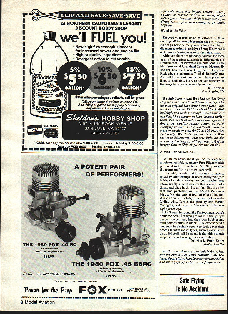 NO NONSENSE BALSA STRIPPERS -u N Xetters theJditor letters will carefully considered general interest used Send Model Aviation 815 15th St NW Washington DC 20005 Missing Persons Bureau Thanks running letter requesting infor mation old-timer biplane May issue Model viation identified biplane its designer also have made contact Fred Tuxworth biplane pictured turned out design Dean Barry competed 1940 Nats strange no magazine ever picked up design since unique its day apparently flew quite well according write-ups about Dean Barry still around perhaps can supply drawings design us span 66 inches would probably make about 35 engine size SAM competition RC assist So far SAM Champs other SAM competition have seen anyone fly biplane design yet have universal appeal Fred Tuxworth has agreed help work up plans Sportster biplane version 15 scaled-up size will fly RC assist very beautiful biplane design soon have plans completed prototype built flown will submit publication others may enjoy building flying unique example Freds creativity received letters people answering letter magazine information requests some asking information biplane drawing ever found Out about Apparently desire among old-timer builders locate some biplane designs era Except scale models myself cannot remember very being built gas competi tion Aside lower efficiency suppose felt building two wings waste time inevitable end scrap bin today RC possibilities models last much longer potential biplanes catch much greater know column missing persons bureau two other old-time designers would like locate because am also working up drawings designs Harold Coovert did some work old Peerless company Cleveland Art Horak designed model called Kid printed MAN 1946 anyone knows two please write telephone costs too much get phone talking about old days will lind out what mian apprcciatc phone calls got regards Biplane Fred Tuxworth Vermont must have cost bundle shows however extremes people hobby will go assist other Ralph E Turner 35283 Keller Dr Avon OH 44011 Ab Winglets would like thank Chuck Anderson sharing us results winglet research May80 fine piece work especially comparisons between winglet-equipped short wing long conventional wing article mentions winglets cause increased wing root bending momentthe force causes wing rods bend fuselage sides subtle structural point might missed other experimenters winglets also produce large bending moment wing tips Conventional wings feel bending tip wing spars tapered shear webs omitted other parts wing ill effects Anyone trying winglets should consider using untapered spars shear webs tip-to-tip Wing construction like used Cecil Hagas Legionair Shuttle aluminum tube spar would ideal Two other notes caution increased dihedral effect Mr Anderson notedresulting wing rock Dutch roll difficulty turning trimmay require reduced dihedral fuselage and/or different fin size Preplan ning needed allow changes major rework fuselage Also noted winglet effects changed speed perfect winglet angle will change both airspeed ballast carried weight fixed winglct design really has ideal operating condition workable contest-winning winglet would adjustable angle different tasks final questionare winglets violation intent 2-meter 100-in span limits own feeling should allowed now AMA rules R Gregg Lovick Grapevine TX Washin Washout certainly appreciated Brad Powers first stallment CG certainly did understand CG before Another item continually mystifies washout wing tips Most stick model authors talk about using say makes stable plane yet am able understand works Pat Rose no address given Its real/i simple Pat Washout means wing tip twisted downsay two degrees whateverand trailing edge therefore twisted up Heres hard part Any airfoil has stalling angleit quits liftingat roughly 16 degrees varies So center ofthe wing reaches attack angle say 16 degrees washout wing 2 degrees remember now has angle attack 14 degrees inner portions ofthe wing stallfirst Without washout tip will stall first plane stalls rolls direction whichever tip happens stall first RC model hauled off ground slowed too much glide pulled around abruptly aileron elevator can snaproll direction ofa stalled tip Wash trailing edge twisted down can fatal tip always stalls first two degrees mashin center o/ihe wing nai firing 14 degrees tip 16 degrees stalls Washin however used byfreeflight experts forcing model turn say toward right use wash right tip case hold wing up tight turn prevent righthand spiral again given example Thus warps kind fatal Continued page 8 6 Model Aviation Rosies D&R Rower Rd Fits COX T- 0 & Med 049 051 Engs Rubber Band Screw Mounting Eng mta upright inverted Running time appx 4 mm Nylon injection moulded Power 3 lb airplanes $595/ total weight s Switch Switch duty gear WeM wide wesm1 1ev D 8 d esimer ieee prelude 3501-C W Moore St Santa Ana CA 927041 Strips Balsa Fuzz-Freew/out Adjustments Smapi C1A nfl PNut Kits Urder Direct GENE DUBOIS LDEALER INQUIRIES INVITED P0 Box c Acushnet MA 02743 THE NEW FIREBALL GLOW PLUGS ARE LEAKPROOF AND BLOWOUT PROOF EVEN FOR THE NEW MONSTER ENGINES BUT THEY ARE STILL THE OLD PRICE OF $110 WRITE NOW! SWANSON PO Box 151 Wayne 07470 0$ NORTHERN CAUFORNIAS LARGESTU SCOUNT HOBBY SHOPI well FUELyouI i New high film strength lubricantU increased power engine lifeI Highest quality ingredients ~tergent action cut varnish I II II II II II II II II II IHOURS Monday thru weonesocy v u-o iu inursooy t Inaoy YKiU-OUUI L Saturday 930-600 Sunday 1200-500 J 8 Model Aviation 305 TOWSON AVE SMITH ARK 72901 especially impart wash Warps washin washout have increasing effects higher airspeeds dive diving turns often causes things go totally haywire Word Wise Enjoyed articles Milestones RC July 80 issue brought back memories Although some planes unfamiliar did manage buildand fly Smog Hog Bonner Varicomps latest thing Although probably sources some pians available different places notice Jim Newman International Scale Plan S