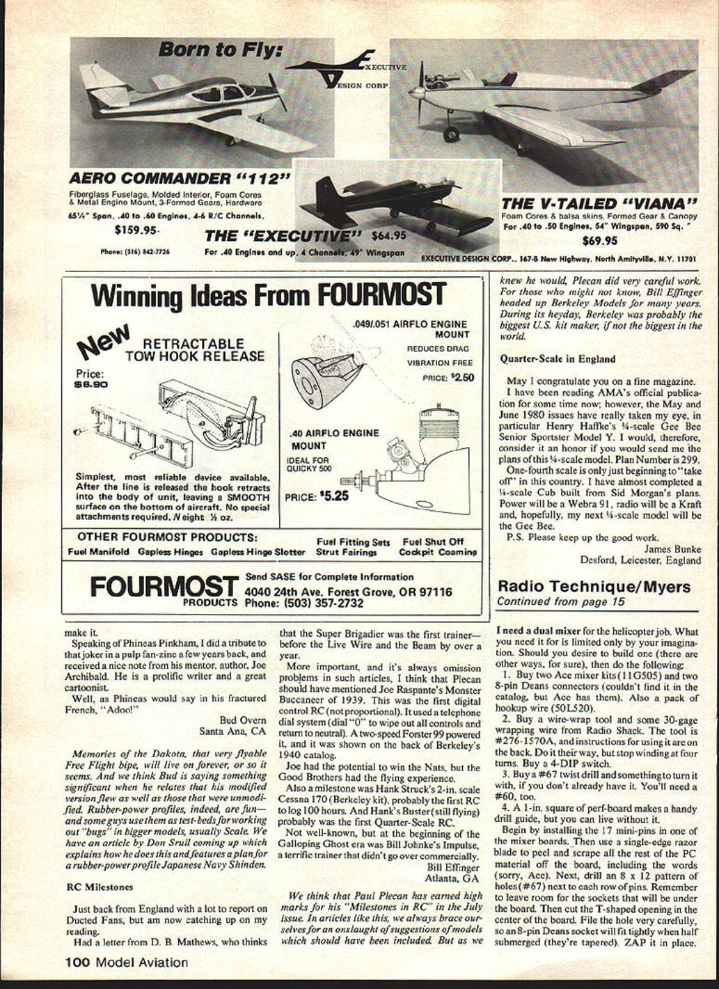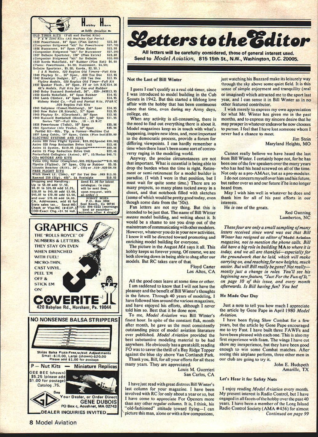 L H0 ULU 115105 sIrs ttui ens PartIal eItS P & W Semi-Kilo Machine Cut Paris 1938 Powerhouse 84 Spen Pien Extra $1550 Companion Srtipwood kit Powerhouse $1770 1930 Buccaneer 84 Span Pies Extra $i550 Compesios Siripwood kit Buccaneer $2750 i937 Deilaire Sporister 100 Pies Extra $i900 Companion Stripwood kit Daiiaire $3000 i039 Korda Wakefieid 44 Rubber Pian Exi $000 itans Powerhouse $400 Buccaneer $450 Unlinire Sporteter $100 Rorda $250 & K Modeis 020 Repilca Oid Tiwers--Futi Kilo 1940 Playhoy Sr 36 Spen 020 Tee Dee $1295 1042 Brooklyn Dodger 32 020 Tee Dee $1395 Plyline Models 020 Replica Old Timer--Fail Kit 1937 Queker Flesh 34 Spas FP ich RIG $1430 4Ks Modeis Full Kilo Gas Ruhher 1949 Baby Buzzerd Bombshell 30 020 049$5395 1930 Korda Wakefield 44 Span ltubher $1405 1941 Lamb Climber 44 Spas Ruhber $1495 Midway Model Co--Pull Partial Rita FF&R/C 020 Replica Pull Kits 1940 Sailplane Comet/Goidberg 30 span $1495 i940 New Ruler HOtruck 31 Span $1395 1940 Playboy Sr Cleveland 30 Span $1295 1940 Buazerd Bombshell Knofes pec $1191 Series 50--Pull Rile 10 15 RIG 1939 Powerhouse Taihi 50 Span $3180 1941 Sporister Air Trails 50 Open $3896 Partial Kit--Rib Tip & Former--Machine Cul 1937 Long Cabin 78 Span Cabin Plan lscl$2090 ELECTRIC SYSTEMS AND KITS Astro 020 Free FlighO System 2995Speciai $2096 Astro 020 Prop Reduction Drive Unit $1346 Astro 15 System $12995 [Speciaiaaaasaeaeo $8996 Astro 15 Prop Reduction Drive Unit $2240 Porterfield Collegiate Astro 67 15/Reduc $4071 C02 MOTORS AND KITS Telco C03 Motor Complete $23 951 SpecialSCO$19 96 Flyette Plyline 24 Span C02 Rubber $595 Lincoin Beechey BIN 26 C02 919-929 $906 FREE FLIGHT KITS Witch l4awk J Clew 43 Tee Dee 049 $1395 Rawrnd 200 ISie 405 SA Nsalaleia $1995 Shipping Handling Send $190 latest Up $000 add $1 50 catalogue copy $891 $2000 add $329 will sent free $390 $8160 add $300 upon request $6001 $7006 add $359 order CA Addressees add 60 to PO Box 3004 Slate sales law. Send MO Seal Beach Ca 90740 over $7990 add $600 f HOBBY HORN Check VisaIMC 8EXP 714 0946223 [mornings CODEaact Chg$t50 Hdl heat recorder-activates after 4 rins1 GRAPHICS THE ROLLS ROYCE OF NUMBERS & LETTERS THEY STAY ON EVEN WHEN DRENCHED WITH FUEL MICRO-THIN CAST VINYL PEEL EM OFF & STICK EM ON U COVERITE 420 Babylon Rd Horsham Pa 19044 NO NONSENSE BALSA STRIPPERS U N U SIr Ps Balsa Fuzz Freew/out AdiMatments Sma $10 00 Large Shown $20 00 Pease add $1 00 postage P Kits aturA Renlite1 EE BEE shown[ $525 please ad Si 00 Catakoy u see Dealer GENE DUBOIS P0 Box c Acushnet MA 027431 .....DEALER INQUIRIES INVITED Xetters te thediter letters will carefully considered general interest used Send Model Aviation 815 15th St NW Washington DC 20005 Last Bill Winter guess cant qualify real old-timer since introduced model building Cub Scouts 1942 started lifelong love affair hobby has continuous since time during Army days college etc activity all-consuming need find out everything about Model magazines keep us touch whats happening inspire new ideas important democratic process provide forum differing viewpoints can hardly remember time hasnt some sort contro versy raging modeling world Anyway precise circumstances important What essential being able drop burden time right Retire ment semi-retirement model builder paradise wish position must walt quite some time projects plans tucked away closet notebook filled sketches some would pretty good today though some date SOs Fan letters thing intended just name Bill Winter means model building writing about would shame see drop out mainstream communicating other modelers However whatever new activities know will directed toward promoting enriching model building everyone picture August MA says hobby keeps us forever young course both slowing down being able shag after models RC takes care Floyd Carter Los Altos CA good ones leave some time other am saddened know will have pleasure benefit Bill Winters thoughts future Through 40 years modeling have followed him around various magazines have enjoyed efforts although never told him Best done now Model Aviation Bill Winters finest hour spite constant flak month after month gave us consistently outstanding piece model aviation literature ever published Model Aviation provided best substantive modeling material anywhere obviously has great skill reading FO savor thrill Bay Ridge Topper against blue sky above Van Cortlandt Park Thank Bill efforts years appreciated Louis M Guerrieri San Carlos CA have just read great distress Bill Winters last column magazine have involved RC about year have come appreciate Openers other regular column think old-fashioned attitude toward flyingI can picture man alone few companions just watching Buzzard make its leisurely way through sky above some quiet field sense simple enjoyment tranquility real imagined attracted sport last year can sense Bill Winter no other featured contributor wish merely express own appreciation what Mr Winter has given past months express sincere desire may prosper whatever endeavor now chooses pursue feel have lost someone never chance meet Jim Stein Maryland Heights MO Cannot really believe have heard last Bill Winter certainly hope has few speakers over years has head screwed time pro-AMAer pro-modeler concern myself over him future rather over us future no longer heard May wish him well whatever does thank him past efforts interests greats Red Gunning Lumberton NC four small sampling letters received since word out Bill Winter has resogned editor Model Aviation magazine mention phone calls Bill did have big role building MA today thankfulespecially groundwork laia will make carrying ot reachi ngfor new heights much easier will Bill really gone really mostly just change roles Youll see beginning new feature Just Forthe Fun Ii page 10 issue month afterwards Bill having fun bet Made Day Just note tell much appreciate article Gene Pape April 1980 Model Aviation have flying Slow Combat few years article Gene Pape encouraged try Fast have buil