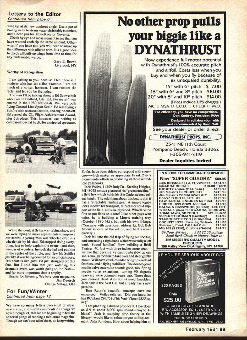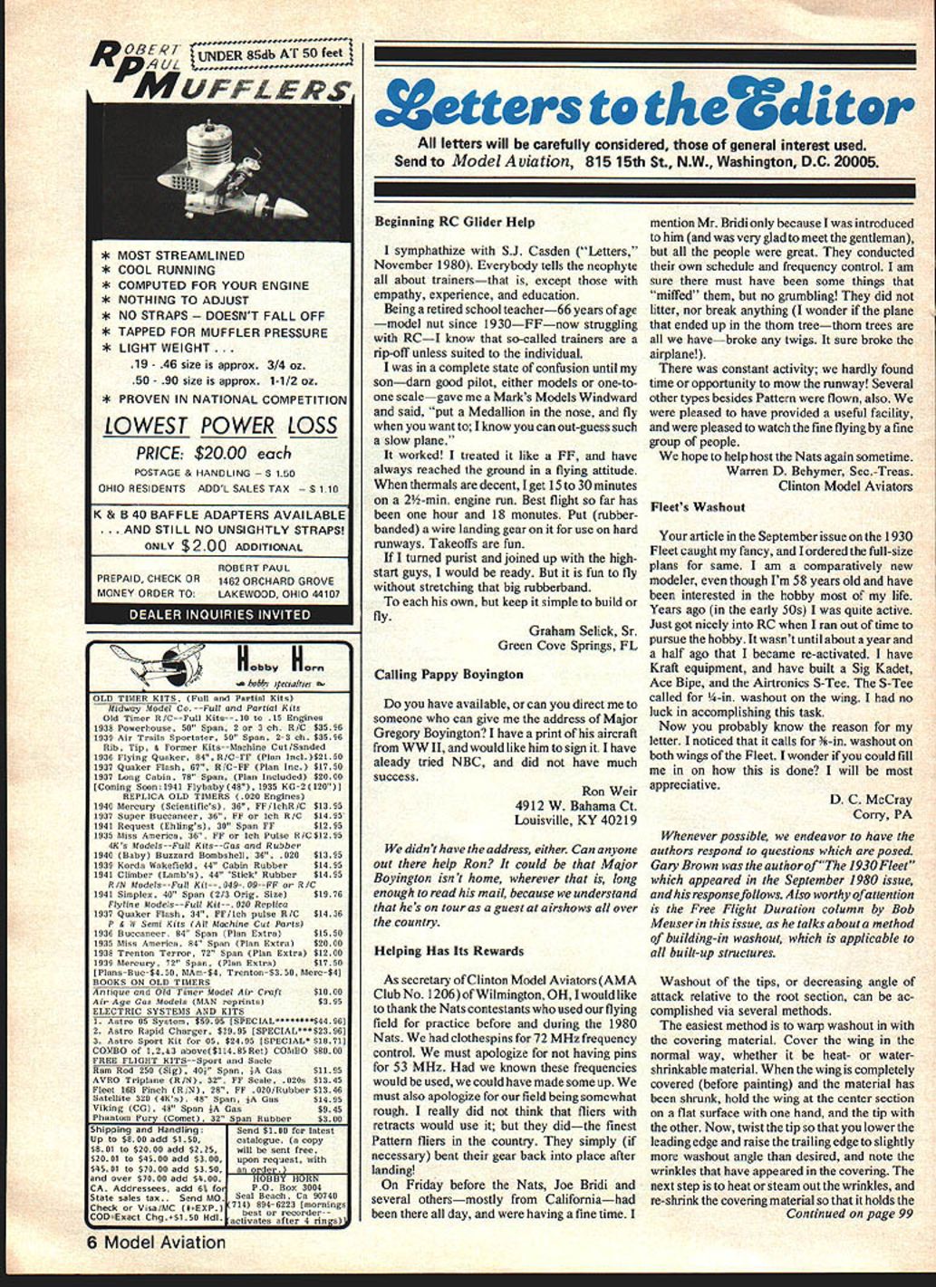 * MOST STREAMLINED * COOL RUNNING * COMPUTED FOR YOUR ENGINE * NOTHING TO ADJUST * NO STRAPS NT FALL OFF * TAPPED FOR MUFFLER PRESSURE * LIGHT WEIGHT. 19 46 size approx 3/4 oz 50 90 size approx 1-1/2 oz * PROVEN IN NATIONAL COMPETITION LOWEST POWER LOSS PRICE $2000 POSTAGE & HANDLING 0 OHIO RESIDENTS ADDL SALES TAX 0 K & B 40 BAFFLE ADAPTERS AVAILABLE AND STILL NO UNSIGHTLY STRAPS ONLY $200 ADDITIONAL ROBERT PAUL PREPAID CHECK OR 1462 ORCHARD GROVE MONEY ORDER TO LAKEWOOD OHIO 44107 S L H OLD TIMER KITS Poll Partial Kits Midway Madel Co --Full Partial Kits Old Timer R/C--Pull Kits--iS 15 Engines 1930 Powerhouse 50 Span 2 3 ch R/C $3596 1939 Air Trails Sportater 50 Span 23 ch $3596 Rib Tip & Former Kits--Machine Cut/Sanded 1930 Flying Quaker 04 H/C-PP Plan Incl$215S 1937 Quaker Flash 07 R/C-FP Plan Inc $1750 1937 Long Cabin 78 Span Plan Included $2000 ICoodng Soon 1041 Plybaby 40 1931 KO2 1201 REPLICA OLD TIMERS 020 Engines 1949 Mercury Scientifics 36 FF/lchR/C $1305 1937 Super Buccaneer 36 FF lcb K/C 51495 1941 Request Eblings 39 Span PP $1295 1935 Miss America 26 Py ich Pulse R/C $1295 4Ko Models--Full Kilo--Gao Rubber 1940 Baby Buzzard Bombshell 36 030 01395 1939 Korda Wakefield 44 Cabin Rubber $1495 1941 Climber Lambs 44 Stick Rubber $1495 R//4 Modelo--Foll Kit-- 940- O9--FF R/C 1941 Simplex 40 Span 2/3 Orig Size $1076 Flyline ModelsFull Kit 029 Replica 1937 Quaker Flash 34 FP/lch pulse R/C $1436 P & 11 Semi Kilo Machine Cut Forts 1936 Buccaoeer 94 Span Plan Emtra $1150 1931 Miss America 84 Span Plan Extra $2100 1938 Trenton Terror 72 Span Plan Estra $1200 1939 Mercury 72 Span Plan Extra $1750 lPlansBuc-$4 50 l1Am-$4 Trenton-$3 Merc-$41 BOOKS ON OLO TIMERS Antique Old Timer Model Air Craft $1000 Air Age Gas Models 1-IAN reprints $391 ELECTRIC SYSTEMS AND KITS 1 Astro 01 System $0995 ISPECIALOoooOOo*$4496] 3 Astro Rapid Charger $2901 ISPECIALOOO$2300] 3 Astro Sport Kit 95 0495 ISPECIAL $19711 COMBO 1263 above$1140SRet COIiBO $0000 FREE PLIGHT KITS--Sport Sacle Ram Rod 350 Sig 40$ Span Gas $1191 AVRO Triplone R/N 33 PP Scale 520s $1345 Fleet lOB Pinch R/N 20 PP 020/Rubber $1346 Satellite 330 4Ks 40 Span iA Gas $1495 Viking CO 48 Span $A Gas $945 Phantom Fury Cometl 32 Soan Rubber0300 Shipping Handling Send $100 latest Up $000 add $150 catalogue copy $091 $2000 add $225 mill sent free $2901 $4101 add $3 00 upon request $0101 $7100 add $050 L orderl CA Addressees add 65 to PO Box 3004 State sales lam. Send MO Seal Beach Ca 90740 oser $7900 add $090 HOBBY HORN Check Vsa/MC 9--EXP 714 8940323 Imornings CODEeacl ChgSl50 HdI best recorderetivates after 4 rings] Xetters t d letters will carefully considered general interest used Send Model Aviation 815 15th St NW Washington DC 20005 Beginning RC Glider Help symphathize wiEh SJ Casden Letters November 1980 Everybody tells neophyte about trainersthat except empathy experience education Being retired school teacher66 years age model nut since 1930FFnow struggling RCI know so-called trainers rip-off unless suited individual complete state confusion until sondam good pilot either models one-toone scalegave Marks Models Windward said put Medallion nose fly want know can out-guess such slow plane worked treated like FF have always reached ground flying attitude thermals decent get 15 30 minutes 2-mm engine run Best flight far has hour 18 monutes Put rubber banded wire landing gear use hard runways Takeoffs fun turned purist joined up highstart guys would ready fun fly stretching big rubberband own keep simple build fly Graham Selick Sr Green Cove Springs FL Calling Pappy Boyington have available can direct someone can give address Major Gregory Boyington have print aircraft WW II would like him sign have aleady tried NBC did have much success Ron Weir 4912 W Bahama Ct Louisville KY 40219 didnt have address either Can anyone out help Ron could Major Boyington isnt home wherever long enough read mail because understand hes tour guest airshows over country Helping Has Its Rewards As secretary Clinton Model Aviators AMA Club No 1206of Wilmington OH Iwould like thank Nats contestants used flying field practice before during 1980 Nats clothespins 72 MHz frequency control must apologize having pins 53 MHz known frequencies would used could have made some up must also apologize field being somewhat rough really did think fliers retracts would use didthe finest Pattern fliers country simply necessary bent gear back place after landing Friday before Nats Joe Bridi several othersmostly Californiahad day having fine time mention Mr Bridi because introduced him very glad meet gentleman people great conducted own schedule frequency control am sure must have some things miffed no grumbling did litter nor break anything wonder plane ended up thorn treethorn trees havebroke twigs sure broke airplane constant activity hardly found time opportunity mow runway Several other types besides Pattern flown also pleased have provided useful facility pleased watch fine flying fine group people hope to help host Nats again Sometime Warren D Behymer Sec-Treas Clinton Model Aviators Fleets Washout article September issue 1930 Fleet caught fancy ordered full-size plans same am comparatively new modeler though Im 58 years old have interested hobby life Years ago early SOs quite active Just got nicely RC ran out time pursue hobby wasnt until about year half ago became re-activated have Kraft equipment have built Sig Kadet Ace Bipe Airtronics S-Tee S-Tee called -in washout wing no luck accomplishing task Now probably know reason letter noticed calls i-in washout both wings Fleet wonder could fill done will appreciative D C McCray Corry PA Whenever possible endeavor have authors respond questions posed Gary Brown wastheauthorofThe 1930 Fleet appeared September 1980 issue responsefollows Also worthy ofattention Free Flight Duration column Bob Meuserin issue talks about method building-in washout applicable built-up structures Washout tips decreasing angle attack relative root section c