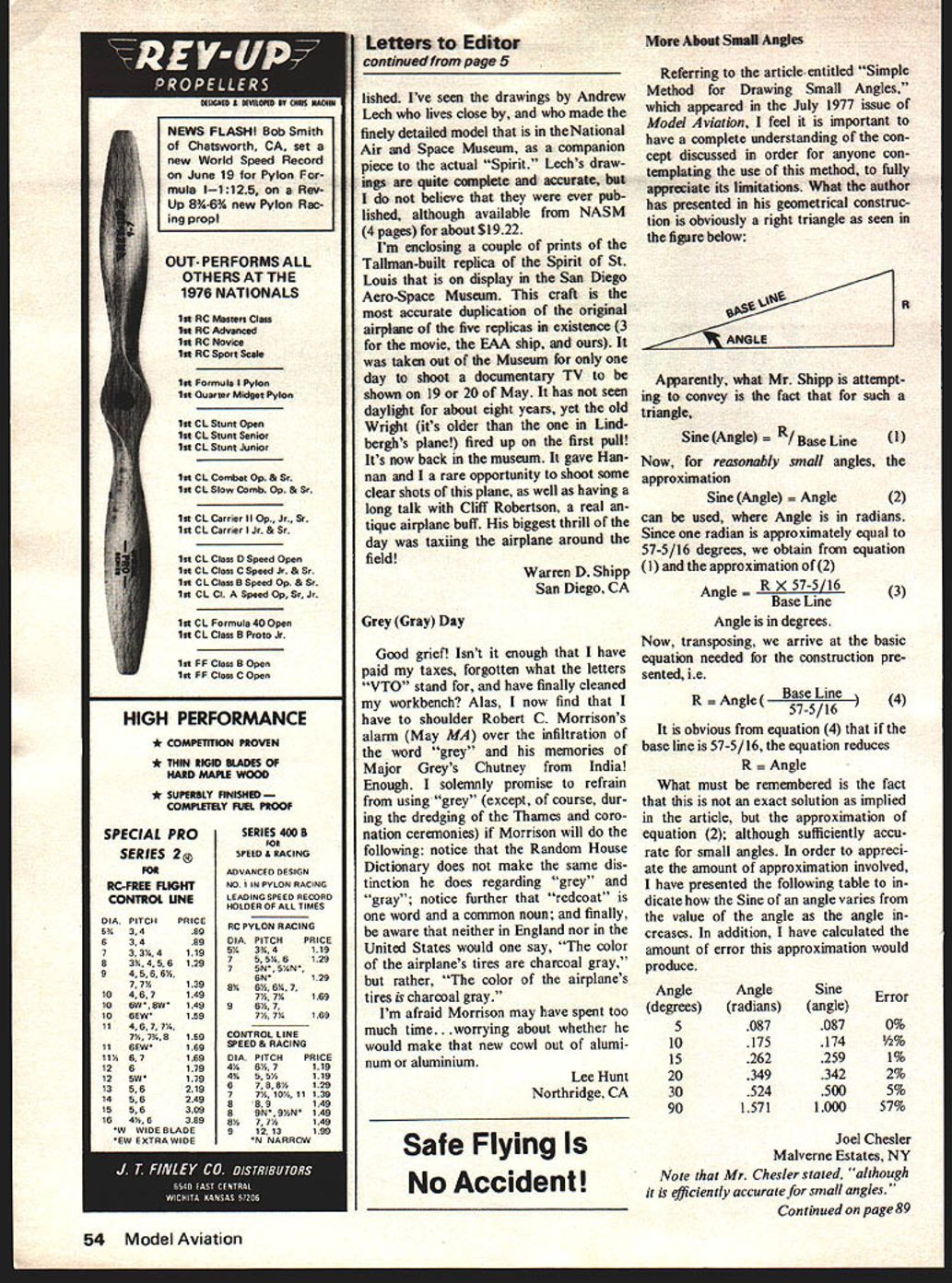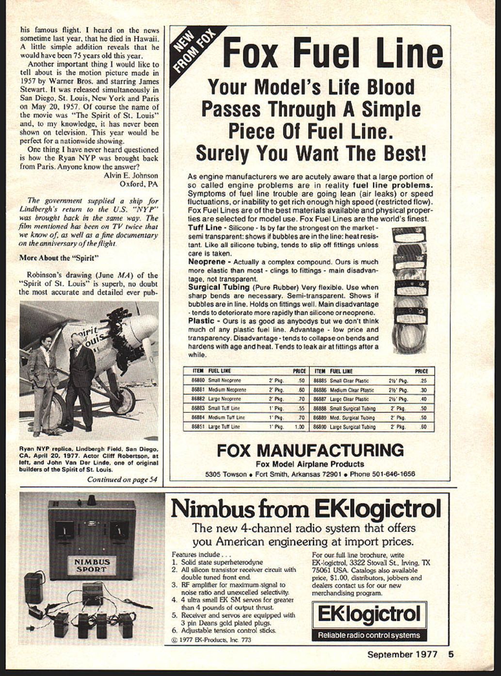 MIDWEST CL Models Give choose from. theres Midwest model al kind CL flyer desires Engine Sizes Kit No 243 15 to 19 Wing Span 33 DUCTS CO 400 South IndIana St Hobart IndIana 46342 occasion letter editorial comment Meusers penny plane article June issue ModelAviation would agree Meusers model good example monoplane design have no objection running article model Its excellent model However am deeply distressed editorial comparison Meusers model Kukons biplane unnecessary comparison indicating biplane compared monoplane requires expert handling gives support very bad rules change proposal outlaw bi planes Kukon biplane extremely dif ficult build compared Meuser penny plane nor difficult handle know Ive seen model personal feeling should run article Kukons bipe soon possible let modelers decide relative merits two models selves reference copy letter April 29 FFCB enclosed Please note Two years ago authors original proposal letter circulated entire NI MAS membership indicated Novice penny plane pen ny plane event beginners same letter loopholes advanced design penny planes called glorious opportunity innovation experimen tation no objections After al two years serious AMA competi tion fliers have devoted good deal work advanced designs particularly biplanes rules change would capriciously outlaw biplanes after fliers invited develop such models mind unfortunate Tom Vallee Laurel MD MA regrets present scheduling inventory does permit publishing season article penny plane biplane Spirit St Louis really enjoyed reading Spirit St Louis article last issue Model viat ion facts told never known before However some other interesting things omitted No men tion made Charles Lindberghs age time flight 25 al lived see 50th Anniversary 4 Model Aviation Penny Plane Bipe MAGICIAN 35 Engine Sizes 29 35 Wing Span 48 Greatest U Control stunt flyer trainer Easy build easier fly Kit No 235 MAGICIAN 15 Engine Sizes 15 19 Wing Span 34 Little brother Magician 35 KING COBRA Engine Sizes 29 35 Wing Span 48 Kit No 236 15 to 19 Wing Span 33 WARHAWK Engine Sizes 29 35 Wing Span 48 Kit No 244 Engine Sizes Kit No 242 famous flight heard news sometime last year died Hawaii little simple addition reveals would have 75 years old year Another important thing would like tell about motion picture made 1957 Warner Bros starring James Stewart released simultaneously San Diego St Louis New York Paris May 20 1957 course name movie Spirit St Louis knowledge has never shown television year would perfect nationwide showing thing have never heard questioned Ryan NYP brought back Paris Anyone know answer Alvin E Johnson Oxford PA government supplied ship Lindberghs return US NYP brought back same way film mentioned has TV twice know well fine documentary anniversary ofthefiight About Spirit Robinsons drawing June MA Spirit St Louis superb no doubt accurate detailed ever pubFox Fuel Line Models Life Blood Passes Through Simple Piece Fuel Line Surely Want Best As engine manufacturers acutely aware large portion called engine problems reality fuel line problems Symptoms fuel line trouble going lean air leaks speed fluctuations inability get rich enough high speed restricted flow Fox Fuel Lines best materials available physical proper ties selected model use Fox Fuel Lines worlds finest Tuff Line Silicone far strongest market semi transparent shows bubbles line heat resis tant Like silicone tubing tends slip off fittings unless care taken Neoprene Actually complex compound much elastic clings fittings main disadvan tage transparent Surgical Tubing Pure Rubber Very flexible Use sharp bends necessary Semi-transparent Shows bubbles line Holds fittings well Main disadvantage tends deteriorate rapidly silicone neoprene Plastic good anybodys dont think much plastic fuel line Advantage low price transparency Disadvantage tends collapse bends hardens age heat Tends leak air fittings after ITEM FUEL LINEPRICE ITEM FUEL UNEPRICE 86880Small Neoprene2Pkg.5086885Small Clear Plastic2 Pkg.25 86881Medium Neoprene2Pkg.6086886Medium Clear Plastic2 Pkg.30 86882Large Neoprene2Pkg.7086887Large Clear Plastic2 Ptrg.40 86883Small luff Line1Pkg. 5586888Small Sergical Tubing2 Pkg.50 86884Medium Taft Line1Pkg7086889Med Surgical Tubing2 Pkg.50 86851Large Tuft Line1Pkg10086890Large Surgical Tubing2 Pkg.60 FOX MANUFACTURING Fox Model Airplane Products 5305 Towson Smith Arkansas 72901 e 501-646-1656 Nimbus EKiogictrol new 4-channel radio system offers American engineering import prices Features include. 1 Solid state superheterodyne 2 All silicon transistor receiver circuit double tuned front end 3 RF amplifier maximum signal noise ratio unexcelled selectivity 4 4 ultra small EK SM servos greater 4 pounds output thrust 5 Receiver servos equipped 3 pin Deans gold plated plugs 6 Adjustable tension control sticks 1977 EK-Products Inc 773 full line brochure write EK-logictrol 3322 Stovall St Irving TX 75061 USA Catalogs also available price $100 distributors jobbers dealers contact us new merchandising program EI logictrol September 1977 5 Ryan NYP replica Lindbergh Field San Diego CA April 20 1977 Actor Cliff Robertson left John Van Der Linde original builders Spirit St Louis Continued page 54 SPECIAL PRO SERIES 2 FOR EC-FREE FLIGHT CONTROl LINE DIAPITCHPRICE 5%3489 63489 733h4119 83%456129 94566% 77%139 10467149 106W 8W149 106EW159 114677% 7% 7%S159 116EW169 11%67169 126179 125W179 1356219 145 6249 1556309 164% 6389 W WIDE BLADE EW EXTRA WIDE SERIES 400 B FOR SPEED NG ADVANCED DESIGN ND 1 IN PYLDN RACING LEADING SPEED RECORD HDLDER DP ALL TIMES NC PYLON RACING DIA PITCHPRICE 5/3%4119 75S%6129 7SN 5%N EN129 8%6%6%7 7%7%169 96%7 7%7%169 CONTROL LINE SPEED & RACING DIA PITCHPRICE 4/6%7119 4%55%119 6788%129 77%1G%11139 889149 89N9%N149 8%77%149 91213199 N NARROW Letters Editor continued frem page 5 lished Ive seai drawings Andrew Lech lives close made finely detailed model Natonal Air Space Museum companion piece actual Spirit Lechs drawN aceneate hat believe ever pub lished al