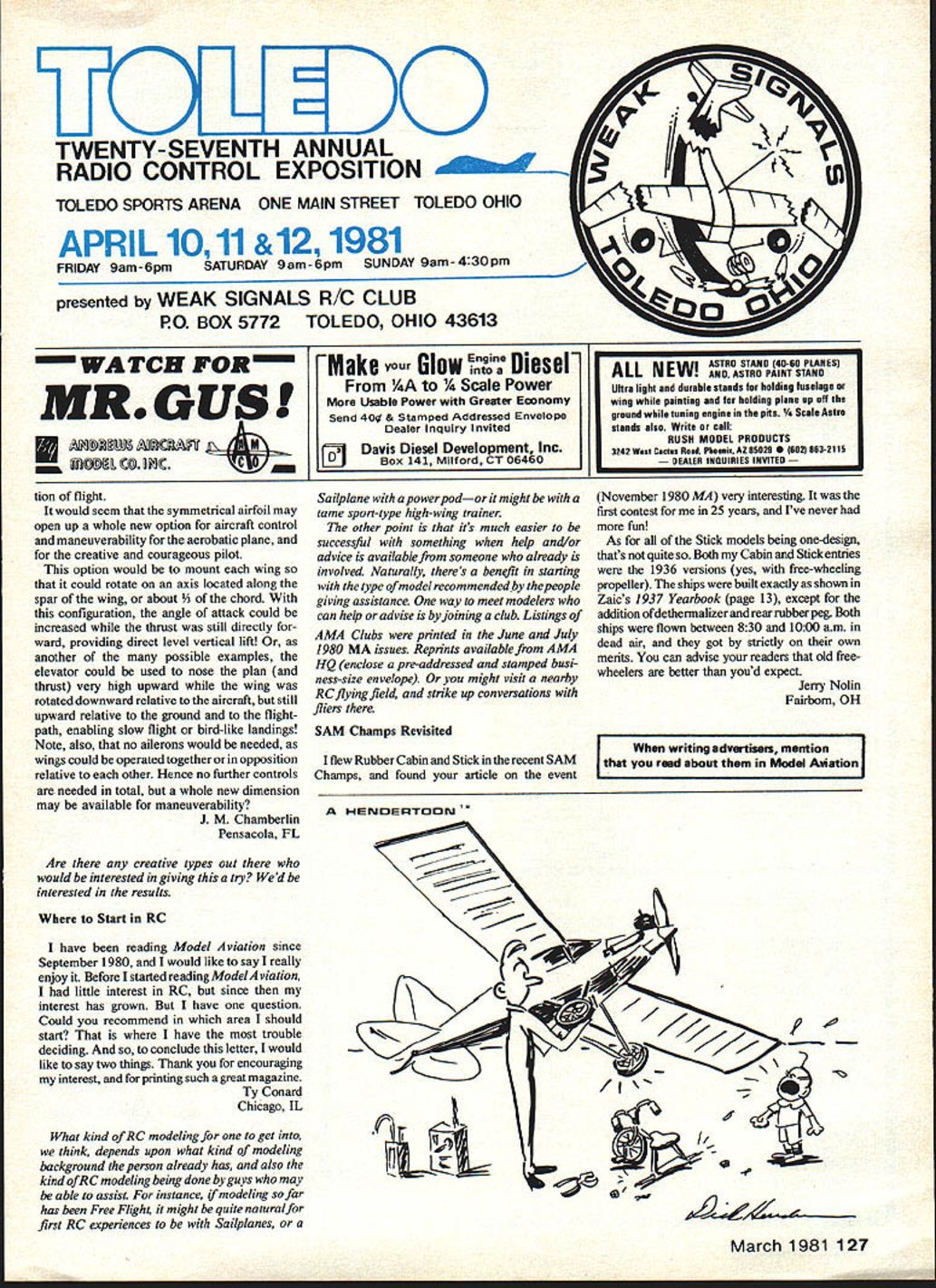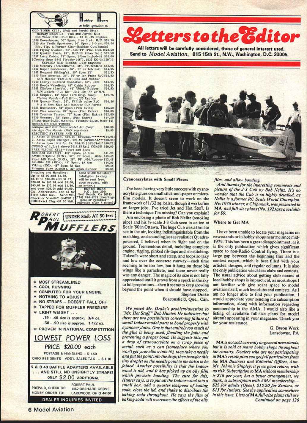 Shipping Handling Send $180 latest Up $000 add $150 catalogue copy $801 $2000 add $225will Sent free $2001 $4500 add $300upon request $4501 $7000 add $350an order over $7000 add $400 HOBBY H RN CA Addressees add 6% fo PO Box 3004 Stale sales las. Send MO Seal Beach Ca 00740 Check Visa/MC 0-EXP 714 0040223 [mornings best recorderCODEaacl Chg--$100 Hdl activates after 4 ringsi * MOST STREAMLINED * COOL RUNNING * COMPUTED FOR YOUR ENGINE * NOTHING TO ADJUST * NO STRAPS NT FALL OFF * TAPPED FOR MUFFLER PRESSURE * LIGHT WEIGHT. 19 - 46 size approx 3/4 oz 50 90 size approx 1-1/2 oz * PROVEN IN NATIONAL COMPETITION LOWEST POWER LOSS PRICE $2000 POSTAGE & HANDLING 0 OHIO RESIDENTS ADOL SALES TAX 0 K & B 40 BAFFLE ADAPTERS AVAILABLE AND STILL NO UNSIGHTLY STRAPS ONLY $200 ADDITIONAL Xetters t dd letters will carefully considered general interest used Send ModelAviation 815 15th St NW Washington DC 20005 Ive having very little success Cyano acrylate glues small stICk-aI3d-paperor micro film models doesnt seem work framework 1/32 sq balsa though works fine larger jobs Ive tried Jet Hot Stuff technique Im missing Can explain Am enclosing photo Bob Nelitz smoking pipe V-scale J-3 Cub seen action Scale 80 Ottawa huge Cub thrill see air looking indistinguishable real thing soundingiust realistic Quadra powered believe flight ground Tremendous detail including complete engine rigging pinked rib-tape rib stitching Takeoffs short steep loops lazy low over concrete runwayeach time seeming too low hung big wings like parachute never really danger magic its size fully appreciated until grows speck sky full proportionsthen seems keep growing beyond point should have stopped Stephen Drake Beaconsfield Que Can posed Mr Drakes problem/question Mr Hot Stuff Bob Hunter indicates two possibilities concerning failure small Indoor model parts bond properly cyanoacrylates entirely too much glue being used flooding joint preventing proper bond suggests put drop cyanoacrylate scrap piece metal such can someplace wont get elbow take needle andput point drop transfer tiny droplet needlepoint balsa joined Another possibility Indoor wood old has picked up oily film prevents bonding cure Hunter says put Indoor wood small box add quarter teaspoon baking soda close lid shake distribute baking soda throughout says film baking soda will overcome effects oily Get MA have unable locate magazine newsstands hobby shops near since mid1979 has great disappointment publication gives significant space non-Radio Control flying large gap between beginning flier contest expert best filled articles designs regular columns also publication lists clubs contests usual advice about getting club names local hobby shops impractical shops am familiar give scant space model aviation itself much less clubs contests As am no longer able find publication would appreciate sending subscription information along information regarding membership AMA would also like listing available full-size plans model aircraft appearing magazine Thank assistance G Byron Work Lanodowne PA MA sold currently ongeneralnewsstands sold hobby shops throughout country Dealers particpating MAs resale plan can getfullparticulars MA Business Editorial Offices Attn Ms John nie Shopley gives good return no risk Subscrption MA membershi $16 per year better arrangement think subscription AMA membershimo $25 adults Open $1550 Seniors $l3forJuniors See application somewhere issue Lists ofMAfull-sizeplans still Continued page 126 6 Model Aviation Hatt H0 OLD TIMER KITS Full Partial Kits Midway Model Co --Full Partial Kils Old Timer B/C--Full Kits-- 15 15 Engines 1930 Powerhouse 50 Span 2 3 ch R/C $3596 1030 Air Trails Sportster 50 Span 23 ch $3506 Rib Tip & Foroer Kits--Machine Cot/Sanded 1036 Flying Quaker 84 R/CFF Flan lncl$2t50 1937 Quaker Flash 67 R/C-FF Plan Inc 01750 1937 Long Cabin 70 Span Plan Included $2000 [Cowing Soon 1941 Flybaby 148 1035 NO 1120] REPLICA OLD TIMERS 020 Engines 1940Mercury lScientifics 36 FF/lchR/C$1305 1937Super Buccaneer 36 FF ich RIG$1405 1941Request Eblings 20 Span FF$129S 1933 Miss America 36 FF leb Pulse R/C$t20$ 4Ra Models--Full Kits--Gas Rubber 1040Baby Buatard Bombshell 26 020$1203 1039Korda Wakefield 44 Cabin Rubber$1495 1041Climber Lambs 44 Slick Rubber$1495 RIB Models--Full Kit- 045- 00--FF RIG 1941 Simplex 40 Span 2/3 Orig Site $1076 Flyline Models--Full Kit-- 070 Replica 1937 Quaker Flash 34 FF/lch pulse R/C $1436 P & W Semi Kits Machine Cut Ports 1036 Buccaneer 04 Span Plan Eatra $1550 1935 Miss America 04 Span Plan Extra $2000 1030 Trenton Terror 72 Span Plan Extra $1200 1930 Mercury 72 Span Plan Extra $1750 lPlansBuc$450 StAm$4 Trenlon$3 50 Merc$41 BOOKS ON OLD TIMERS Anlique Old Timer Model Air Croft $1300 Air Age Gas Models MAN reprints $395 ELECTRIC SYSTEMS AND KITS 1 Aslro 05 System $5995 [SPEClALooo~oas$4496] 2 Astro Rapid Charger $2095 ISPECIAL05$23961 3 Astro Sport Kit 05 $2405 [SPECIAL0 $1071] COMBO 1263 sbove$11405 Ret COIJBO $0000 FREE FLIOHT KITS--Sport Sacle Ram Rod 250 ISig 40 Span Gas 91105 AVRO Triplane B/N 32 PP Scale 020s 01345 Fleet lOB Finch RIB 20 FF 020/Rubber $1346 Satellite 320 4Ks pan 9A Oat 91495 Viking ICO 40 Span Gas $945 Phantom Fury IComell 32 Oman R,hher $390 ROBERT UNDER 85dbfeet MUFFL Cyanoacrylates Small Pieces film allow bonding thanks interesting comments picture J-3 Cub Bob Nelitz Its no wonder Cub highly detailed Nelitz aformerRC Scale World Champion 1976 winner Chipmunk presented MA andfull-size plans No 192 available $9 ROBERT PAUL PREPAID CHECK OR 1462 ORCHARD GROVE MONEY ORDER TO LAKEWOOD OHIO 44107 IS New Westchester County Center White Plains York Dont miss 13th annual show Itll biggest best ever Keep next last weekend February open. 1981 WRAMs Show going larg est yet Well over 150 manu facturers other exhibiters have already signed up bring everything thats new hobby. kits engines radios accessories everything between famous Swap Shop will full operation thousands items including built-up planes al