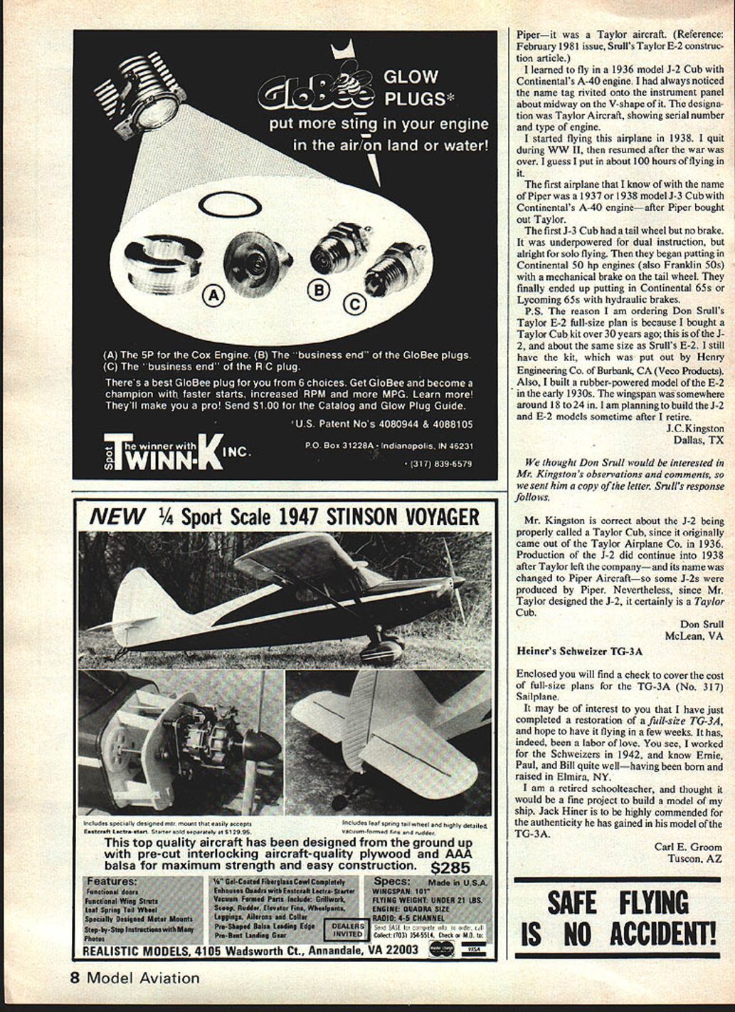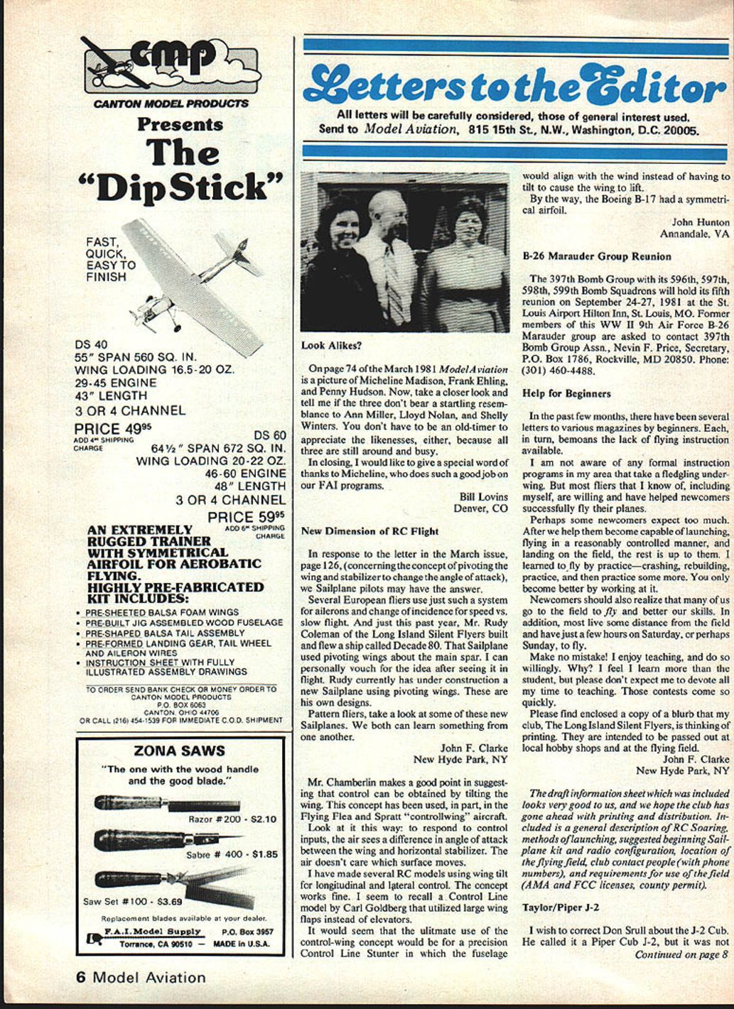 CANTON MODEL PRODUCTS Presents Dip Stick FAST QUICK EASY TO FINISH DS 40 55 SPAN 560 SQ IN WING LOADING 165-20 OZ 29-45 ENGINE 43 LENGTH 3 OR 4 CHANNEL PRICE 4995 ADO 4 SHIPPING CHARGE DS6O 641/2 SPAN 672 SQ IN WING LOADING 20-22 OZ 46-60 ENGINE 48 LENGTH 3 OR 4 CHANNEL PRICE 5995 EXTREMELY ADD 6 SHIPPING RUGGED TRAINER CHARGE WITH SYMMETRICAL AIRFOIL FOR AEROBATIC FLYING HIGHLY PRE-FABRICATED KIT INCLUDES PRE_SHEETED BALSA FOAM WINGS PRE-BUILT JIG ASSEMBLED WOOD FUSELAGE PRE-SHAPED BALSA TAIL ASSEMBLY PRE-FORMED LANDING GEAR TAIL WHEEL AND AILERON WIRES INSTRUCTION SHEET WITH FULLY ILLUSTRATED ASSEMBLY DRAWINGS TO ORDER SEND BANK CHECK OR MONEY ORDER TO CANTON MODEL PRODUCTS PO BOX 6063 CANTON OHIO 44706 OR CALL 216 454-1539 FOR IMMEDIATE COD SHIPMENT Xetters t %d letters will carefully considered general interest used Send Model Aviation 815 15th St NW Washington DC 20005 page 74 March1981 ModelA viation picture Micheline Madison Frank Ehling Penny Hudson Now take closer look tell three dont bear startling resem blance Ann Miller Lloyd Nolan Shelly Winters dont have old-timer appreciate likenesses either because three still around busy closing would like give special word thanks Micheline does such good job FAI programs New Dimension RC Flight response letter March issue page 126 concerning concept pivoting wing stabilizer change angle attack Sailplane pilots may have answer Several European fliers use just such system allerons change incidence speed vs slow flight just past year Mr Rudy Coleman Long Island Silent Flyers built flew ship called Decade 80 Sailplane used pivoting wings about main spar can personally vouch idea after seeing flight Rudy currently has under construction new Sailplane using pivoting wings own designs Pattern fliers take look some new Sailplanes both can learn something another John F Clarke New Hyde Park NY Mr Chamberlin makes good point suggest ing control can obtained tilting wing concept has used part Flying Flea Spratt controllwing aircraft Look way respond control inputs air sees difference angle attack between wing horizontal stabilizer air doesnt care surface moves have made several RC models using wing tilt longitudinal lteral control concept works fine seem recall Control Line model Carl Goldberg utilized large wing flaps instead elevators would seem ulitmate use control-wing concept would precision Control Line Stunter fuselage would align wind instead having tilt cause wing lift way Boeing B- 17 symmetri cal airfoil John Hunton Annandale VA B-26 Marauder Group Reunion 397th Bomb Group its 596th 597th 598th 599th Bomb Squadrons will hold its fifth reunion September 24-27 1981 St Louis Airport Hilton Inn St Louis MO Former members WW II 9th Air Force B-26 Marauder group asked contact 397th Bomb Group Assn Nevin F Price Secretary PO Box 1786 Rockville MD 20850 Phone 301 460-4488 Help Beginners past few months have several letters various magazines beginners turn bemoans lack flying instruction available am aware formal instruction programs area take fledgling under wing fliers know including Bill Lovins myself willing have helped newcomers Denver CO successfully fly planes Perhaps some newcomers expect too much After help become capable launching flying reasonably controlled manner landing field rest up learned fly practicecrashing rebuilding practice practice some become better working Newcomers should also realize us go field fly better skills addition live some distance field have just few hours Saturday perhaps Sunday fly Make no mistake enjoy teaching willingly feel learn student please dont expect devote time teaching contests come quickly Please find enclosed copy blurb club Long Island Silent Flyers thinking printing intended passed out local hobby shops flying field John F Clarke New Hyde Park NY draft information sheet included looks very good us hope club has gone ahead printing distribution cluded general description RC Soaring methods launching suggested beginning Sail plane kit radio configuration location flying field club contact people phone numbers requirements use field AMA FCC licenses county permit Taylor/Piper 1-2 wish correct Don Srull about 1-2 Cub called Piper Cub J-2 Continued page 8 6 Model Aviation /1 Look Alikes ZONA SAWS wood handle good blade Razor #200 $210 SabrB * 400 Si 85 Saw Set Replacement blades avadable dealer F AX Model SupplyPO Box 3957 ITorrance CA 90510 uSA Piperit Taylor aircraft Reference February 1981 issue Srulls Taylor E-2 construc tion article learned fly 1936 model J-2 Cub Continentals A-40 engine always noticed name tag rivited onto instrument panel about midway V-shape designa tion Taylor Aircraft showing serial number type engine started flying airplane 1938 quit during WW II resumed after war over guess put about 100 hours flying first airplane know name Piper 1937 1938 model J-3 Cub Continentals A-40 engineafter Piper bought out Taylor first J-3 Cub tail wheel no brake underpowered dual instruction alright solo flying began putting Continental 50 hp engines also Franklin SOs mechanical brake tail wheel finally ended up putting Continental 65s Lycoming 65s hydraulic brakes PS reason am ordering Don Srulls Taylor E-2 full-size plan because bought Taylor Cub kit over 30 years ago I2 about same size Srulls E-2 still have kit put Out Henry Engineering Co Burbank CA Veco Products Also built rubber-powered model E-2 early 1930s wingspan somewhere around 18 24 lam planning build J-2 E-2 models sometime after retire JCKingston Dallas TX thought Don Srull would interested Mr Kingstons observations comments sent him copy letter Sru Ils response follows Mr Kingston correct about J-2 being properly called Taylor Cub since originally came out Taylor Airplane Co 1936 Production J-2 did continue 1938 after Taylor left companyand its name changed Piper Aircraftso some J-2s produced Piper Nevertheless since Mr Taylor designed J-2 certainly Taylor Cub Don Srull McLean VA Heiners Schweizer TG-3A Enclosed will find ch
