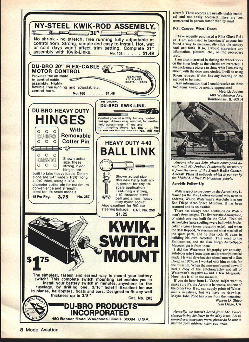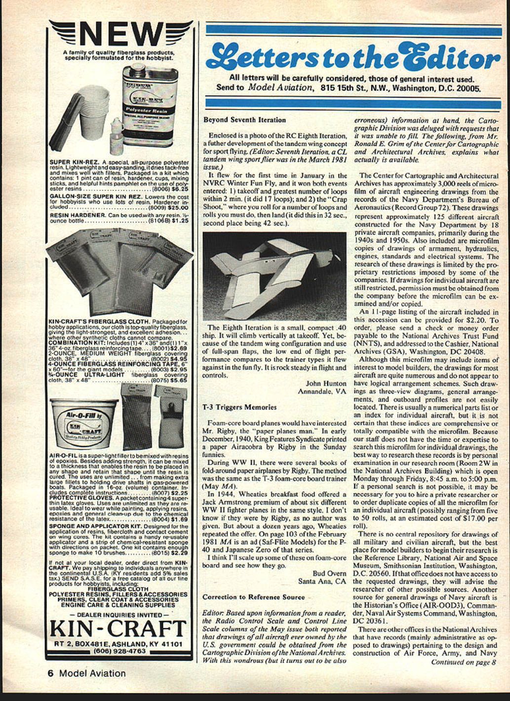 NEW family quality fiberglass products specially formulated hobbyiat SUPER KIN-REZ special all-purpose polyester resin Lightweightand easy-sanding dries tack-free mixes well fillers Packaged kit contains 1 pint can resin hardener cups mixing sticks helpful hints pamphlet use poly ester resins8006 $625 GALLON-SIZE SUPER KIN REZ Lowers cost hobbyists use lots resin Hardener cluded8009 $2500 RESIN HARDENER Can usedwith resin 1/i ounce bottle81 06B $125 AIR-O-FIL super-lightfillerto mixedwith resins epoxies Besides adding strength can mixed thickness enables resin placed shape retain shape until resin cured uses unlimited . making extra large fillets holding drive shafts gas-powered boats Packaged 16-oz volume container cludes complete instructions 8007 $225 PROTECTIVE GLOVES packet containing 4 superthin latex gloves Uses unlimited re usable Ideal wear painting applying resins epoxies general clean-up due chemical resistance latex8004 $169 SPONGE AND APPLICATOR KIT Designed application resins fibercloth contact cement wing cores kit contains handy reusable applicator strip chemical-resistant sponge directions packet kit contains enough sponge make 10 brushes 8015 $229 local dealer order direct KINCRAFT pay ahipping individuals anywhere continental USA KY residenta add 5% sales tax SEND SASE tree catalog tine products hobbyists including FIBERGLASS CLOTH POLYESTER RESINS FILLERS & ACCESSORIES PRIMERS CLEAR COAT & ACCESSORIES ENGINE CARE & CLEANING SUPPLIES DEALER_INQUIRIES INVITED KIN CRAFT RT 2BOX4S1EASHLANDKy 41101 606 928-4763 Xetters theditor letters will carefully considered general interest used Send Model Aviation 815 15th St NW Washington DC 20005 Beyond Seventh Iteration Enclosed isa photo RC Eighth Iteration futher development tandem wing concept sport flying Editor Seventh Iteration CL tandem wing sport flier March 1981 issue flew first time January NVRC Winter Fun Fly won both events entered takeoff greatest number loops within 2 mm did 17 loops 2 Crap Shoot roll number loops rolls must land did 32 sec second place being 42 sec Eighth Iteration smalt compact 41 ship will climb vertically takeoff Yet cause tandem wing configuration use full-span flaps low end flight per formance compares trainer types flew against fun fly rock steady flight controls John Hunton Annandale VA T-3 Triggers Memories Foam-core board planes would have interested Mr Rigby paper planes man early December 1940 King Features Syndicate printed paper Airacobra Rigby Sunday funnies During WW II several books fold-around paper airplanes Rigby method same T-3 foam-core board trainer May MA 1944 Wheaties breakfast food offered Jack Armstrong premium about six different WW II fighter planes same style dont know Rigby no author given about dozen years ago Wheaties repeated offer page 103 February 1981 MA adSaf-Flite Models P 40 Japanese Zero series think Ill scale up some foam-core board see go Bud Overn Santa Ana CA Correction Reference Source Editor Based upon information reader Radio Control Scale Control Line Scale columns May issue both reported drawings aircraft ever owned U S government could obtained Cartographic Division ofthe NationalArchives wondrous turns out also erroneous information hand Carto graphic Division deluged requests unable fill following Mr Ronald F Grim Centerfor Cartographic Architectural Archives explains what actually available Center Cartographic Architectural Archives has approximately 3000 reels micro film aircraft engineering drawings records Navy Departments Bureau Aeronautics Record Group 72 drawings represent approximately 125 different aircraft constructed Navy Department 18 private aircraft companies primarily during 1940s 1950s Also included microfilm copies drawings armament hydraulics engines standards electrical systems research drawings limited pro prietary restrictions imposed some companies drawings individual aircraft still restricted permission must obtained company before microfilm can ex amined and/or copied An 11-page listing aircraft included accession can provided $220 order please send check money order payable National Archives Trust Fund NNTS addressed Cashier National Archives GSA Washington DC 20408 Although microfilm may include items interest model builders drawings aircraft quite numerous appear have logical arrangement schemes Such draw ings three-view diagrams general arrange ments outboard profiles easily located usually numerical parts list index individual aircraft certain indices comprehensive totally compatible microfilm Because staff does have time expertise search microfilm individual drawings best way research records personal examination research room Room 2W National Archives Building open Monday through Friday 845 am 500 pm personal search possible may necessary hire private researcher order duplicate copies microfilm individual aircraft possibly ranging five 50 rolls estimated cost $1700 per roll no central repository drawings military civilian aircraft best place model builders begin research Reference Library National Air Space Museum Smithsonian Institution Washington DC 20560 Ifthat office does have access requested drawings will advise researcher other possible sources Another source general drawings Navy aircraft Historians Office AIR-00D3 Comman der Naval Air Systems Command Washington DC 20361 other offices National Archives have records mainly administrative op posed drawings pertaining design construction Air Force Army Navy Continued page 8 6 Model Aviation NY-STEEL KWIK-ROD ASSEMBLY No shrink no stretch free running fully adjustable control horn Strong simple easy install Hot wet cold days wont affect trim setting Complete 31 assembly Kwik-LinksNo 102$149 DU-BRO 20 FLEX-CABLE MOTOR CONTROL Fcontrol cable~A/C PLANES1\ Provides ultimate FOR assembly Highly flexible free running adjustable IInSOArS CARS LNo 165S149 Control horn RO HEAVY DUTY HINGES Removable Cotter Pin 000 size A1 yjShown actual 000strong nylon es built take heavy l