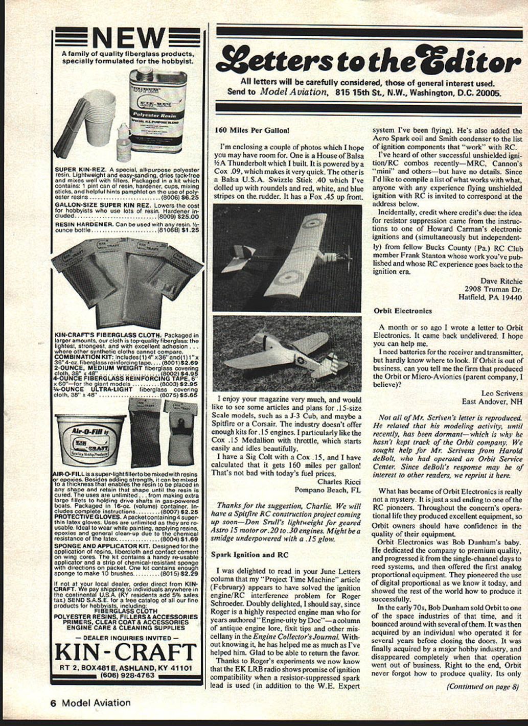 NEW Afamilyof quality fiberglass products specially formulated hobbyist $1 SUPER KIN-REZ special all-purpose polyester resin Lightweight snd easy-sanding dries tack-free mixes well fillers Packaged kit contains 1 pint can resin hardener cups mixing sticks helpful hints pamphlet use poly ester resins8006 $625 GALLON-SIZE SUPER KIN REZ Lowers coat hobbyists use lots resin Hardener cluded8009 $2500 RESIN HARDENER Can used resin ounce bottle81068 $125 5IR-O-FILL isa super-Iightfillerto mixedwith resins r epoxies Besides adding strength can mixed thickness enables resin placed shape retain shape until resin cured uses unlimited . making extra large fillets holding drive shafts gas-powered boats Packaged 16-oz volume container cludes complete instructions 8007 6225 PROTECTIVE GLOVES packet containing 4 superthin latex gloves Uses unlimited re usable Ideal wear painting applying resins epoxies general clean-up due chemical resistance latex8004 $1 69 SPONGE AND APPLICATOR KIT Designed application resins fibercloth contact cement wing cores kit contains handy reusable applicator strip chemical-resistant sponge directions packet kit contains enough sponge make 10 brushes 8015 $229 local dealer order direct KINCRAFT pay shipping individuals anywhere continental USA KY residents add 5% sales tax SEND SASE free catalog fine products hobbyists including FIBERGLASS CLOTH POLYESTER RESINS FILLERS & ACCESSORIES PRIMERS CLEAR COAT & ACCESSORIES ENGINE CARE & CLEANING SUPPLIES DEALER INQUIRIES INVITED KIN CRAFT RT 2B0X481EASHLANDKY 41101 606928-4763 Xetters t tters will carefully considered general interest used Send Model Aviation 815 15th St NW Washington DC 20005 160 Miles Per Gallon Im enclosing couple photos hope may have room House Balsa Thunderbolt built powered Cox 09 makes very quick other Balsa USA Swizzle Stick 40 Ive dolled up roundels red white blue stripes rudder has Fox 45 up front enjoy magazine very much would like see some articles plans 15-size Scale models such J-3 Cub maybe Spitfire Corsair industry doesnt offer enough kits 15 engines particularly like Cox 15 Medallion throttle starts easily idles beautifully have Sig Colt Cox 15 have calculated gets 160 miles per gallon Thats bad todays fuel prices Charles Ricci Pompano Beach FL Thanks suggestion Charlie will have Spitfire RC construction project coming up soonDon Srulls lightweight geared Astro 15 motor or20 30 engines Might smidge underpowered 15 glow Spark Ignition RC delighted read June Letters column Project Time Machine article February appears have solved ignition engine/RC interference problem Roger Schroeder Doubly delighted should say since Roger highly respected engine man years authored Engine-uity Doca column antique engine lore fixit tips other mis cellany Engine Collectors JournaL out knowing has helped much Ive helped him Glad able return favor Thanks Rogers experiments now know EK LRB radio shows promise ignition compatibility resistor-suppressed spark lead used addition WE Expert system Ive flying Hes also added Aero Spark coil Smith condenser list ignition components work RC Ive heard other successful unshielded igni tionlRC combos recentlyMRC Cannons mint othersbut have no details Since Id like compile list what works what anyone experience flying unshielded ignition RC invited correspond address below Incidentally credit credits due idea resistor suppression caine instruc tions Howard Carmans electronic ignitions simultaneously independent ly fellow Bucks County Pa RC Club member Frank Stanton work youve pub lished RC experience goes back tgnltlon era Dave Ritchie 2908 Truman Dr Hatfield PA 19440 Orbit Electronics month ago wrote letter Orbit Electronics came hack undelivered hope can help need batteries receiver transmitter hardly know look Orbit out business can tell firm produced Orbit Micro-Avionics parent company believe Leo Scrivens East Andover NH Mr Scriven s letter reproduced related modeling activity until recently has dormantwhich hasnt kept track Orbit company sought help Mr Scrivens Harold deBolt operated Orbit Service Center Since deBolts response may interest other readers reprint What has became Orbit Electronics really mystery just sad ending RC pioneers Throughout concerns opera tional life produced excellent equipment Orbit owners should have confidence quality equipment Orbit Electronics Bob Dunhams baby dedicated company premium quality progressed single-channel days reed systems offered first analog proportional equipment pioneered use digital proportional know today showed rest world produce successfully early 70s Bob Dunham sold Orbit space industries time bounced around several acquired individual operated several years before closing doors finally acquired major hobby industry disappeared completely operation went out business Right end Orbit never forgot produce quality Its Continued page 8 6 Model Aviation No other prop pulls problem appeared lack ability live through major managerial changes Orbit went lost major supplier Americanbuilt equipment supported RC growth could ill afford loss Orbit equipment 70s used circuitry similar use today difficult service Orbit owners should find reliable service center capable willing fill needs Obtaining fresh new equipment impossible course should substitutes Harold deBolt Buffalo NY Telemaster Mod Does Trick though less year RC experience thanks help Clayton Cox Bob Luhrman able modify 12-ft Telemaster lengthening nose get center gravity right place turned out excellent flier After spending some eight months construct ing plane realized would require about 6 lb nose weight get balance right place cure problem redesigned nose extending 8 inusing 3-in aluminum tube firewall header welded end end mounted orignal firewall other mounted engine Addi tional slope added windshield framework added cover tube give proper appearance As modified plane has some 30 40 flights ranging 5 mm 1 hr duration plane equipped rudder elevator ailerons boost tabs barn doo
