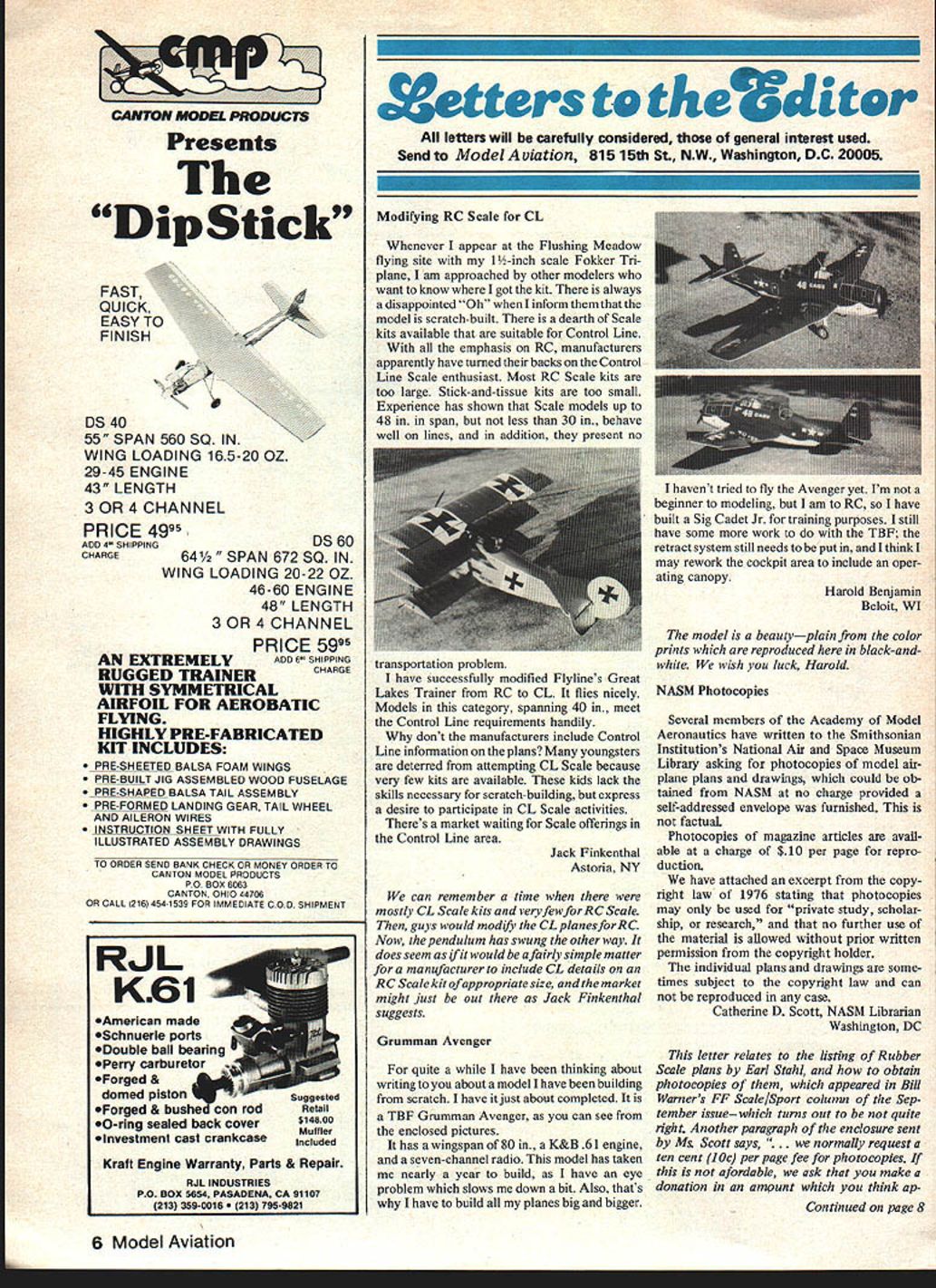 CANTON MODEL PRODUCTS Presents Dip Stick FAST QUICK EASY TO FINISH p DS 40 55 SPAN 560 SQ IN WING LOADING 165-20 OZ 29-45 ENGINE 43 LENGTH 3 OR 4 CHANNEL PRICE 4995 ADD 4 SHIPPING CHANGE 0 64 SPAN 672 SQ IN WING LOADING 20-22 OZ 46-60 ENGINE 48 LENGTH 3 OR 4 CHANNEL PRICE 5995 EXTREMELY ADD 6 SHIPPING RUGGED TRAINER CHARGE WITH SYMMETRICAL AIRFOIL FOR AEROBATIC FLYING HIGHLY PRE-FABRICATED KIT INCLUDES PRE-SHEETED BALSA FOAM WINGS PREBUILT JIG ASSEMBLED WOOD FUSELAGE PRE-SHAPED BALSA TAIL ASSEMBLY PRE-FORMED LANDING GEAR TAIL WHEEL AND AILERON WIRES INSTRUCTION SHEET WITH FULLY ILLUSTRATED ASSEMBLY DRAWINGS ID ORDER SEND BANK CHECK OR MONEY ORDER TO CANTON MODEL PRODUCTS PO BOX 6063 CANTON OHIO 44706 OR CALL 216 454-1539 FOR IMMEDIATE COD SHIPMENT Xetters the&liter letters will carefully considered general interest used Send Model Aviation 815 15th St NW Washington DC 20005 Modifying RC Scale CL Whenever appear Flushing Meadow flying Site 1-inch scale Fokker Tri plane am approached other modelers want know got kit always disappointed Oh inform model scratch-built dearth Scale kits available suitable Control Line emphasis RC manufacturers apparently have turned backs Control Line Scale enthusiast Most RC Scale kits too large Stick-and-tissue kits too small Experience has shown Scale models up 48 in span less 30 behave well lines addition nresent no transportation problem have successfully modified Flylines Great Lakes Trainer RC CL flies nicely Models category spanning 40 meet Control Line requirements handily dont manufacturers include Control Line information plans youngsters deterred attempting CL Scale because very few kits available kids lack skills necessary scratch-building express desire participate CL Scale activities Theres market waiting Scale offerings Control Line area Jack Finkenthal Astoria NY can remember time mostly CL Scale kits veyfrwforRC Scale guys would mod fy CL planes forRC Now pendulum hasswung other way does seem would afairly simple matter manufacturer include CL details RC Scale kit ofappropriate size market might just out Jack Finkenthal suggests Grumman Avenger quite have thinking about writing about model have building scratch have just about completed TBF Grumman Avenger can see enclosed pictures has wingspan 80 K&B 61 engine seven-channel radio model has taken nearly year build have eye problem slows down bit Also thats have build planes big bigger havent tried fly Avenger yet Im beginner modeling am RC have built Sig Cadet Jr training purposes still have some work TBF retract system still needs put think may rework cockpit area include oper ating canopy Harold Benjamin Beloit WI model beautyplain color prints reproduced black-andwhite wish luck Harold NASM Photocopies Several members Academy Model Aeronautics have written Smithsonian Institutions National Air Space Museum Library asking photocopies model air plane plans drawings could ob tained NASM no charge provided self-addressed envelope furnished factual Photocopies magazine articles avail able charge $10 per page repro duction have attached excerpt copy right law 1976 stating photocopies may used private study scholar ship research no further use material allowed prior written permission copyright holder individual plans drawings some times subject copyright law can reproduced case Catherine D Scott NASM Librarian Washington DC letter relates listing Rubber Scale plans Earl Stahl obtain photocopies appeared Bill Warners FF Scale/Sport column Sep tember issue turns out quite right Another paragraph enclosure sent Ma Scott says ally request ten cent lOc per page fee photocopies afordable ask make donation amQunt think ap Con tinued page 8 6 Model Aviation RJL K61 eAmerican made Schnuerle ports eDouble ball bearing sPerry carburetor eForged & domed piston eForged &rod 0-ring sealed bacK cover Investment cast crankcase Kraft Engine Warranty Parts & Repair RJL INDUSTRIES PO Box 5654 PASADENA CA 91107 213 359-0016 795-9821 auggesled Retail $14800 Muffler Included Max 301755 bra311765 QUADRA INVERTED MUFFLER Twin Tubes 0M4T2 2250 30 t 15 MUFFLERS 4 0-3 1735 QUADRAQUADRAQUADRA UPRIGHT-INVERTED INVERTED MUFFLER UPRiGHTiNVERTED 1ln TubesSinai TubeSingle Tube 695 Y SCALE INSTRUMENT KITS OZeZOZO 112 dIe575 SIVdla730 11116 dIe 850 13116 die 050 propriate Checks should made payable Smithsonian Institution addressed National Air Space Museum Library Smithsonian Institution Washington DC 20S60 dition suggest per Bill Warners original advice requests also accompanied large preaddressed stamped envelope whole article wanted may easiest way prob ably its best include payment buck cover several pages photocopied NASM provides important services ways modelersfor appreciative 1942 RC Target Drones Recently acquired 1942 radio-controlled power-driven aerial target aircraft drones wingspan approximately 12 ft con struction steel tubing fuselage tail wood wing structurefabric covering throughout designed de veloped manufactured Radioplane Company Van Nuys CA US Army Air Force OQ-2A US Navy TDD purpose writing scan model aviation community additional information early RPV am need power plant engine two cylinders horizontally opposed aircooled shaft equipped contra-rotating propellers Any information especially sources power plants would appreciated objective restore aircraft static display Charles H Hostetter 216 Old York Rd New Cumberland PA 17070 wrote Mr Hostetter inquire picture target drone its present condition related him glad planned restoration display wefeel thatflight would dangerous circumstances picture sent reproduced above doesnt show fuselage shape very well bottom blends asplalt back gmund Anyone can help please correspond directly Mr Hostetter Wild Fleet Biplane someone would want build Fleet September 1980 issue 1930 Fleet Biplane Gary nMAplanNo 310 for$625 unsual color scheme Id have duplicate Continued page 61 4 O4NEO675 0-TC UP 0M-TT3 3010 IA MUFFLERS 2250GM-lU 2105 30 OM-IST2156 OMUBr2ass MesASass bra 