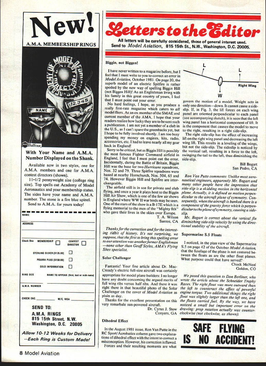 New 14 Available now two styles AMA members AMA contest directors shown 111/2 pennyweight size college ring size Top spells out Academy Model Aeronautics membership status sides have name AMA number stone fire blue spinel Send AMA yours today rnrnrn NAME ADDRESS Check MEMBERSHIP J Eli STERLING SILVER $13500C POLARA PLUS $15000C COLD INFORMATIONC RING SIZENAME TO APPEAR first lest nick-neme AMANUMBER CHECK ENC _____________ M/C VISA SEND TO AMA RINGS 815 15th Street NW Washington DC 20005 70-12 Weeks Delivery --Each Ring Custom Made Xetters theditr loners will carefully considered general interest used Send Model Aviation 815 15th St NW Washington DC 20005 Biggin Biggen have never written magazine before feel must write correct error Model viat ion October 1981 page 20 superb model electric Spitfire rather spoiled new way spelling Biggin Hill Biggen Hill As Englishman living family great country yours feel must point out error No hard feelings hope produce really first-rate magazine caters model fliers As ex-member SMAE current member AMA hope readers realize lucky sent such publication am yet member club US cant spare greenbacks yet hope fully involved shortly am too busy spending money engines kits radio accessories etc leave nearly gear back England Sorry critical Biggin Hill possibly famous Fighter Command airfield England feel must point out error Incidentally during Battle Britain Biggin Hill base two Hurricane squadrons Nos 32 79 Three Spitfire squadrons based nearby Hornchurch Nos 504 65 74 However Biggln Hill Spitfire inter changeable airfield still use private club flying once year plays host Biggin Hill Air Show few air shows England WW II war birds may seen stars show B-i 7E flying memorial men Mighty 8th gave lives skies over Europe T A Wilson Santee CA Thanks correction interest ing tidbit history Its surprising suppose first bring spelling error attention anotherformerEnglishman other Geoff Styles AMA s Flying Sites specialist Solar Challenger Fantastic fine article about Dr Mac Creadys electric full-size aircraft certainly appropriate model plane builders no longer have doubt concerning argued merits full wing ribs versus half ribs right beautiful photo Solar Challenger cover ModelAviation plain day Thanks excellent presentation very remarbale sun-powered aircraft Dr Cyrus J Stow Conyers GA Dihedral Effect August 1981 issue Ron Van Putte RC Sport/Aerobatics column gave two explana tions dihedral effect intent correct misconception However correction flawed Forces resulting moments what L Right Wing w govern motion model Weight acts directiondown cannot cause side slip Fig 3 lift forces wing panel oriented perpendicular panel see accompanying sketch seen left wing panel has horizontal component lift component causes model move right resulting right side-slip right side-slip has effect increasing lift right wing panel decreasing left wing lift results leveling wings side-slip sideslip noticed vertical tail resulting force left swinging tail left thus diminishing side-slip Bill Bogart San Pedro CA Ron Van Putte comments Unlike aero nautical engineers apparently Mr Bogart other people have impression side-slip skidding motion horizontal plane Actually defined motion perpen dicular aircraft plane symmetry Con sequently aircraft banked component ofthegravityforce isperpen dicularto theplane ofsymmetry causing side slip Mr Bogart correct about vertical fin diminishing side-slip velocity using direc tional stability aircraft Supermarine 55 Floats noticed plan view Supermarine S5 page 42 October Model Aviation fuselage plane centered tween floats other float planes What purpose could have served Chuck McNeal Golden CO posed question Don Berliner wrote article about Schneider Trophy Races right float outward left counteract effect powerful engine torque Two additional things right float slightly larger left floats carried fuel way have noticed small important error drawing prop rotation actually counter clockwise clockwise shown SAFE FLYING IS NO ACCIDENT 8 Model Aviation Name AMA Number Displayed Shank
