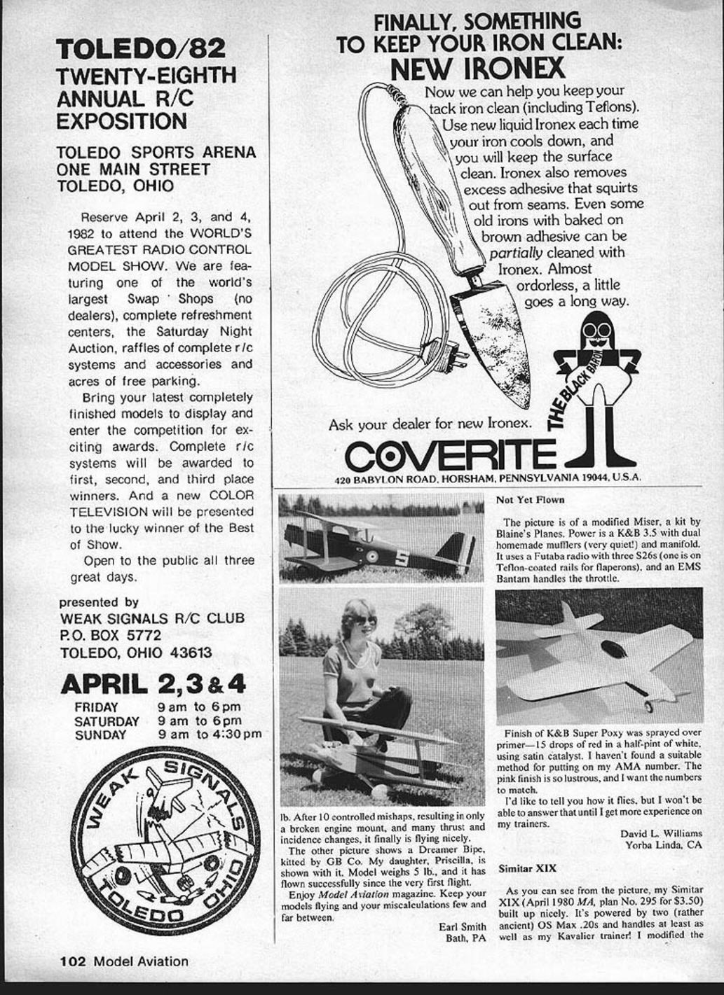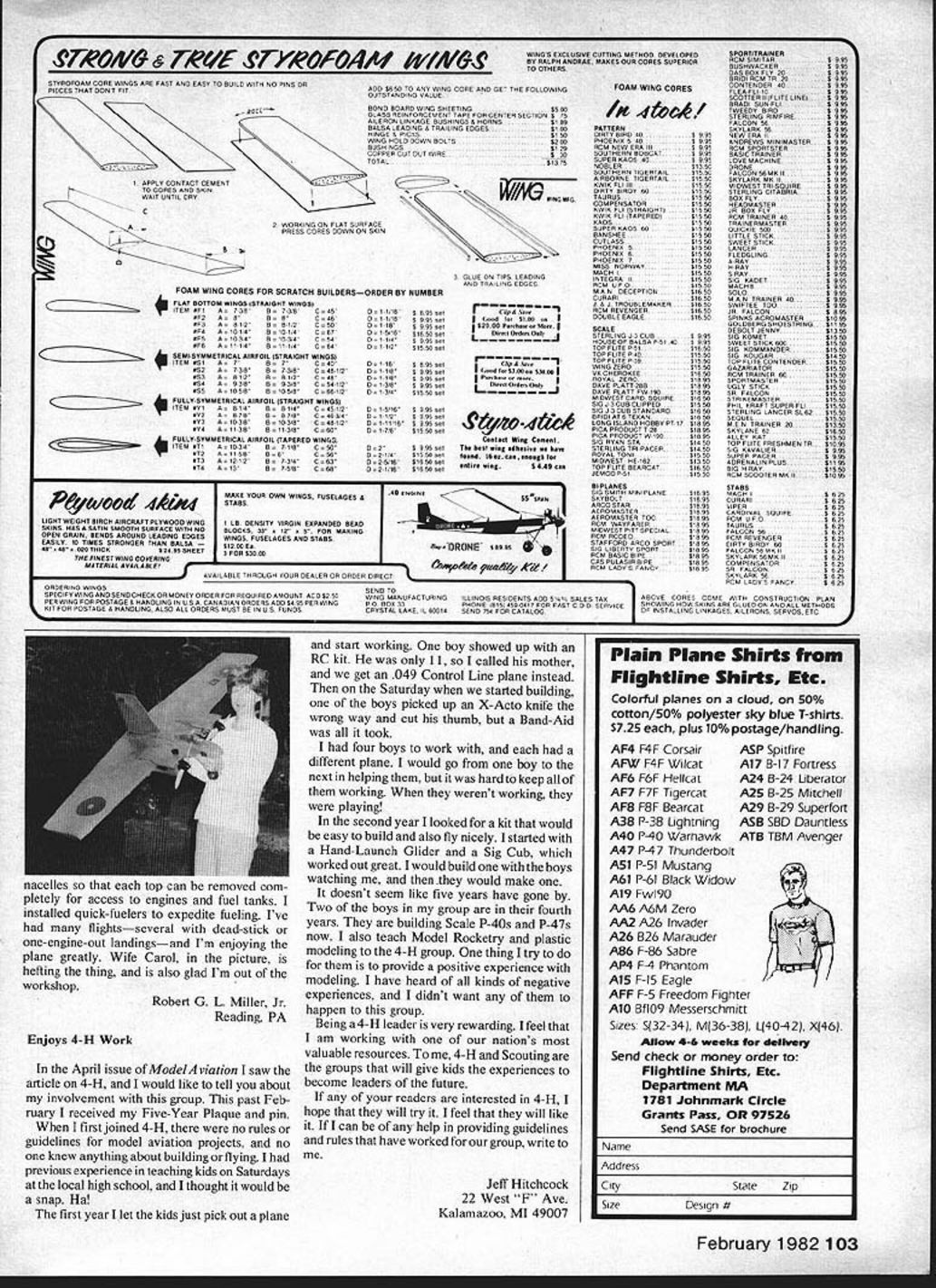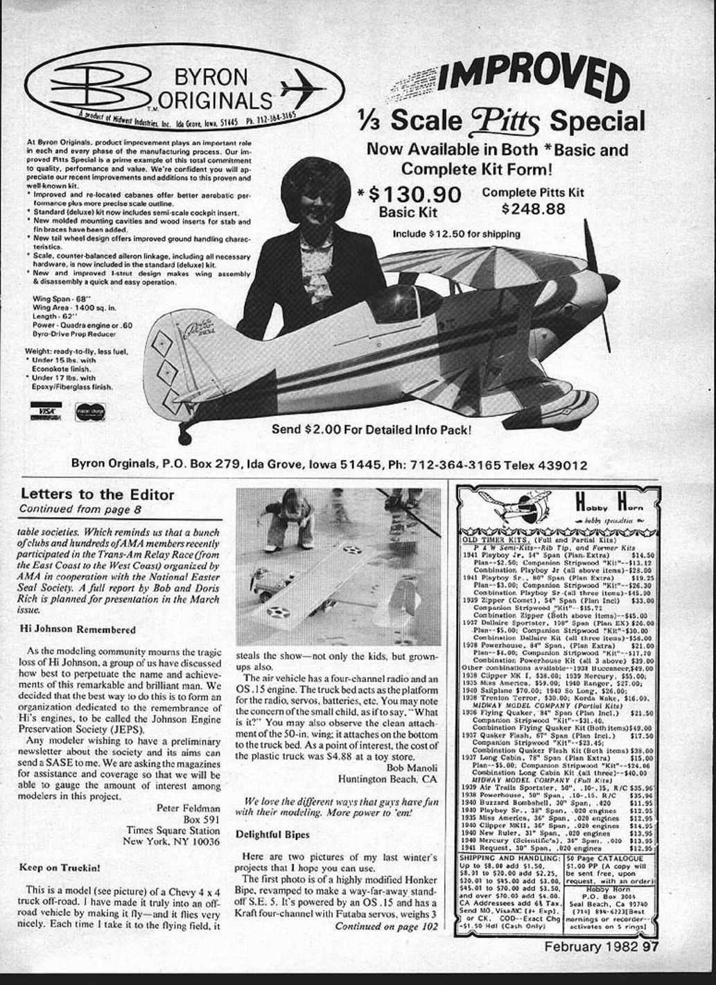 P1w o S shown no necessa p 01 completed kits P47 Military Scale $180 INCLUDES Top Flight P-47 kit Rhom retracts Aerosport 6 channel radio 5 servos Fox Eagle 60 engine J-3 CUB Quarter Scale $227 SUPER KAOS Fast & Fun $185 7a INCLUDES Bridi Super Kaos kit Proline 5 channel radio 4 servos OX Max 60 engine $205 Rhom retracts items shown plus HUNDREDS ot others individually offered sale recent issues Hobby Swap News fhe model en thusiasts 'Used Equipment Guide' BuySell-Trade first ad free 50 words max subscription $10/yr 10 issues $19/2yr $21/3yr Add $3/yr 1st class mail Canada & Mexico must use 1st class rates other countries write first MC & Visa Accepted include numbers expiration date Expect 4 8 weeks delivery 1st issue address changes Submit free ad B&W photo $2 extra subscription orders Hobby Swap News Dept AR-3 PO Box 834 Santa Maria CA 93456 LOWERING THE COST OF HAVING FUN INCLUDESBud Nosen 1/4 scale J-3 Cub kit Kraft 4 channel radio rvos Duadra engine mount & props $212 Super Hustler engine Zetters t d letters will carefully considered general interest used Send Model Aviation 815 15th St. NW Washington DC 20006 Authors Additional Advice Santos-Dumont 14-bis After rereading Santos-Dumont 14-bis article December issue thought few additional comments could hetpfut readers intend build model rigging instructions failed mention neutral canard forward stabitizer sur faces incidence angle shoutd set about t4 degrees means canard teading edge raised about l/a horizontat Since wing set 4 degrees provides 10 degrees angular difference close correct setting level flight CG shown plans pusher engine arrangement 14bis muffler engines can simpty turned around exhaust rearward through propeller done however lot oil cot lects prop flung off onto rear portion both wings makes quite mess avoid problem exhaust should ducted down along rear landing gear strut outside propeller arc two simple ways to use Tatone exhaust manifold muffler kind three optional exhaust tubes Use downward-pointed tube add length neoprene tubing carry exhaust clear prop using OS engine did prototype standard OS muffler easily can modified exhaust downward shown sketch First remove rear section muffler body Plug normal exhaust exit hole short piece dowel jammed Hot-Stuffed place Drill 5/1 6-in hole bottom rear muffler section force 1-in length 5/16-in OD brass tubing Seal tubing place bead silicone cement Now reassemble muffler engine muffler mounted model add length neoprene tubing extend new exhaust exit below propeller arc Don Srull McLean VA Thanks Don bringing helpful infor mation attention readers Scale Model Flight Realism ModelAviation official publication Academy Model Aeronautics As such articles expounding particular competi tive judging criteria bound accepted official Since current rule book carries no quantitative definition Flight Realism Mr Palumbos definition scale flight speed maneuvers three-part series True Dy namic Scaling Flyable RC Model Dominic J Palumbo August September October 1981 issues will accepted criteria forjudging Flight Realism Scale model competitions nce am certain number modelers agree leaves considerable group Scale modelers quan dasy official AMA definition Scale Realism apparently differs Joe Tschirgi Santa Ana CA As wrote Mr Tschirgz referenced articles should have no influence whatsoever Scale models judged competitions Competition rules interpretations established AMA Contest Boards based upon proposals made AMA members nouncements new rules interpretations printed Competition News section Its Pleasure Recently Academy Model Aeronautics has joined National Easter Seal Society sanction club-sponsored fund-raising events local Easter Seal Societies behalf Hartford Easter Seal Rehabil itation Center Connecticut Easter Seal Society would like take opportunity thank commend members Simsbury Model Airplane Club Wintonbury Flyers Northern Connecticut Radio Control Club dedication superb job done Fund Fly sponsored Easter Seals November work people organizations fund-raising rarely have opportunity interact positively such tremendous group individuals enthusiasm spirit very hard work raised close $300 benefit thousands disabled persons served Easter Seals all-day event three weeks lead time proud associated such fine group ofpeople feel readers should know would welcome chance work model airplane enthusiasts again future Susan Peters Gutner Hartford Easter Seal Rehabilitation Ctr Hartford CT Model clubs individual fliers can feel justtflably proud public service particlate various chari Continued page 97 8 Model Aviation Hardwood Dowel 41w El 5/16-in OD F-I Brass Tubing Li OS 15 Muffler Neoprene R Tubing ft Extension BYR~ #MORIGI NALS* 1/f3 IMPROVED odocfofftdOindo0 htt e Iowajt iU Special Scale Pitt Available Both * Basic Byron Originals productimprovement plays important role phase manufacturing process im proved Pitts Special prime example total commitment quality performance value confident will ap preciate recent improvements additions proven well-known kit Improved re-located cabanas offer better aerobatic per formance plus precise scale outline Standard Ideluxel kit now includes semi-scale cockpit insert New molded mounting cavities wood inserts stab fin braces have added New tail wheel design offers improved ground handling charac teristics Scale counter-balanced aileron linkage including necessary hardware now included standard Ideluxel kit New improved I-strut design makes wing assembly & disassembly quick easy operation Wing Span 68 Wing Area -1400 sq Length 62 Power Quadra engine 60 Byro-Drive Prop Reducer Weight ready-to-fly less fuel Under 1 5 lbs Econokote finish Under 17 lbs Epoxy/Fiberglass finish ws Byron Orginals PO Box 279 Ida Grove Iowa 51445 Ph 712-364-3165 Telex 439012 Letters Editor Continued page 8 table societies Which reminds us bunch clubs hundreds ofAMA members recently participated Trans-Am Relay Race East Coast West Coast organized AMA cooperation National Easter
