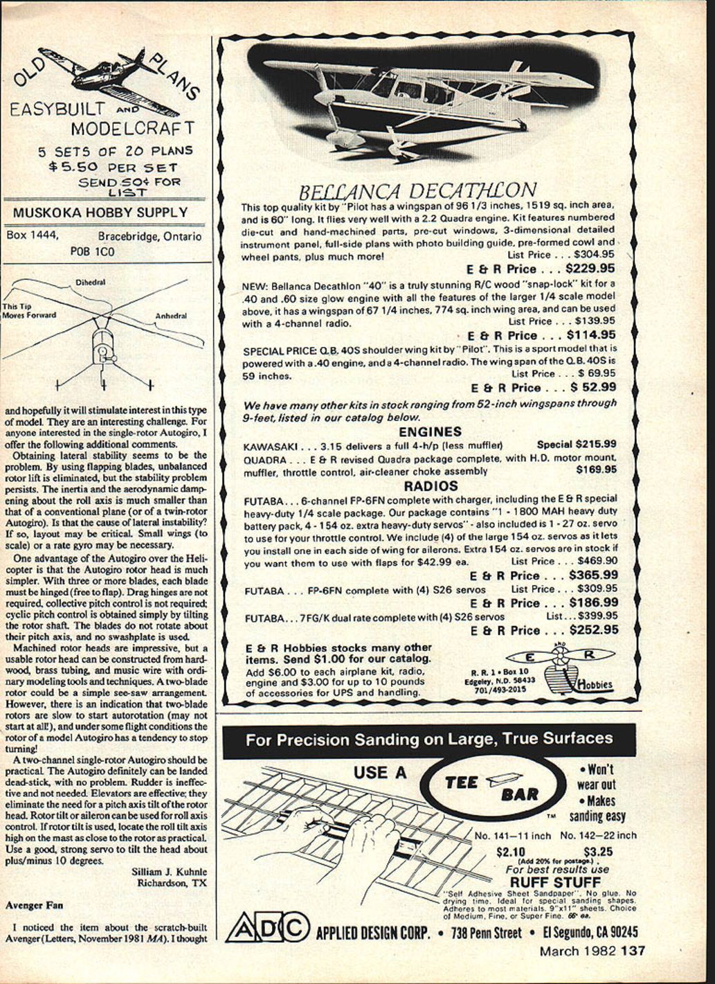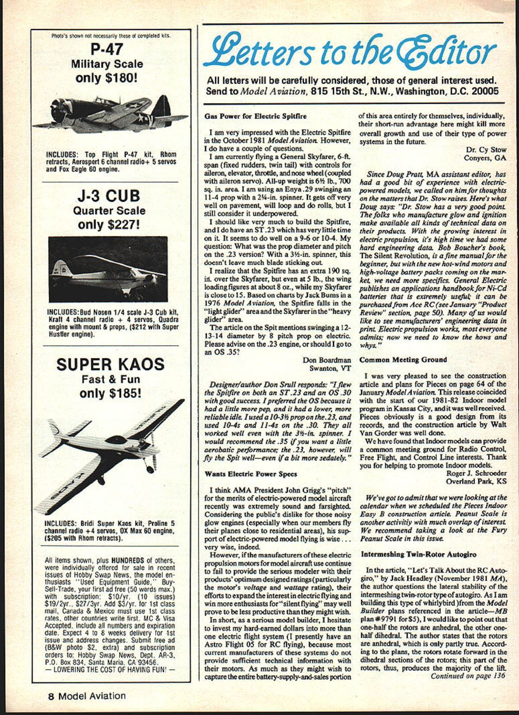 Pho s o shows no necessa p ot completed kits P47 Military Scale $180 INCLUDES Top Flight P-47 kit Rhom retracts Aerosport 6 channel radio 5 servos Fox Eagle 60 engine J-3 CUB Quarter Scale $227 INCLUDESDud Nosen 1/4 scale J-3 Cub kit Kraft 4 channel radio rvos Quadra engine mount & props $212 Super Hustler engine SUPER KAOS Fast & Fun $185 INCLUDES Bridi Super Kaos kit Proline 5 channel radio 4 servos OX Max 60 engine $205 Rhom retracts items shown plus HUNDREDS others individually offered sale recent issues Hobby Swap News model en thusiasts 'Used Equipment Guide BuySell-Trade first ad free 50 words max subscription $10/yr 10 issues $19/2yr $2713 yr Add $3/yr 1st class mail Canada & Mexico musf use 1st class rates other countries write firsf MC & Visa Accepted include numbers expiration date Expect 4 8 weeks delivery 1st issue address changes Submit free ad B&W photo $2 extra subscription orders Hobby Swap News Dept AR-3 PO Box 834 Santa Maria CA 93456 LOWERING THE COST OF HAVING FUN etters t$e ca7tcr letters will carefully considered general interest used Send ModelAviation 815 15th St NW Washington DC 20005 Gas Power Electric Spitfire am very impressed Electric Spitfire October 1981 ModelAviation However have couple questions am currently flying General Skyfarer 6-ft span fixed rudders twin tail controls aileron elevator throttle nose wheel coupled aileron servo All-up weight 6 lb 700 sq area amusing Enya 29 swinging 1-4 prop 2-in spinner gets off very well pavement will loop rolls still consider underpowered should like very much build Spitfire have ST 23 has very little time seems well 9-6 10-4 questiolt What prop diameter pitch 23 version 3k-in spinner doesnt leave much blade sticking out realize Spitfire has extra 190 sq iii over Skyfarer 5 lb wing loading figures about 8 oz Skyfarer close 15 Based charts Jack Bums 1976 Model Aviation Spitfire falls lightglider area andthe Skyfarer inthe heavy glider area article Spit mentions swinging 1213-14 diameter 8 pitch prop electric Please advise 23 engine should go OS 35 Don Boardman Swanton VT Designer/author Don Si-till responds flew Spitfire both ST23 OS30 good success Ipreferred OS because little pep lower reliable idle used 10-34propon the23 used 10-4s l1-4s 30 worked well 3-in spinner would recommend 35 want little aerobatic peiformance 23 however will fly Spit welleven bit sedately Wants Electric Power Specs think AMA President John Griggs pitch merits electric-powered model aircraft recently extremely sound farsighted Considering publics dislike noisy glow engines especially members fly planes close residential areas sup port electric-powered model flying wise. very wise indeed However manufacturers electric propulsion motors model alrcraft use continue fall provide serious modeler products optimum designed ratingsparticularly motors voltage wattage rating efforts expand interest electric flying win enthusiasts forsilent flying may well prove less productive might wish short serious model builder hesitate invest hard-earned dollars electric flight system presently have Astro Flight 05 RC flying because current manufacturers systems provide sufficient technical information motors As much might wish capture entire battery-supply-and-sales portion area entirely themselves individually short-nm advantage might kill overall growth use type power systems future Dr Cy Stow Conyers GA Since Doug Prat4 MA assistant editor has good bit experience electricpowered models called him thoughts matters Dr Stow raise Heres what Doug says Dr Stow has very good point folks manufacture glow ignition make available kinds technical data products growing interest electric propulsion its high time some hard engineering data Bob Bouchers book Silent Revolution fine manualfor beginner new hot-wind motors high-voltage battery packs coming mar kei need specifics General Electric publishes applications handbook Ni-Cd batteries extremely usefiik can purchased Ace RCsee January Product Review section page 50 us would like see manufacturers engineering data print Electric propulsion works everyone admits now need know hows whys Common Meeting Ground very pleased see construction article plans Pieces page 64 January ModelAviation release coincided start 1981-82 Indoor model program Kansas City well received Pieces obviously good design its records construction article Walt Van Gorder well done have found Indoor models can provide common meeting ground Radio Control Free Flight Control Line interests Thank helping promote Indoor models Roger J Schroeder Overland Park KS Weve got admit looking calendar scheduled Pieces Indoor Easy B construction article Peanut Scale another activitiy much overlap interest recommend taking look Fury Peanut Scale issue Intermeshing Twin-Rotor Autoglro article Lets Talk About RC Auto giro Jack Headiey November 1981 MA author questions lateral stability intermeshingtwin-rotor type autogiro As lam building type whirlybird Model Builder plans referenced articleMB plan *9791 for$5 would like point outthat one-half rotors anhedral other onehalf dihedral author states rotors anhedral partly true Accord ing plans rotors rotate forward dihedral sections rotors part rotors thus produces majority lift Continued page 136 8 Model Aviation IbinrdO PROPELLERS PO yeste bo color Go GRISH No 1 propeller True helical pitch airfoil win-power Sizes pitches styles needs AT YOUR DEALER 2 Blade Tractor 53each 545~364SOc 6364Mc 747678Mc 848688iCc 949697 98104106Mc 114116118 *1 1241251261hO 2 Blade Pusher 5 3 54 6364Mc 86Sc 96106*1 3 Blade Tractor 53 6364 ICc 3 Blade Pusher 63SOc Metallic Aluminum Color Tractor lh781 8h88*13 96 10604*150 Piither106*150 GRISH LARGE WOOD PROPELLERS HARDWOOD too hardr minimizes costly plane engine damage True pitch airfoil fully finished balanced ready coating 18$7 208 2210 2413 IN B & 10 PITCH 26 $16 v33][b263124003810820]] RIC SYSTEMS MINI R/C & SPORT ENGINES L.................JPROVIDE HIGH RPMS FOR TOP IU/CONTROL ENGINES PERF