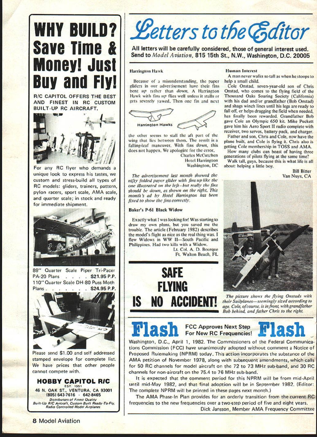 WHY BUILD Save Time & Money Just Buy Fly R/C CAPITOL OFFERS THE BEST AND FINEST IN RC CUSTOM BUILT-UP RC AIRCRAFT uN RC flyer demands unique look express tastes custom stress-build types RC models gliders trainers pattern pylon racers sport scale AMA scale quarter scale stock ready immediate shipment 89 Quarter Scale Piper Tn-Pacer PA-20 Plans 195 PP 110 Quarter Scale DH-80 Puss Moth Plans-$211 stamped envelope have prices cannot compete complete list other people HOBBY CAPITOL RIC EST 1951 46 N OAK ST VENTURA CA 93001 805643-7616642-8465 Distributors Fnest Ouality Built-Up R/C Aircraft Custom Bult Ready-To-Fly Radio Controlled Model Arplanes etters t6e a1tor letters will carefully considered general interest used Send ModelAviation 815 15th St NW Washington DC 20005 Harrington Hawk Because misunderstanding paper gliders advertisement have fins bent up rather down Harrington Hawk wish fins up flies well unlessit stalls gets severely yawed fin next HarrflgtOfl Hawks other seems stall aft part wing lies between result falling-leaf maneuver fins down does happen apologize error Charles MeCutchen Hotel Harrington Washington DC advertisement last month showed nifty folded paper glider fins up like illustrated leftbut realls fins should down shown right month s ad Hotel Harrington has fixed show fins correctly Bakers P-61 Black Widow Exactly what looking starting draw own plans saved trouble article February 1982 describes models flight nice real thing flew Widows WW IlSouth Pacific Philippines two kills Widow Lt Col D Bourque Ft Walton Beach FL SAFE FLYING IS NO ACCIDENT Human Interest man never walks tall stoops help small child Cole Onstad seven-year-old son Chris Onstad comes flying field Thousand Oaks Soaring Society Califomia dad and/or grandfather Bob Onstad shags winch lines until legs ready fall off helps dragging field needed has finally rewarded Grandfather Bob gave Cole Olympic 650 kit Mike Puckett gave him Aero Sport II radio complete receiver two servos battery pack charger Father son Chris Cole now have plane built Cole flying Chris also getting Cole membership TOSS AMA clubs can boast having three generations pilots flying same time Walk tall guys because what life about helping little boy Bill Bitter Van Nnvs CA FCC Approves Next Step Flash New RC Frequencies F las Washington DC April 1 1982 Commissioners Federal Communica tions Commission FCC have unanimously adopted comment Notice Proposed Rulemaking NPRM today action incorporates substance AMA petition November 1978 along subsequent amendments calls 50 RC channels model aircraft 72 73 MHz sub-band 30 RC channels non-aircraft 754 76 MHz sub-band expected comment period NPRM will mid-April until mid-May 1982 final adoption will September 1982 Editor complete NPRM will printed pages next month AMA Phase-In Plan provides orderly transition current RC frequencies new frequencies over two-step period five eight years Dick Jansson Member AMA Frequency Committee 8 Model Aviation picture shows flying Onstads Sailpianesseemingly sized according age Cole ofeourse front grandfat Bob behind father Chris right Please send $1 00 self addressed