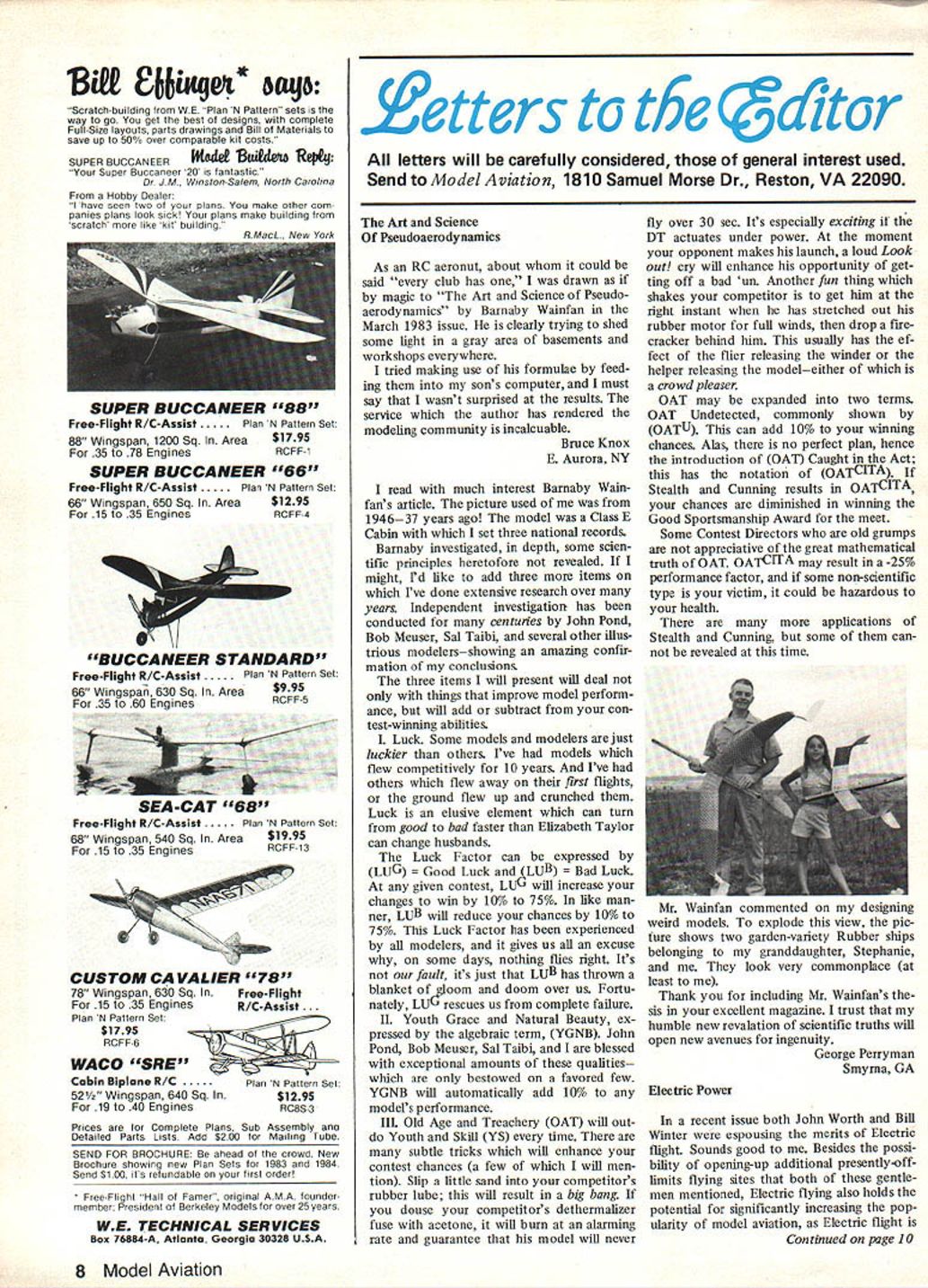 Btt CiKg& 8aJ6 Scratchbuilding WE Plan N Pattern sets way go get best designs complete Full-Size layouts parts drawings Bill Materials save up 500/0 over comparable kit costs SUPER BUCCANEER IK41 8uidei Re4 Super Buccaneer 20 fantastic Dr JM Winston-Salem North Carolina Hobby Dealer have seen two plans make other com panies plans look sick plans make building scratch like kit building SUPER BUCCANEER 88 FreeFlight R/CAssist n N Pattern Set 88 Wingspan 1200 Sq Area$1795 35 78 EnginesRCFF 1 SUPER BUCCANEER 66 Free-Flight R/CAssist Plan N Pattern Set 66 Wingspan 650 Sq Area$1295 15 35 EnginesRCFF-4 BUCCANEER STANDARD Free-Flight R/C-Assist Plan N Pattern Set 66 Wingspan 630 Sq Area 35 60 Engines RCFF-5 SEA -CAT 68 Free-Flight R/C-Assist Plan N Pattern Set 68 Wingspan 540 Sq Area$1995 15 35 EnginesRCFF-13 CUSTOM CAVALIER 78 78 Wingspan 630 Sq InFree-Flight 15 35 EnginesR/C-Assist Plan N Pattern Set $1795 WACO SRE Cabin Biplane R/C Plan N Pattern Set 52/2 Wingspan 640 Sq In $1295 19 40 Engines RC8S-3 Prices Complete Plans Sub Assembly ano Detailed Parts Lists Add $200 Mailing Tube SEND FOR BROCHURE ahead crowd New Brochure showing new Plan Sets 1983 1984 Send $100 its refundable first order Free-Flight Hall Famer original AMA tounder member President Berkeley Models over 25 years WE TECHNICAL SERVICES Box 76884-A Atlanta Georgia 30328 USA etters t6e &tcr letters will carefully considered general interest used Send Model Aviation 1810 Samuel Morse Dr Reston VA 22090 Art Science Pseudoserodynamics As RC aeronut about could said club has drawn magic Art Science Pseudoaerodynamics Barnaby Wainfan March 1983 issue clearly trying shed some light gray area basements workshops everywhere tried making use formulae feed ing sons computer must say wasnt surprised results service author has rendered modeling community incalcuable Bruce Knox E Aurora NY read much interest Barnaby Wain fans article picture used 194637 years ago model Class E Cabin set three national records Barnaby investigated depth some scien tific principles heretofore revealed might Id like add three items Ive done extensive research over years Independent investigation has conducted centuries John Pond Bob Meuser Sal Taibi several other illus trious modelersshowing amazing confir mation conclusions three items will present will deal things improve model perform ance will add subtract con test-winning abilities Luck Some models modelers just luckier others Ive models flew competitively 10 years Ive others flew sway first flights ground flew up crunched Luck elusive element can turn good bad faster Elizabeth Taylor can change husbands Luck Factor can expressed LUG Luck LUB Luck given contest L wlll increase changes win 10% 75% like man ner LUB will reduce chances 10% 75% Luck Factor has experienced modelers gives us excuse some days nothing flies right Its fault its just LUB has thrown blanket oom doom over us Fortu nstely LU rescues us complete failure II Youth Grace Natural Beauty ex pressed algebraic term YGNB John Pond Bob Meuser Sal Taibi blessed exceptional amounts qualities bestowed favored few YGNB will automatically add 10% models performance IlL Old Age Treachery OAT will out Youth Skill YS time subtle tricks will enhance contest chances few will men tion Slip little sand competitors rubber lube will result big bang douse competitors dethermalizer fuse acetone will burn alarming rate guarantee model will never fly over 30 sec Its especially exciting DT actuates under power moment opponent makes launch loud Look out cry will enhance opportunity get ting off bad un Another fun thing shakes competitor get him right instant has stretched out rubber motor full winds drop fire cracker behind him usually has ef fect flier releasing winder helper releasing modeleither crowd pleaser OAT may expanded two terms OAT Undetected commonly shown OATU can add 10% winning chances Alas no perfect plan hence introduction OAT Caught Act has notation OATCITA Stealth Cunning results OATCITA chances diminished winning Good Sportsmanship Award meet Some Contest Directors old grumps appreciative great mathematical truth OAT OATCITA may result a-25% performance factor some non-scientific type victim could hazardous health applications Stealth Cunning some can revealed time Mr Wainfan commented designing weird models explode view pic ture shows two garden-variety Rubber ships belonging granddaughter Stephanie look very commonplace least Thank including Mr Wainfans thesic excellent magazine trust humble new revalation scientific truths will open new avenues ingenuity George Perryman Smyma GA Electric Power recent issue both John Worth Bill Winter espousing merits Electric flight Sounds good Besides possi billty opening-up additional presently-offlimits flying sites both gentle men mentioned Electric flying also holds potential significantly increasing pop ularity model aviation Electric flight Continued page 10 8 Model Aviation Save Over 50% Complete Modelers Assortment Fasteners Kits Come 18 Compartment Heavy Duty Industrial Organizer HSA-735 ALLOY STEEL SOCKET HEAD CAP SCREWS CONTENTS LISTPCS 2-SN316 SOCKET HEAD CAP SCREW25 256I H SOCKET HEAD CAP SCREW25 2-561 2 SOCKET HEAD CAP SCREW25 4-401 4 SOCKET HEAD CAP SCREW25 44Sf 2 SOCKET HEAD CAP SCREW20 4-403 H SOCKET HEAD CAP SCREW20 4-401 SOCKET HEAD CAP SCREW20 6-3214 SOCKET HEAD CAP SCREWIS 6-32I 2 SOCKET HEAD CAP SCREW15 6-3234 SOCKET HEAD CAP SCREWiS 6-32x SOCKET HEAD CAP SCREW15 6321 SOCKET HEAD CAP SCREW15 6-322 SOCKET HEAD CAP SCREW15 FLAT WASHERS SAE ZINC PLATED NYLON INSERT LOCK NUTS ZINC PLATED 256 4-45 632 75 65 HO 75 65 95 TOTAL PCS 735 Only $2495 much likely occur populated areas will viewable potential modelers though model aviation growing am convinced could would grow much faster general population knew modeling exposed Electric flight possible more-popu lated areas capable providing know ledge exposure Unfortunately magazines including Model Aviation have little way Elec tric articles guide