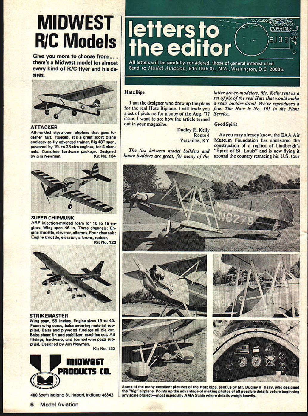 MIDWEST RIC Models Give choose . theres Midwest model almost kind R/C flyer de sires ATTACKER All-molded styrofoam airplane goes gather fast Rugged its great sport plane easy-to-fly advanced trainer Big 48 span powered 19- 35-size engines 4 chan nels Complete hardware package Designed Jim NewmanKit No 134 STR IKEMASTE R Wing span 55 inches Engine sizes 19 40 Foam wing cores balsa covering material sup plied Balsa plywood fuselage die cut Balsa sheet fin stabilizer machine cut fittings hardware formed wire patis sup plied Designed Jim Newman Kit No 130 am designer drew up plans real Hatz Biplane will trade set pictures copy Aug 77 issue want see article turned out magazine Dudley R Kelly Route 4 Versailles KY Good Spirit As may already know EAA Air Museum Foundation has sponsored construction replica Lindberghs Spirit St Louis now flying around country retracing US tour q j 400 South Indiana St Hobart Indiana 46342 Some excellent pictures Hatz bipe sent us Mr Dudley R Kelly designed big airplane Points up advantage making photos possible details before beginning scale projectmost especially AMA Scale details weigh heavily 6 Model Aviation Hatz Bipelatter ex-modelers Mr Kelly sent us set ofpix real Hatz would make scale builder drool Weve reproduced few Hatz No 195 Plans Service ties between model builders home builders great SUPER CHIPMUNK ARF injection-molded foam 10 19 en gines Wing span 46 Three channels En gine throttle elevator ailerons Four channels Engine throttle elevator ailerons rudder IitNn 1R observance fiftieth anniversary flights Im enclosing brochure explains June 1977 issue magazine appeared two page spread draw ings Spirit far accurate drawings have ever seen airplane intend include full-size planes offered sale would like obtain print original assume larger scale would make valuable addition plans library George Hardie Jr Aircraft & Display Research EAA Air Museum Foundation Hales Corner WI Mr Hardie has already received requested drawings Same-size prints scale drawings done Robinson Wil son others part Berliner article series have offered sale MA curious f readers would bene fit having prints availablethe originals vary twice three times size drawings see maga zine Feeling Good dont ordinarily write letters sort want let know much Ive enjoyed appreciate ex cellent coverage Model viation recent major FF events such USFF Champs FF events Nats FF World Championships narrative photo coverages really first-rate thanks outstanding quality reportage events also want express appreciation fine plans variety FF plans offered Model Aviation Now could have payload ship simple competition A/l about Tad pole oY Grabber going big guns out things would really rounded out good shape Again thanks overall fine Fox Fuel Line Models Life Blood Passes Through Simple Piece Fuel Line Surely Want Best As engine manufacturers acutely aware large portion called engine problems reality fuel line problems Symptoms fuel line trouble going lean air leaks speed fluctuations inability get rich enough high speed restricted flow Fox Fuel Lines best materials available physical proper ties selected model use Fox Fuel Lines worlds finest Tuff Line Silicone far strongest market semitransparent shows bubbles line heat resis tant Like silicone tubing tends slip off fittings unless care taken Neoprene Actually complex compound much elastic clings fittings main disadvan tage transparent Surgical Tubing Pure Rubber Very flexible Use sharp bends necessary Semi-transparent Shows bubbles line Holds fittings well Main disadvantage tends deteriorate rapidly silicone neoprene Plastic good anybodys dont think much plastic fuel line Advantage low price transparency Disadvantage tends collapse bends hardens age heat Tends leak air fittings after ITEMFUEL LINEPRICEITEMFUEL UNEPUCE 86880Small Neoprene2Pleg.5086885Small Clear Plastic2 Pkg 6881 Medium Neoprene2 PIg.6088886 Medium Clear Plautic2 Plrg.30 86882 Large Neoprene2 Pkg7086887 Large Clear Plastic2 PIrg.40 86883 Small Tuff Line1 Pkg . 5586888 Small Sargical Tubing2 Plrg.50 86884 Medium Tuft Lice1 Ptrg7086889 Med Surgical Tubing2 Pkg.50 86851 Large Tuft Line1 Ptcg10086890 Large Surgical Tubing2 Pkg.60 FOX MANUFACTURING Fox Model Airplane Products 5305 Towson Smith Arkansas 72901 e 501-646-1656 Answer 1o-Channel Dilemma NIMBUS 2-channel radio system offers American engineering import prices Features include. 1 Solid state superheterodyne 2 All silicon transistor receiver circuit highly selective front end 3 RF amplifier maximum signal noise ratio unexcelled selectivity 4 2 ultra small EK SM servos greater 4 pounds output thrust 5 Receiver servos equipped 3 pin Deans gold plated plugs 6 Adjustable tension control sticks full line brochure write EK-PRODUCTS INC 3322 Stovall St Irving Texas 75061 USA Distributors dealers contact us new merchandising program @1977 EK-Prodcrs Inc 779 EK-Products . . uary 1978 7 Continued page 86 SPECIAL PRO SERIES 2 FOR RC-FREE FLIGHT CONTROL LINE CIAPITCHPRICE 5%3489 63489 733%4119 53%456129 94566% 77%139 10467149 1066V 8W149 to6016159 114677% 7Y, 7%8159 it6E1W169 11%67169 126179 12555179 1356219 1496249 1566309 164%6389 W 55106 BLADE 855 EXTRA WIDE SERIES 400 B Poe SPEED & RACING ADVANCED DESIGN NO 1 IN PYLON RACING LEADING SPEED REGGRO HOLDER OF ALL TIMES RC PYLON RACING DIA PITCHPRICE 6%3%4129 755%6149 7SN 5/N 6N149 8%6% 6% 7 7%7%189 96%7 7A7%189 CONTROL LINE SPEED& RACING CIA PITCHPRICE 4/8A7129 4%55%129 6788%149 7 7%10%11169 889189 89N9%N189 8% 77%189 912 13219 51ARRflW Homebuilts Bill Youmans firstplace win Masters Class Greenville NRCHA Nationals last August seems increasing interest homebuilt helicopters won scratchbuilt own design composite components Bill came within 10 points aceing hover course local flier Norm Holland has developed scratchbuilt using Kavan mechanics tn-cycle landing gear Rev-o-lution canopy Futaba Sl5M ball-bearing servos EK single-stick radio Kraft engine Tach-Tron gover nor weight 12 1/2 pounds very smooth p