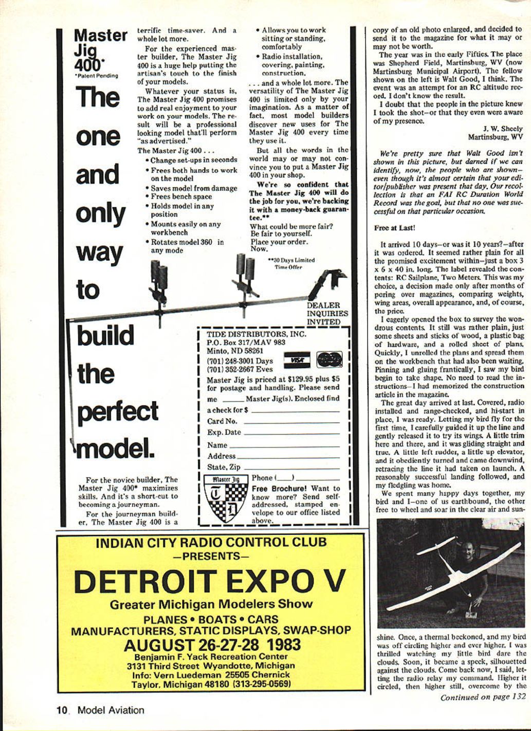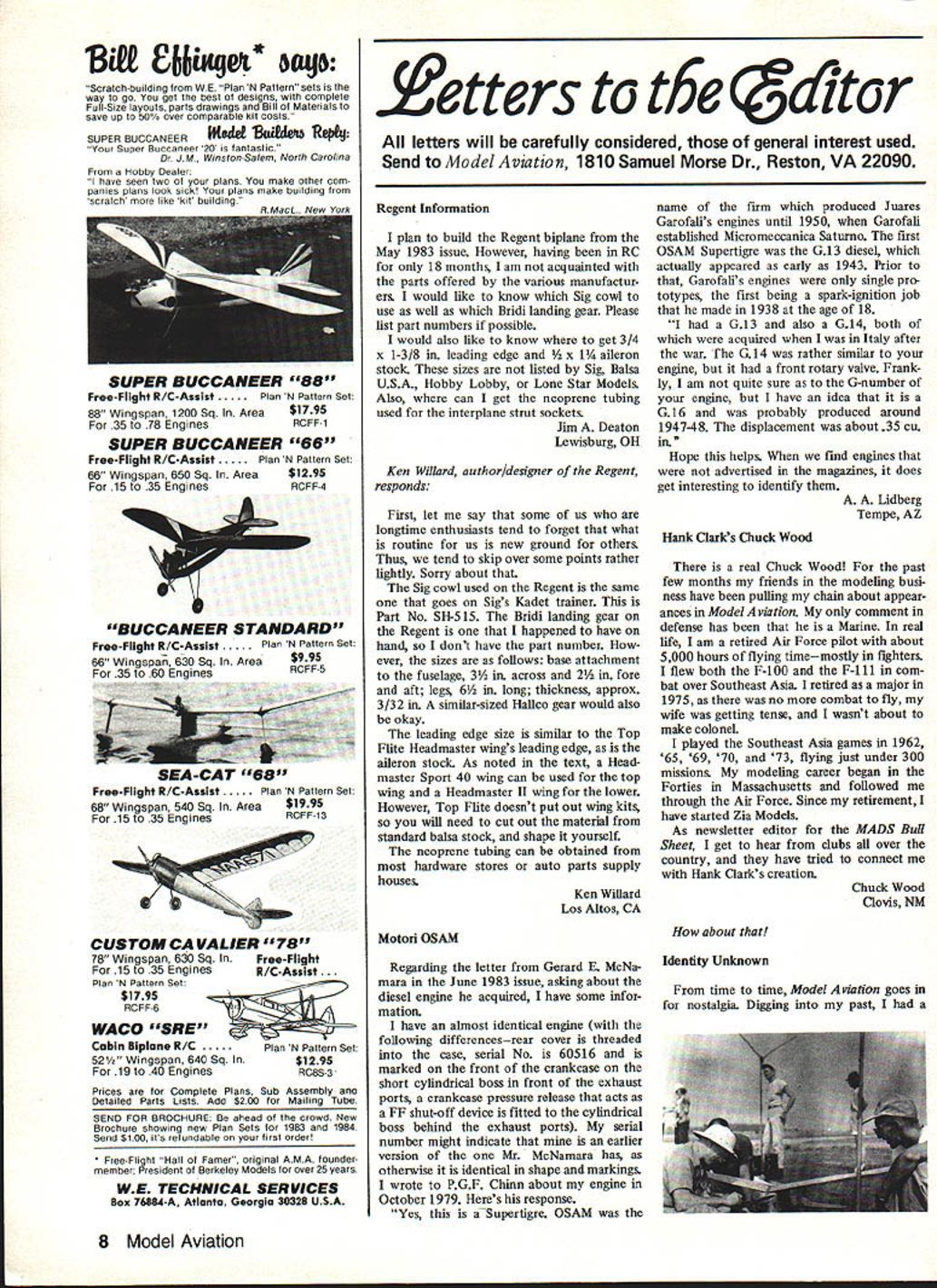 Bz 66IN90I 6cUJO Scratch-building WE Plan N Pattern sets way go get best designs complete Full-Size layouts parts drawings Bill Materials save up 5O/ over comparable kit costs SUPER BUCCANEER &&18 Re$4J Super Buccaneer 20 fantastic Dr JM Winston-Salem North Carolina Hobby Dealer have seen two plans make other com panies plans look sickl plans make building scratch like kit building SUPER BUCCANEER 88 Free-Flight RIC Assist Plan N Pattern Set 88 Wingspan 1200 Sq Area $17 95 35 78 Engines RCFF 1 SUPER BUCCANEER 66 Free-Flight R/C-Assist Plan N Pattern Set 66 Wingspan 650 Sq Area$1295 15 35 Engines RCFF-4 BUCCANEER STANDARD Free-Flight R/AsistPlan N Pattern Set 66Sq Area$995 FoitesRCFF5 SEA-CAT 68 Free-Flight R/C-Assist Plan N Pattern Set 68 Wingspan 540 Sq fn Area$1995 15 35 Engines RCFF-13 CUSTOM CA VALIER 78 78 Wingspan 630 Sq fn Free-Flight 15 35 Engines R/C-Assist . Plan N Pattern Set $1795 RCFF 6 WACO SRE Cabin Biplane R/CPlan N Pattern Set 52hz Wingspan 640 Sq In $1295 19 40 Engines RC8S-3 Prices Complete Plans Sub Assembly ano Detailed Parts Lists Add $200 Mailing Tube SEND FOR BROCHURE ahead crowd New Brochure showing new Plan Sets 1983 1984 Send $100 its refundable first order etters t6e a1tcr letters will carefully considered general interest used Send Model Aviation 1810 Samuel Morse Dr Reston VA 22090 Regent Information plan build Regent biplane May 1983 issue However having RC 18 months am acquainted parts offered various manufactur ers would like know Sig cowl use well Bridi landing gear Please list part numbers possible would also like know get 3/4 x 1-3/8 leading edge /z x 1 aileron stock sizes listed Sig Balsa USA Hobby Lobby Lone Star Models Also can get neoprene tubing used interplane strut sockets Jim Deaton Lewisburg OH Ken Willard author/designer Regent responds First let say some us longtime enthusiasts tend forget what routine us new ground others Thus tend skip over some points rather lightly Sorry about Sig cowl used Regent same goes Sigs Kadet trainer Part No SH-5 15 Bridi landing gear Regent happened have hand dont have part number ever sizes follows base attachment fuselage 3Y2 across 2 fore aft legs 6 long thickness approx 3/32 similar-sized Hailco gear would also okay leading edge size similar Top Flite Headmaster wings leading edge aileron stock As noted text Head master Sport 40 wing can used top wing Headmaster II wing lower However Top Flite doesnt put out wing kits will need cut out material standard balsa stock shape yourself neoprene tubing can obtained hardware stores auto parts supply houses name firm produced Juares Garofalis engines until 1950 Garofali established Micromeccanica Saturno first OSAM Supertigre G1 3 diesel actually appeared early 1943 Prior Garofalis engines single pro totypes first being spark-ignition job made 1938 age 18 G13 also G14 both acquired Italy after war [he G 14 rather similar engine front rotary valve Frank ly am quite sure G-number engine have idea G 16 probably produced around 194748 displacement about 35 cu Hope helps find engines advertised magazines does get interesting identify A A Lidberg Tempe AZ Hank Clarks Chuck Wood real Chuck Wood past few months friends modeling busi ness have puffing chain about appear ances Model Aviation comment defense has Marine real life am retired Air Force pilot about 5000 hours flying timemostly fighters flew both F-100 F-ill com bat over Southeast Asia retired major 1975 no combat fly wife getting ten wasnt about make coloneL played Southeast Asia games 1962 65 69 70 73 flying just under 300 missions modeling career began Forties Massachusetts followed through Air Force Since retirement have started Zia Models As newsletter editor MADS Bull Sheet get hear clubs over country have tried connect Hank Clarks creation Ken Willard Los Altos CA Motori OSAM Regarding letter Gerard E McNa mars June 1983 issue asking about diesel engine acquired have some infor mation have almost identical engine following differencesrear cover threaded case serial No 60516 marked front crankcase short cylindrical boss front exhaust ports crankcase pressure release acts FF shut-off device fitted cylindrical boss behind exhaust ports serial number might indicate earlier version Mr McNamara has otherwise identical shape markings wrote PGF Chinn about engine October 1979 Heres response Yes aSupertigre OSAM Chuck Wood Clovis NM about Identity Unknown time time Model Aviation goes nostalgia Digging past 8 Model Aviation Free-Flight Hall Famer original AMA foundermember President Berkeley Models over 25 years WE TECHNICAL SERVICES Box 76884-A Atlanta Georgia 30328 USA Master Ji q 400* Patent Pending terrific time-saver whole lot experienced mas ter builder Master Jig 400 huge help putting artisans touch finish models Whatever status Master Jig 400 promises add real enjoyment work models re sult will professional 0looking model thatll perform Ileas advertised Master Jig 400. Change set-ups seconds Frees both hands work model Saves model damage Frees bench space Holds model position Mounts easily workbench Rotates model 360 mode Allows work sitting standing comfortably Radio installation covering painting construction . and whole lot versatility Master Jig 400 limited imagination As matter fact model builders discover new uses Master Jig 400 time use words world may may con vince put Master Jig 400 shop confident Master Jig 400 will job backing money-back guaran tee** What could fair fair yourself Place order Now 3O Days Limited Time Otter toft ~ DEALER INQUIRIES build perfect model novice builder Master Jig 400* maximizes skills its short-cut becoming journeyman journeyman build er Master Jig 400 INVITED 1 TIDE DISTRIBUTORS INC P 0 Box 317/MAV 983 Minto ND 58261 I 701 248-3001 Days Z 352-2667 Eves Master Jig priced $12995 plus age handling Please send ______ Master Jigs Enclosed find acheckfor$ Card No ________________________ Exp Date _______________________ Name Address State Zip Iuiasrrr~ Phone ____ I7TFree Broc
