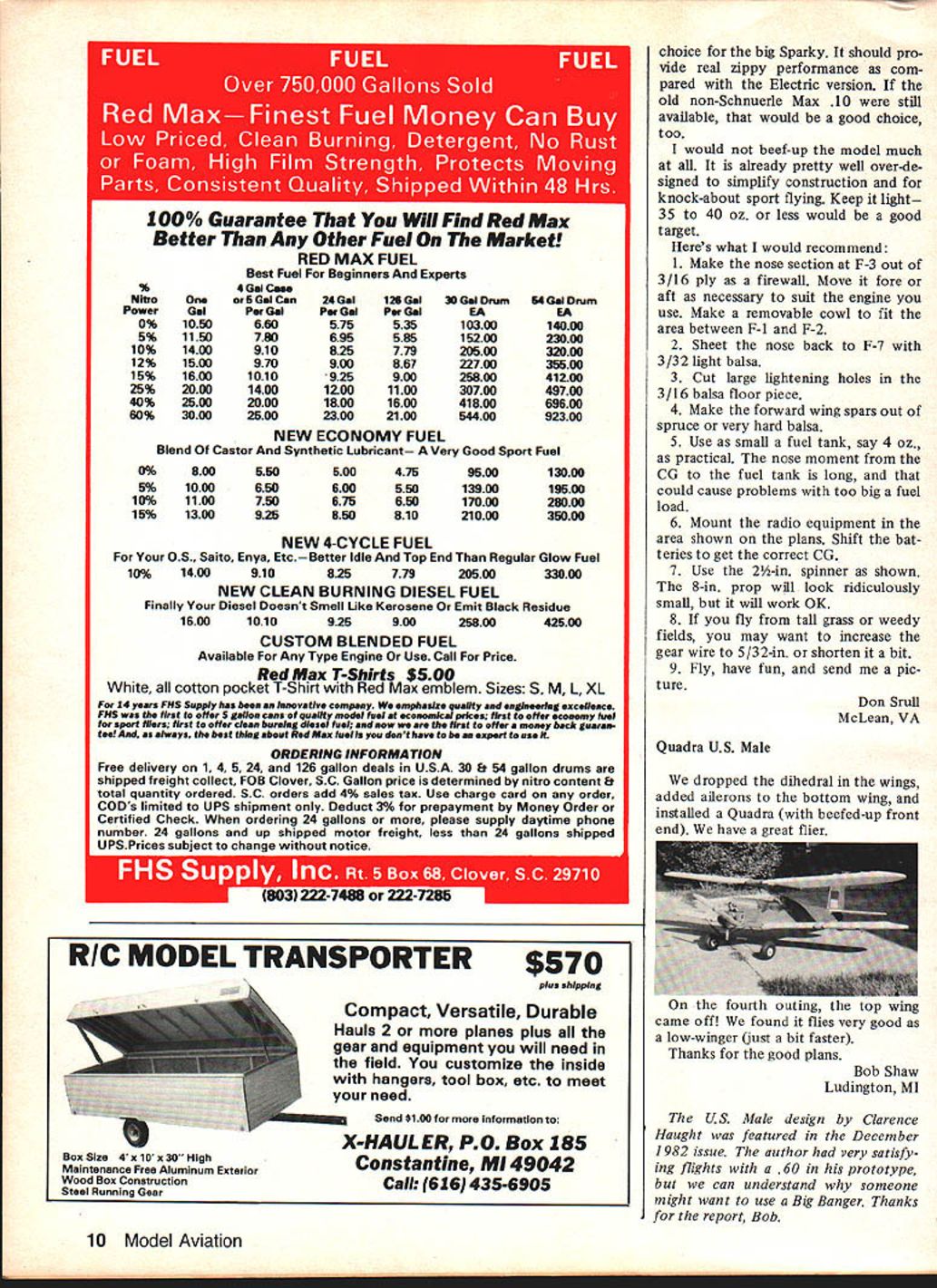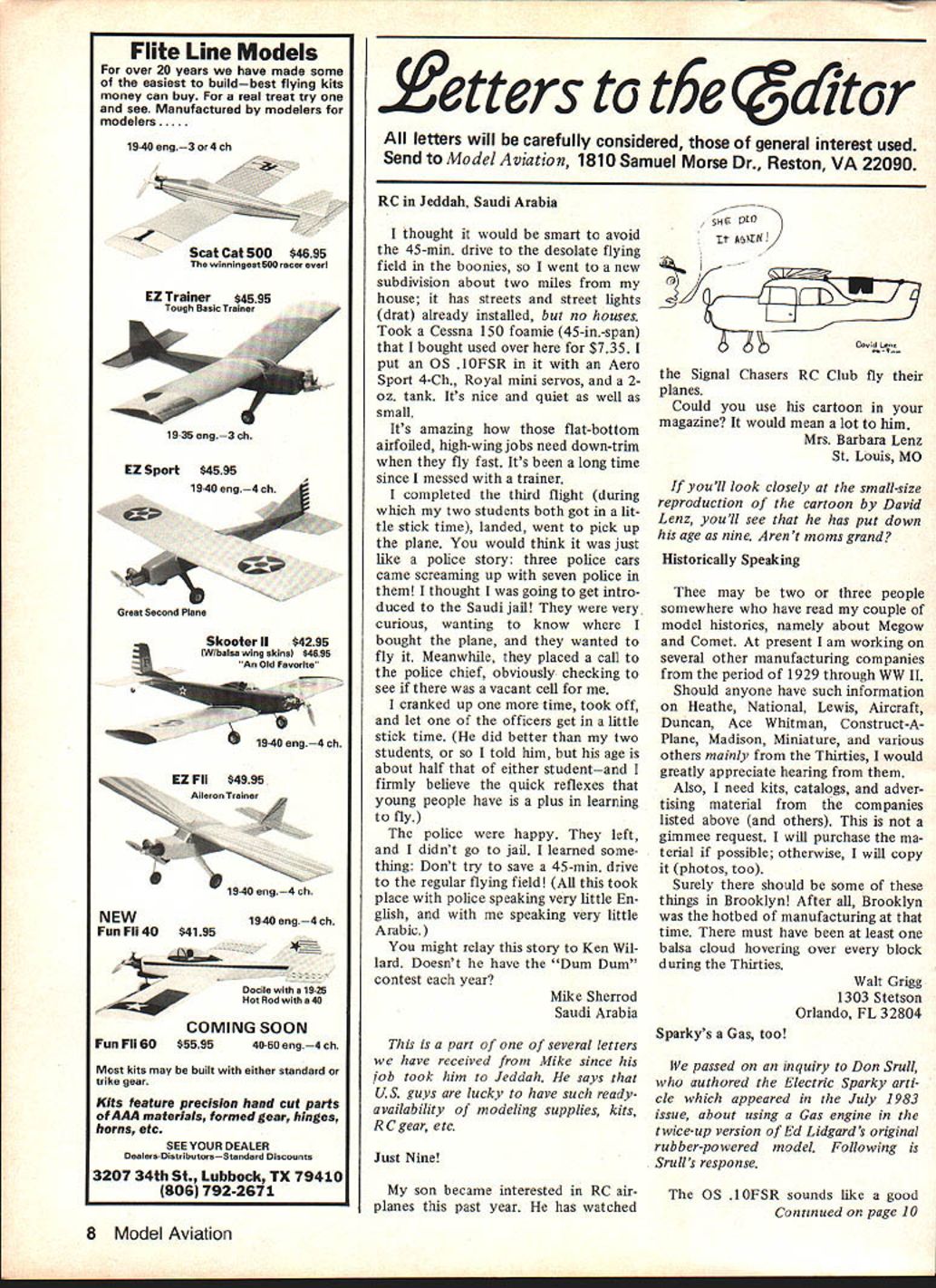 Flite Line Models over 20 years have made some easiest buildbest flying kits money can buy real treat try see Manufactured modelers modelers 19-40 eng3 4 ch Scat Cat 500 $4895 winningeat 500 racer Greet Second Plane %K Fli $4995 Aileron Trainer 19-40 eng 4 ch NEW Fun FIi 40 $4195 19-40 eng4 ch Docile 19-25 Hot Rod 40 COMING SOON Fun Fli 60$559540-60 eng4 ch Most kits may built either standard tnike gear Kits feature precision hand cut parts AAA materials formed gear hinges horns etc SEE YOUR DEALER Dealers-DistributorsStandard Discounts 3207 34th St Lubbock TX 79410 806 792-2671 etters t6e a1tcr letters wilt carefully considered general interest used Send Model Aviation 1810 Samuel Morse Dr Reston VA 22090 RC Jeddah Saudi Arabia thought would smart avoid 45-mm drive desolate flying field boonies went new subdivision about two miles house has streets street lights drat already installed no houses Took Cessna 1 50 foamie 45-in-sp bought used over $735 put OS lOFSR Aero Sport 4-Ch Royal mini servos 2oz tank Its nice quiet well small Its amazing flat-bottom airfoiled high-wing jobs need down-trim fly fast Its long time since messed trainer completed third flight during two students both got lit tle stick time landed went pick up plane would think just like police story three police cars came screaming up seven police thought going get intro duced Saudi jail very curious wanting know bought plane wanted fly Meanwhile placed call police chief obviously checking see vacant cell cranked up time took off let officers get little stick time did better two students told him age about half either studentand firmly believe quick reflexes young people have plus learning fly police happy left didnt go jail learned some thing Dont try save 45-min drive regular flying field took place police speaking very little En glish speaking very little Arabic might relay story Ken Wil lard Doesnt have Dum Dum contest year Mike Sherrod Saudi Arabia part several letters have received Mike since job took him Jeddah says US guys lucky have such readyavailability modeling supplies kits RCgear etc Just Nine son became interested RC air planes past year has watched sHy pU AtNJ Signal Chasers RC Club fly planes Could use cartoon magazine would mean lot him Mrs Barbara Lenz St Louis MO youll look closely small-size reproduction cartoon David Lenz youll see has put down age nine Arent moms grand Historically Speaking Thee may two three people somewhere have read couple model histories namely about Megow Comet present am working several other manufacturing companies period 1929 through WW II Should anyone have such information Heathe National Lewis Aircraft Duncan Ace Whitman Construct-APlane Madison Miniature various others mainly Thirties would greatly appreciate hearing Also need kits catalogs adver tising material companies listed above others gimmee request will purchase ma terial possible otherwise will copy photos too Surely should some things Brooklyn After Brooklyn hotbed manufacturing time must have least balsa cloud hovering over block during Thirties Walt Grigg 1303 Stetson Orlando FL 32804 Sparkys Gas too passed inquiry Don Srull authored Electric Sparky arti cle appeared July 1983 issue about using Gas engine twice-up version Ed Lidgards original rubber-powered model Following Srulls response OS l0FSR sounds like good Continued page 10 8 Model Aviation EZ Sport $4595 19-40 eng 19-40eng4ch Nitro Power 0% 5% 10% 12% 15% 25% 40% 60% 100% Guarantee Will Find Red Max Better Any Other Fuel Market RED MAX FUEL Best Fuel Beginners Experts 461 Cane Onor5GalCan24Gall2SGal Gal Per GalPer GelPer Gal 1050 650575 535 1150 95585 1400 825 779 1500 900 867 1600 1010 925 900 2000 140012001100 2500 200018001600 3000 250023002100 30 Gal Drum EA 10300 15200 20500 22700 25800 30700 41800 54400 54 Gal Drum EA 14000 23000 32000 35500 41200 49700 69600 92300 NEW ECONOMY FUEL Blend Castor Synthetic Lubricant Very Good Sport Fuel 0%800550 5%1000650 10%1100750 15%1300925 5004759500 60055013900 67565017000 85081021000 13000 19500 28000 35000 NEW 4-CYCLE FUEL OS. Saito Enya EtcBetter Idle Top End Regular Glow Fuel 10%14009108257792050033000 NEW CLEAN BURNING DIESEL FUEL Finally Diesel Doesnt Smell Like Kerosene Emit Black Residue 160010109259002580042500 CUSTOM BLENDED FUEL Available Any Type Engine Use Call Price Red Max T-Shirts $500 White cotton pocket T-Shirt Red Max emblem Sizes S M L XL 14 years FitS Supply has lane vathe company emphasize quality engIneerIng excellence FitS first offer 5 gallon cans qualIty model fuel economIcal prices fAst offer economy fuel sport fliers fIrst offer clean burnIng diesel fuel now lAst offer money hack guarnn tee always best thIng about Red Max fuel dont have beau expert use ORDERING INFORMATION Free delivery 1 4 5 24 126 gallon deals USA 30 & 54 gallon drums shipped freight collect FOB Clover SC Gallon price determined nitro content & total quantity ordered SC orders add 4% sales tax Use charge card order CODs limited UPS shipment Deduct 3% prepayment Money Order Certified Check ordering 24 gallons please supply daytime phone number 24 gallons up shipped motor freight less 24 gallons shipped UPSPrices subject change notice choice big Sparky should pro vide real zippy performance com pared Electric version old non-Schnuerle Max 10 still available would good choice too would beef-up model much already pretty well over-de signed simplify construction knock-about sport flying Keep light 35 40 oz less would good target Heres what would recommend 1 Make nose section F-3 out 3/16 ply firewall Move fore aft necessary suit engine use Make removable cowl fit area between F-l F-2 2 Sheet nose back F-7 3/32 light balsa 3 Cut large lightening holes 3/16 balsa floor piece 4 Make forward wing spars out spruce very hard balsa 5 Use small fuel tank say 4 oz practical nose moment CG fuel tank long could cause problems too big fuel load 6 Mount radio equipment area shown plans Shift bat teries get correct CG 7 Use 2-in s