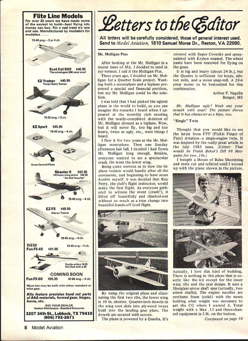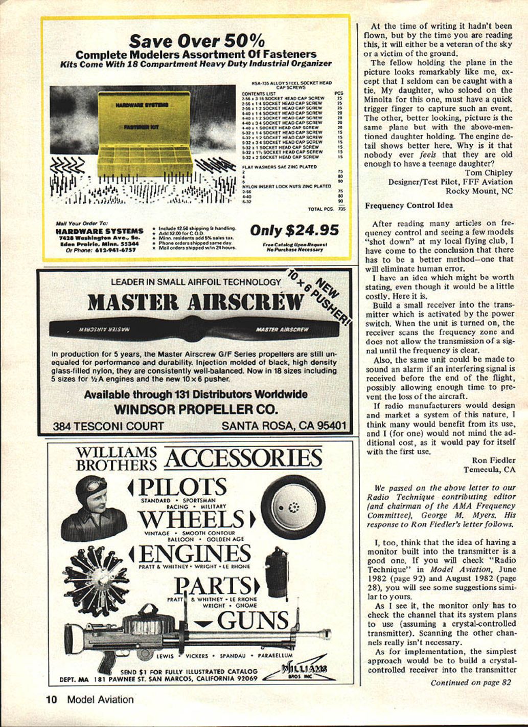 Flite Line Models over 20 years have made some easiest buildbest flying kits money can buy real treat try see Manufactured modelers modelers 19-4oeng3or4ch Scat Cat 500 $4695 winningest 500 racer everl Tough Basic Trainer EZTrainer $4595 19-35 eng z23 ch EZ Sport 4595 19-40 eng 4 ch Great Second Plane Skooter II$4295 An Old Favorite jjjnajsl795 19-40eng4ch EZ Fli$4995 Aileron Trainer i194O5flg4ch NEW Fun Fli 40 $4195 19-40 eng4 ch Docile 19-25 Hot Rod 40 COMING SOON Fun Fli 60$559540-60 eng4 ch Most kits may built either standard trike gear Kits feature precision hand cut parts AAA materials formed gear hinges horns etc SEE YOUR DEALER Dealers-DistributorsStandard Discounts 3207 34th St Lubbock TX 79410 806 792-2671 etters t6e dtcr letters will carefully considered general interest used Send ModelAviation 1810 Samuel Morse Dr Reston VA 22090 Mr Mulligan Plus After looking Mr Mulligan recent issue MA decided send version call Mulligan Plus Three years ago decided Mr Mul ligan Quarter Scale project Want ing both monoplane biplane pre sented spacial financial problem Mr Mulligan could solu tion told picked ugliest plane world build can imagine remarks heard ap peared monthly club meeting nearly-completed skeleton Mr Mulligan dressed biplane Wow will never fly too big too heavy twice ugly etc things heard flew two years Mr Mul ligan monoplane Sunday afternoon last fall decided flown Mr Mulligan long enough Besides everyone wanted see spectacular crash went lower wing Being quite nervous bi plane version would handle after comments beginning have some doubts myself decided Ray Perry clubs flight instructor would make first flight As everyone gath ered witness event crash lifted off beautifully climbed-out much trim change beautiful hands-off level flight using tne original plans ana elimi nating first two ribs lower wing 10 shorter Quarter-inch dowels wing root slide plywood boxes built landing gear plate dowels secured screws plane powered Quadra Its covered Super Coverite spraypainted Krylon enamel wheel pants have removed flying grass big heavy about 24 lb Quadra sufficient loops aile ron rolls mean snap-roll 20-6 prop seems best-suited combination Arthur P Nagelin Bangor ME Mr Mulligan ugly Wash out mouth soap picture shows has character bipe too Single Twin Thought would like see latest FFF Fickle Finger Fate Aviationa single-engine twin inspired really great article July 1983 issue Editor would Frank Bakers DH 98 Mos quito two lOs bought House Balsa Shoestring sorta cut refitted until wound up plane shown picture Actually love kind building nothing plane ex actly like kit except inner wing ribs spar design uses fiberglass arrow shaft spar actually two arrow shafts engine nacelles urethane foam solid noses holding what weight necessary get CG wanted Total weight Max 1 5 three-chan nel equipment 3 lb button Continued page 10 8 Model Aviation Save Over 50% Complete Modelers Assortment Fasteners Kits Come 18 Compartment Heavy Duty Industrial Organizer * Inclode $250 shipping ft handling * Add $205 COD * Minn residents add 5% sales tao * Phone orders shipped same day * Mail orders shipped wlin 24 horns HSA-735 ALLOY STEEL SOCKET HEAD CAP SCREWS CONTENTS LIST 2-56 a 316 SOCKET HEAD CAP SCREW 254 a 1 4 SOCKET HEAD CAP SCREW 2-56 I 2 SOCKET HEAD CAP SCREW 4-40 a SOCKET HEAD CAP SCREW 440 a 1 2 SOCKET HEAD CAP SCREW 4-40 a 34 SOCKET HEAD CAP SCREW 4-40 a 1 SOCKET HEAD CAP SCREW 6-32 a 1 4 SOCKET HEAD CAP SCREW 6-32 a 1 2 SOCKET HEAD CAP SCREW 4-32 a 34 SOCKET HEAD CAP SCREW 6-32 a 1 SOCKET HEAD CAP SCREW 6-32 a 1 SOCKET HEAD CAP SCREW 4-32 a 2 SOCKET HEAD CAP SCREW FLAT WASHERS SAE ZINC PLATED NYLON INSERT LOCK NUTS ZINC PLATED 2-56 4-40 6-32 PCS 25 25 25 20 20 20 20 15 15 5 IS 15 15 75 go 96 75 80 go TOTAL PCS 735 Only $2495 WILLIAMS ACCESSORIES BROTHERS 4 PILOTS STANDARD SPORTSMANAU RACING TARY WHEELS AGE SMOOTH CONTOUR BALLOON n GOLDEN AGE 4 ENGINES PRATT & WHITNEY HT LE RHONE time writing hadnt flown time reading will either veteran sky victim ground fellow holding plane picture looks remarkably like ex cept seldom can caught tie daughter soloed Minolta must have quick trigger finger capture such event other better looking picture same plane above-men tioned daughter holding engine de tail shows better nobody ever feels old enough have teenage daughter Tom Chipley Designer/Test Pilot FFF Aviation Rocky Mount NC Frequency Control Idea After reading articles fre quency control seeing few models shot down local flying club have come conclusion has better methodone will eliminate human error have idea might worth stating though would little costly Build small receiver trans mitter activated power switch unit turned receiver scans frequency zone does allow transmission sig nal until frequency clear Also same unit could made sound alarm interfering signal received before end flight possibly allowing enough time pre vent loss aircraft radio manufacturers would design market system nature think would benefit its use would mind ad ditional cost would pay itself first use Ron Fiedler Temecula CA passed above letter Radio Technique contributing editor chairman AMA Frequency Committee George M Myers response Ron Fiedlers letter follows too think idea having monitor built transmitter good will check Radio Technique Model Aviation June 1982 page 92 August 1982 page 28 will see some suggestions simi lar yours As see monitor has check channel its system plans use assuming crystal-controlled transmitter Scanning other chan nels really isnt necessary As implementation simplest approach would build crystalcontrolled receiver transmitter Continued page 82 10 Model Aviation pja aaa -& aOaao Order ARDWAEE SYSTEMS 425 Wushlmgtees Ave. 6. Edges PoinIrle MI. 55344 Phone 412941T57 Free Ctaleg Upee Reqeeet No Perches Necessary C DEPT MA lot rA PARTS T & WHITNEY HONE WRIGHT E LEWISVICKERS DAU PARABELLUM $1 FOR FULLY ILLUSTRATED CATALOG ST SAN MARCOS CALIFORNIA 92069 AL-TEC PROdUCTS INc INTRODUCES NEW BUILDING CONCEPT u