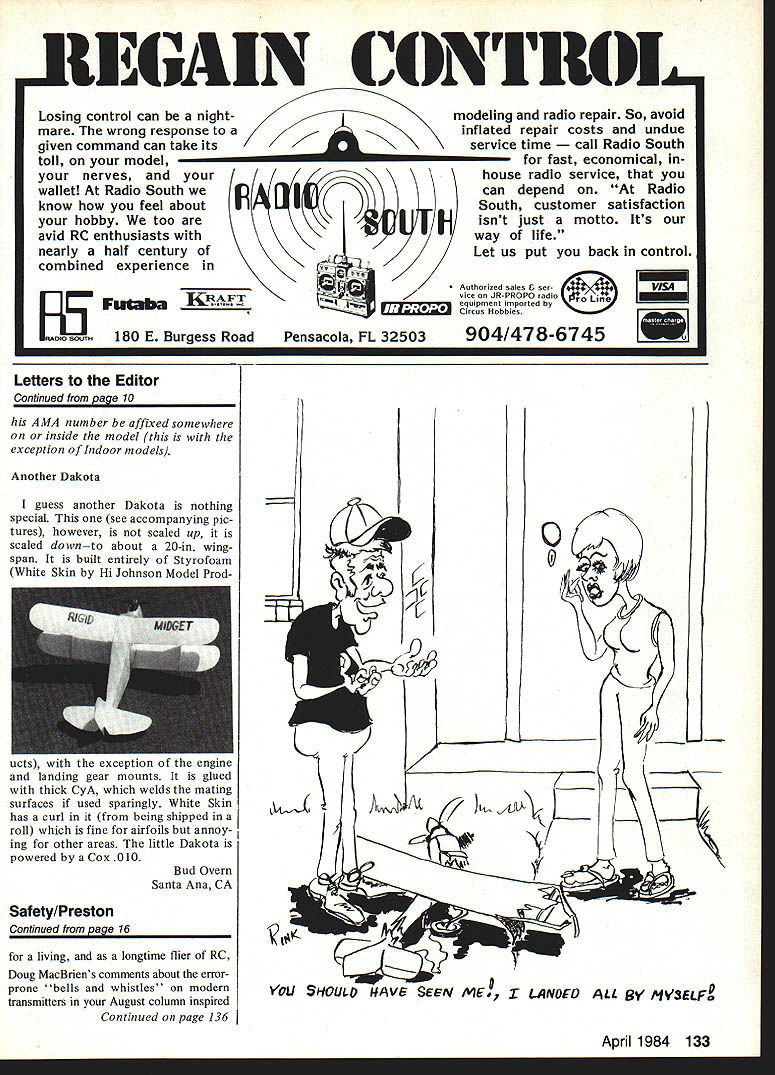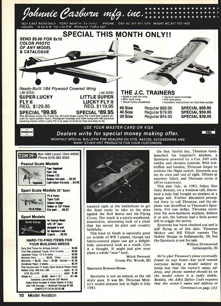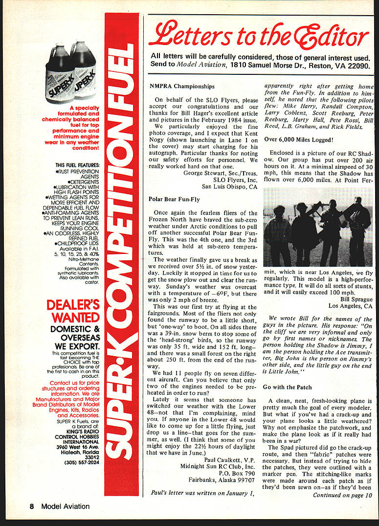 THIS RJEL FEATURE& ORUST PREVEN1ON AGENTS ODEFERGENTS OLUBRICAllON WITH HIGH FLASH POINTS OWEfliNG AGENTS FOR MORE EFFICIENT AND DEPENDABLE RJEL FLOW SANTI-FOAMING AGENTS TO PREVENT LEAN RUNS KEEPS YOUR ENGINE RUNNING COOL eAN ODORLESS HIGHLY REFINED RJEL CHILDPROOF LIDS Available FAd 5 10 15 25 & 40% NilTo-Methane Contents Formulated synthetic lubricants Also available castof DEALERS WAN1ED DOMESTIC & OVERSEAS WE EXPORT competition fuel fast becoming il-IE CHOICE top profesionals first cash product Contact us price structures ordering information Manufacturers Major Brand Distributors Model Engines Kits Radios Accessories SUPER K Fuels brand kINGS RADIO CONTROL HOB81ES INTERNATlOt4AI 3960 west 16 Ave Hialech Florida 33012 305 557-2024 etters t$e a1tcr letters will carefully considered general interest used Send Model Aviation 1810 Samuel Morse Dr Reston VA 22090 NMPRA Championships behalf SLO Flyers please accept congratulations thanks Bill Hagers excellent article pictures February 1984 issue particularly enjoyed fine photo coverage expect Kent Nogy shown launching Lane 1 cover may start charging autograph Particular thanks noting safety efforts personnel really worked hard George Stewart Sec/Treas SLO Flyers Inc San Luis Obispo CA Once again fearless fliers Frozen North have braved sub-zero weather under Arctic conditions pull off another successful Polar Bear FunFly 4th 3rd held sub-zero tempera tures weather finally gave us break received over 5 snow yester day Luckily stopped time us get snow plow out clear run way Sundays weather overcast temperature 60F 2 mph breeze first try flying fairgrounds Most fliers found runway little short one-way boot sides 39-in snow berm stop some head-strong birds runway 35 ft wide 152 ft long small forest right about 250 ft end run way 11 people fly seven differ ent aircraft Can believe two engines needed pre heated order run Lately seems someone has switched weather Lower 48not Im complaining mind anyone Lower 48 would like come up little flying just drop us linethat goes sum mer well think some might enjoy 22 hours 4aylight have June Paul Caulkett VP Midnight Sun RC Club Inc PO Box 790 Fairbanks Alaska 99707 apparently right after getting home Fun-Fly addition him self noted following pilots flew Mike Harry Randall Compton Larry Cob lenz Scott Reeburg Peter Reeburg Marty Hall Pete Rossi Bill Reed LB Graham Rick Fields Over 6000 Miles Logged Enclosed picture RC Shad ow Our group has put over 200 air hours minimal airspeed 30 mph means Shadow has flown over 6000 miles Point Fer mm wtucn ss near Los Angeles fly regularly model high-perfor mance type will sorts stunts will easily exceed 100 mph Bill Sprague Los Angeles CA wrote Bill names guys picture response cliff very informal go first names nicknames person holding Shadow Jimmy am person holding Ace transm ter Big John person Jimmys other side little guy end Little John Go Patch clean neat fresh-looking plane pretty much goal modeler what youve crack-up plane looks little weathered emphasize patchwork make plane look really war Spad pictured did go crack-up route fabric patches necessary instead trying hide patches outlined marker pen stitching-like marks made around patch theyd sewn onas theyd Continued page 10 8 Model Aviation specially formulated chemically balanced fuel tep performance minimum engine wear weather condition Polar Bear Fun-Fly Pauls letter written January 1 SEND $500 FOR 8x10 COLOR PHOTO OF ANY MODEL & CATALOGUE Ready-Built 1/64 Plywood Covered Wing 60 SIZE SUPER LUCKYLITTLE SUPER FLY II REG $12995 REG $11995 SPECIAL S9995SPECIAL 8995 60 Super Lucky Fly II 40 Little Super Lucky Fly II both superb air craft sport pattern flyers Prealigned fuselage foam wing 1/64 plywood coverina makes either Lucky Fly II easy build easy fly 10 Model Aviation SPECIAL THIS MONTH ONLY! 11 E JC TRAINERS Build half time Jig built balsa fuselage 90% built wing Full size plans Decal forms windshield Excellent instructions first time builder 60 Size 40 Size 20 Size repaired right battlefront get Spad ready take skies against Red Baron Flying Circus result nicely-weathered seasoned-in interesting look plane has served its pilot country faithfully kind finish especially great models WW planes though fabric-covered plane can get delight fully caricatured look result Give thought might just give plane whole new look Mitch Pieronek Grosse Pte Woods MI Sportavia Returns Home Sportavia animal old story goes Mr Thruman Mick eys model airplane lost flight July 1981 Regular $8995 Regular $7995 Regular $5495 SPECIAL $6995 SPECIAL $5995 SPECIAL $3995 fateful day Thruman handlaunched beginners airplane Sportavia powered Cox 049 rudder elevator controls terflies tension Thruman forgot activate flight switch Sportavia its own out sight Efforts recovery failed Thrum wrote off experience past July 1983 fellow flier Jerry Bunner business call discov ered lady bought airplane garage sale Further discussion promp ted Jerry call Thruman air plane identified Thrumans Spor tavia dollar Thruman recov ered now-heirloom airplane Believe battery little power left wiggle servos Sportavia has checked out still flying date Thruman Mickey Bill Elliott operate Hobby Hangar Indianapolis IN Sportavia sale William Drum mond Indianapolis IN glad Thrum ans plane eventually found its way homebut wed remind everyone having model subject being lost owners name ad dress phone number should model it easily visible Besides AMA Safety Code requires owners name address Continued page 133 U Snort Models Box 1063 Lorain Ohio 44055 e 216 282-8354 Peanut Scale Models Piper Vagabeed Stlazee 125 .. Guldeor kits 3495 ed LigW ledger kits each. 3495 Sport Scale Models 22 Span Tayler Craft RuMer er CO5 Pewer kits . 3695 An Embnye Medal triFle deseed te will let hegimrs ~s. 3695 HARD-TO-FIND ITEMS FOR YOUR BUILDING NEEDS Early Bed Tissue Antique Aircraft ISIS True Olde Japanese Tissue 10 3 colors . $135 Japanese Tissue 12 6 colors 3335 Microlite Plain5325 Sil
