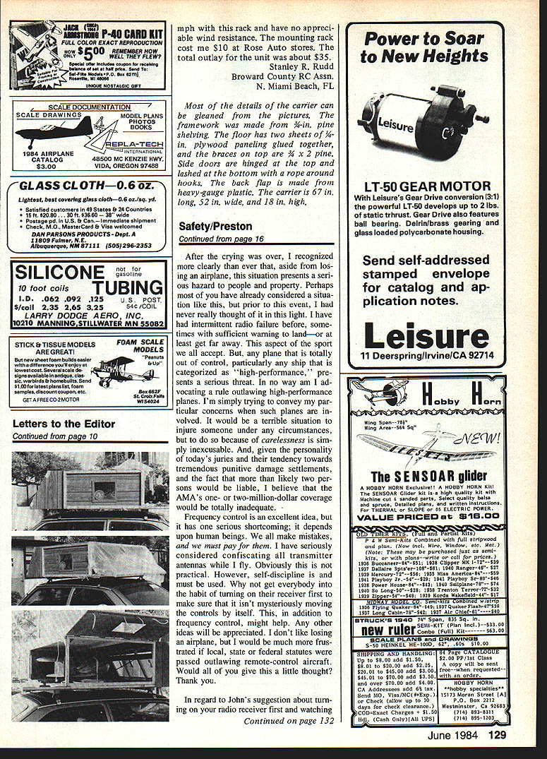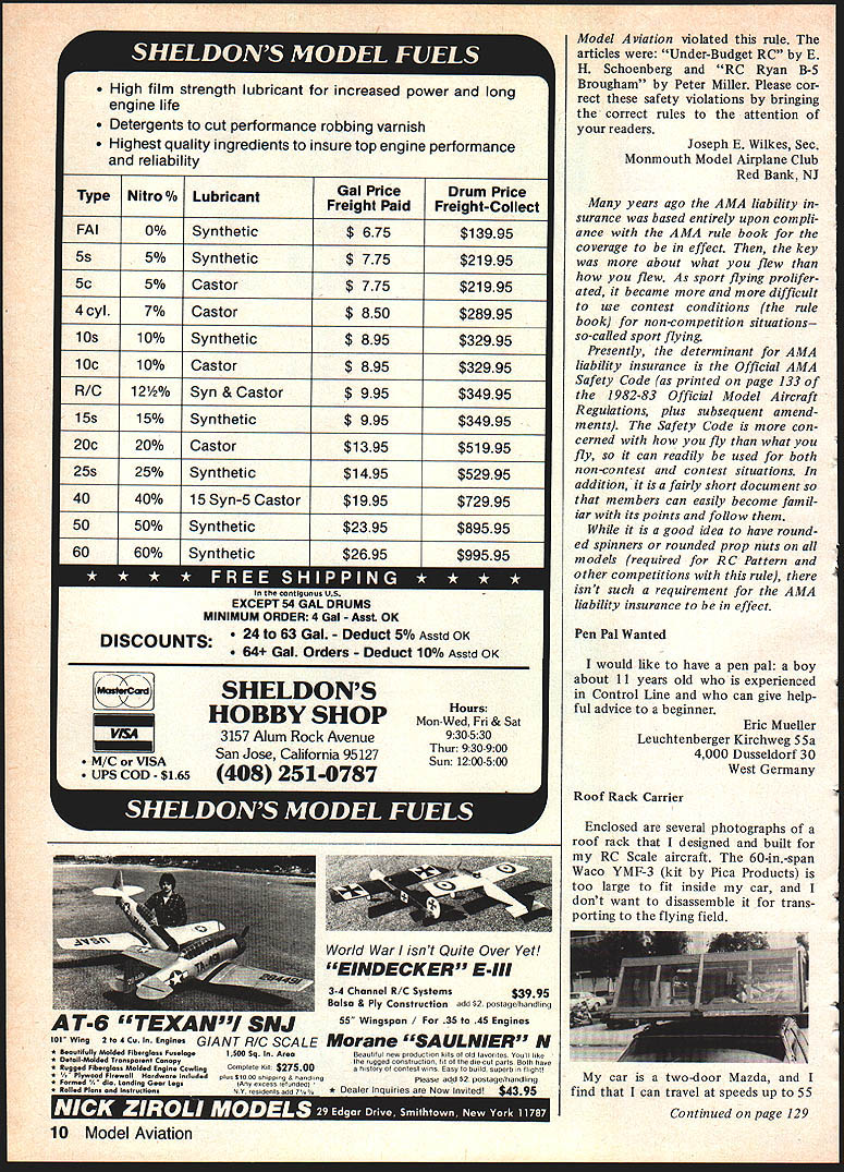 THE NEST IN CUSTOM DESIGNS *rIdWarI SE-SA Quarter Scale ftC Far 71 t 22 Engines S0A Wingspan Sq Inches Area Plan N Pattern Sot #RCQS-7 @ $2495 FOKKER TRIPLANE DR-I GIant lid Scale R/C Design E WW-l 71 150 Cu Engines 72 Wingspan Triplane Sq Area Plan N Pattern Set #RCQS-6 @ $2495 Best Duct Fans SKYRA Y F4D- Plan Form SKYRAY NAVY F4D-1 ale Ducted Fan NIC Rl-20 Fan Unit IongPlan Set RCDF-1 $1005 WACO SRE Cabin Biplane R/CPlan N Pattern Set 52/u Wingspan 640 Sq In$1295 19 40 EnginesRCSS3 Cant Forget stro-Hog . Now Mini Mighty Plan Size too NE Plan N Pattern Sets way - signs complete Full-Size Materials sane up Pattern Trainer Astro-Hog became classic PlC Pattern years ago now Otter Plan N Patters Drawings tor 54 larger version br todays Quadra sized powerplants Mini version too br smaller engines THE AS TRO-HOG 54 54 Wingspan 450 Sq In.19 Engines 15 35 Plan N Pattern Set ROT 1 $995 THE MIGHTY-HOG 94% WIng -1375 Sq In22 Engines 1 3 26 Plan N Pattern Set ROT 2 $2495 THE MINI-HOG 47i Wingspan 340 Sq 09 Engines 063 15 Plan N Pattern Set RCT3 $695 Prices Complete Plans Sub Assembly Detailed Parts Lists Add $2130 tor Mailing Tube SEND FOR BROCHURE ahead crowd New Brochure showing new Plan Sets 1983 1984 Send $100 its relundable first order1 getters t6e d7tor letturs will carefully considered general interest used Send Model Aviation 1810 Samuel Morse Dr Reston VA 22090 Watch Grain April issue has article cover ing model aircraft silk general its pretty good article does ever have extremely important omis sion well some inaccuracies omission article does state direction laying grain silk silk has grain same silkspan Like silkspan silk should laid down spanwise gram running length wing fuselage other rounded surface grain should go 90 degrees curve circle article said way get rid blushing additional coats model dope way have found clear blushing go over blush dope thinner Since blushing caused trapped moisture going over blush thinner softens finish moisture can escape method works 100% time add dope just se curely traps moisture text also said sand framework other balsa surfaces time after doping wood have found least three coats clear dope required followed sanding fine grit before wood knap stops rising give wood sur faces least two coats clear dope usually until whole structure has shiny surface applying silk airplane treat just like silkspan use clear dope adhesive reapplying necessary until stays moist long enough lay down stretch wet covering material excep tion putting wet covering material undercambered wing being covered bottom side trying find grain silk have look side panel will find narrow dense part called selvedge sel vedge runs direction grain cant find selvedge show silk wife girl friend know fabrics go aunt mother grandmother rest article pretty good old-timer like myself date back stick-andtissue models Comet Megow Cleveland Clevland still kitting airplanes fore WW II Craig M Mecum Philadelphia PA Craig certainly has good point about grain direction think its en tirely possible cover wing panels grain direction chord doing will induce much sagging tween open ribs rigidity span direction will reduced havent encountered problem experience covering bottom undercambered wing wet silk safeguard bottom always covered first However never favored pulling silk taut wet whatever tightness can obtained wet silk over predoped dry edges adequate method adhereing silk brush clear dope wet silk atop framework small area time lightly rub moist dope through silk pores finger same procedure used wing top well undercamber undercamber covering applied first also apply thin strip dope top side rib/silk juncture both sides rib further assurance adhesion silk continually rewet ted during process doesnt begin shrink before adhesion dope has become sufficiently dry withstand stress Blushing best avoidance think dope high-humidity days high-humidity areas such basement other trick learned pull thread silk point silk cut covering panel pulled thread identifies line silk can cut fonn perfect rectangle important aid applying silk perfectly straight threads both directions Did ever try covering silk check erboard print Fun Prop Nuts recent board meeting board Monmouth Model Airplane Club New Jersey asked write letter editor about following safety issue AMA safety code Section 39 RC Pattern Rules 65 states planes must have rounded prop spinners blunt faced hubs such no propel ler shaft protrudes Rounded devices shall have radius point less 3mm Two articles in the April 1984 issue Continued page 10 8 Model Aviation WE Technical Services PO Box 7884A Atlanta Georgia 30328 High film strength lubricant increased power long engine life Detergents cut performance robbing varnish Highest quality ingredients insure top engine performance reliability Gal Price Drum Price TypeNitro %LubricantFreight PaidFreight-Collect FAI0%Synthetic $ 675 95 Ss5%Synthetic $ 775 95 Sc5%Castor $ 775 95 4cyl7%Castor $ 850 95 lOs10%Synthetic $ 895 95 lOc10%Castor $ 895 95 R/C12%Syn & Castor $ 995 95 iSs15%Synthetic $ 995 95 20c20%Castor 5 95 25s25%Synthetic 5 95 4040%isSyn-SCastor 5 95 5050%Synthetic 5 95 6060%Synthetic 5 95 coattgueus US EXCEPT 54 GAL DRUMS MINIMUM ORDER 4 Gal AssL OK DISCOUNTS 24 63 Gal Deduct 5% Asstd OK 64 Gal Orders Deduct 10o/c Asstd OK SHELDONS Hours HOBBY SHOP Mon Wed Fri & Sat 3157 Alum Rock Avenue930530 San Jose California 95127 Thur 9 30-900 M/C VISASun 1200-500 UPS COD-$165408 251-0787 World War isnt Quite Over Yet EINDECKER E-III 34 Channel RIC Systems$3995 Balsa Construction add $2 postage/handliog 5MI 55 Wingspan / 35 45 Engines 101 Wing 2toACo tn Engines GIANT R/C SCALE Morane SAULNIER N * Enutifally Molded Fiberglass Fuselage1800 Sq AreaBeau U new p oduc k sot o 0 tacO leo YouRe * DeSail-Molded Transparent Canopythe rugged cOest Oct ot thea ecu pa S Bo 0 have C Roggad Fiberglass Molded Engine Cowling Coerplete Kt $27500a hslo p 01 coo est C Oh Easy ho Id nope h Ill qht * Plywood Fleawall Hardsnae inolodadpl