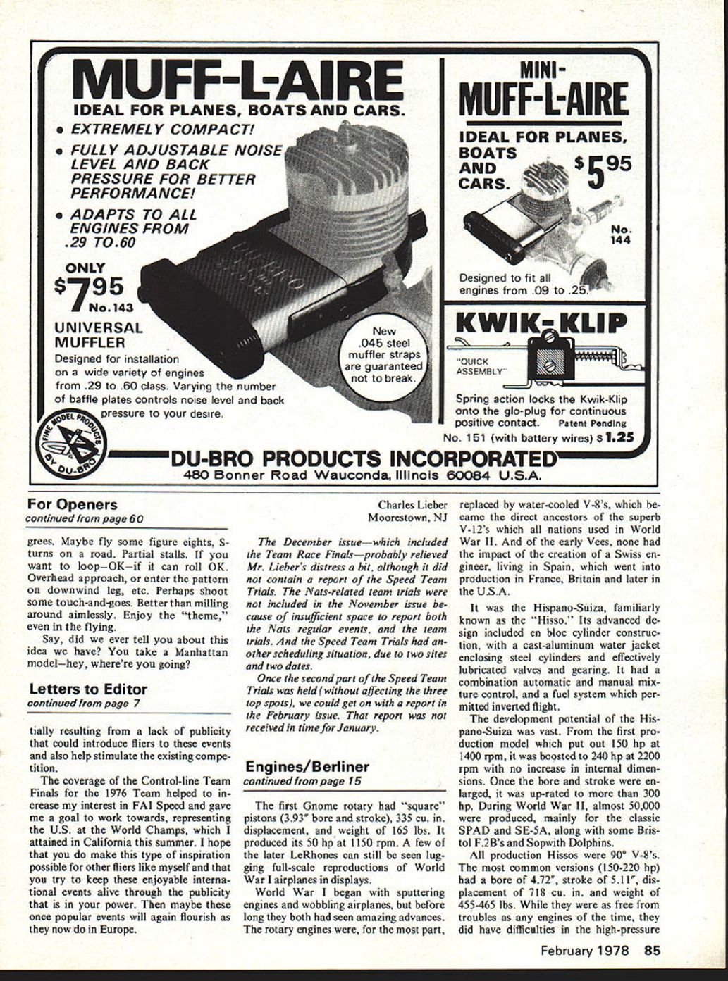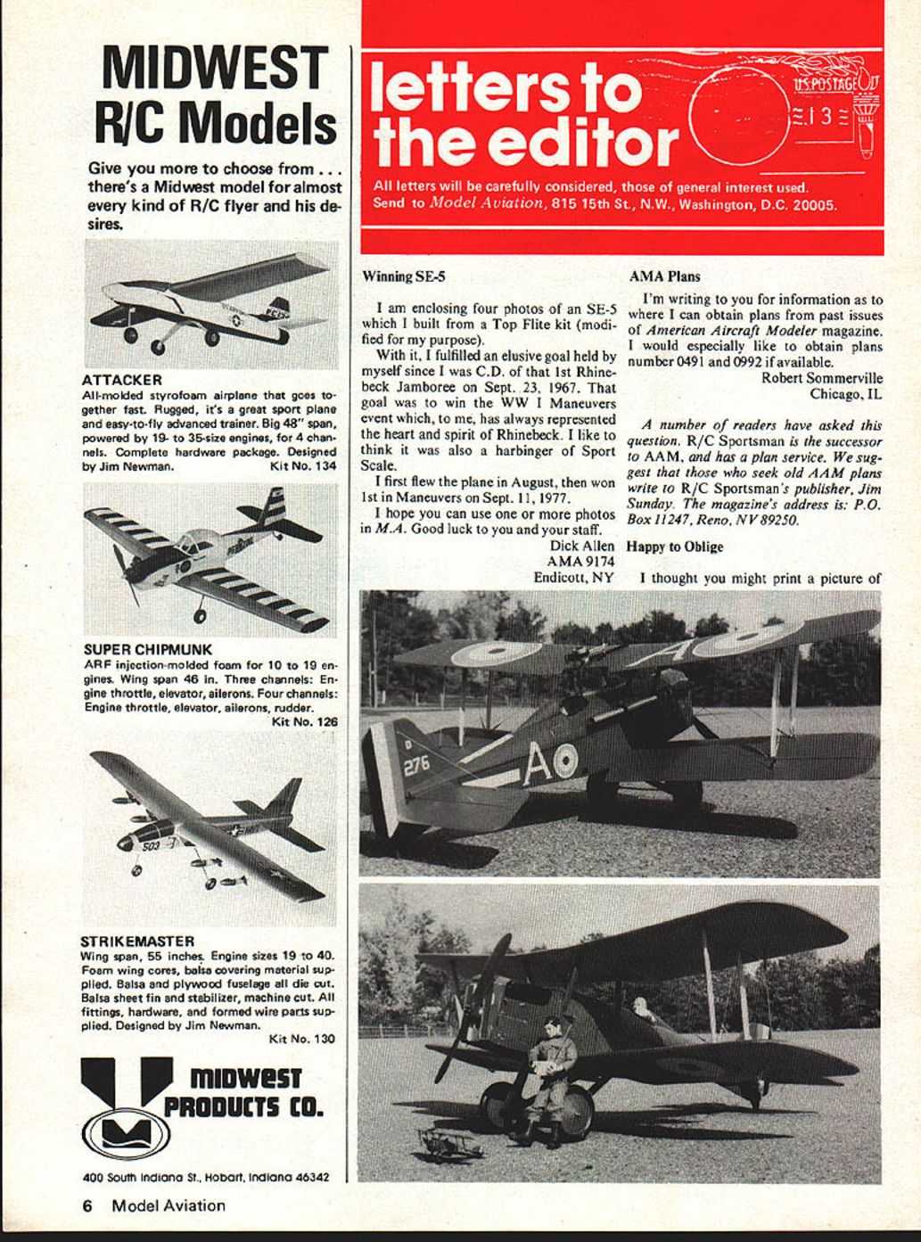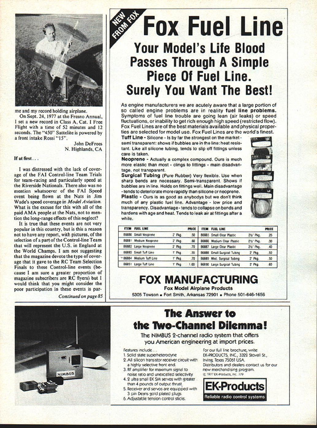 MIDWEST RIC Models Give choose . thems Midwest model almost kind R/C flyer de sires ATTACKE ii All-molded styrofoam airplane goes gether fast Rugged its great sport plane easy-to-fly advanced trainer Big 48 span powered 19- 35-size engines 4 chan nels Complete hardware package Designed Jim NewmanKit No 134 STR 1K EMASTE R Wing span 55 inches Engine sizes 19 40 Foam wing cores balsa covering material sup plied Balsa plywood fuselage die cut Balsa sheet fin stabilizer machine cut fittings hardware formed wire parts sup plied Designed Jim Newman Kit No 130 400 South Indiona St Hobart IndIana 46342 am enclosing four photos SE-5 built Top Flite kit modi fied purpose fulfilled elusive goal held myself since CD 1st Rhinebeck Jamboree Sept 23 1967 goal win WW Maneuvers event has always represented heart spirit Rhinebeck like think also harbinger Sport Scale first flew plane August won 1st Maneuvers Sept 11 1977 hope can use photos MA Good luck staff Dick Allen AMA 9174 Endicott NY Im writing information can obtain plans past issues American Aircraft Modeler magazine would especially like obtain plans number 0491 0992 available Robert Sommerville Chicago IL number readers have asked question R/C Sportsman successor AAM has plan service sug gest seek old AAM plans write R/C Sportsmans publisher Jim Sunday magazines address PO Box 11247 Reno NV89250 Happy Oblige thought van mioht nrint i nictijre 6 Model Aviation Winning SE-5AMA Plans SUPER CHIPMUNK ARF injection-molded foam 10 19 en gines Wing span 46 Three channels En gine throttle elevator ailerons Four channels Engine throttle elevator ailerons rudder Kit No 126 record holding airplane Sept 24 1977 Fresno Annual set new record Class Cat Free Flight time 52 minutes 12 seconds 450 Sattelite powered front intake Rossi 15 John DeFrees N Highlands CA first distressed lack cover age FAI Control-line Team Trials team-racing particularly speed Riverside Nationals also no mention whatsoever FAI Speed event being flown Nats Jim Wades speed coverage Model viation What excuse paid AMA people Nats men tion long-range effects neglect true events very popular country reason have report pictures selection part Control-line Team will represent US England World Champs am suggesting magazine devote type cover age gave RC Team Selection Finals Control-line events cause am sure greater proportion magazine subscribers RC flyers would think might consider poor participation events par9 9 Fox Fuel Line Models Life Blood Passes Through Simple Piece Fuel Line Surely Want Best As engine manufacturers acutely aware large portion called engine problems reality fuel line problems Symptoms fuel line trouble going lean air leaks speed fluctuations inability get rich enough high speed restricted flow Fox Fuel Lines best materials available physical proper ties selected model use Fox Fuel Lines worlds finest Tuft Line Silicone far strongest market semi transparent shows bubbles line heat resis tant Like silicone tubing tends slip oft fittings unless care taken Neoprene Actually complex compound much elastic clings fittings main disadvan tage transparent Surgical Tubing Pure Rubber Very flexible Use sharp bends necessary Semi-transparent Shows bubbles line Holds fittings well Main disadvantage tends deteriorate rapidly silicone neoprene Plastic good anybodys dont think much plastic fuel line Advantage low price transparency Disadvantage tends collapse bends hardens age heat Tends leak air fittings after ITEM FUEL LINEPRICEITEM FUEL UNEPRICE 86880 Small Neoprene2 Pkg 5086885 Small Clear Plastic2 Pkg 25 86881Mediam Neoprene2Ptg.6086806Mediam Clear Plastic2Pkg.30 86882Large Neoprene2Pkg7086087Large Clear Plastic2Pbg.40 86883Small Taft Line1Pkg. 5586888Small Surgical Tabing2Pkg.50 86884Medium Taft Line1PkQ7086889Med Surgical Tubing2Pkg.50 86851Large Taft Line1Pkg10086890Large Surgical Tubing2Pkg.60 FOX MANUFACTURING Fox Model Airplane Products 5305 Towson Smith Arkansas 72901 e 501-646-1656 Answer iWo-Channel Dilemma NIMBUS 2-channel radio system offers American engineering import prices Features include. 1 Solid state superheterodyne 2 All silicon transistor receiver circuit highly selective front end 3 RF amplifier maximum signal noise ratio unexcelled selectivity 4 2 ultra small EK SM servos greater 4 pounds output thrust 5 Receiver servos equipped 3 pin Deans gold plated plugs 6 Adjustable tension control sticks full line brochure write EK-PRODUCTS INC 3322 Stovall St Irving Texas 75061 USA Distributors dealers contact us new merchandising program c979p Continued page 8S MUFF-L-AIRE I IDEAL FOR PLANES BOATS AND CARSMUFF-L-AIRE EXTREMELY COMPACTIDEAL FOR PLANES FULLY ADJUSTABLE NOISEBOATS LEVEL AND BACKAND $595 PRESSURE FOR BETTERCARS PERFORMANCE ADAPTS TO ALL ENGINES FROMNo 29 TO60144 ONLY 7N3 UNIVERSAL MUFFLER Designed installation wide variety engines 29 60 class Varying number baffle plates controls noise level backSpring action locks Kwik-Klip pressure desire positive contactPatent Pending No 151 battery wires S 125 -DU-BRO PRODUCTS INCORPORATED 480 Bonner Road Wauconda Illinois 60084 USA Openers continued page 60 grees Maybe fly some figure eights 5turns road Partial stalls want loopOKif can roll OK Overhead approach enter pattern downwind leg etc Perhaps shoot some touch-and-goes Better milling around aimlessly Enjoy theme flying Say did ever tell about idea have take Manhattan modelhey wherere going Letters Editor continued page 7 tially resulting lack publicity could introduce fliers events also help stimulate existing compe tition coverage Control-line Team Finals 1976 Team helped crease interest FAI Speed gave goal work towards representing US World Champs attained California summer hope make type inspiration possible other fliers like myself try keep enjoyable interna tional events alive through publicity power maybe once popular events will again flourish now Europe Charles Lieber Moorestown NJ December issuewhich included Team Race Finalsprobably relieved Mr Liebers