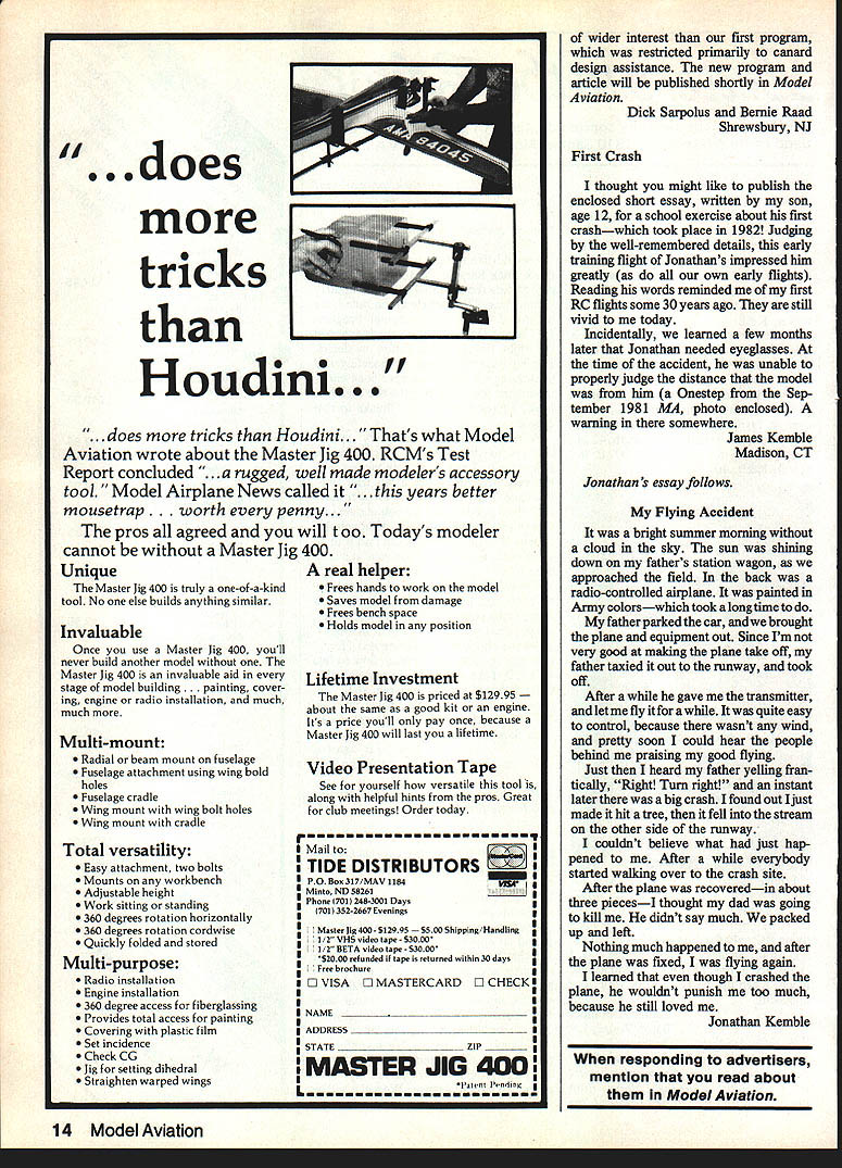 etters t6e a1tcr letters will carefully considered general interest used Send ModelAviation 1810 Samuel Morse Dr Reston VA 22090 Original Design Beauties I thought might interested couple planes built scratch A-4 Skyhawk built small reference picture beautiful flier very realistic air Specs famous Blue Angels jet weight 5 lb length 43 wingspan 44 wing area 540 sq power K&B 40 other plane called Clorox Special because made cowl bottom plastic Clorox bottle plane really great flier will Pattern maneuvers used no picture plan building plane ever favors bush planes flown Alaska Specs weight 5 lb length 42 wingspan 60 wing area 600 sq power K&B 40 i nave memuer AMA several years really enjoy Model Aviation magazine have built models over past 25 years have flying RC past 10 am real estate business Baton Rouge LA enjoy hobby model building very much Keep up good work magazine Lamar Alexander Baton Rouge LA Its unlikely magazine reproduc tion pictures color prints will true justicefor planes Both beautifully finished trimmed bush plane rendition Clorox Special having special appeal us Computers Modeling would like take opportunity thank Dick Sarpolus Bernie Raad recognizing potential use computers modeling article June issue Model Aviation Computer Program Canard Designs valuable leap right direction future modelers Having recently started modeling possessing computer have enter taining idea linking two together Now have good start thanks article After making necessary syntax changes program conform IBMs basic immediate success very first run After few trial runs however did modify few steps have both input data output data sent printer hard copy Although change necessary did find convenient comparisons later time would like ask question about line #1700 line #1720 assign value string variable B$ however program never gets use line # 1690 check condition found true re-route program flow line #1 720 am under impression program decided print June article will looking forward future articles Sarpolus Raad George B Markos Staten Island NY sent Georges letter Dick Sarpolus Bernie Raad response follows pleased computer pro gram article interest George no trouble running program modification suggests print out both input output data good idea program items noticed com mented part routine sug gested alternate vertical fm location design modification removed program real value also routine could handled small computers note now lines 1690 through 1720 could deleted out affecting program execution have sent George informa tion use advance copy new computer programfor analysis com parison aircraft designs feel will Continued page 14 0O 5 % C 40 90 Engines Super Buccaneer 88 WingspanlArea 88/1 200 Weight -7 lbs Set No RCFF-1$1795 30 60 Engines Buccaneer Standard W ngspan/Area 66/630 ght 4 bs Se No RCFF5$995 iSto 35 Engines WACO SRE Wingspan/Area 52i4 /640 Weight 3 lbs 10 02 Set No RCI5-3$1295 Mureaux C-i Wingspan/Area 56/450 Weight 3 lbs 802 SetNoRC8S1$1295 Super Brigadier 66 Wingspan/Area 66/530 Weight 2 lbs 4oz Set No RCFF-2 $995 Super Buccaneer 66 Wingspan/Area S6/650 Weight 2 lbs 802 Set No RCFF-4$1295 Snow White 68 Wingspan/Area 681700 Weight 4 lbs 802 Set No RCFF-7$1495 Astro Hog 54 Wingspan/Area 54/450 Weight-2 lbs Soz Set No RCT-1 Custom Cavalier 78 Wingspan/Area 78/630 Weight-3 lbs 402 Set No RCFF-6$1795 049 12 Engines Super Brigadier 44 Wingspan/AreaWeight l4oz Set No RCFF-3..$495 Mini Hog 48 Wingspan/Area 47 /340 Weight-i lb 2oz Set No RCT-3..$695 Sinbad 78 Wingspan/Area 78/685 Weight 2 lbs 402 Set No RCG-t.. November1984 13 $895 F ed 0 44 4. mIs AAO does tricks Houdini. .. does tricks Houdini. Thats what Model Aviation wrote about Master Jig 400 RCMs Test Report concluded .. rugged well made modelers accessory tool Model Airplane News called .. s better mousetrap th penny. pros agreed will too Todays modeler cannot Master Jig 400 Unique Master Jig 400 truly one-of-a-kind tool No else builds anything similar Invaluable Once use Master Jig 400 youll never build another model Master Jig 400 invaluable aid stage model building. painting cover ing engine radio installation much much Multi-mount Radial beam mount fuselage Fuselage attachment using wing bold holes Fuselage cradle Wing mount wing bolt holes Wing mount cradle Total versatility Easy attachment two bolts Mounts workbench Adjustable height Work sitting standing 360 degrees rotation horizontally 360 degrees rotation cordwise Quickly folded stored Multi-purpose Radio installation Engine installation 360 degree access fiberglassing Provides total access painting Covering plastic film Set incidence CheckCG Jig setting dihedral Straighten warped wings real helper Frees hands work model Saves model damage Frees bench space Holds model position Lifetime Investment Master Jig 400 priced $12995 about same good kit engine Its price youll pay once because Master Jig 400 will last lifetime Video Presentation Tape See yourself versatile tool along helpful hints pros Great club meetings Order today TIDE DISTRIBUTORS ____ PO Box 317/MAV 1184 Minto ND 58261________ Phone 701 248-3001 Days 701 352-2667 Evenings Master Jig 400- 812993 Shipping/Handling 1/2vHSvideotape-53000 1/2BETAvideotape-83000 S2000 reFunded ii tape returned within 30 days IFree brochure D VISA D MASTERCARD D CHECK NAME ____________________ ADDRESS _________ STATE __________________ ZIP _______ MASTER JIG IOO ndn wider interest first program restricted primarily canard design assistance new program article will published shortly Model Aviation Dick Sarpolus and Bernie Raad Shrewsbury NJ First Crash thought might like publish enclosed short essay written son age 12 school exercise about first crashwhich took place 1982 Judging well-remembered details early training flight Jonathans impressed him greatly own early flights Reading words reminded first RC ffights some 30 years ago still vivid today Incidentally learned few months later Jonathan needed eyeglasses time accident unable properly