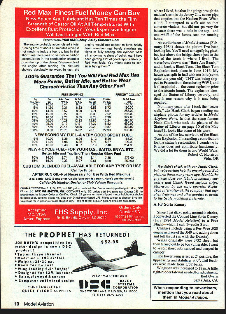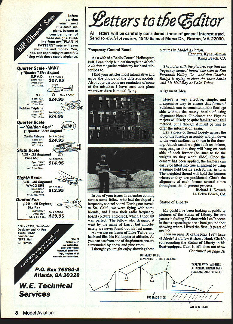 Before starting next RIC scale air plane sure consider designs Buil%l ing PLAN N PATTERN sets will save time money too can soon enjoy relaxed RIC flying stable airplanes Quarter Scale WW Quadra Size Engine Set RCQS-5 $2795 0 SatIACQS-7 SetI ACQS-8 $24 95 SP AD Span 79 V Area 2120 WI 12 lbs SE5 Span SOY Area 2220 Wt 10 lbs Soz Fokker Triplane Span 72 Area 1772 Wt10 lbs uarter Scale Golden Age Quadra Size Engine Curtis Falcon Set# RCOS-13 Span 114 $2495 Area 3168 Wt l3lba- Scale 15.25 Engines Puss Moth SetI RC6S-3 Span73 $1495 Area 880 Wt 3 lbs 10 Oz EIghth Scale Area 15 25 Englnes WACO SRE Sell PC5S Span 52 V WI 3 lbs 1002 Ducted Fan 20- 40 Engines SkyRay Span32VSetIACDF1 Area 440 Wt3lbs4oz. $1995 etters t6e a1tcr letters will carefully Considered general interest used Send Model Aviation 1810 Samuel Morse Dr Reston VA 22090 Frequency Control Board As wife Radio Control Helicopters buff Icant help leaf through Model Aviation magazine husband sub scribes find articles informative enjoy photos different models Also cartoons reminders some mistakes have seen take place wherever model flying issues remember coming across some fellow developed frequency control board During travels So Calif flying some friends saw radio frequency board picture enclosed thought perfect fellow designed went name Larry unfortu nately never found out last name As residents Lake Tahoe husband flies Helicopter altitude As can see pictures surrounded snow pine trees thought might enjoy showing pictures Model Aviation Henrietta Kynell-Emigh Kings Beach CA notes pictures say frequency control board seen San Fernando Valley CAand Charles Emigh hying clear snow banks Heli-Boy Lake Tahoe Alignment Idea Heres very effective simple inexpensive way ensure formers bulkheads can cemented fuselage side messy hassle using alignment blocks Old-timers Physics majors will likely quite familiar method thought might time offer information again Lay piece thread loosely across top fuselage assembly pin down work surface shown draw ing Attach small weights such sinkers nuts etc will hang side former sure tie weights wont slide Once cement has applied formers can easily tilted true alignment using square held beside former turn weighted thread will hold formers wherever positioned Check alignment former several times throughout alignment process Richard J Kovach La Selva Beach CA Statue Liberty gosh Ive looking publicity pictures Statue Liberty two years including TV shots Lee lacocca expecting see background shot showing lived first 19 years life page 10 May 1984 issue Model Aviation shows Hank Clarks son rounding Statue Liberty float-equipped Cub still does show Continued page 10 FORMERS TO BE CEMENTED TO THE FUSELAGE THREAD WITH WEIGHTS ATTACHED PINNED OVER FUSELAGE AND FORMERS / FUSELAGE SIDE / / / WORK SURFACE 8 Model Aviation Since 1933 Gas Model Designer Kit Pro ducer AMA Founder snd NFFS Hall Famar PIn II Pattern Sets caste kin. priata whIt fell ii. leyset. eli pert drew legs template hilt materiel. ead lestreetlee PO Box 76884-A Atlanta GA 30328 WaEM Technical Services JOE RUTHS competition two meter design now DSC product OTwoor three channel Modif led E-193 airfoil 0 Weight 28-30 oz 0 Room ballast Wing loading 65- 7 az/sq Designed 12 V launches Balsaplywood & spruce Computer optimized design YOUR SOURCE FOR QUIET FLIGHT SUPPLIES lived line going through maidens ann Jersey City sewer pipe empties Hudson River kid attempted walk out concrete viaduct did get very far because hole topand whiff fumes sent running home An earlier issue ofModelAviation Feb ruary 1984 shows picture Ive looking Youll need magnifying glass just above bridge shown just left torch lived waterfront shown Bare Ass Beach back Black Tom Black Tom Explosion took place June 1916 house split half quite year old TNT being ship ped France during WW exploded st explosion prior atomic bomb explosion dam aged Statue Liberty severely reason now being repaired years after took sewer walk Hank Clark began sending airplane photos articles Model Airplane News same famous Hank Clark took picture Statue Liberty page 10 May issue looks like some work As few survivors Black Tom Explosion Im sending contribution statues restoration wonder France does contribute handsomely did lot two World Wars Robert C Morrison Vida OR didnt check Hank Clark certain hes sent Bob pictures years ago Hanks guy does fabulous monthly cut aways Chuck Wood cartoon strips Morrison way operates Repla Tech International company sup plies drawings other goodies useful Scale modeling fraternity Since get dizzy going around circles converted Control Line Sorta Kanary July 1984 Model Aviation Free Flightwhich call Tweedie Burd Changes include using Pee Wee 020 engine place 049 adding down left thrust Dakota Wings originally 3/32 sheet turned out too vulnerable went sheet sanded warped-in camber lower wing set 20 positive upper wing stabilizer 00 Tail feath ers made 3/32 balsa Wingspan increased 18 little right-rudder tab needed adjustment Bud Overn Santa Ana CA FF Sorta Kanary responding advertisers mention read about Model Aviation 10 Model Aviation THE PROPHET HAS RETURNED VISA MASTERCARD DAVEY CORPORATION SYSTEMS ONE WOOD LANEMALVERNPA119355 215644-06926772