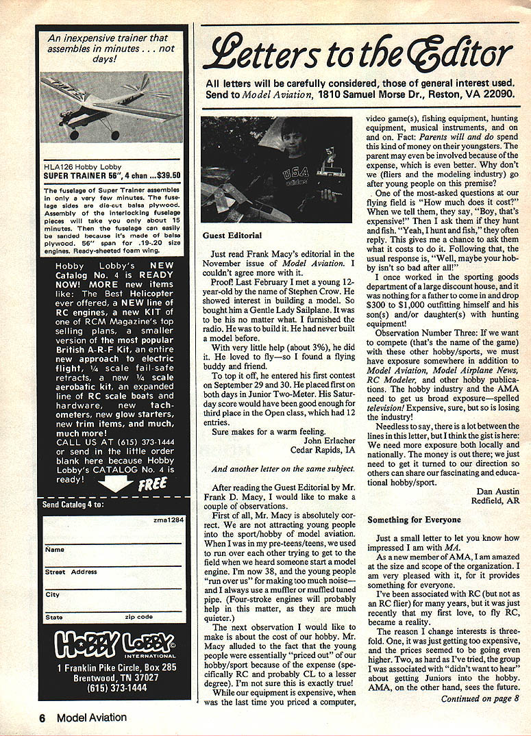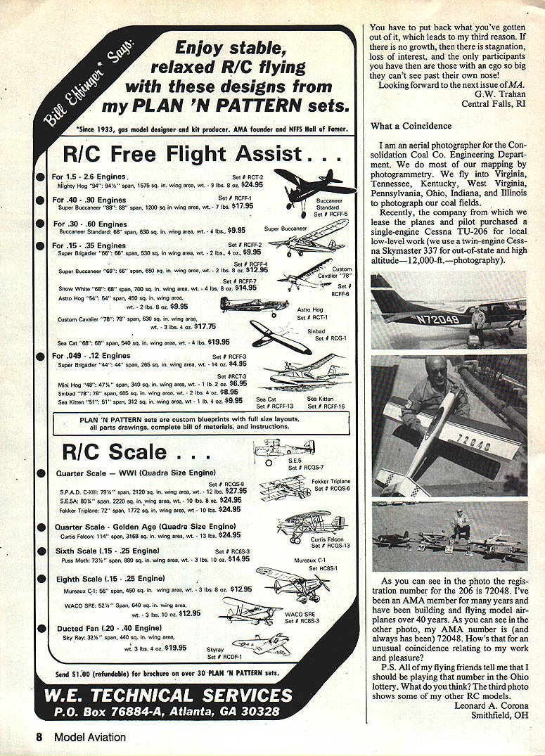 An inexpensive trainer assembles minutes. IdavsiI HLA126 Hobby Lobby SUPER TRAINER 56 4 chin .$3950 .getters t6e d1tcr letters will carefully considered general interest used Send Model Aviation 1810 Samuel Morse Dr Reston VA 22090 Just read Frank Macys editorial November issue Model Aviation couldnt agree Proofi Last February met young 12year-old name Stephen Crow showed interest building model So bought him Gentle Lady Sailplane no matter what furnished radio build never built model before very little help about 3% did loved flyso found flying buddy friend top off entered first contest September29 30 placed first both days Junior Two-Meter Satur day score would have good enough third place Open class 12 entries Sure makes warm feeling John Erlacher Cedar Rapids IA another letter same subject After reading Guest Editorial Mr Frank D Macy would like make couple observations First Mr Macy absolutely cor rect attracting young people sport/hobby model aviation pre-teens/teens used run over other trying get field heard someone start model engine Im now 38 young people run over us making too much noise always use muffler muffled tuned pipe Four-stroke engines will probably help matter much quieter next observation would like make about cost hobby Mr Macy alluded fact young people essentially priced out hobby/sport because expense spe cifically RC probably CL lesser degree Im sure exactly true equipment expensive last time priced computer video games fishing equipment hunting equipment musical instruments on Fact Parents will spend kind money youngsters parent may involved because expense better dont fliers modeling industry go after young people premise most-asked questions flying field much does cost tell say Boy thats expensive ask hunt fish Yeah hunt fish often reply gives chance ask what costs Following usual response Well maybe hob isnt bad after once worked sporting goods department large discount house nothing father come drop $300 $1000 outfitting himself sons and/or daughters hunting equipment Observation Number Three want compete thats name game other hobby/sports must have exposure somewhere addition Model Aviation Model Airplane News RC Modeler other hobby publica tions hobby industry AMA need get us broad exposurespelled television Expensive sure losing industry Needless say lotbetween lines letter think gist need exposure both locally nationally money out just need get turned direction others can share fascinating educa tional hobby/sport Dan Austin Redfield AR Something Everyone Just small letter let know impressed am MA As new member AMA am amazed size scope organization am very pleased it provides something everyone Ive associated RC RC flier years just recently first love fly RC became reality reason change interests three fold just getting too expensive prices seemed going higher Two hard Ive tried group associated didnt want hear about getting Juniors hobby AMA other hand sees future Continued page 8 6 Model Aviation fuselage Super Trainer assembles very few minutes fuse lage sides die-cut balsa plywood Assembly interlocking tuselage pieces will take about 15 minutes fuselage can easily sanded because its made balsa Guest Editorial olywood 56 span 19-20 size Ready-sheeted foam wing Enjoy stable relaxed RIC flying designs yPLAN N PATTERN sets *5~ 1933 gee model designer kit producer AMA founder NFFS Hall Famer RIC Free Flight Assist. aneer Standard Set # Super Buccane~j 15- 35 EnginesSet RCFF-2 Super Brigadier 66 66 span 530 sq wing area wt 2 lbs 4 oz $995 ow vae 78 Se RCFF-6 15 26 EnginesSet RCT-2 Mighty Hog 94 9414 span 1575 sq wing area ert 9 lbs 8 oz $2495 40 90 EnginesSet RCFF-1 Super Buccaneer 88 88 span 1200 sq wing area wt-7 lbs $1795 30 60 Engines Buccaneer Standard 66 span 630 sq wing area wi 4 lbs $995 Set RCFF-4 Super Buccaneer 66 66 span 650 sq wing area wt 2 lbs 8 oz $1295 Astro Hog Set RCT-1 bad Set RCG-1 See CatSea Ktten SetIRCFF13Se IRCFF 6 Set RCFF-7 Snow White 68 68 span 700 sq wing area wt -4 lbs 8 oz $1495 Aatro Hog 54 54 span 450 sq wing area wt 2 lbs 8 oz $995 Custom Cavalier 78 78 span 630 sq wing aree 3 lbs 4 oz $1775 See Cat 68 68 span 540 sq wing area wt -4 lbs $1995 049 12 EnginesSet RCFF-3 Super Brigadier 44 44 span 265 sq wing area wt 14 $495 Set IRCT-3 Mini Hog 48 4714 span 340 sq wing area wt -1 lb 2 oz $695 Sinbad 78 78 span 665 sq wing area wt 2 lbs 4 $895 See Kitten 51 51 span 312 sq wing aree wi 1 lb 4 oz $995 PLAN N PATTERN sets custom blueprints full size layouts parts alldrawings complete bill materials instructions RIC Scale. Quarter Scale Quadra Size Engine Set RCQS-8 SPAD C-XIII 7914 span 2120 sq wing area wt 12 lbs $2795 SE5A 8014 span 2220 sq wing ares wt 10 lbs 8 $2495 Fokker Triplane 72 span 1772 sq wing area wt 10 lbs $2495 Quarter Scale Golden Age Quadra Size Engine Curtis Falcon 114 span 3168 sq wing area wt 13 lbs $2495 Sixth Scale 15 25 EngineSet RC6S-3 Puss Moth 7314 span 880 sq wing area wt -3 lbs 10 $1495 SE5 Set RCQS-7 ac,~FOkke T pane Se RCQS 6 Mureaux C-i Murerus C-i 56 span 450 sq wing area wt -3 lbs 8 oz $1295 WACO SRE Set RC8S-3 have put back what youve gotten out leads third reason no growth stagnation loss interest participants have ego big cant see past own nose Looking forward next issue MA GW Trahan Central Falls RI What Coincidence am aerial photographer Con solidation Coal Co Engineering Depart ment mapping photogranimetry fly Virginia Tennessee Kentucky West Virginia Pennsylvania Ohio Indiana Illinois photograph coal fields Recently company lease planes pilot purchased single-engine Cessna TU-206 local low-level work use twin-engine Cess na Skymaster 337 out-of-state high altitudei 2000-ftphotography As can see photo regis tration number 206 72048 Ive AMA member years have building flying model air planes over 40 years As can see other photo AMA number always has 72048 Hows unusual coincidence relating work pleasure PS flying friends tell should playing number Ohio lottery What think third photo shows some 