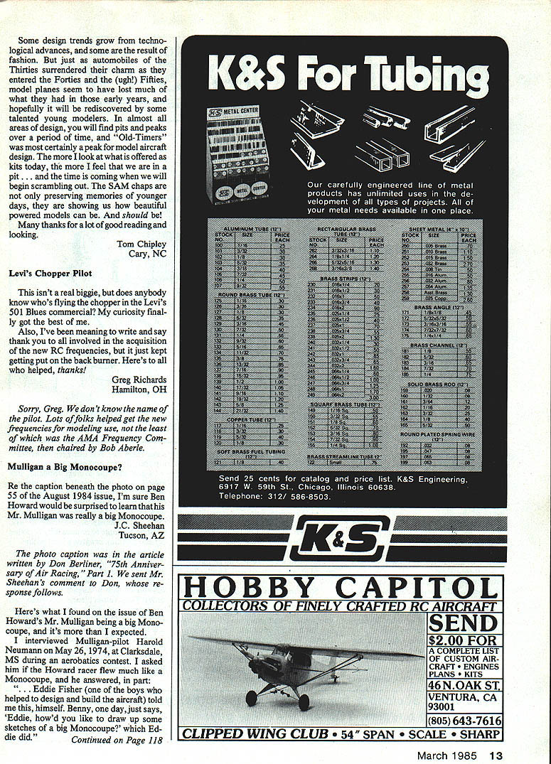 Plan N Pattern Set #RCQS-8$2795 SPAD C-XIII World War 13- 31 Engines 79yWingspan2120 sq new design offering makes beautiful RIC replica WW-l era 2120 s area its big aircraft capable flyer captures imagination Plan N Pattern Set #RCOS-7$2495 World Wan SE-5A Quarter Scale RIC 78-22 Engines 80A Wingspan2220 sq Plan N Pattern Set SRCQS-$2495 N FOKKER TRIPLANE DR-i 79-150 Engines 72 Wingspan1772 sq giant Scale RIC Design WW-1 Plan N Pattern Set # RCOS 3$249E CURTIS FALCON 114 span 3188 sq n 13 lbs Plan N Pattern Set #RCDF-1$1995 SKYRAY Best Ducted Fans 1 Scale Ducted Fan RIC RK-20 Fan Unitu long Teatimonials have seen two plans make other corn panies plans look sick plans make building srratch like kit building Hobby Dealer R MarL New York Prices Complete Plans Sub Assembly Detailed Parts Lists Add $200 Maillag Tuba SEND FOR BROCHURE ahead crowd New Brochure showing new Plan Sets Send Si 00 its refund able first order WE Technical Services PO Box 76884-S Atlanta Georgia 30328 page 55 November issue RC Old-Timer columnist Dr DB Ma thews ran picture story Megow Aero Champ its modem-day replica now being kitted Carl Spielmaker What coincidence find Aero Champs designer Walter Eggert pictured page 97 same issue connection Bill Warners article Flying Aces Nats Walts active years Philadelphia-area modeling circles having designed Megows Aero Champ Soar ing Eagle gas kits well old rubber-powered Scale kits before NW II recently hes specialized RC Soaring Scale competition teams son FAC Rnbber Scale events As member SAM-76 flies absolutely gorgeous example old Class B-size Soaring Eagle SAM Texaco competition Incidentally still uses old NAA number 292 visible tall original Aero Champ AMA num ber Dave Ritchie Hatfield PA Oh What Great Fun RCin Used What fun get son involved RC modeling 1980 What fun go home tell mother just well son doing hobby can remember saying practice lot before long would flying contests other contest-goers Oh What fun RCin usedtobe in81to arrive back home contest Missou ri just tell mother little boy won two trophies mumbled great time Oh What fun RCin used 82 decided go Lincoln NE 82 Nats both flew Sports man Pattern class Oh What fun watch TV news person interview son finished second nation Jr Sportsman Pattern Lincoln NE Oh What great fun RCin 83 felt good about RCin because old touch starting come back done again won 83 son guess should tell 83 touring West Coast grand parents Oh What fun RCin used June 84 getting ready contest Pekin weekend own Quincy next week cant wait get back home can tell wife just much fun bringing up rear see daylight just around corner 14year-old flier starting notice females look better planes So wont long before ol dad back limelight home Oh What fun has write RCin letterabout nicest young man know son Mike Mike Bratton Sr Quincy IL Lets Hear George So seldom happens meet someone like George M Myers writer Radio Technique column man deserves recognition met George about year ago joined RC Helicopter club Hover Lovers Long Island member George must truly admired radio information professionally investi gates reports publication moreso time effort devotes club its members always ready share knowledge help anyone need well organizing club events George brings enthusiasm members through precise recording detailed photographs shows contests has feel its about time someone said Thank George Raymond Floann Landeck Yonkers NY Appeal Old-Timers issues Model Aviation really keep getting better better October 1984 issue especially good. good color good articles good range t good work around story Dick Stouffer SAM Championships well done enjoyable would like add comment two Dicks explanations appeal OldTimers planes certainly retain atmosphere early years both model powered flight young people built flew another factor designer feel plays important role shapes planes planes Old-Timers graceful beautiful designs con tours have glven way expediency straight lines absolute techni cal point view may much said modem design fact remains older planes simply very easy lcok Continued page 13 8 Model Aviation Bill Effinger suggests Plan N Pattern Sets Some design trends grow techno logical advances some result fashion just automobiles Thirties surrendered charm entered Forties ugW Fifties model planes seem have lost much what early years hopefully will rediscovered some talented young modelers almost areas design will find pits peaks over period time Old-Timers certainly peak model aircraft design morel look what offered kits today feel pit . time coming will begin scrambling out SAM chaps preserving memories younger days showing us beautiful powered models can should thanks lot good reading looking Tom Chipley Cary NC Levis Chopper Pilot isnt real biggie does anybody know whos flying chopper Levis 501 Blues commercial curiosity final ly got best Also Ive meaning write say thank involved acquisition new RC frequencies just kept getting put back burner Heres helped thanks Greg Richards Hamilton OH Sony Greg dont know name pilot Lots offolks helped get new frequencies modeling use least AMA Frequency Com mittee chaired Bob Aberle Mulligan Big Monocoupe Re caption beneath photo page 55 August 1984 issue Im sure Ben Howard would surprised learn Mr Mulligan really big Monocoupe JC Sheehan Tucson AZ photo caption article written Don Berliner 75th Anniver saty Air Racing Part 1 sent Mr Sheehan s comment Don re sponse follows Heres what found issue Ben Howards Mr Mulligan being big Monocoupe its expected interviewed Mulligan-pilot Harold Neumann May 26 1974 Clarksdale MS during aerobatics contest asked him Howard racer flew much like Monocoupe answered part .. Eddie Fisher boys helped design build aircraft told himself Benny day just says Eddie howd like draw up some sketches big Monocoupe Ed die didContinued Page 118 March 1985 13 1 Sim pie two finger no force operation no need hold model other hand 2 Positive lock will rotate come off under heavy enginevibration 3 100% mer