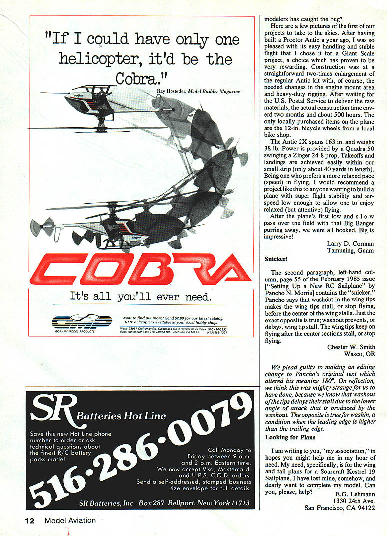w~uc h eve ronu ho bbya product s PO Box 24800 Sandusky Ohio 44870 419 627-1877 P0 Box 2790 Park Falls WI 54552 U PrnudiI PrnAntR I Fleet Biplane thought might interested enclosed pictures model 1930 Fleet built Model Aviation plans Une interesting uimg about airplane arranged tail assembly completely removable airplane simply taking out three 4-40 bolts nuts stabilizer adjustable shown plans Fleet painted cherry red similar color full-size Fleet aircraft produced 1930s Power comes 0S 60 four-stroke may interest know took first flying lessons full-size 1930 Fleet great plane fly would have about 1938 1939 Thanks presenting plans great little plane Mack Stevens Lake Havasu City AZ presentation 1930 Fleet Bi plane appeared September 1980 issuearticle plan GaryE Brown Full-size plans $625 MA Plans Service Plan No 310 Thirty Days Aloft time see drawings Hank Clarks J-3 Cub floats Im reminded Clyde Schlieper Wess Carroll stayed up 30 days nights over Long Beach up Mojave Desert nights f j/ d4 c used ride bikes down Seal Beach Airport after school watch refill per sketch would come flying slowly possible Lincoln Phaeton would tear down run way underneath guy back seat would hand up 5-gal cans gas put floats would use wobble pump transfer gas regular tank night change plugs magnetos etc mostly night over desert going Long Beach Junior Col lege really lot good times out back days Win Hill Staunton VA Modeling Guam Aeromodeling alive well America starts its day Guam USA members Guam Aeromodelers Club hearty dedicated bunch have bevirtually item gear needed hobby must mail-ordered mainland weeks months anxious waiting new kit part come Needless say does make some very-well-thought-out orders forget crucial part Despite hardships club beginning take its first giant step Projects underway include erry No lans Ziroli AT-6 Louis Martinez -scale Tomahawk Ray Weiss -scale Cap 21 giant Antic club out island Pacific Ocean nearest hobby shop about 7000 miles away wouldnt agree bunch Continued page 12 10 Model Aviation vs Editor letters will carefully considered general interest used Send Mod el Aviation 1810 Samuel Morse Dr Reston VA 22090 First Series Great Flying Canards RIC Modeler could have helicopter itd Its youll ever need GORIIAM MOSEr PRODUCTS Want find out Send $200 ocr latest catalog GMP helicopters arrailable local hobby shop WOst 23961 ClaIIsnen Rd Cstsbssss CA 818 992-0195 P1cc sIR 454-5533 East Hehcpnlsl EaSt 216 Vernon Rd GIsOnInG PA 16125412588-1321 modelers has caught bug few pictures first projects take skies After having built Proctor Antic year ago pleased its easy handling stable flight chose Giant Scale project choice has proven very rewarding Construction straightforward two-times enlargement regular Antic kit course needed changes engine mount area heavy-duty rigging After waiting US Postal Service deliver raw materials actual construction time coy erd two months about 500 hours locally-purchased items plane 12-in bicycle wheels local bike shop Antic 2X spans 163 weighs 38 lb Power provided Quadra 50 swinging Zinger 24-8 prop Takeoffs landings achieved easily within small strip about 40 yards length Being prefers relaxed pace speed flying would recommend project like anyone wanting build plane super flight stability air speed low enough allow enjoy relaxed attentive flying After planes first low s-l-o-w pass over field Big Banger purring away hooked Big impressive Larry D Corman Tamuning Guam Snicker second paragraph left-hand col umn page 55 February 1985 issue [Setting Up New RC Sailplane Pancho N Morrisi contains snicker Pancho says washout wing tips makes wing tips stall stop flying before center wing stalls Just exact opposite true washout prevents delays wing tip stall wing tips keep flying after center sections stall stop flying Chester W Smith Wasco OR plead guilty making editing change Panchos original text altered meaning 1808 reflection think mighty strange us have done because know washout ofthe tips delays stall due lower angle attack pmduced washout opposite true washin condition leading edge higher trailing edge Looking Plans am writing association hopes might help hour need need specifically wing tail plans Soarcraft Kestrel 19 Sailplane have lost somehow dearly want complete model Can please helpEG Leann 1330 24th Ave San Francisco CA 94122 12 Model Aviation Ray Hostetler Model Builder Magazine