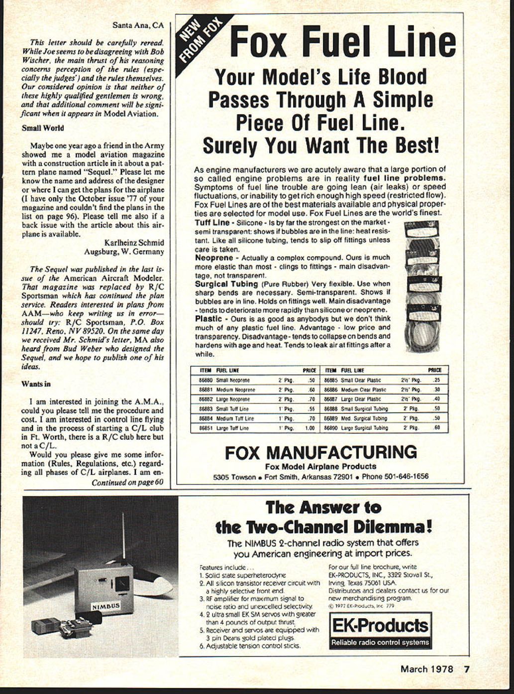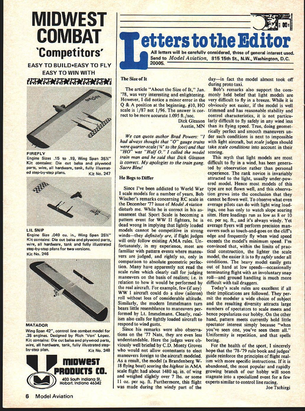 MIDWEST COMBAT Competitors EASY TO BUIIDmEASY TO FLY EASY TO WIN WITH Letters Editor letters will carefully considered general interest used Send Model Aviation 815 15th St NW Washington DC 20005 Size article About Size Jan 78 very interesting enlightening However did notice minor error Q & position beginning #10 HO scale 1/87 1/96 answer cor rect accurate 1095 ft/sec Dick Gleason Austin MN can quote- author Brad Powers always thought 0 gauge trains quarter-scale /4 foot HO Half 0 called model train man said Dick Gleason correct apologies train gang Sacre Bleu Begs Differ Since Ive addicted World War scale models number years Bob Wischers remarks concerning RC scale December 77 issue Model Aviation disturb correct sessment Sport Scale becoming pattern event WW II fighters dead wrong implying lightly loaded models cannot competitive strong windsthey definitely flight judges will follow existing AMA rules Un fortunately experience familiar pattern events maneu vers judged rightly comparison absolute geometric perfec tion have apparently read scale rules clearly call judging maneuvers basis realism ie relation would performed real aircraft example few WW aircraft could slow aileron roll loss considerable altitude Similarly modern Immelmann turn bears little resemblance maneuvers per formed Lt Immelmann Clearly real ism also calls lightly loaded aircraft respond wind gusts Since remarks also observa tions 77 Nats less understandable judges ob viously well briefed CD Monty Groves would allow contestants elect maneuvers foreign aircraft modeled As result model Brandenberg W 18 flying boat scoring highest AMA scale flight about 1480 sq wing weighed slightly over 7 lbs some 11 oz per sq ft Furthermore flight made during windy part dayin fact model almost took off during proto taxi Bobs remarks also support com monly held belief light models very difficult fly breeze obviously easier model well trimmed has reasonable stability control characteristics particu larly difficult fly safely wind less its flying speed True doing geomet rically perfect smooth maneuvers un der such conditions next impossible light aircraft scale judges should take scale conditions account scoring myth light models difficult fly wind has genera ted observation rather personal experience rank novice invariably attracted light usually under-pow ered model Hence models type flown well observa tion grows conclusion cannot flown well observe what average pilots can light wing load ings has watch slope soaring sites loadings run low 8 10 oz per sq ft its always windy Yet average flyers will perform precision man euvers such touch-and-goes clifis edge frequently fly wind speed exceeds models minimum speed Im convinced within limits prac tical construction lighter scale model easier fly safely under conditions heavy model easily gets out hand low speedsoccasionally terminating flight involuntary snap rolland ground handling much difficult tail draggers Todays scale rules excellent implications followed per mit modeler wide choice subject resulting diversity attracts large numbers spectators scale meets hence popularizes hobby other hand pattern meets currently hold little spectator interest simply because youve seen youve seen Uniformity repetition spells boring health sport sincerely hope 78-79 rule book judges guide reinforce principles flight real ism specific instructions abandoned popular rapidly growing branch hobby will soon stagnate specialized event few experts similar control line racing Joe Tschirgi 6 Model Aviation EIIICELY Engine Sizes 15 19 Wing Span 3534 Kit contains Die cut balsa plywood parts wire hardware tank fully illustrat ed step-by-step plans Kit No 247 LIL SNIP Engine Size 049 Cu Wing Span 2534 Kit contains Die cut balsa plywood parts wire hardware tank fully illustrated step-by-step plans two versions Kit No 246 MA IADOR Wing Span 42 control line combat model 35 engines Designed Rich Von Lopez Kit contains Die cut balsa plywood parts wire hardware tank fully illustrated stepby-step planKit No 248 P miDwEST PRODUCTS CO (4 400 South Indiana St Hobart IndIana 46342 Santa Ana CA letter should carefully reread Joe seems disagreeing Bob Wischer main thrust reasoning concerns perception rules espe cially judges rules themselves considered opinion neither highly qualjfled gentlemen wrong additional comment will signi ficant appears Model Aviation Small World Maybe year ago friend Army showed model aviation magazine construction article about pat tern plane named Sequel Please let know name address designer can get plans airplane have October issue 77 magazine couldnt find plans list page 96 Please tell also back issue article about air plane available Karlheinz Schmid Augsburg W Germany Sequel published last sue American Aircraft Modeler magazine replaced R/C Sportsman has continued plan service Readers interested plans AAMwho keep writing us error should try R/C Sportsman PO Box 11247 Reno NV 89520 same day received Mr Schmids letter MA also heard Bud Weber designed Sequel hope publish ideas Wants am interested joining AMA could please tell procedure cost am interested control line flying process starting C/L club Ft Worth R/C club C/L Would please give some infor mation Rules Regulations etc regard ing phases C/L airplanes am enContinued page 60 TFox Fuel Line Models Life Blood Passes Through Simple Piece Fuel Line Surely Want Best As engine manufacturers acutely aware large portion called engine problems reality fuel line problems Symptoms fuel line trouble going lean air leaks speed fluctuations inability get rich enough high speed restricted flow Fox Fuel Lines best materials available physical proper ties selected model use Fox Fuel Lines worlds finest Tuft Line-Silicone-Is far strongest marketsemitransparent shows bubbles line heat resis tant Like silicone tubing tends slip off fittings unless care taken Neoprene Actually complex compound much elastic clings fittings main disadvan tage transparent Surgical 