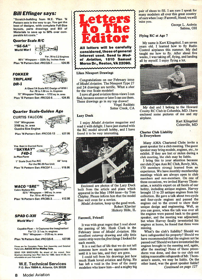 Bill Ettinger says Scratch-building WE Plan N Pattern sets way go get best designs complete Full-Size layouts parts drawings Bill Materials save up 50% over com parable kit costs Quarter Scale RIC SE-5A World Wan Far 78 22 Engines BOW Wingspan Sq Inches Area Plan N Pattern Set #RCQS-7 2495 FOKKER TRIPLANE DR-i Giant 114 Scale RIC Design WW-l 78 150 cu Engines 72 Wingspan Triplane sq area Plan N Pattern Set #RCQS-6 2495 Quarter Scale-Golden Age CURTIS FALCON 114 Wingspan 3158 sq area Quadra Size Engine Plan N Pattern Set #RCQS-13 . $2795 Best Ducted Fans SKYRAY F4D-1 Plan Form 1 Scale Duct Fan RIC 44 lonq RK-20 Fan Unit Plan N Pattern Set #RCDF-1 $1995 WACO SRE Cabin Biplane RIC 52 Wingspan sq area 19 40 Engines Plan N Pattern Set #RC8S-3 $1295 SPAD C-XIII World War Capable Flyer ures Imagination 13- 31 cu engines 791/a Wingspan sq area Plan N Pattern Set #RCQS-8 2795 Prices Complete Plens Sub Assembly Detailed Parts Lists Add $200 lt Mailing Tube SEND FOR BROCHURE ahead rhe crowd New Brochure showing new Plan Sets 1985 Send $100 its refundable first orderl WE Technical Services PO Box 75884-A Atlanta GA 30328 Likes Nicuport Drawings Congratulations February issue ModelAviation Nieuport Type 27 24 drawings terrific What shot true Scale modeler save good aviation three-views can find because sooner later can use drawings go top drawer Virgel Raddatz Sutter Creek CA Lazy Duck enjoy Model Aviation magazine read delight have just started RC model aircraft hobby have found very interesting tncloseo pnotos Lazy Duck built article plans appeared May 1984 issueby Tom Chipley Please inform him model flies well novice ModelAviation keep up good work Robert Kiaviter Hickory Hills IL Farewell Friend great regret read about passing Mr Hank Clark February issue Model Aviation excellent cutaway drawing silly little comic strip first things looked month sad fact life tell someone much appreciate until too late gone could tell drawings just much Hank loved aviation flying has left void lives modelers knew himand mighty big pair shoes fill am sure speak modelers over great country say Farewell friend wewill miss George L Ardwin Sabina OH Hying RC Age 7 name Kurt Klingebiel am seven years old learned fly Radio Control airplanes summer dad taught fly After about five weeks taking off flying landing myself enjoy flvinn lot Kurt Klingebiel Colesville MD Charter Club Liability Everywhere AMA Chartered Clubs invite guest speaker club meeting guest speaker may bring models engines etc exhibit lost stolen during club meeting club may liable bring attention because club Cape Ann RC Club Rowly MA 170 members strong learned experience have monthly membership meetings always open club members non-members occasions invited Harvey Thom asian notable expert facets hobby including antique engines Harvey brought 15 20 antique engines collection gave talk about two-cycle four-cycle engines passed engines out crowd show unique design engineering Well can guess talk over engines passed back guest speaker meeting adjourned Harvey finally inventoried engines homey found three missing Whats clubs liability Should have safeguarded property Should have recommended engines passed out Should have inventoried engines brought meeting again after meeting None proce dures done due club taking reasonable safeguards Mr Thom asians assets may liable other hand guest speaker liable Continued page 127 8 Model Aviation Editor Alt letters will carefully considered general interest used Send Mod el Aviation 1810 Samuel Morse Dr. Reston VA 22090 iviy uau anu belong Howard County RC Club Columbia MD have enclosed some pictures ny airplane moddcajli TOUCH UP AIR BRUSH FOR DETAIL PAINTING OF AIRPLANE WINGS AND BOATS$4000 ARISTO TEX COVERING MATERIAL NEWI AND THE BEST YET CONTOURS BETTER WITH RICH COLORS BETTER STICK ING AND FUEL RESISTANT RED BLUE BLACK ORANGE WHITE GREEN ANlIQUE YELLOW 2 METER ROLL $720 TACHOMETER W/LED READ OUT FOR EAS FIELD READING CAfl00 ACCURATE ENGINE R PM IECE WOOD ING SET FOR HOBBYISTSA $30011 SOLDERING GUN 21 PIECE TOOL SET US SIZE SCREWDRIVERS PLUS PHILLIPS HEX AND WRENCH TYPES $700 4~4cz LE HANDS > WITH MAGNIFIER FOR EXTRA HELP IN HOLDING THOSE SMALL PARTS WHILE SOLDERING GLUING OR PAINTING MAGNIFIER LAMP WITH MULTI POSITION 3 1/ FLEXIBLE ARM 3 DIOPTER $3000 LENS FOR 4 liMES MAGNIFICATION Letters Editor Continued page 8 did pass out engines club nonclub members did realize loss until home passed out engines could controlled did inventory engines audience still present circumstance fortunate speaker club working resolve issue can see club can placed very difficult situation Current AMA insurance will cover type loss insurance avail able guest speakers homeowner s insur ance may want acquire insurance type occurrence minimum should institute controls meeting safeguard speakers assets addition give guest speaker some guidelines example case may want speaker hand out two engines time hope experience will help other AMA Chartered Clubs become aware another area prudence must prac ticed off flying site liability exposure everywhere John F Murray Pres Cape Ann RC Club Danvers MA Guest Editorial Continued page 14 3 OR 4 BLADE iIIIZiII~3K PROP does lead case got us back flying field club lost its field last summer due noise complaints local residents met residents administration field did noise-level tests decided aircraft too noisy could use field loss prompted investigation noise problem subsequent meeting same group demonstrated dramatic ally cut noise-emission levels residents agreed within confines 88 dBa would allowed use flying site again EditorAccompanying foregoing letter Joe Murray vice-president Radio Controlled Flying Club ronto Canada saying origi nally produced clubs news letter after about years study problem Later ran noise sym posium particlpation majority area clubs now general effort being made cut down overall noise levels has produced dramatic decrease number com plaints Joe pleased say writing advertisers me